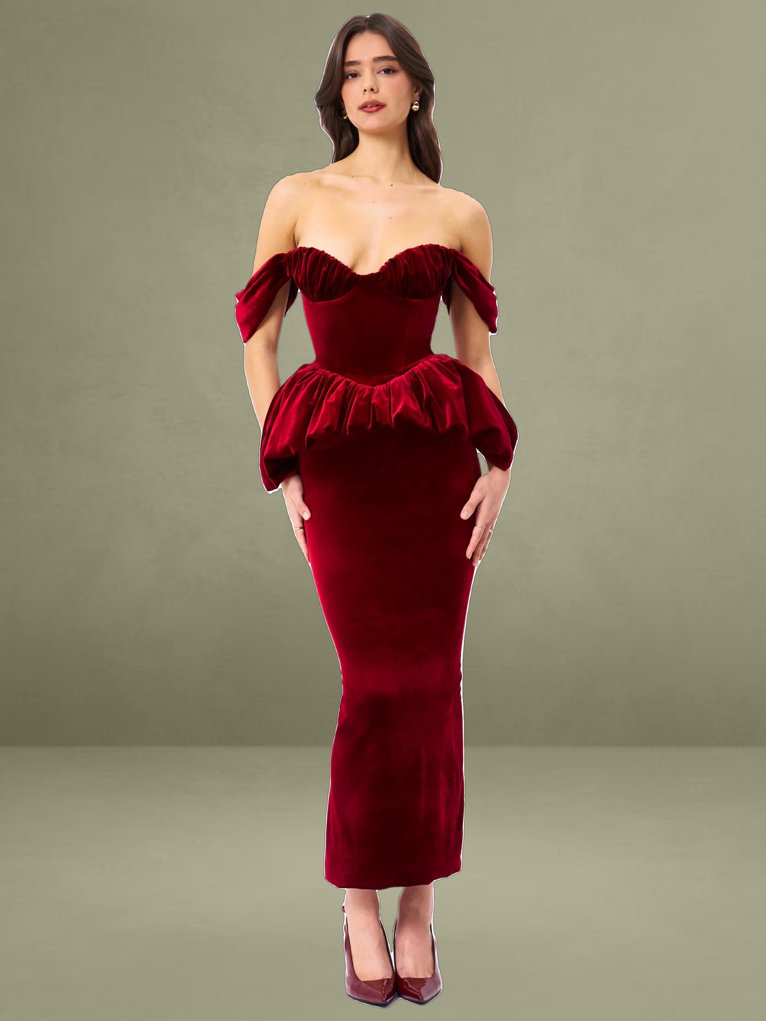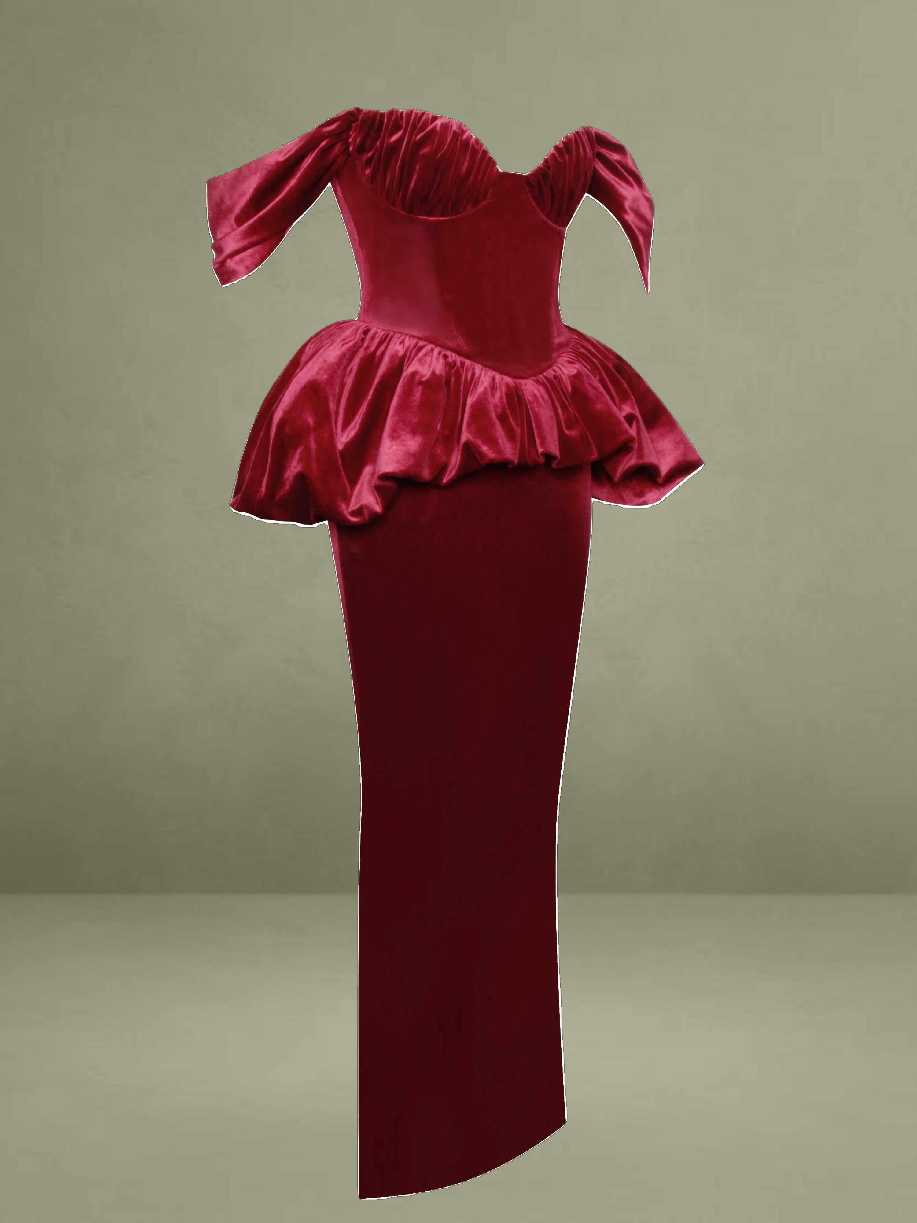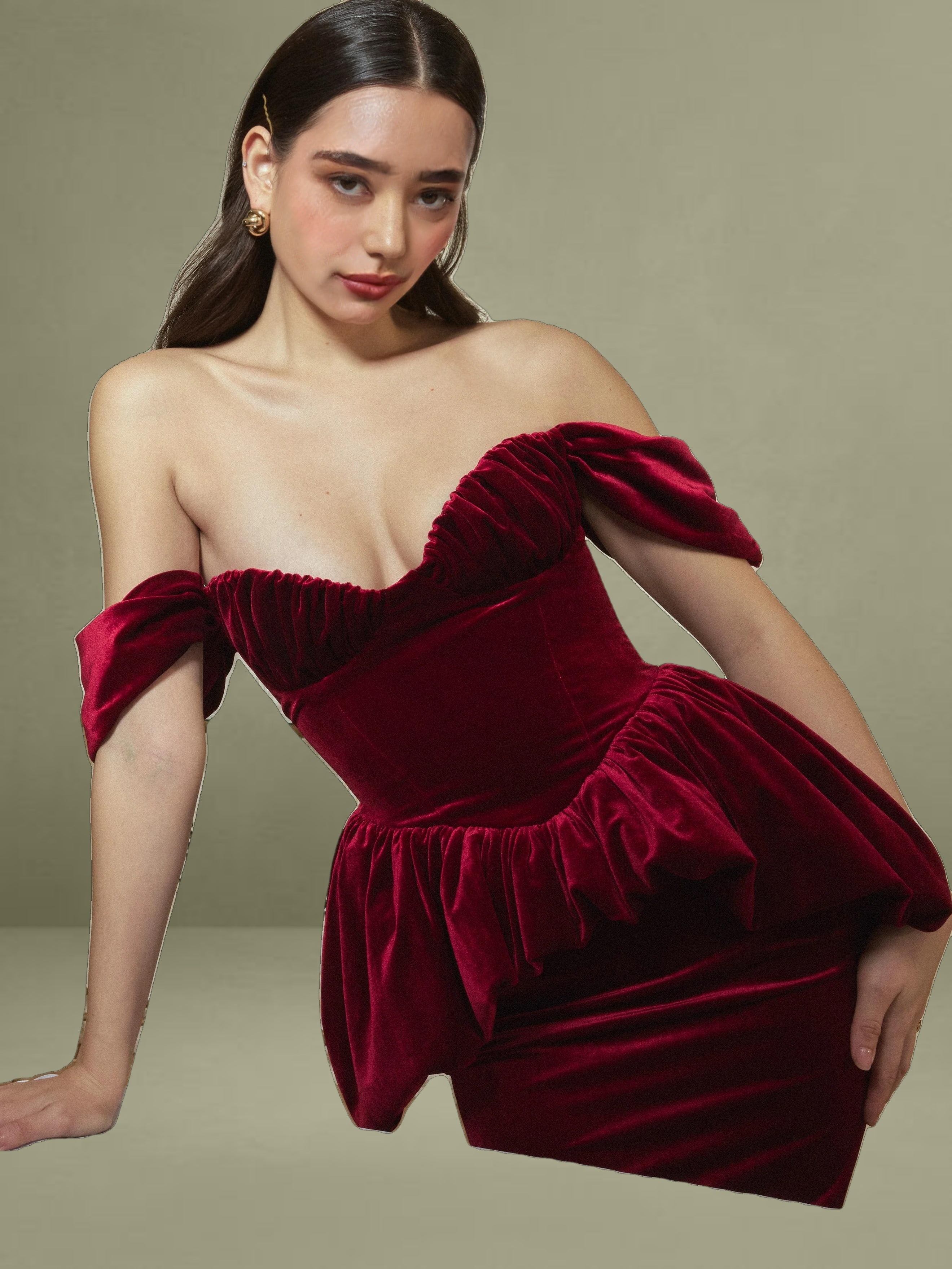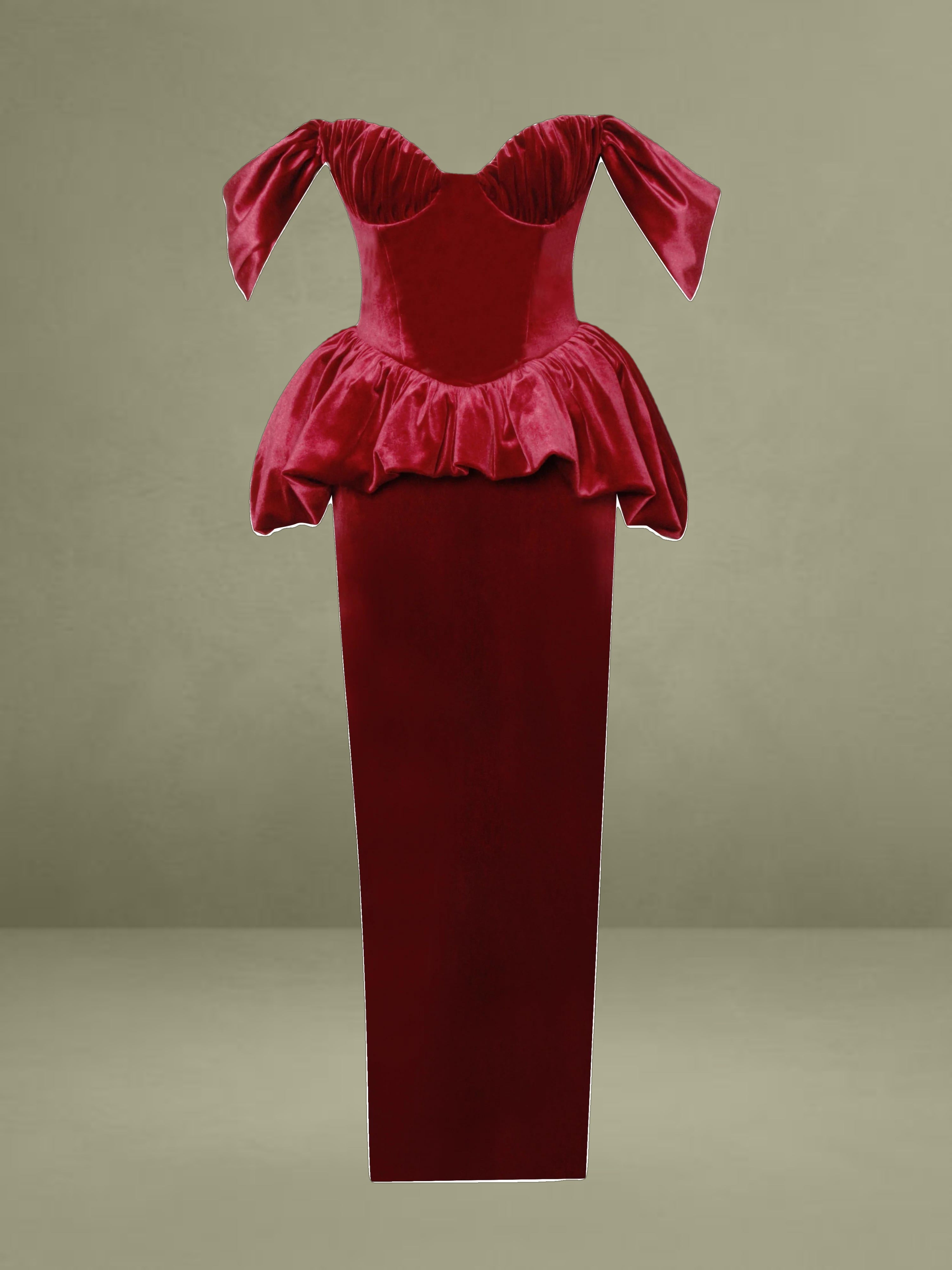 Introducing the Abigail Dress, an alluring off-shoulder piece crafted from luxurious red velvet that exudes sophistication and charm. This dress features a beautifully rouched front with a padded cup design, enhancing shape and support. The high waist accentuates the figure, flowing into a sleek straight skirt with a playful bubble hem peplum with inside tulle support that adds a unique and stylish flair. An invisible zipper at the back ensures a smooth, flawless fit, making the Abigail Dress a perfect choice for any special occasion where elegance is a must.