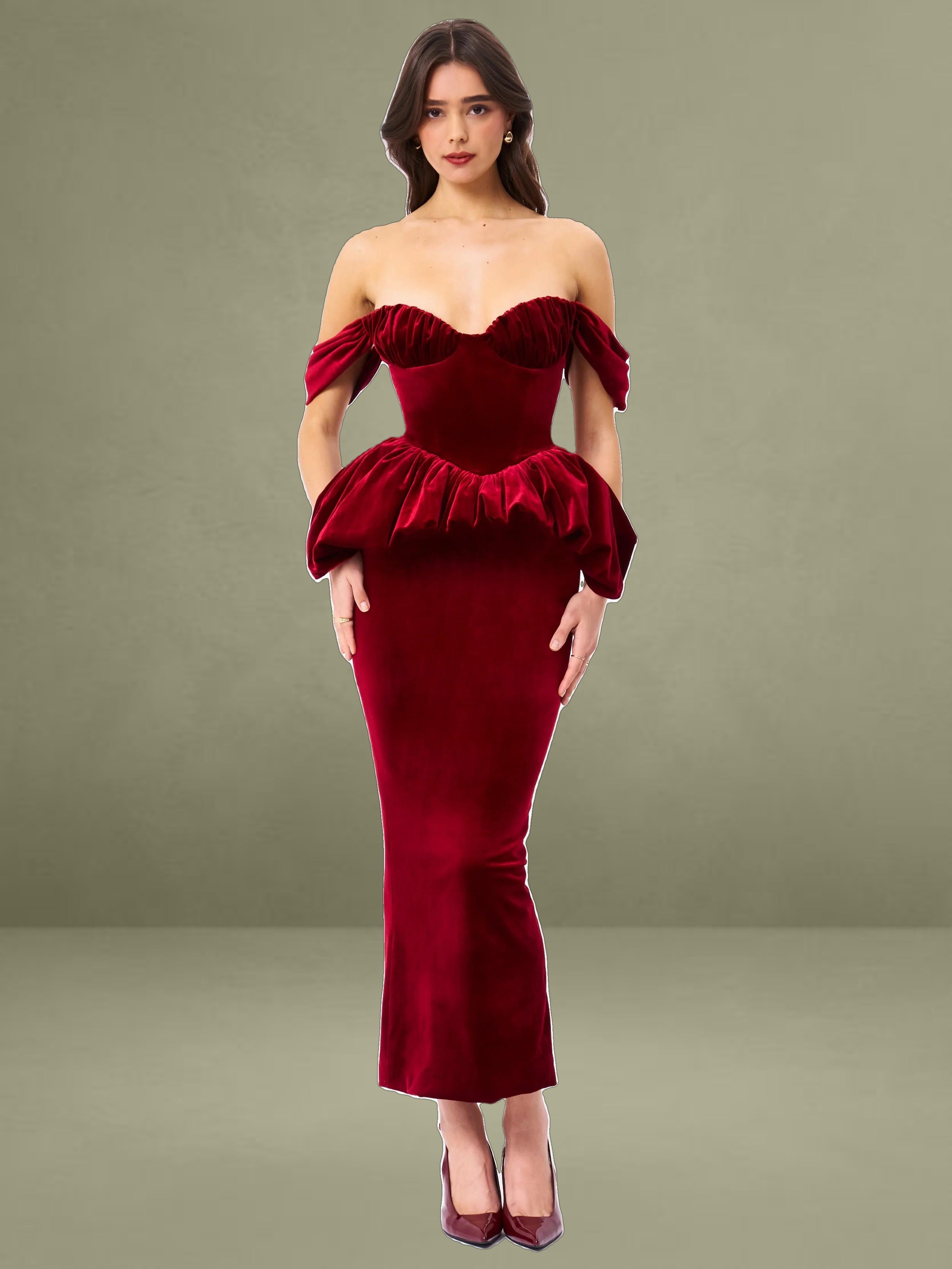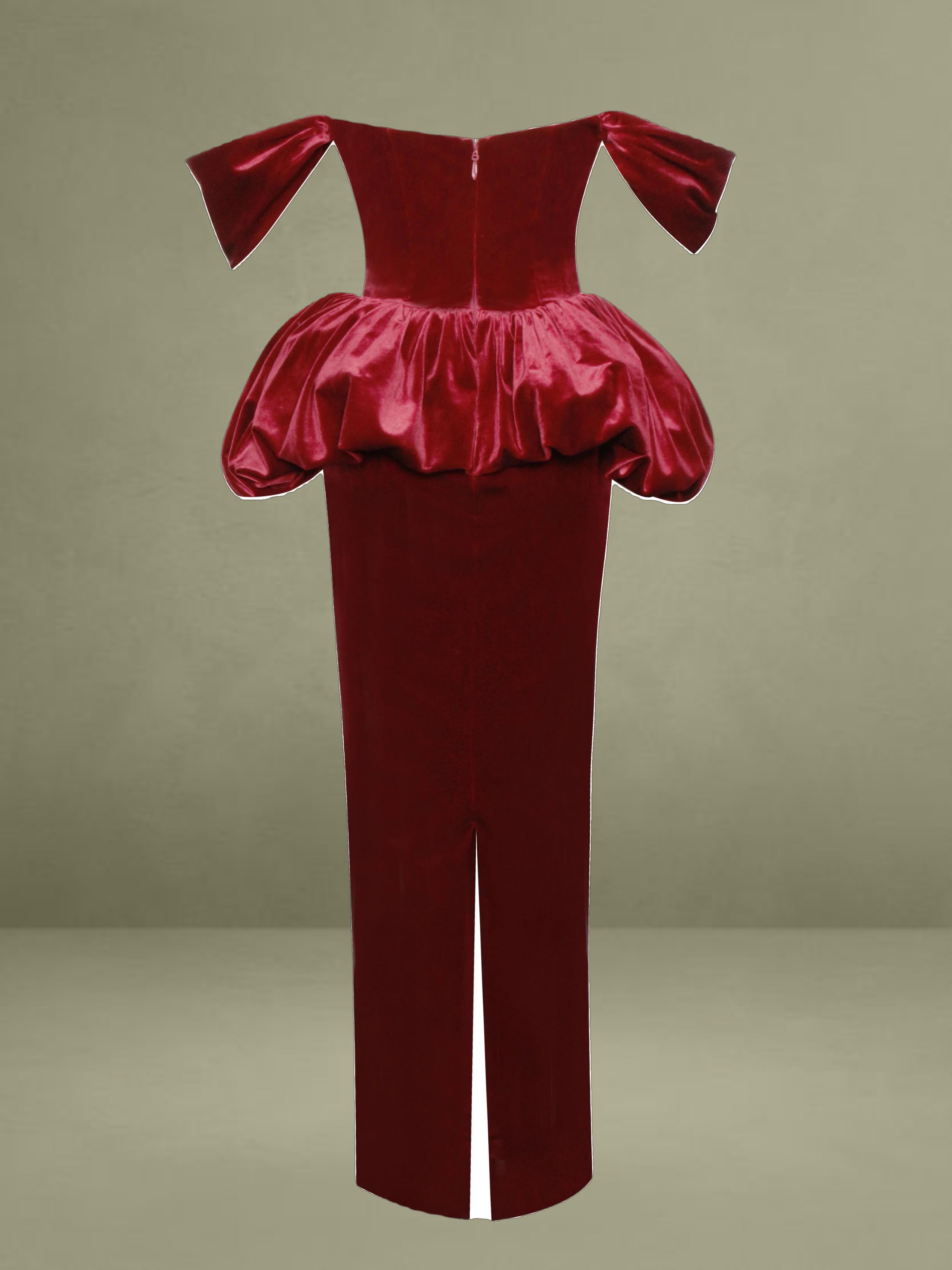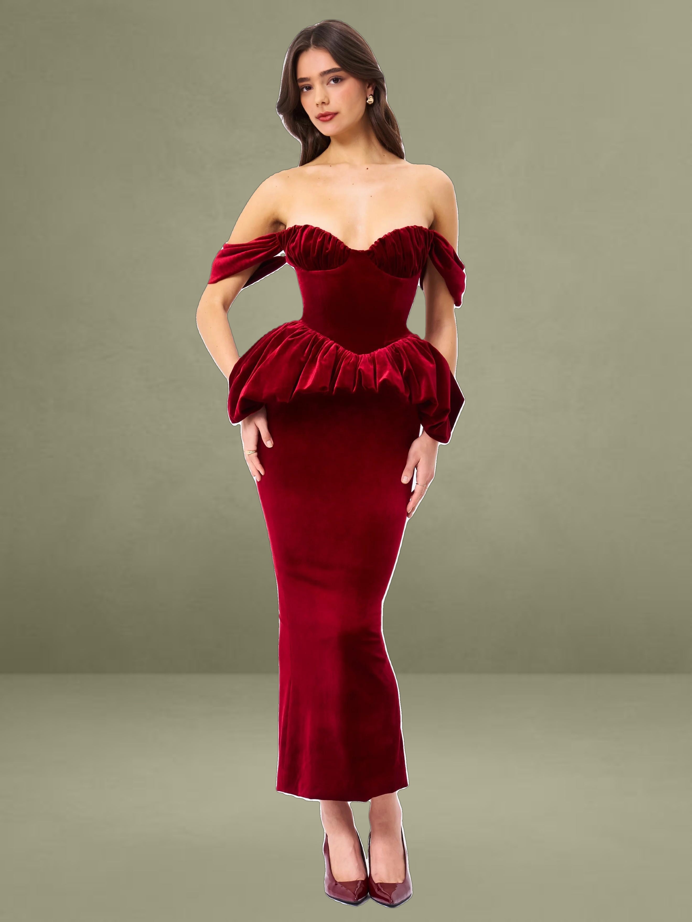 Introducing the Abigail Dress, an alluring off-shoulder piece crafted from luxurious red velvet that exudes sophistication and charm. This dress features a beautifully rouched front with a padded cup design, enhancing shape and support. The high waist accentuates the figure, flowing into a sleek straight skirt with a playful bubble hem peplum with inside tulle support that adds a unique and stylish flair. An invisible zipper at the back ensures a smooth, flawless fit, making the Abigail Dress a perfect choice for any special occasion where elegance is a must.