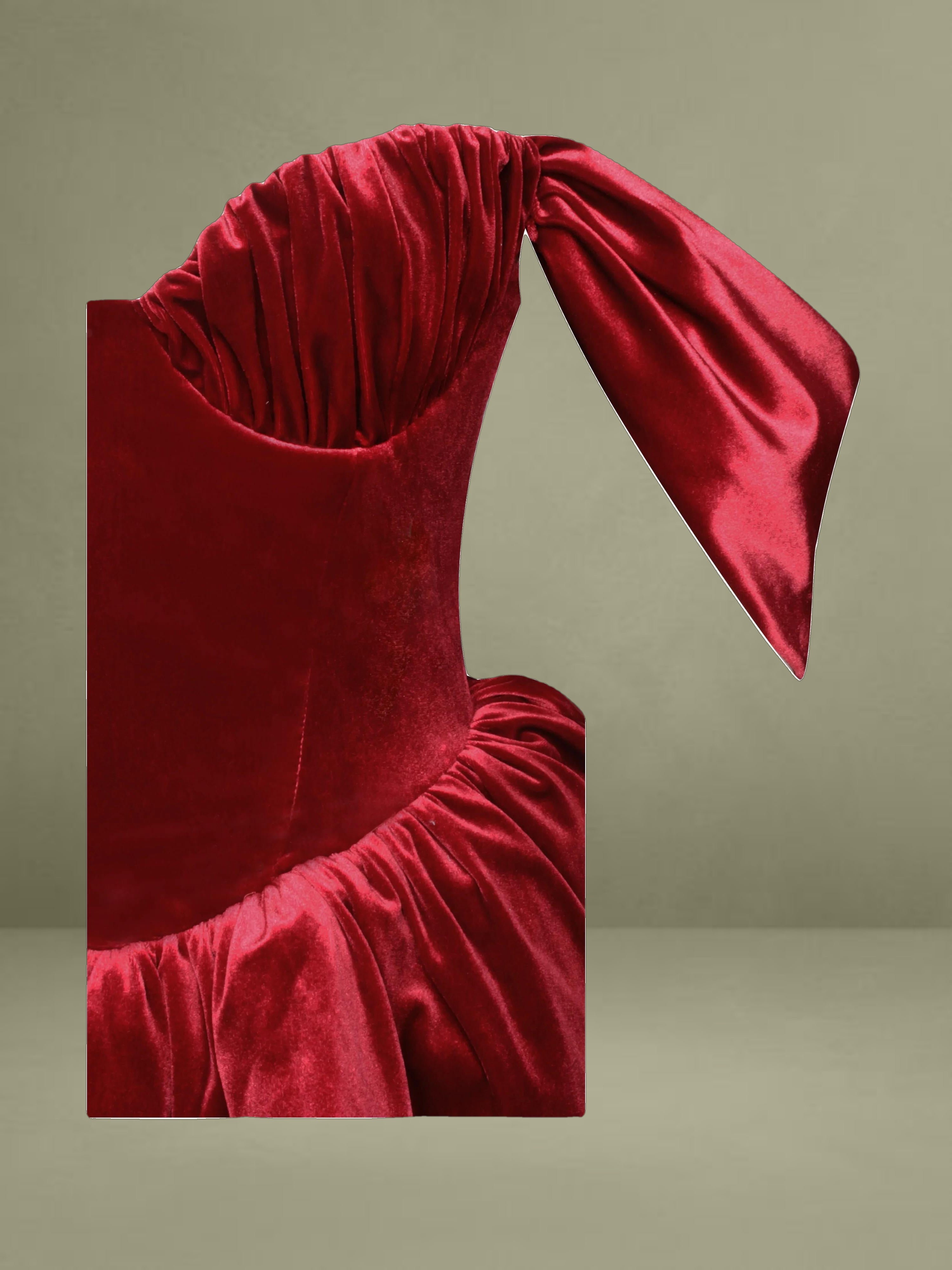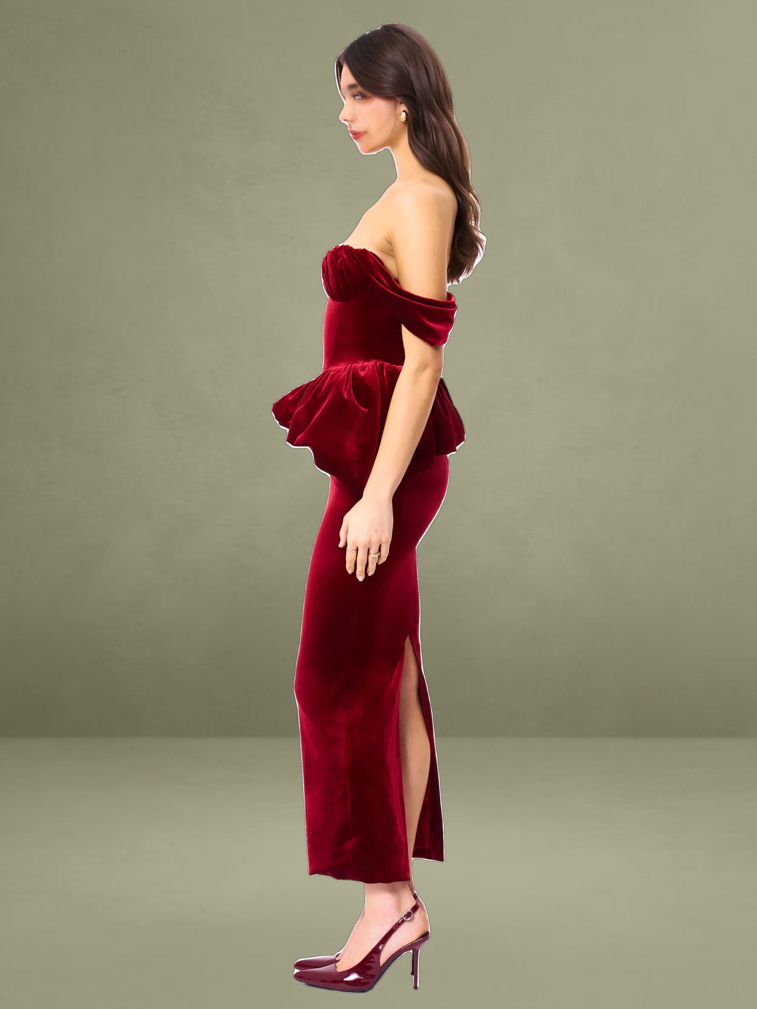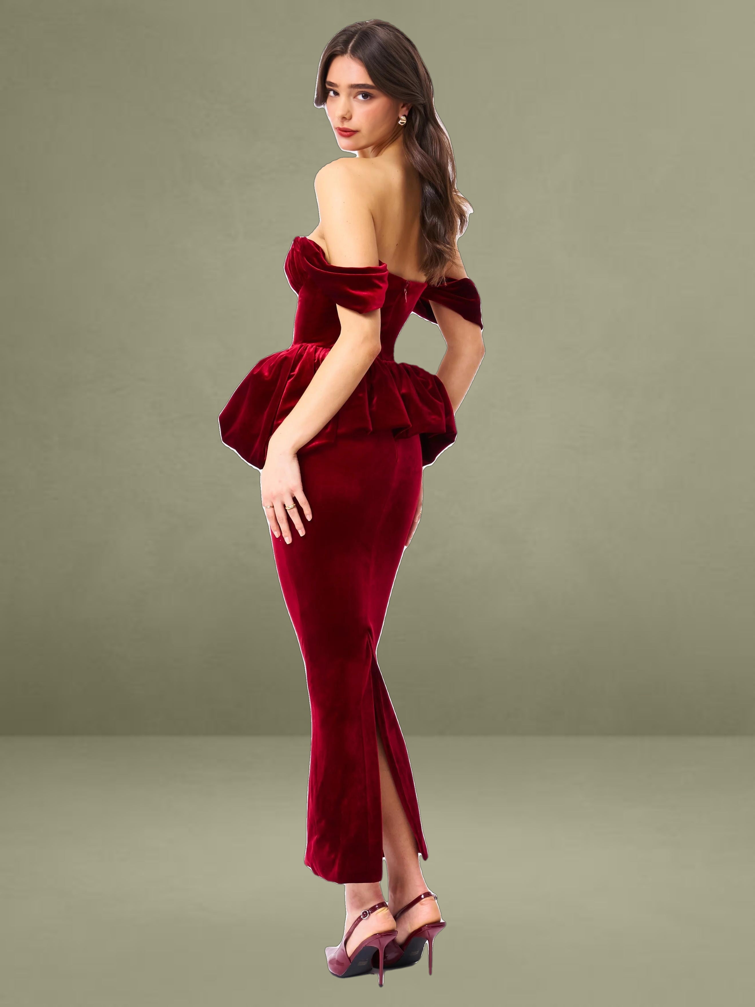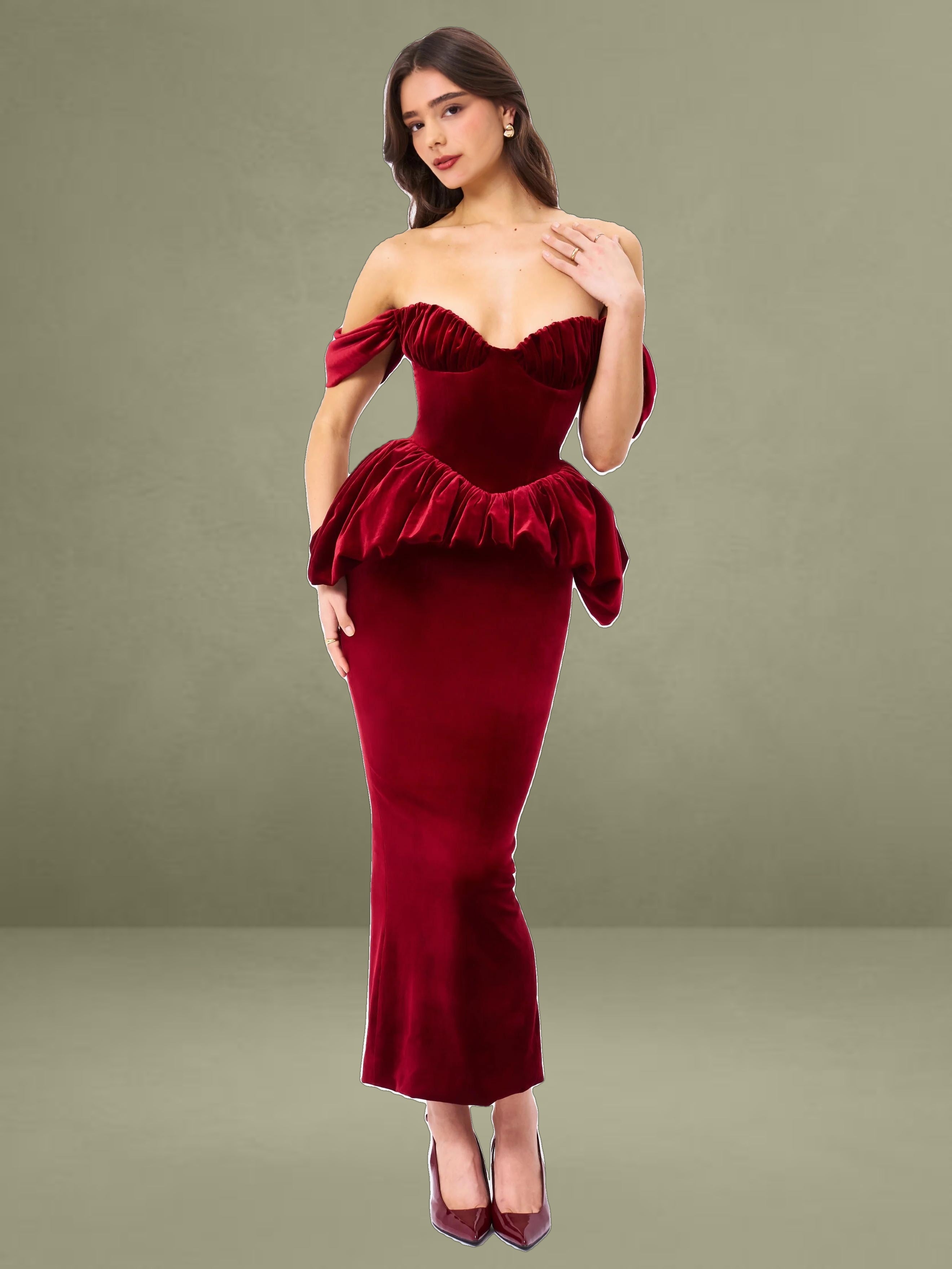 Introducing the Abigail Dress, an alluring off-shoulder piece crafted from luxurious red velvet that exudes sophistication and charm. This dress features a beautifully rouched front with a padded cup design, enhancing shape and support. The high waist accentuates the figure, flowing into a sleek straight skirt with a playful bubble hem peplum with inside tulle support that adds a unique and stylish flair. An invisible zipper at the back ensures a smooth, flawless fit, making the Abigail Dress a perfect choice for any special occasion where elegance is a must.