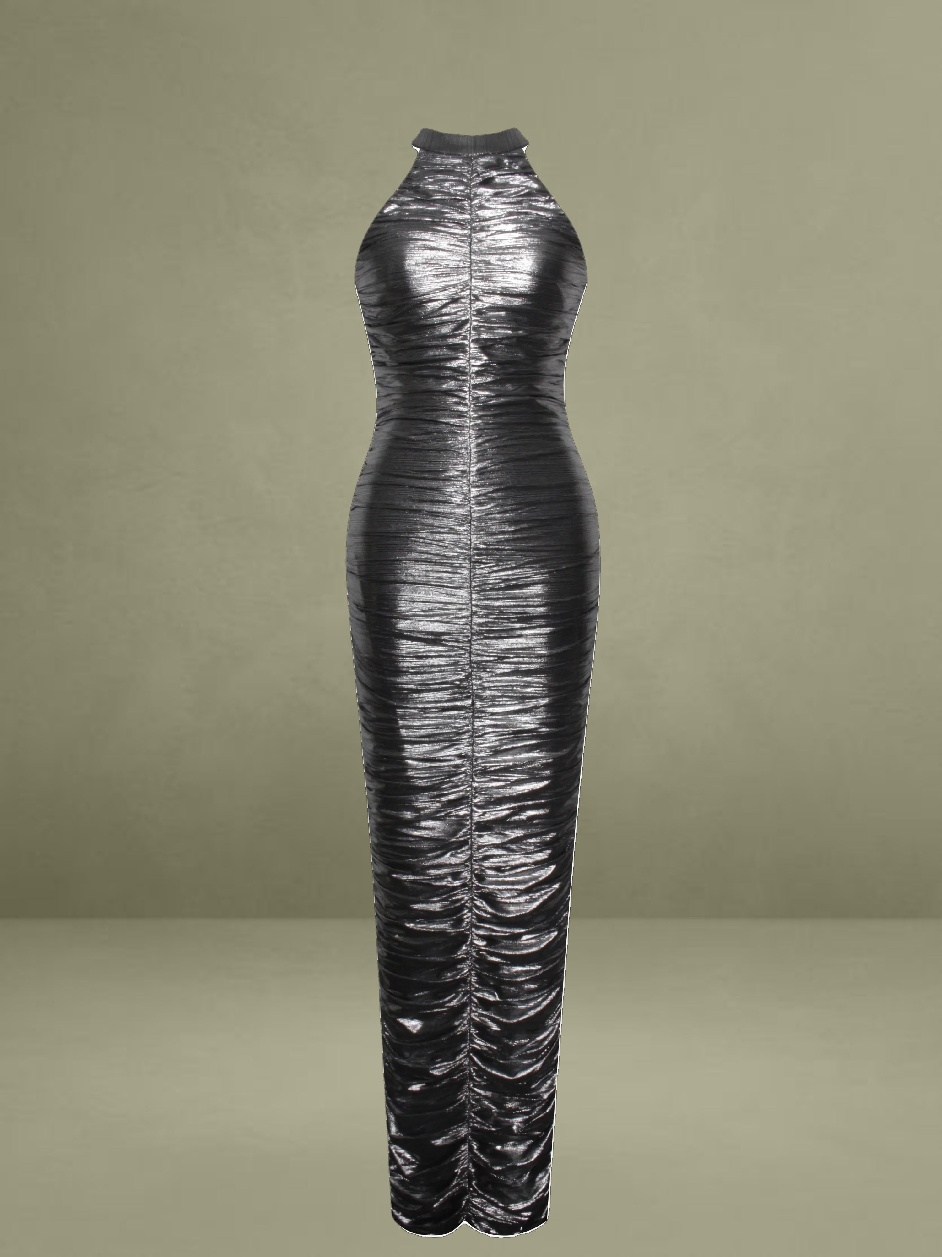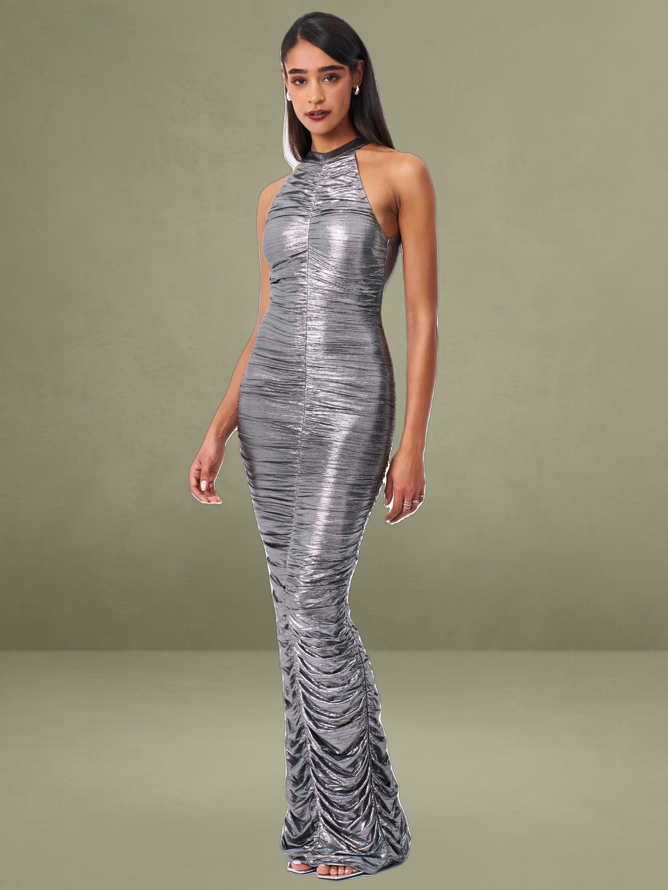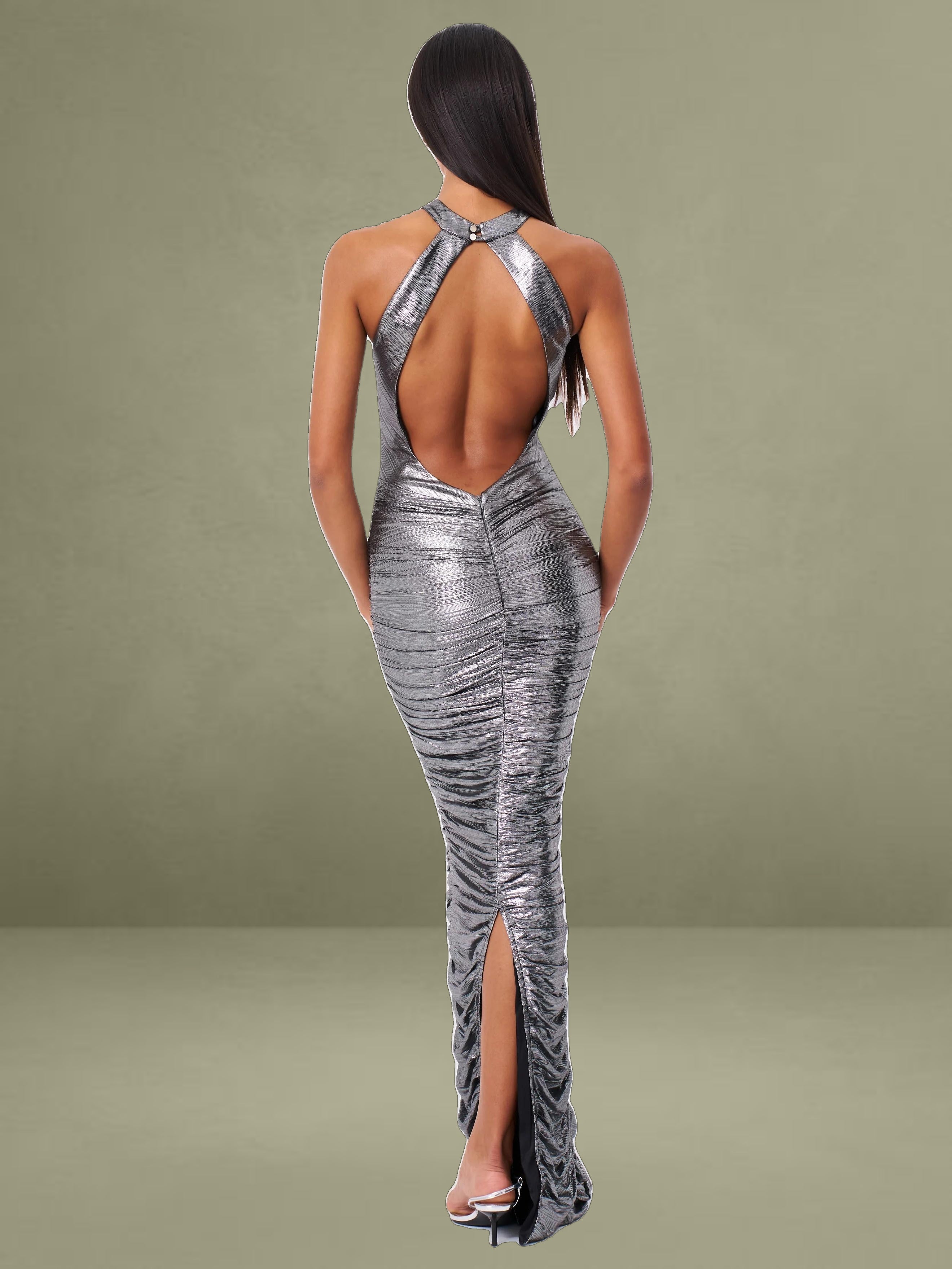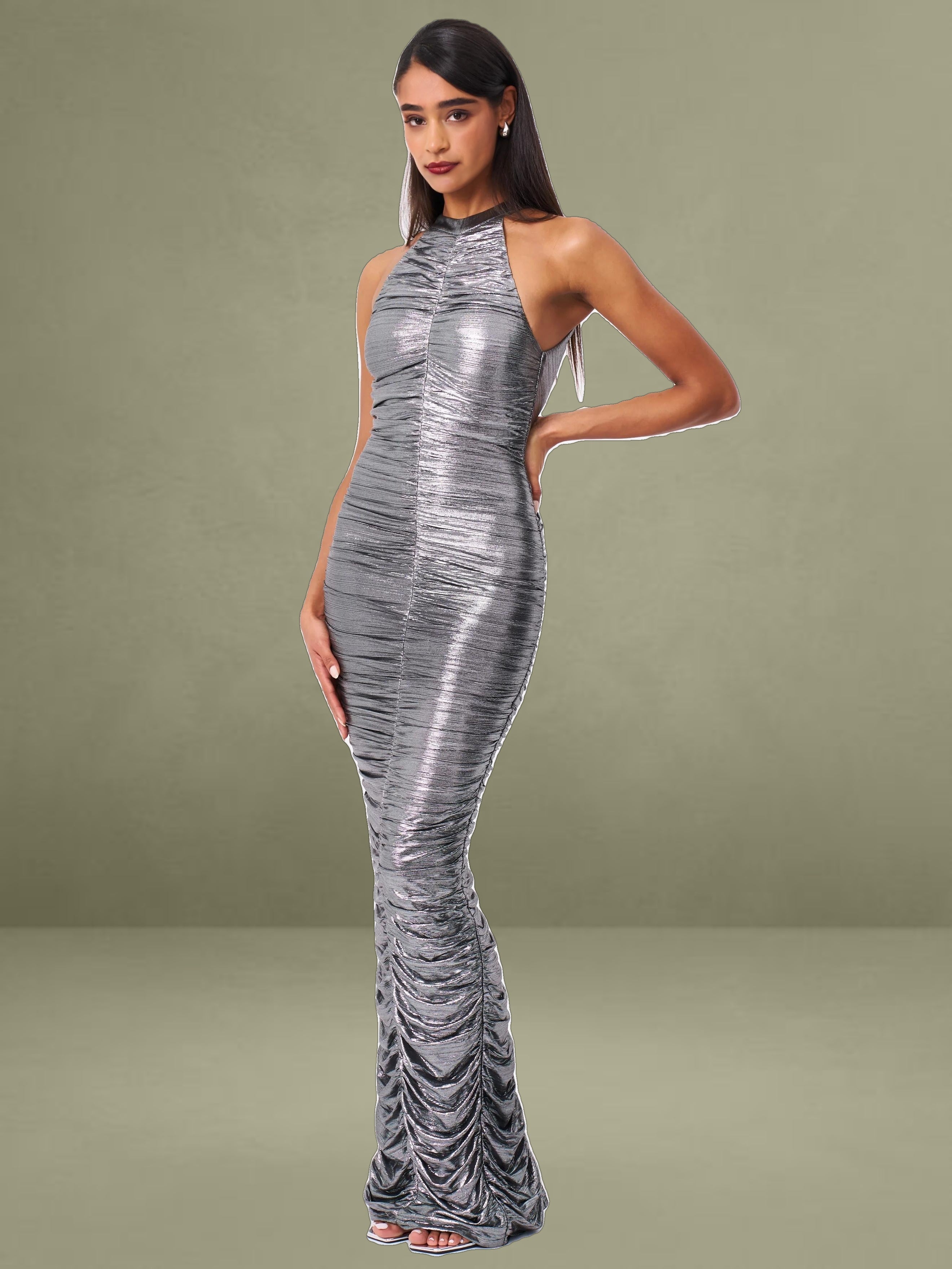 Sparkle effortlessly in the Abril Dress, a show-stopping piece designed to captivate. Made from stunning silver glitter fabric, this gown radiates glamour and sophistication. The elegant halter neck beautifully frames the shoulders, while the center-ruched design accentuates and hugs your body curves for a flattering silhouette. The backless detail adds a bold, alluring touch, while the sleek maxi length ensures timeless elegance. Fully lined for comfort and finished with an invisible zipper for a seamless fit, the Abril Dress is the ultimate choice for making a dazzling impression.