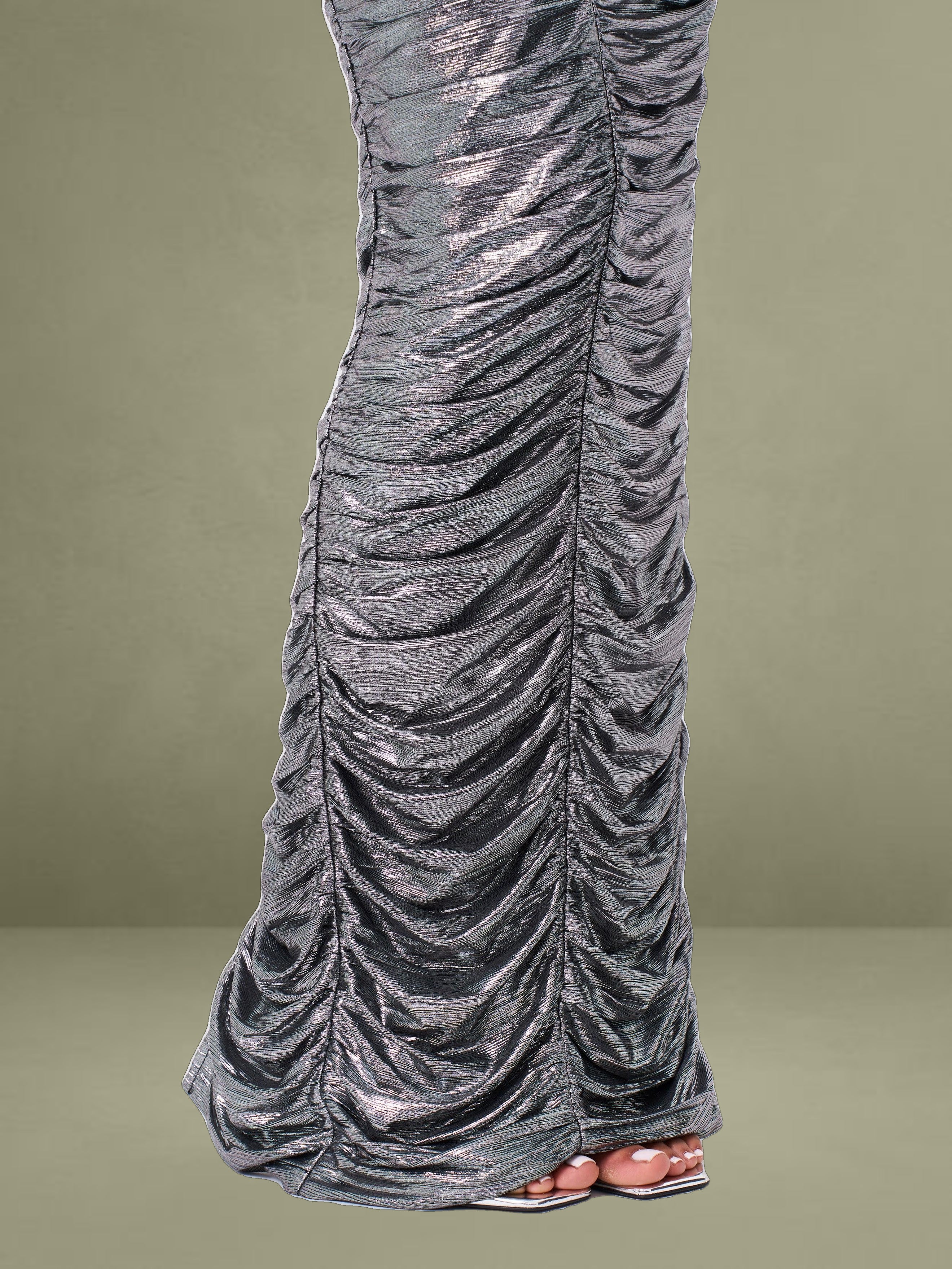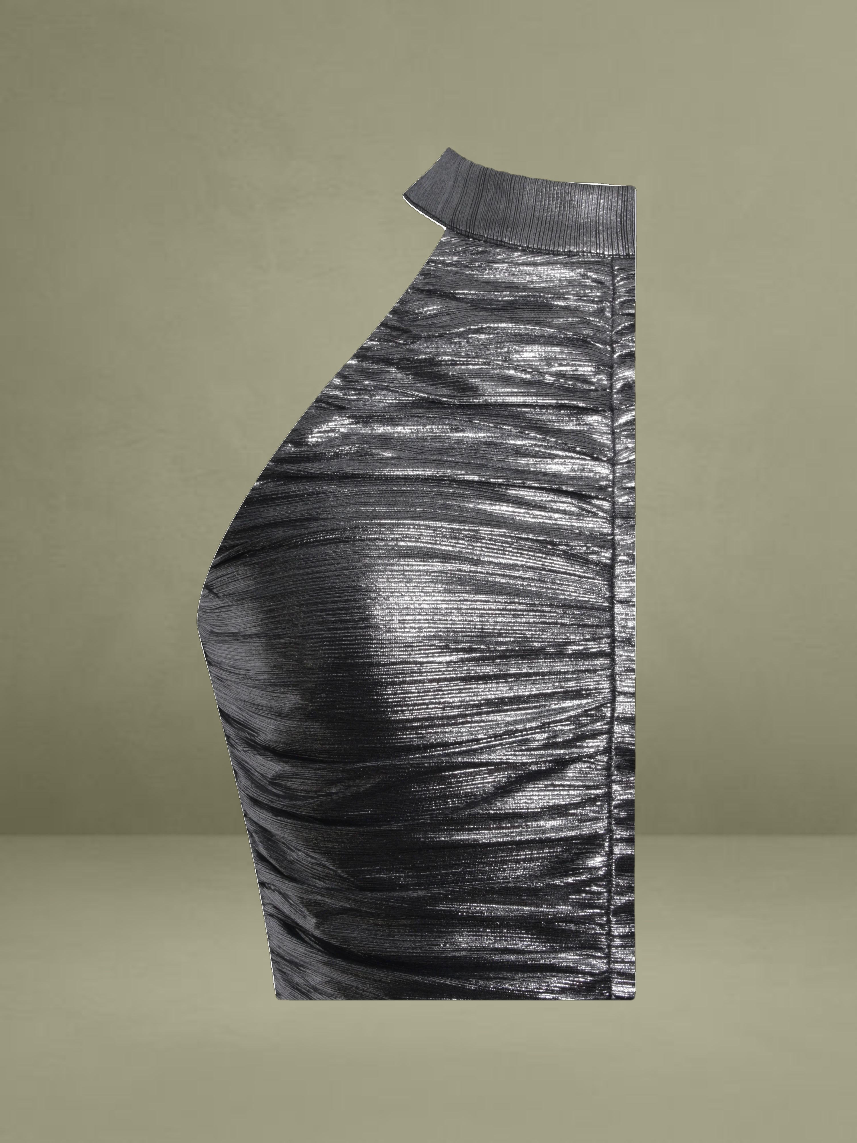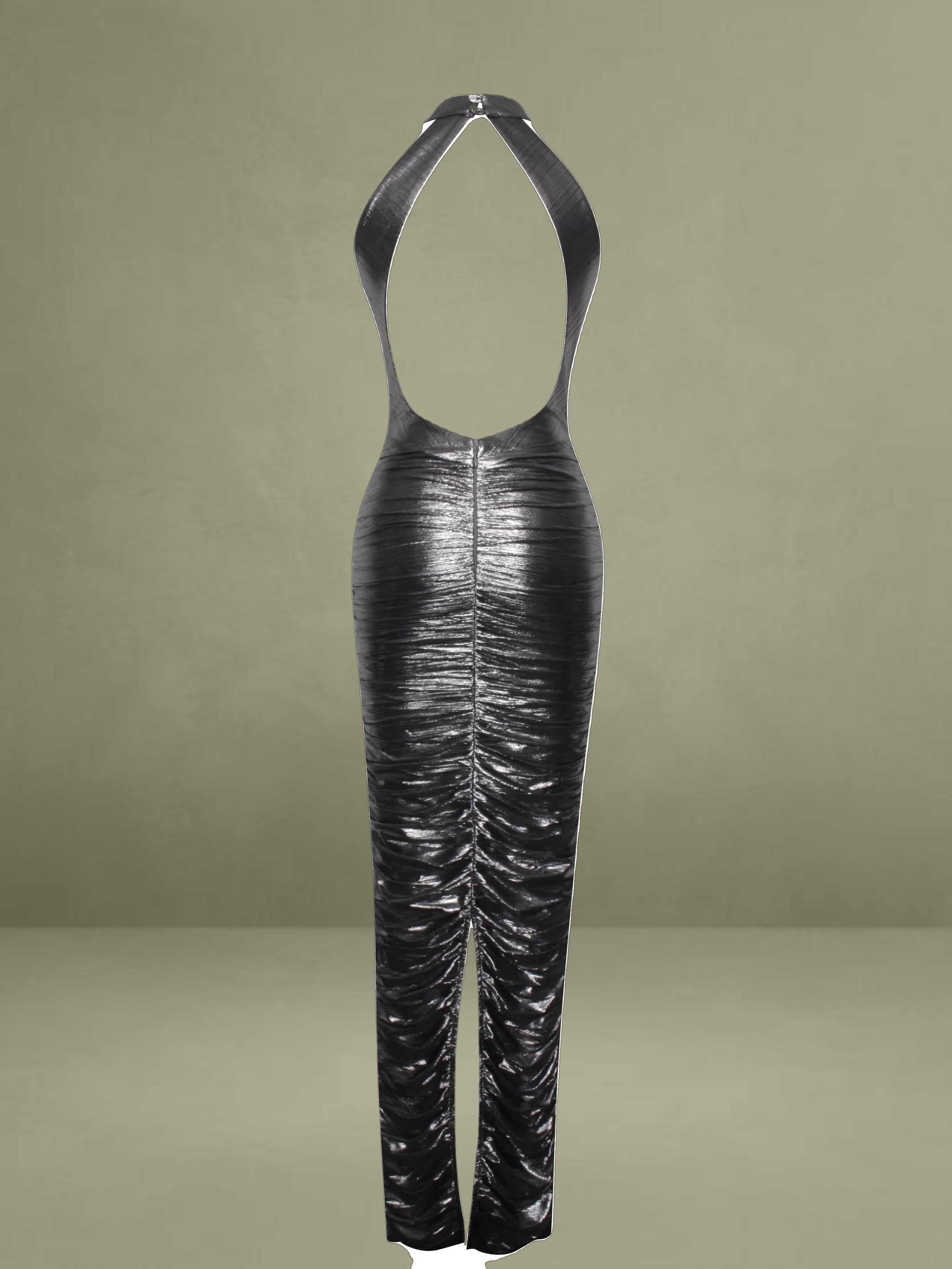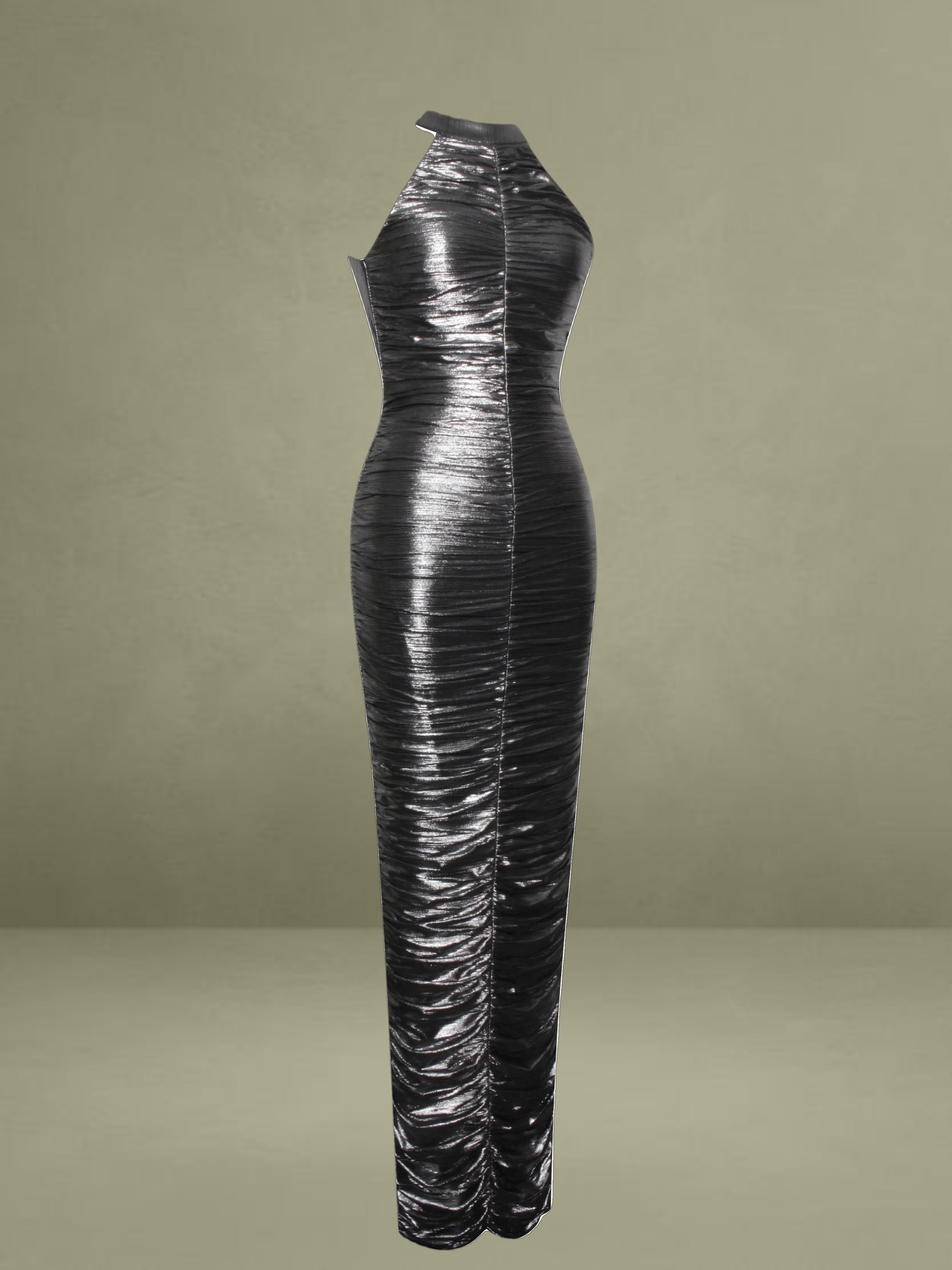Sparkle effortlessly in the Abril Dress, a show-stopping piece designed to captivate. Made from stunning silver glitter fabric, this gown radiates glamour and sophistication. The elegant halter neck beautifully frames the shoulders, while the center-ruched design accentuates and hugs your body curves for a flattering silhouette. The backless detail adds a bold, alluring touch, while the sleek maxi length ensures timeless elegance. Fully lined for comfort and finished with an invisible zipper for a seamless fit, the Abril Dress is the ultimate choice for making a dazzling impression.