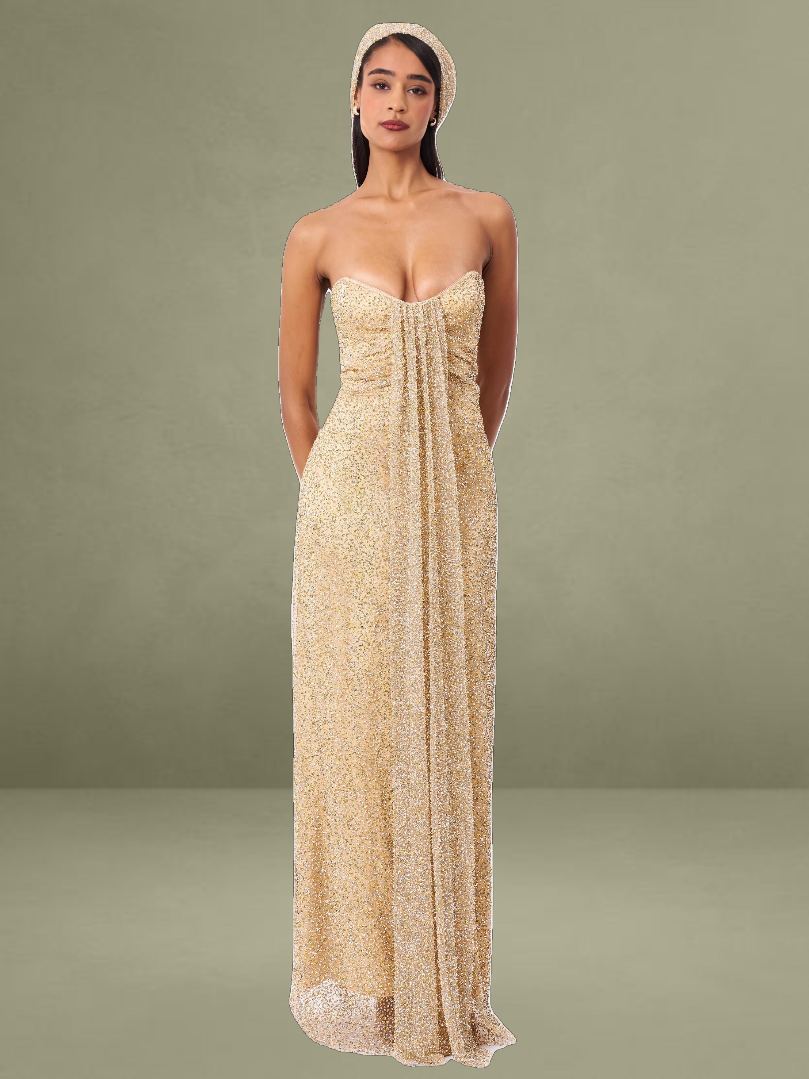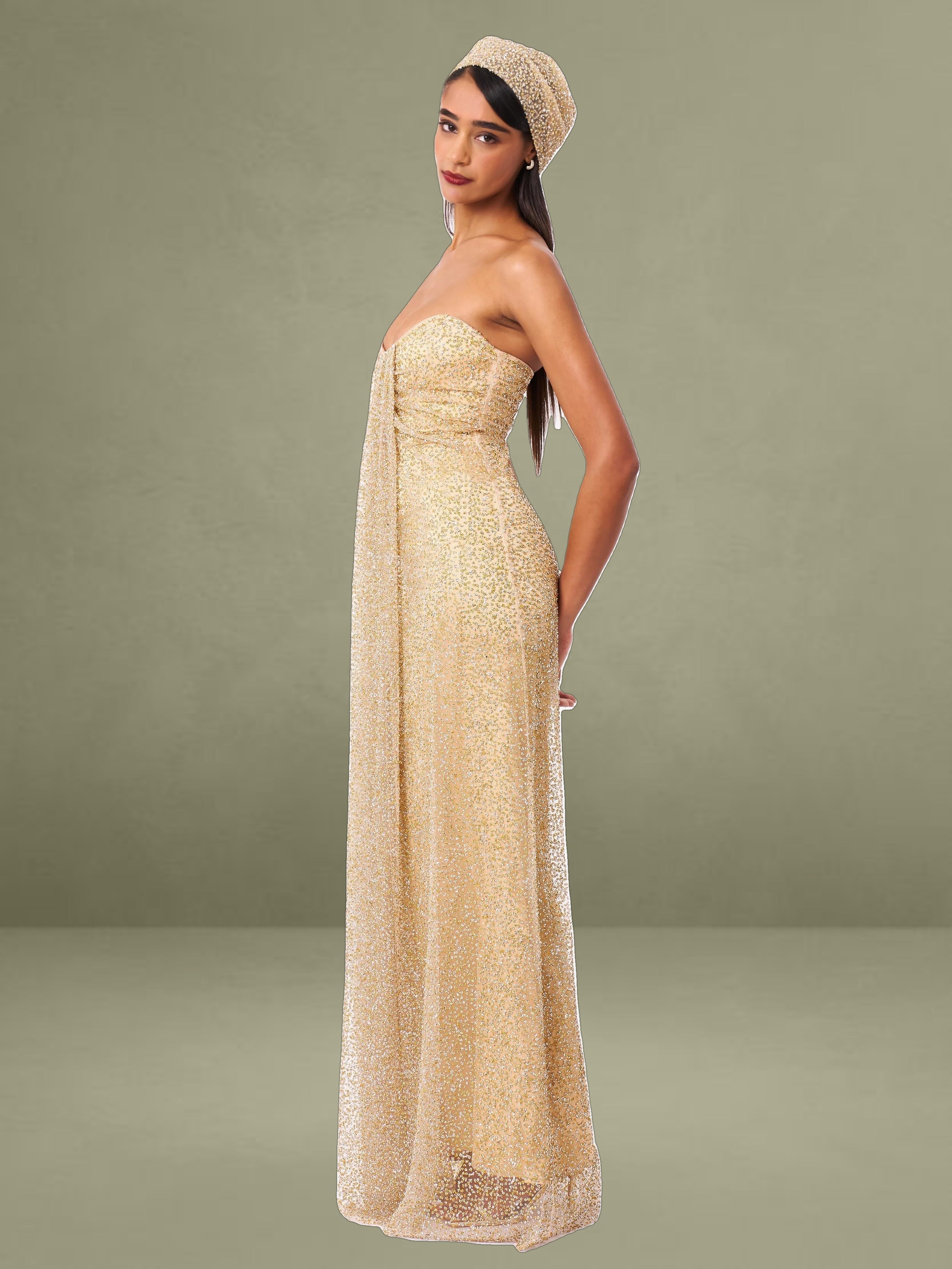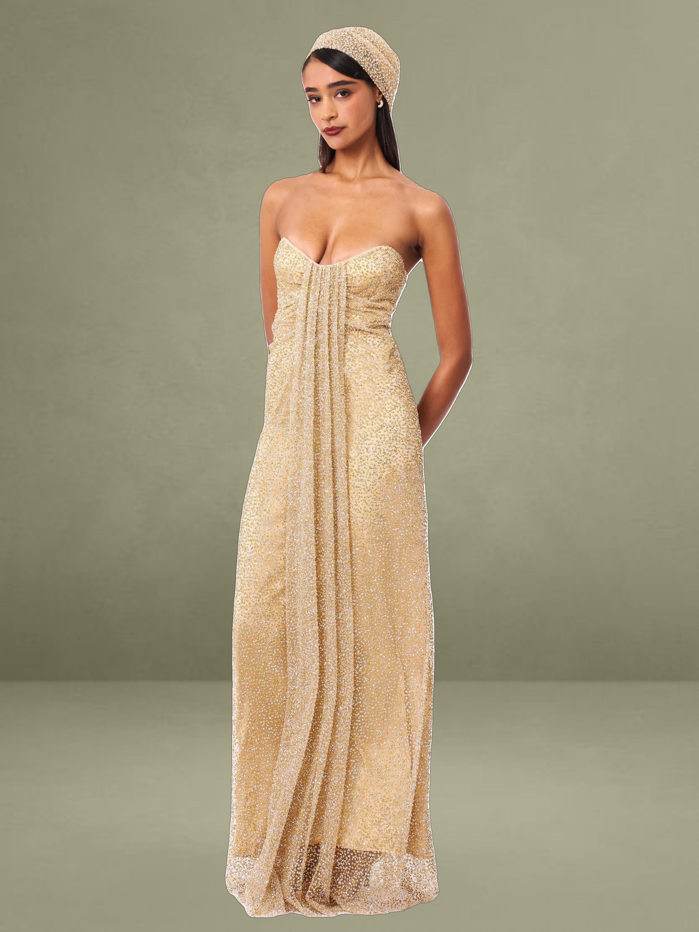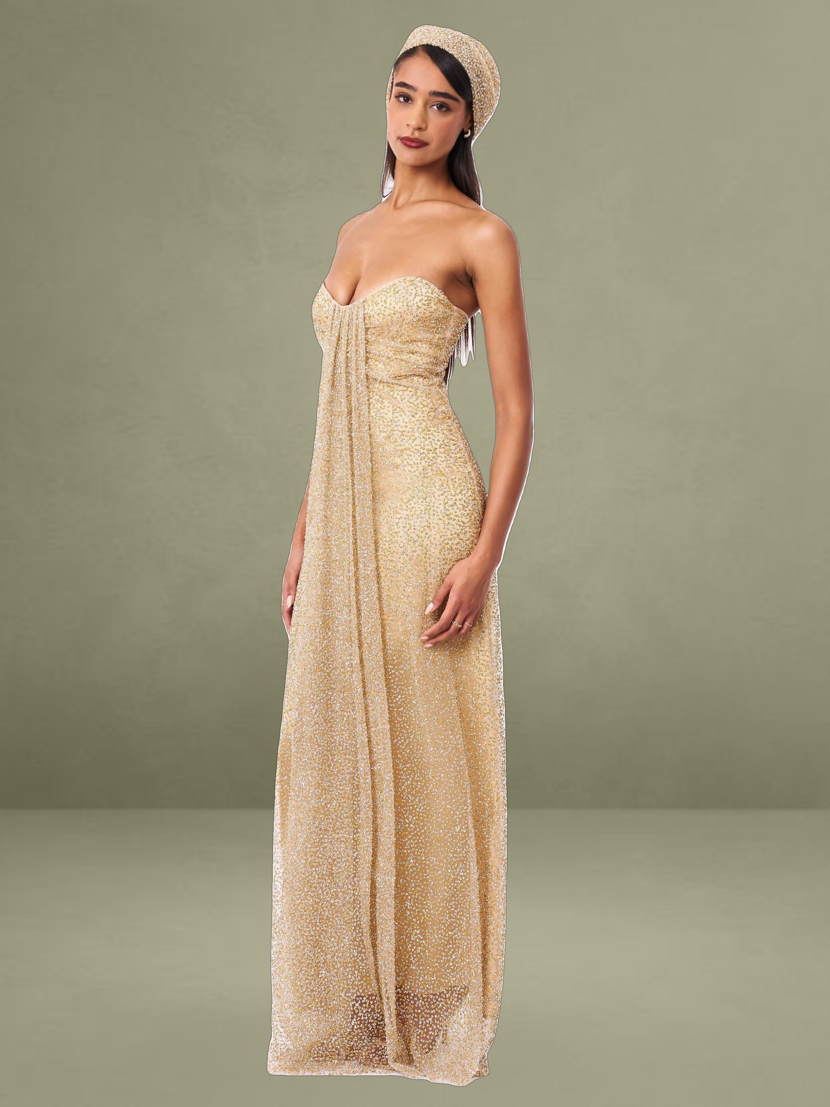Radiate opulence with the breathtaking Ada Gown, designed to captivate at any special occasion. Crafted from luxurious gold rhinestone-embellished mesh fabric, this gown sparkles with elegance. The sweetheart collar lends a romantic touch, while the drape front and cinched waist beautifully enhance your silhouette. Thoughtfully designed with non-slip straps, an inside elastic band, and built-in bones, the bodice offers both structure and secure support for a flawless fit. An invisible zipper ensures a seamless finish, and the gown is fully lined for all-day comfort. The Ada Gown is the perfect harmony of glamour and sophistication, making you shine effortlessly. And the one-size square scarf was included, no need to be ordered separately.