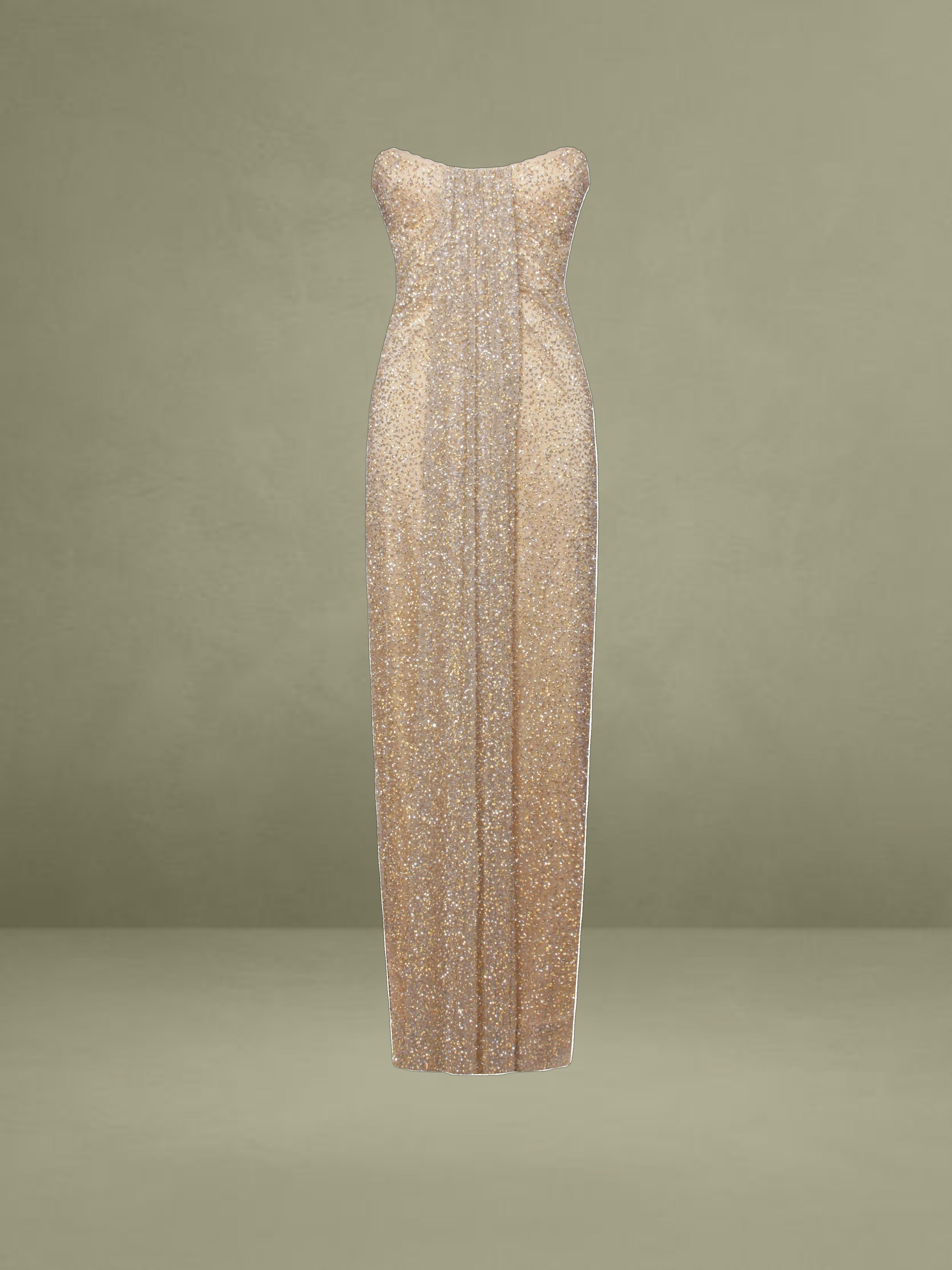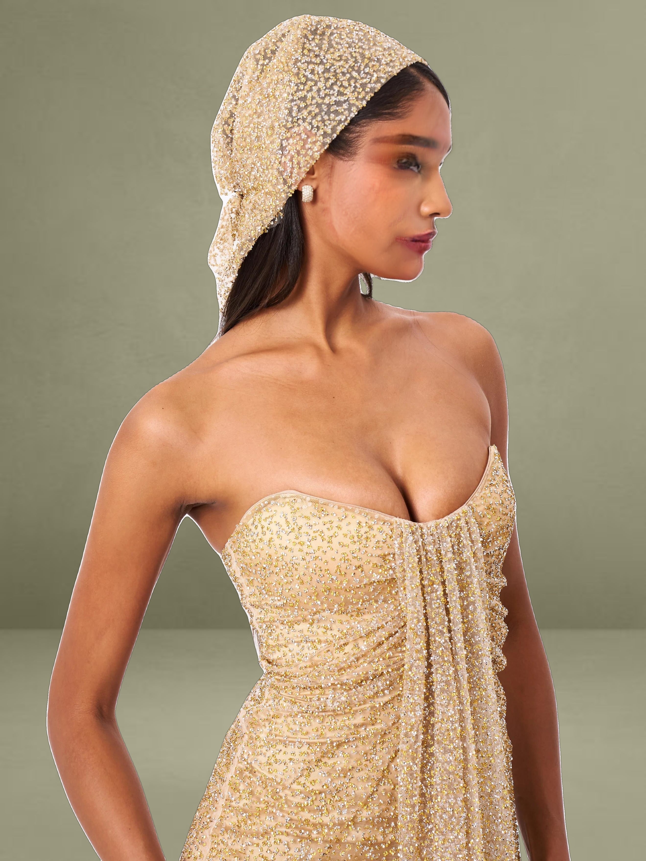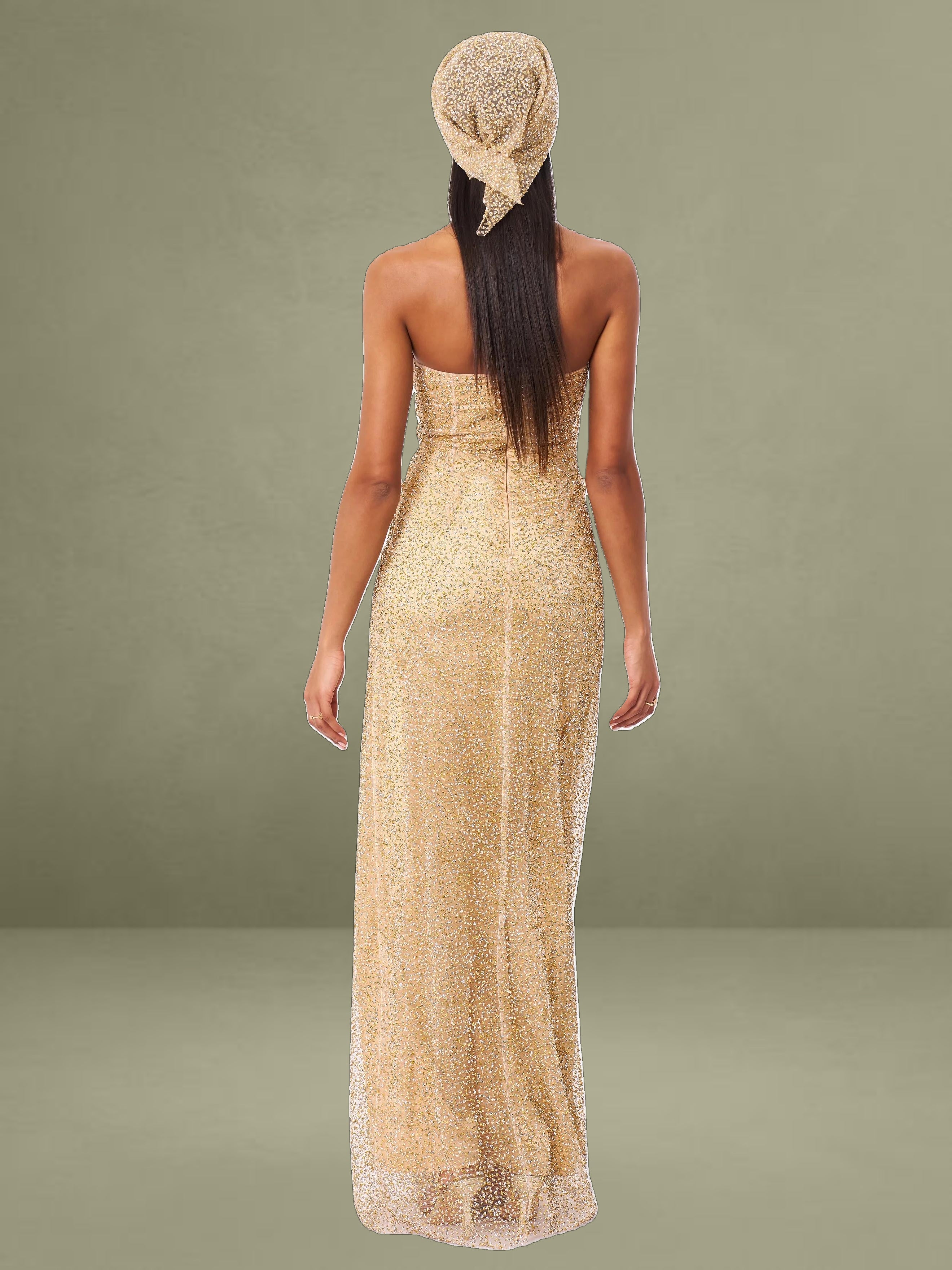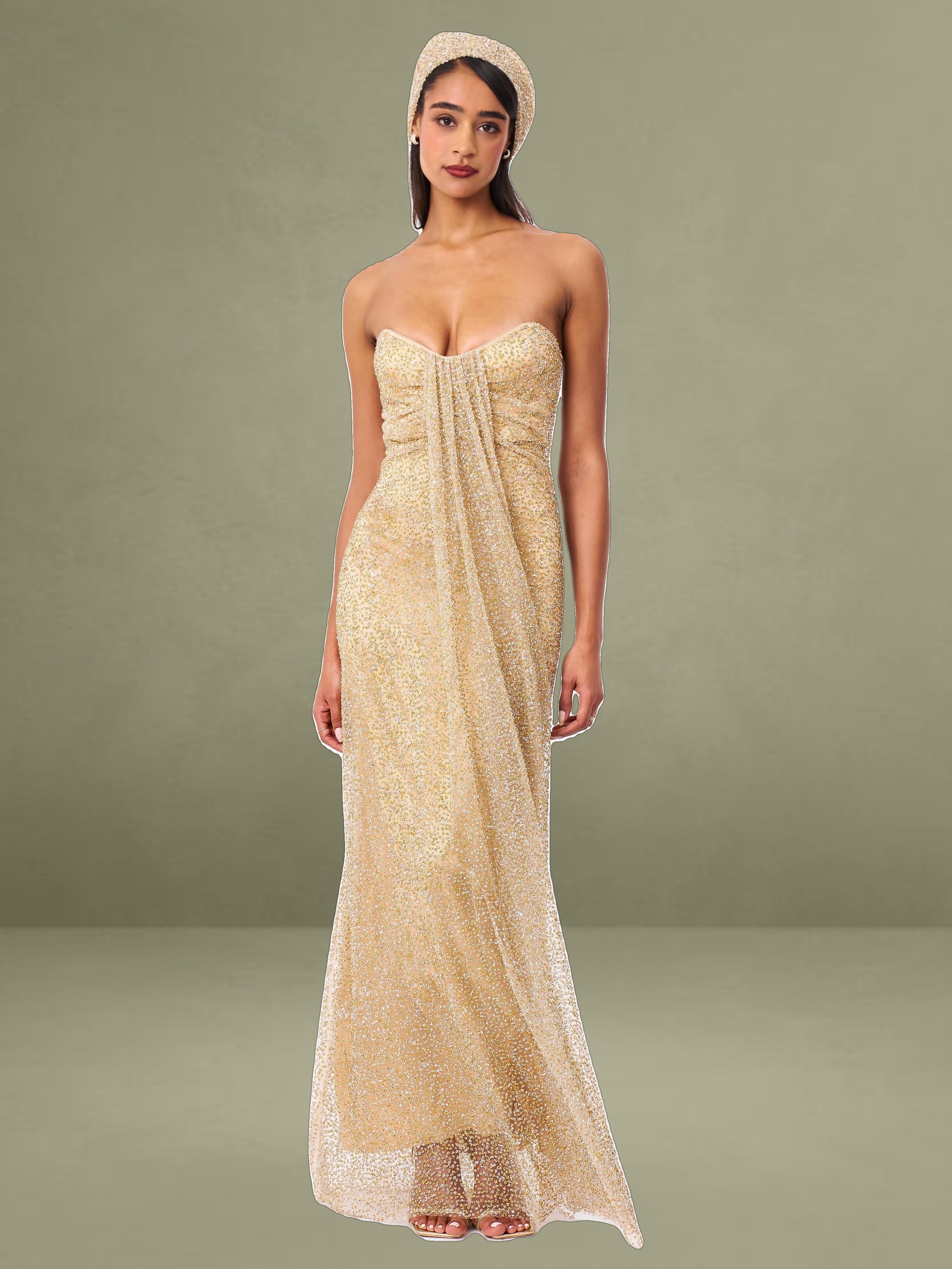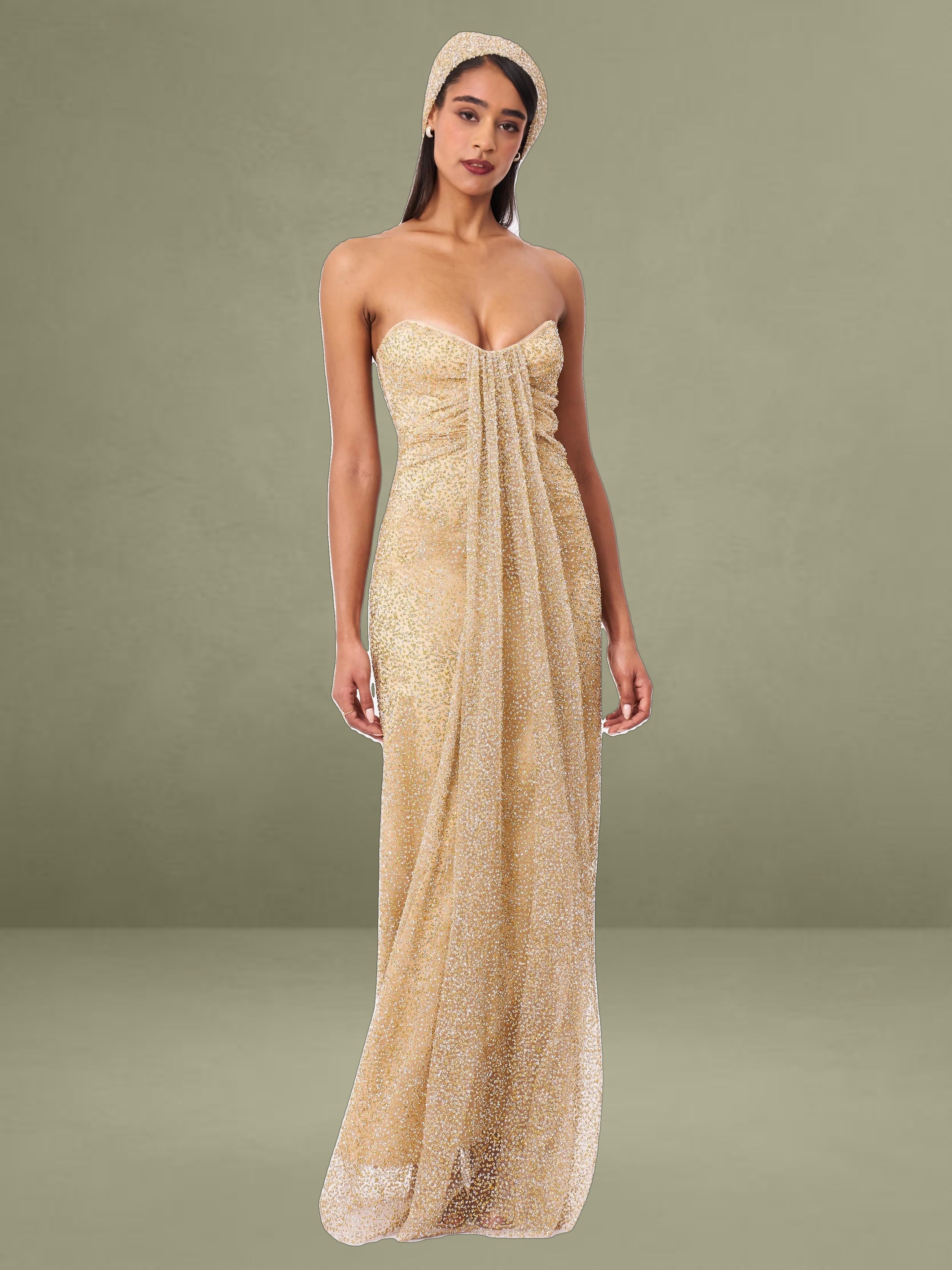 Radiate opulence with the breathtaking Ada Gown, designed to captivate at any special occasion. Crafted from luxurious gold rhinestone-embellished mesh fabric, this gown sparkles with elegance. The sweetheart collar lends a romantic touch, while the drape front and cinched waist beautifully enhance your silhouette. Thoughtfully designed with non-slip straps, an inside elastic band, and built-in bones, the bodice offers both structure and secure support for a flawless fit. An invisible zipper ensures a seamless finish, and the gown is fully lined for all-day comfort. The Ada Gown is the perfect harmony of glamour and sophistication, making you shine effortlessly. And the one-size square scarf was included, no need to be ordered separately.