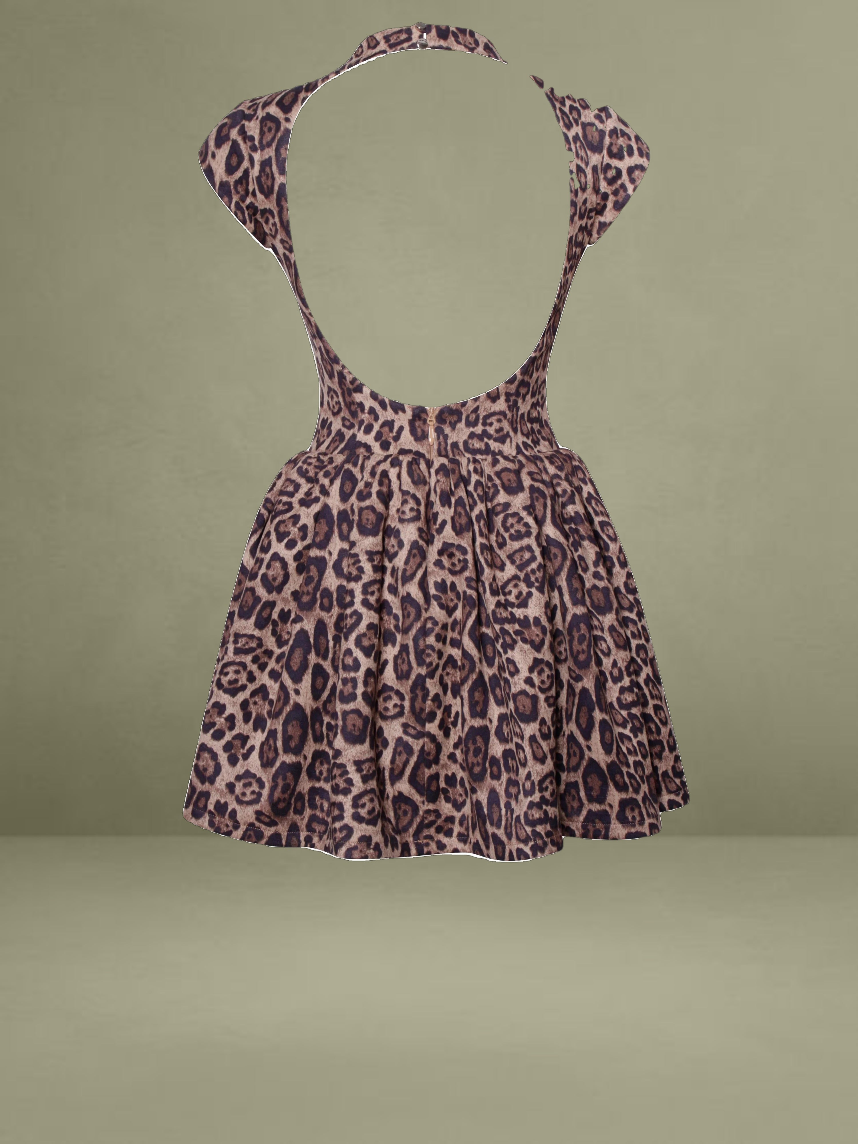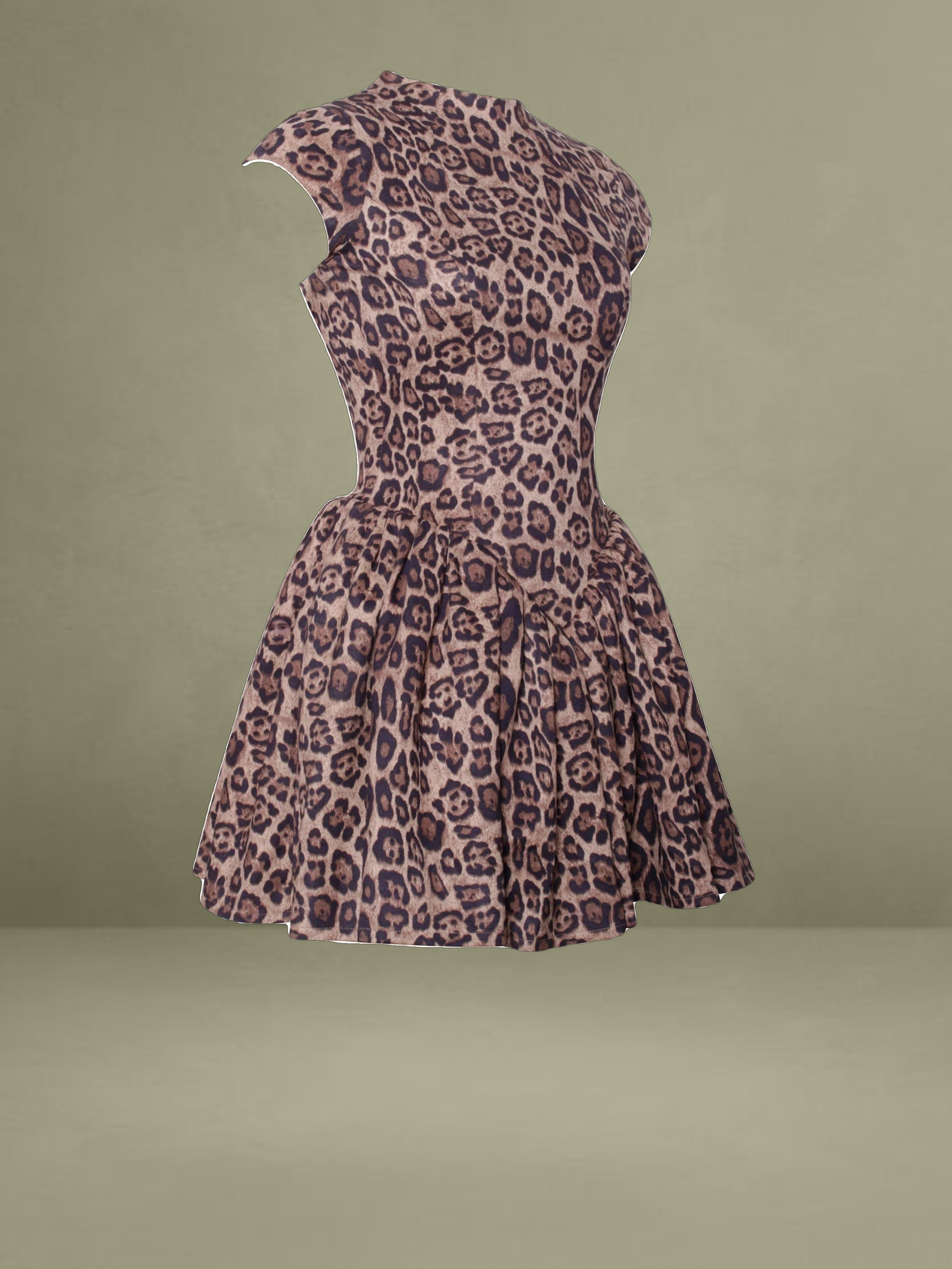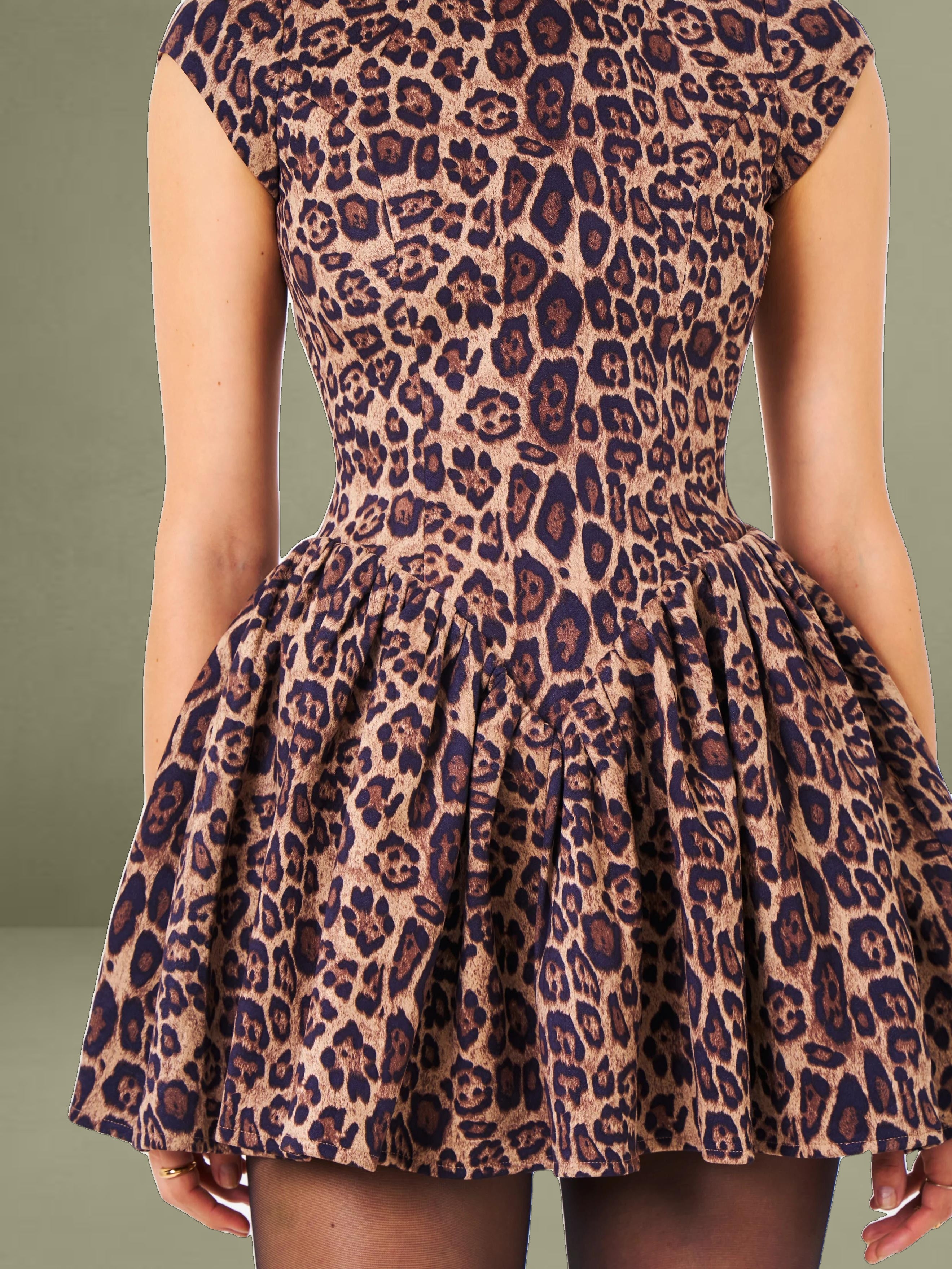 Made from suede, this mini dress is a remarkable and bold piece that will surely draw attention. It has elegant cap sleeves and a sophisticated turtleneck, achieving a great balance between a fun and refined style. The dress features a daring cheetah print, which gives off a sense of confidence and energy. The V-shaped waistline enhances your figure. The fully lined interior and inner skirt support offer comfort and maintain the shape whether it's day or night. There's a discreet invisible zipper at the back to keep the silhouette sleek, and the puffy skirt adds a flirty and voluminous look to the whole outfit.