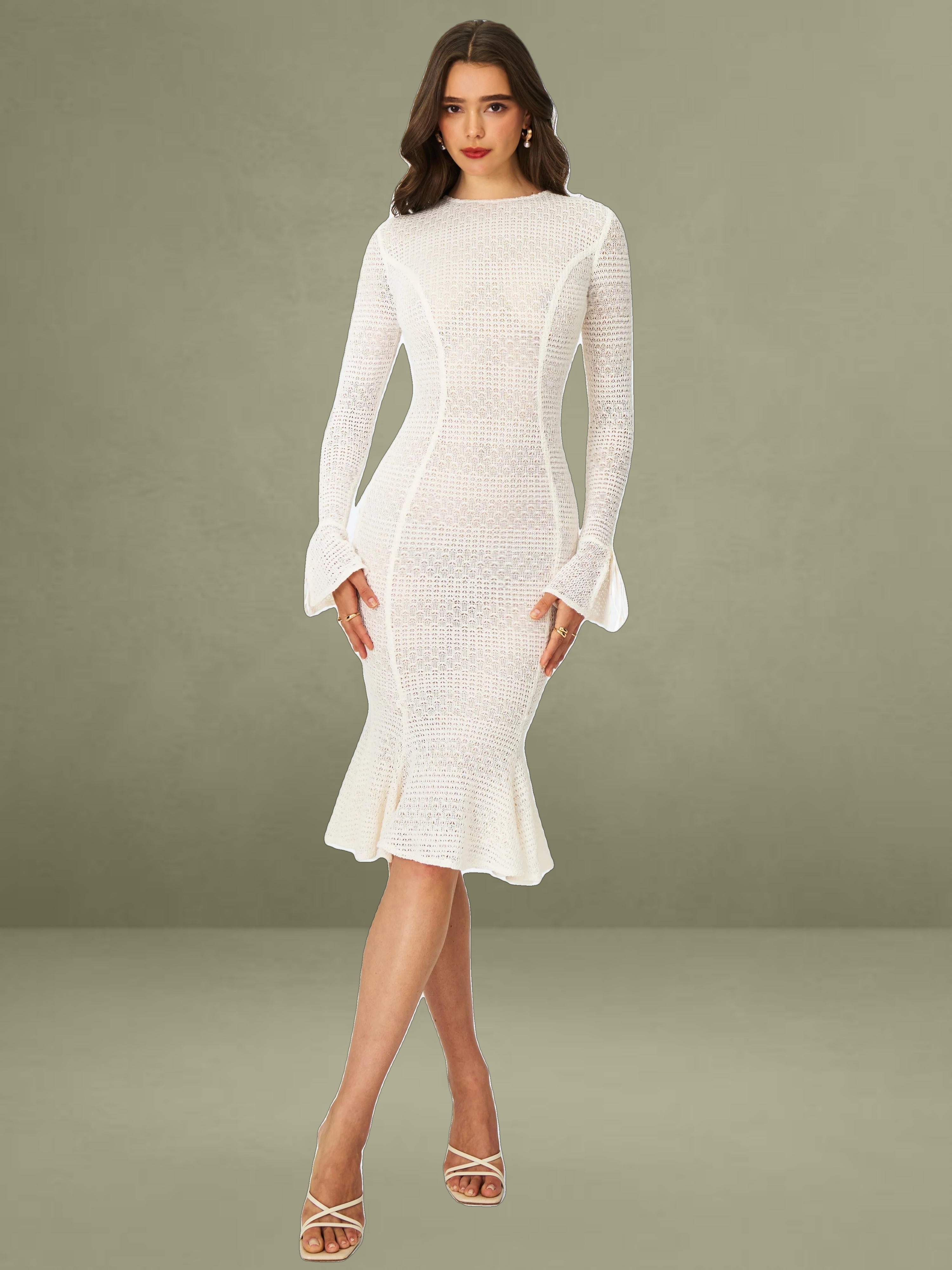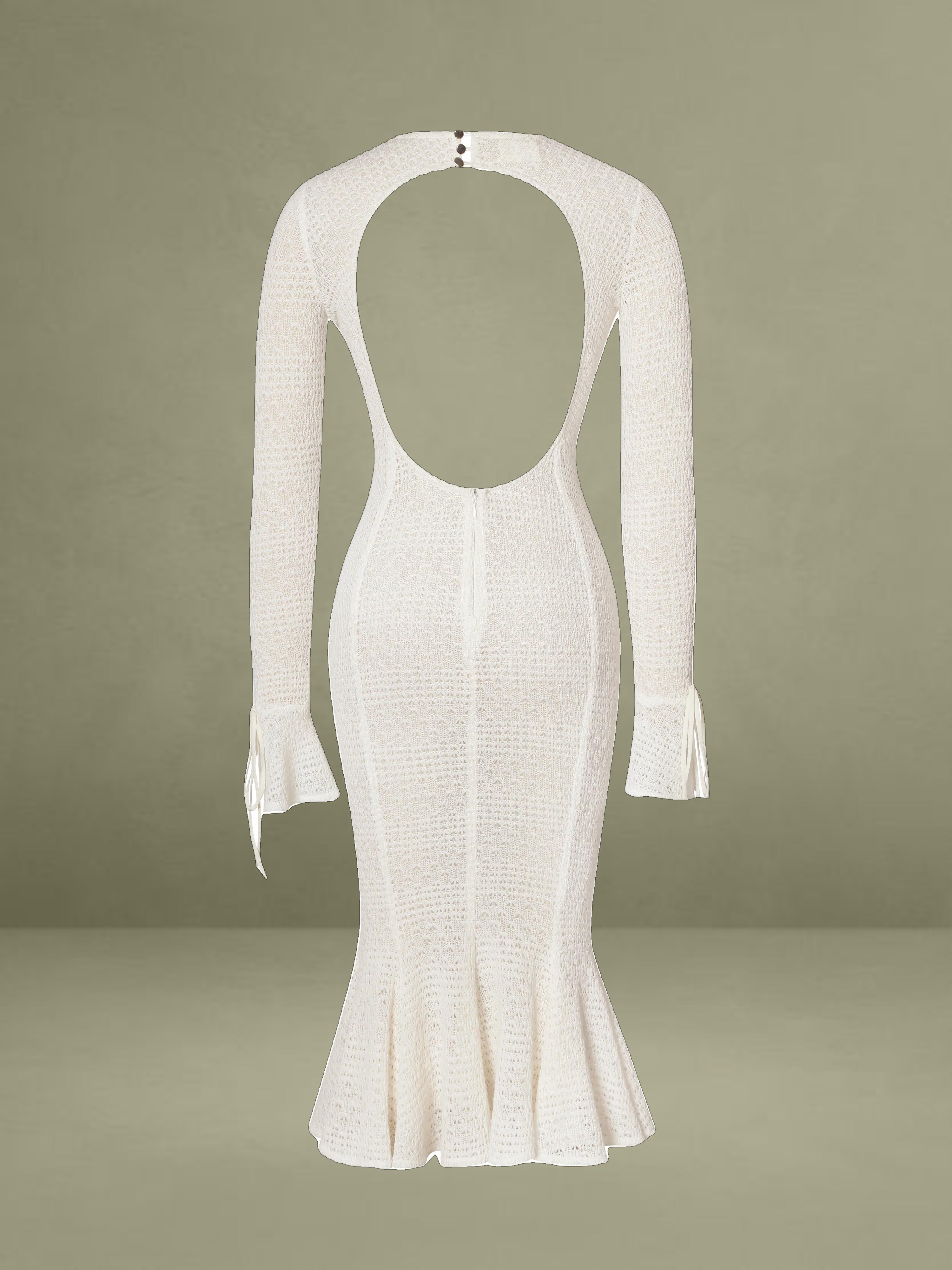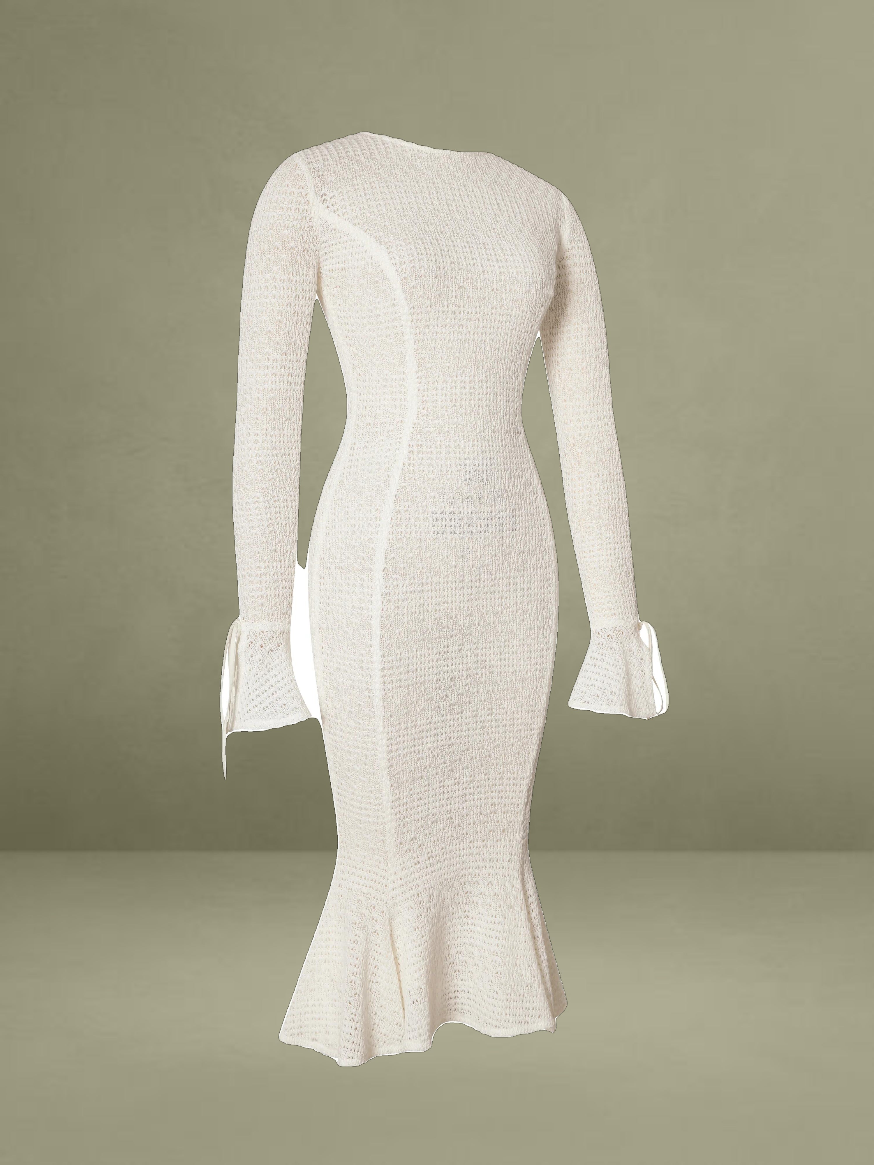 Flirty and perfect for the sun, this dress is ideal for beach vacations and warm summer days that turn into evenings. Made from a crochet-style knit that hugs the curves, it has princess seams and a gently rounded neckline leading to flared sleeves with cute bows. The midi silhouette flares out into a subtle mermaid hem, adding a fun movement with each step. A white mesh lining offers airy comfort, keeping the dress light and breathable. The open back gives a breezy and eye-catching look, secured by three small buttons at the neck and a hidden back zipper for a seamless fit. Whether worn alone or as a stylish cover-up, it exudes effortless charm.