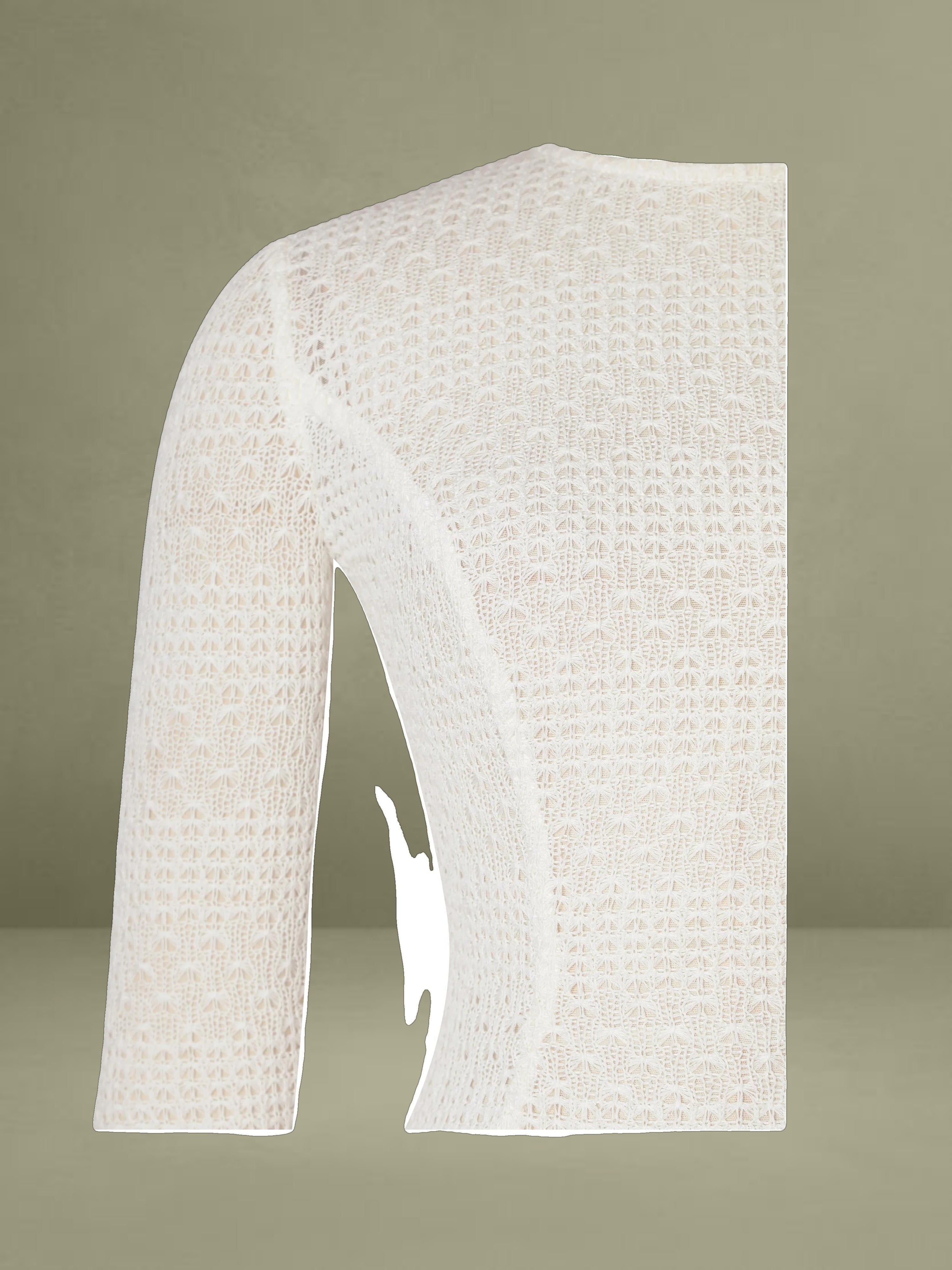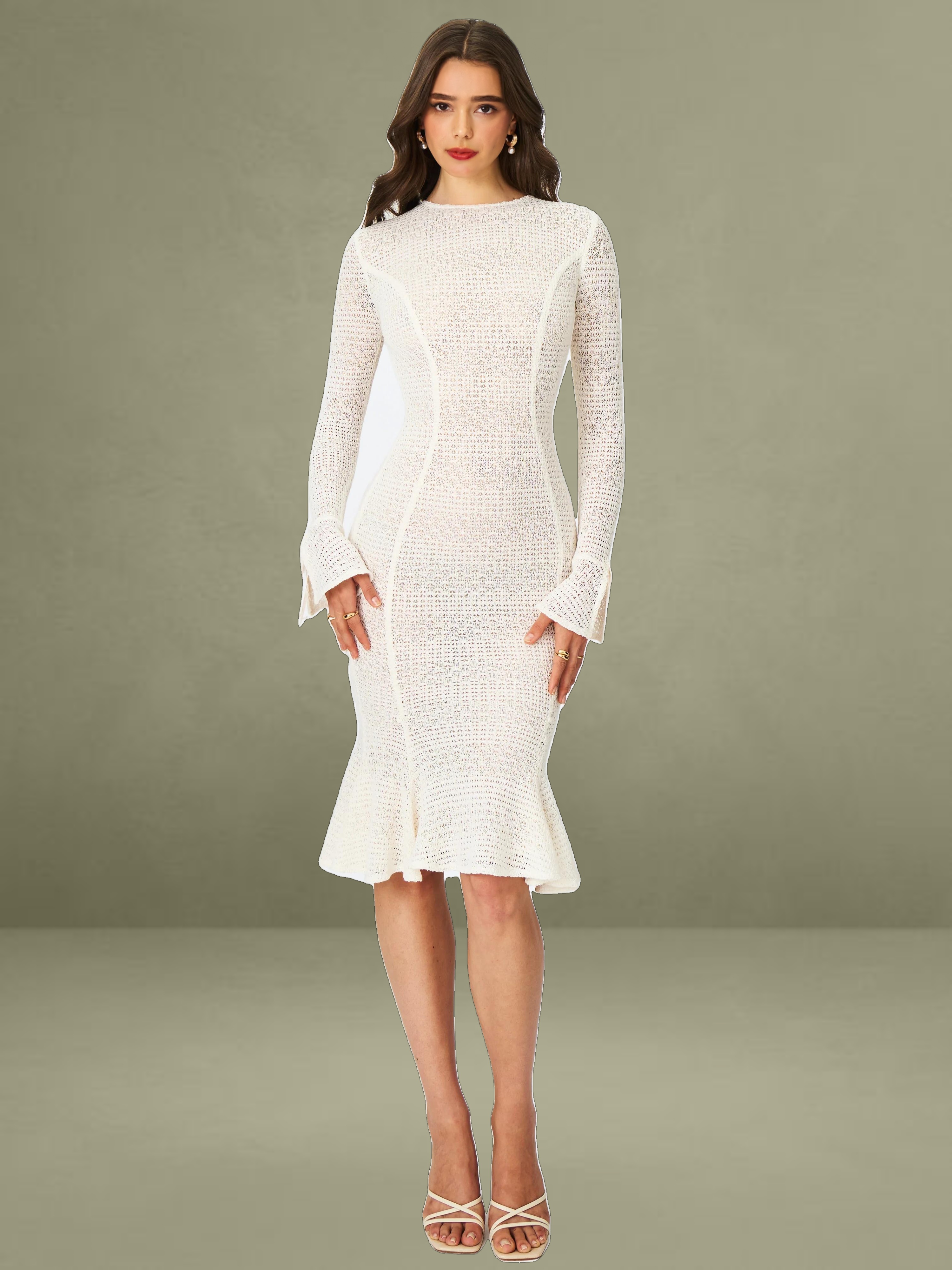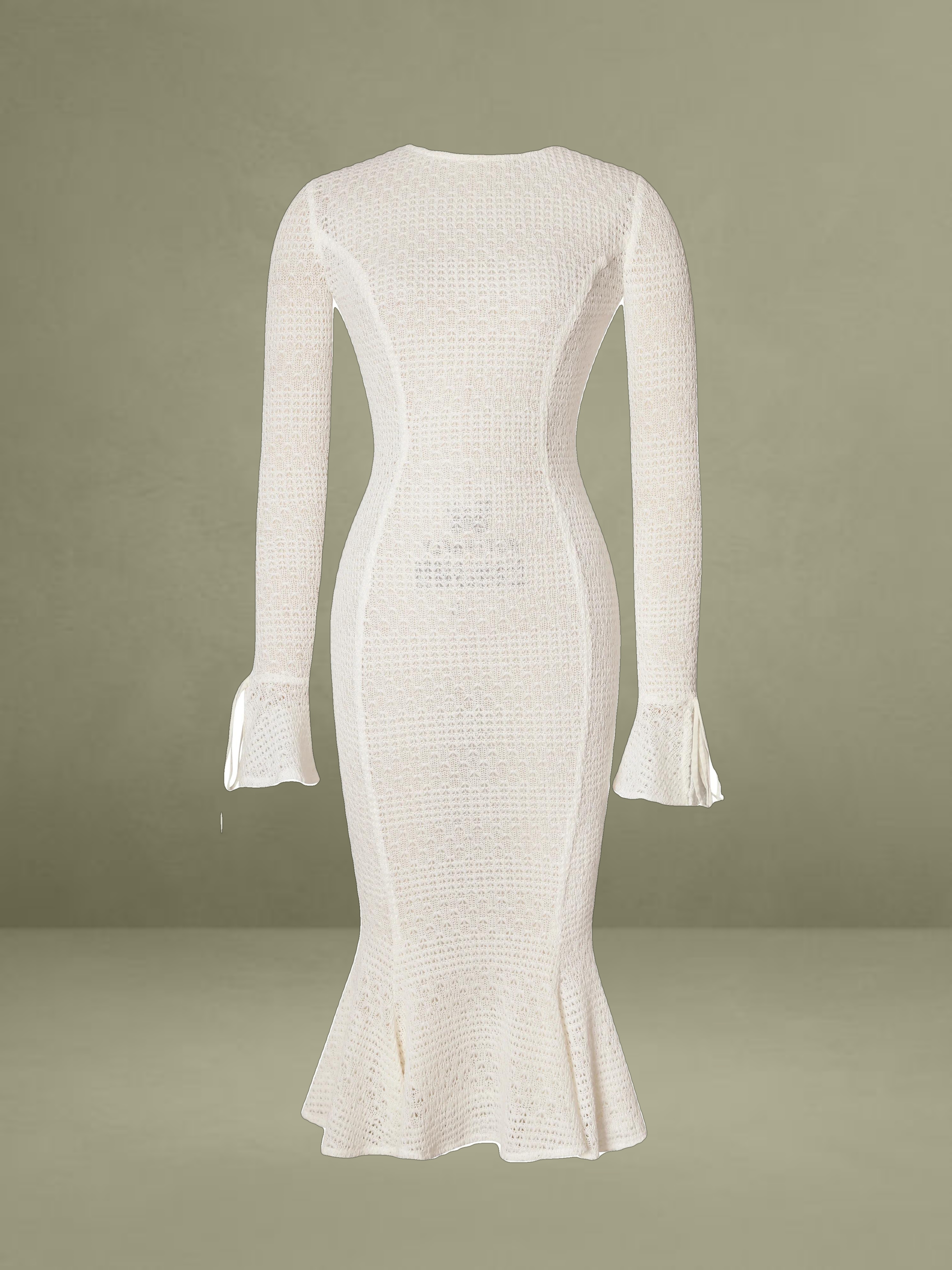 Flirty and perfect for the sun, this dress is ideal for beach vacations and warm summer days that turn into evenings. Made from a crochet-style knit that hugs the curves, it has princess seams and a gently rounded neckline leading to flared sleeves with cute bows. The midi silhouette flares out into a subtle mermaid hem, adding a fun movement with each step. A white mesh lining offers airy comfort, keeping the dress light and breathable. The open back gives a breezy and eye-catching look, secured by three small buttons at the neck and a hidden back zipper for a seamless fit. Whether worn alone or as a stylish cover-up, it exudes effortless charm.
