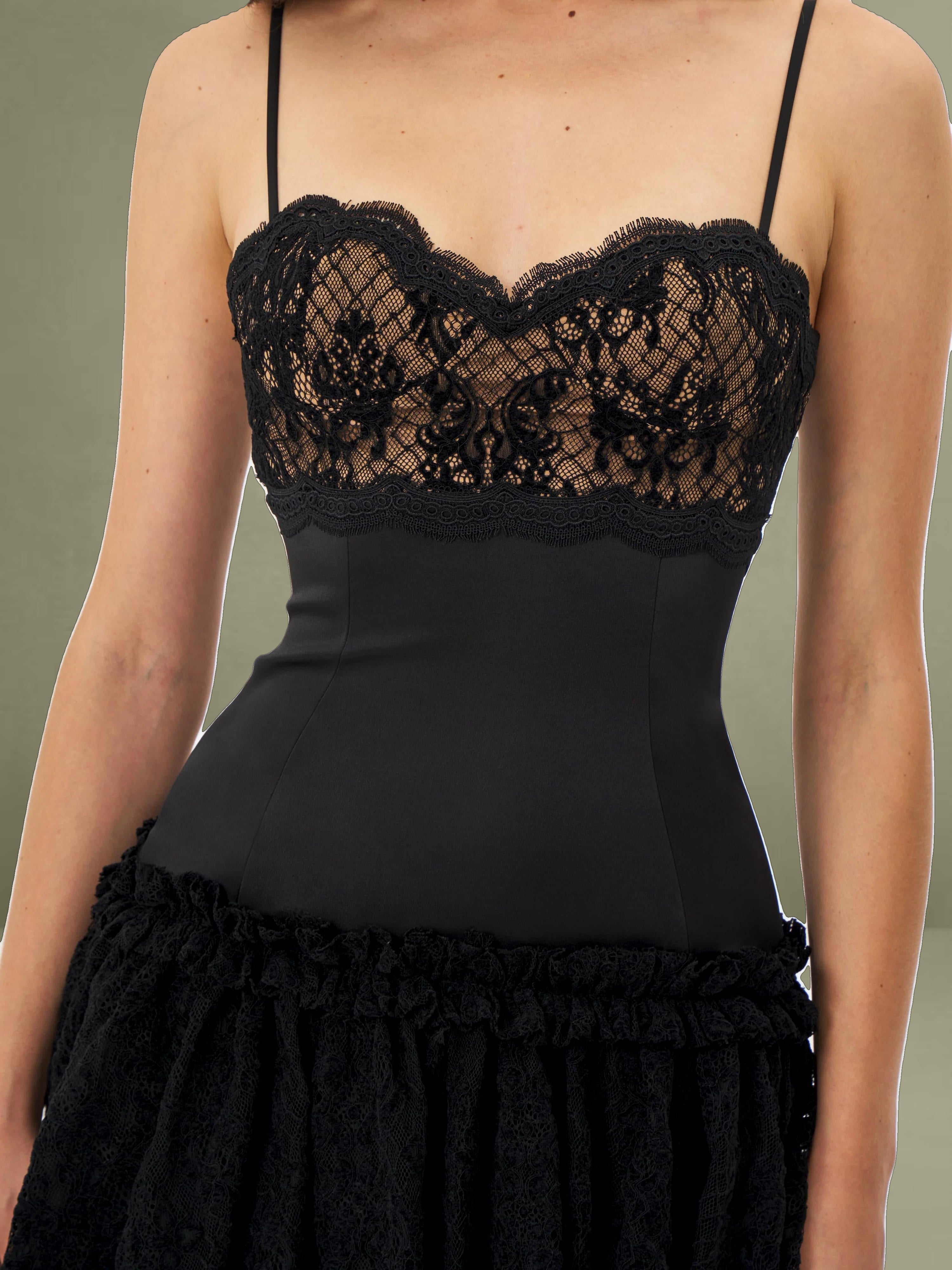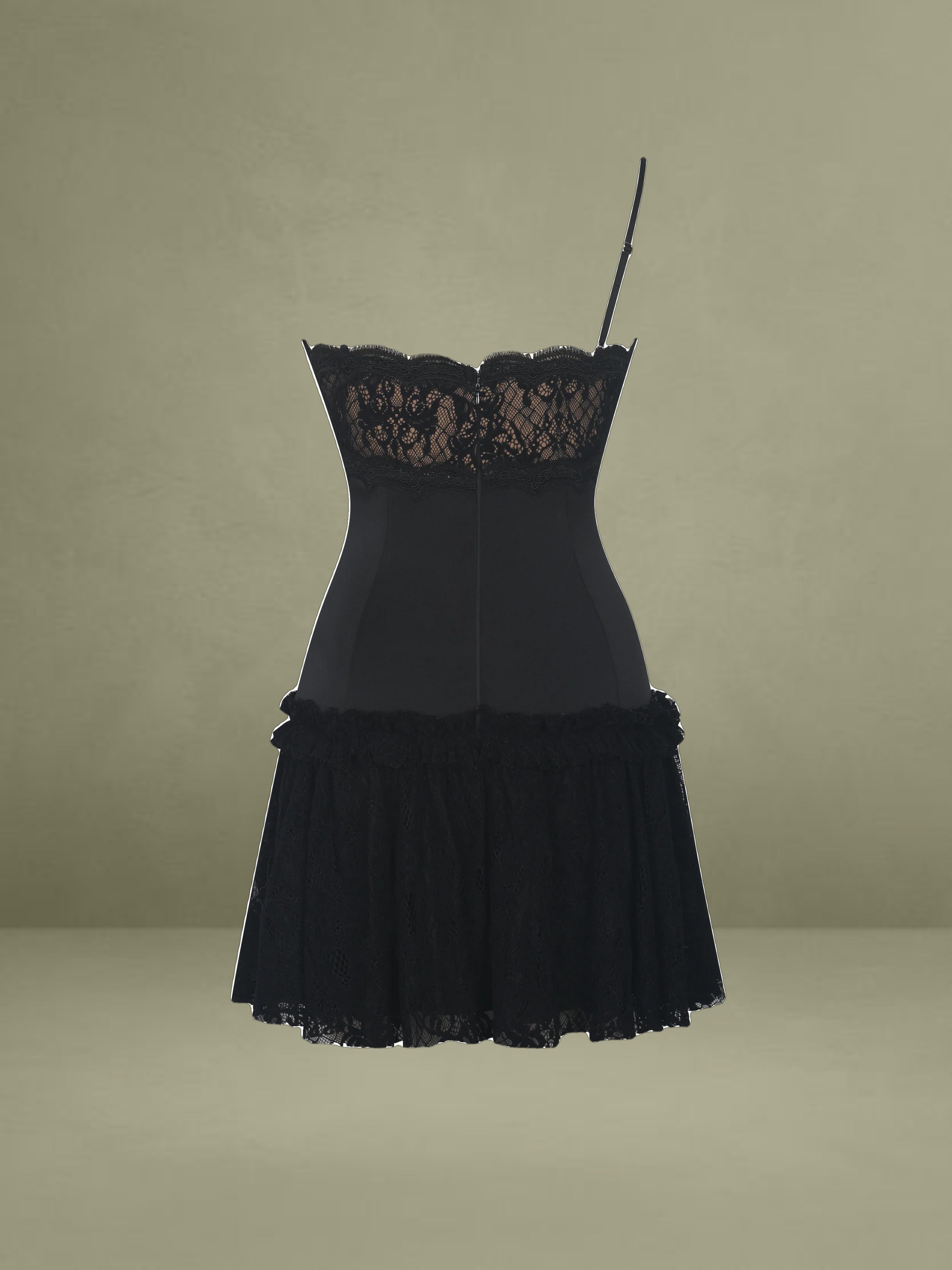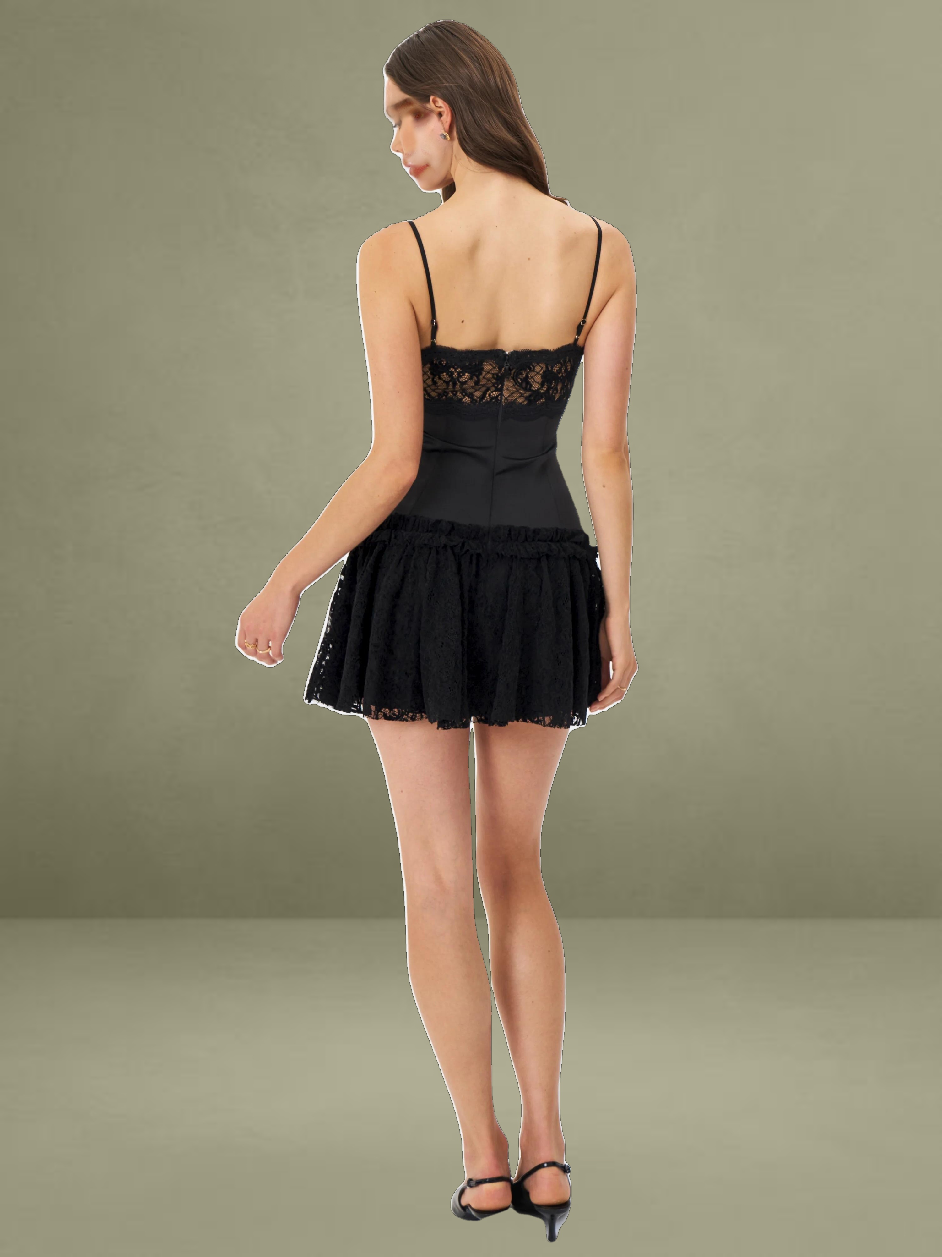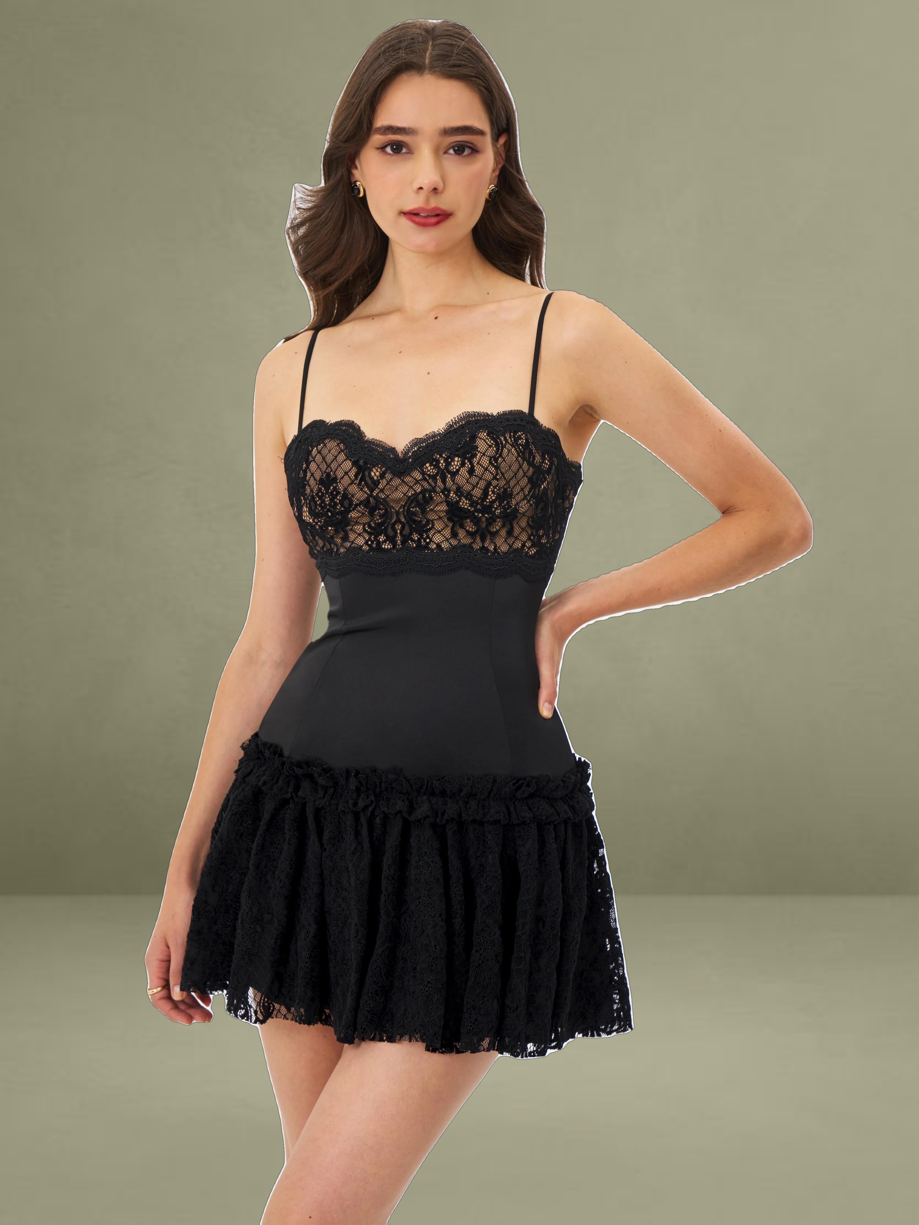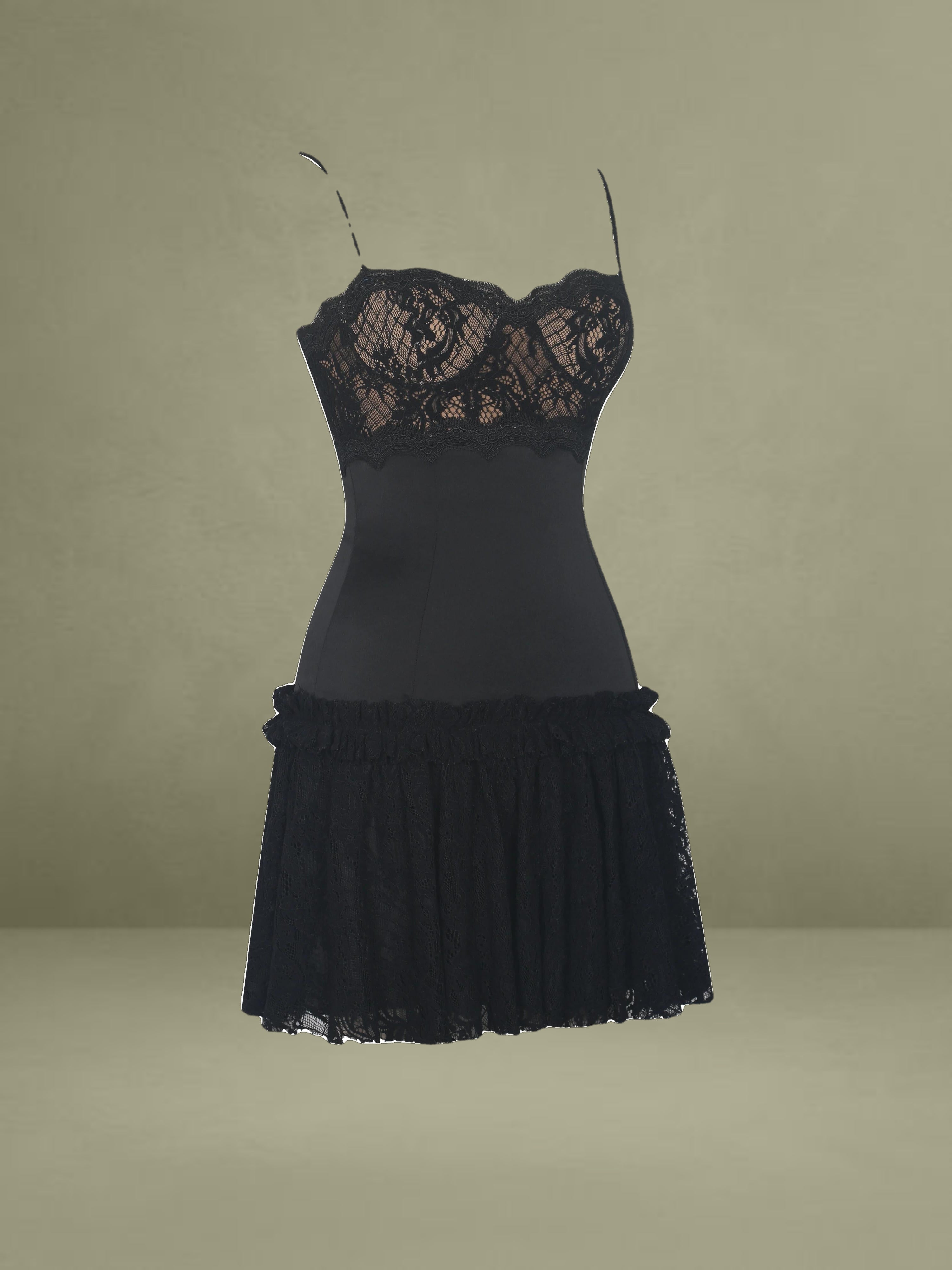 Discover this charming dress that combines timeless romance with a flirty touch. Featuring a satin bodice and a lace overlay, this mini dress perfectly balances sensuality and sweetness. Built-in cups with a nude lining create a bold contrast under the delicate black lace. Adjustable spaghetti straps and princess seams ensure a perfect, figure-hugging fit. A gathered lace hem adds a playful bounce, and an invisible back zipper provides a seamless finish. Sexy and full of fun, this dress is ideal for rooftop cocktails, impromptu date nights, or any evening when one dance leads to the end of the party.