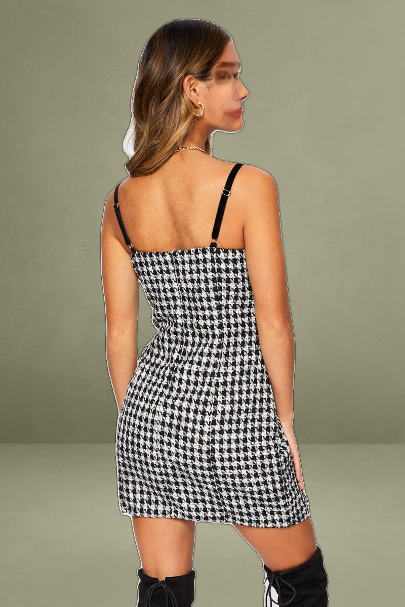 Features: Adjustable Straps, Houndstooth Check, Bodycon Mini, Velour Detailing