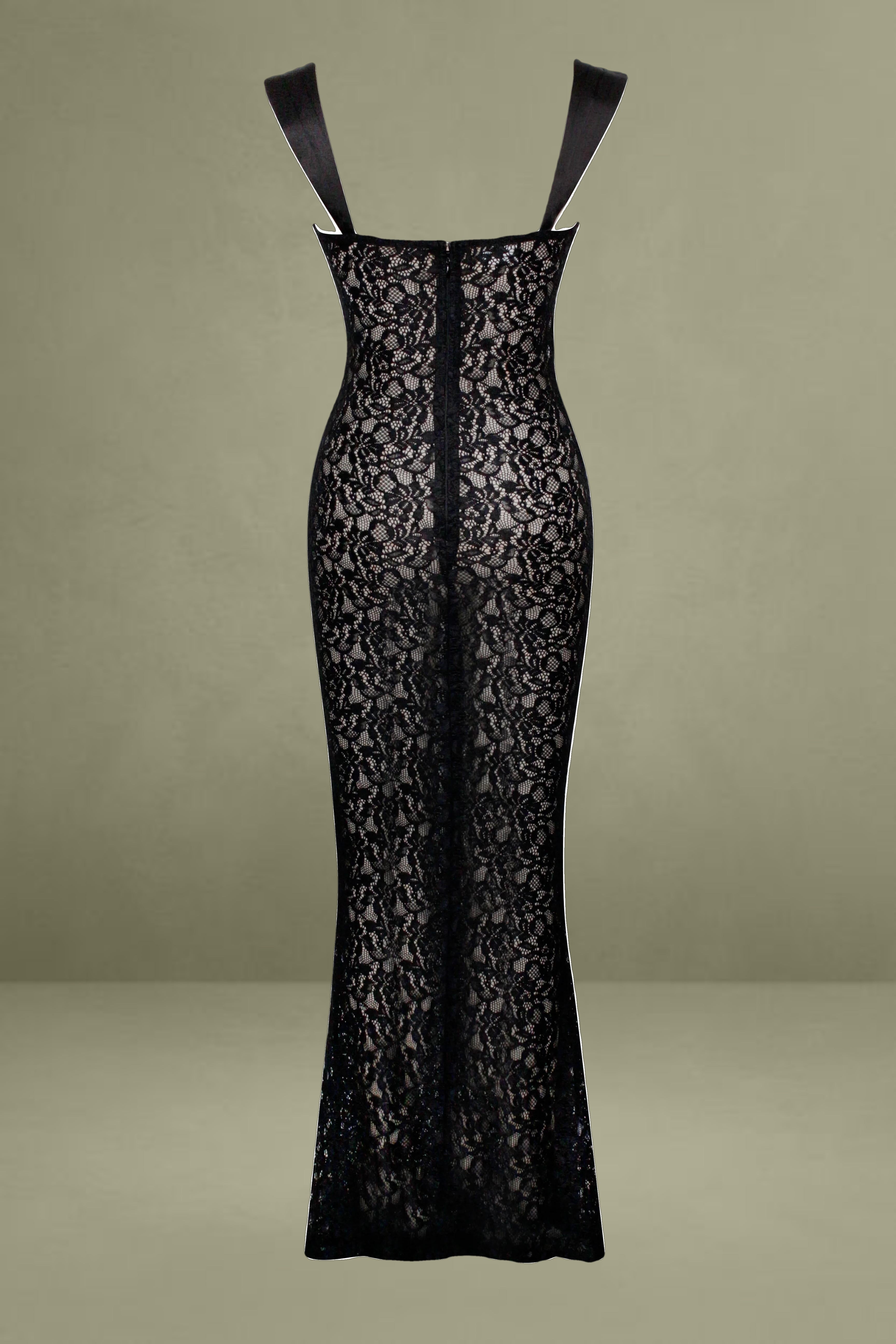 Unleash your inner fashionista! This dress features a gentle mermaid shape, gathered straps, and delicate lacework, creating a captivating look that will draw attention everywhere. There's an invisible zipper at the center back for easy wearing. Made from sheer fabric and double satin straps with a stretchy lace bodice, it's ideal for special occasions or casual evenings out.
