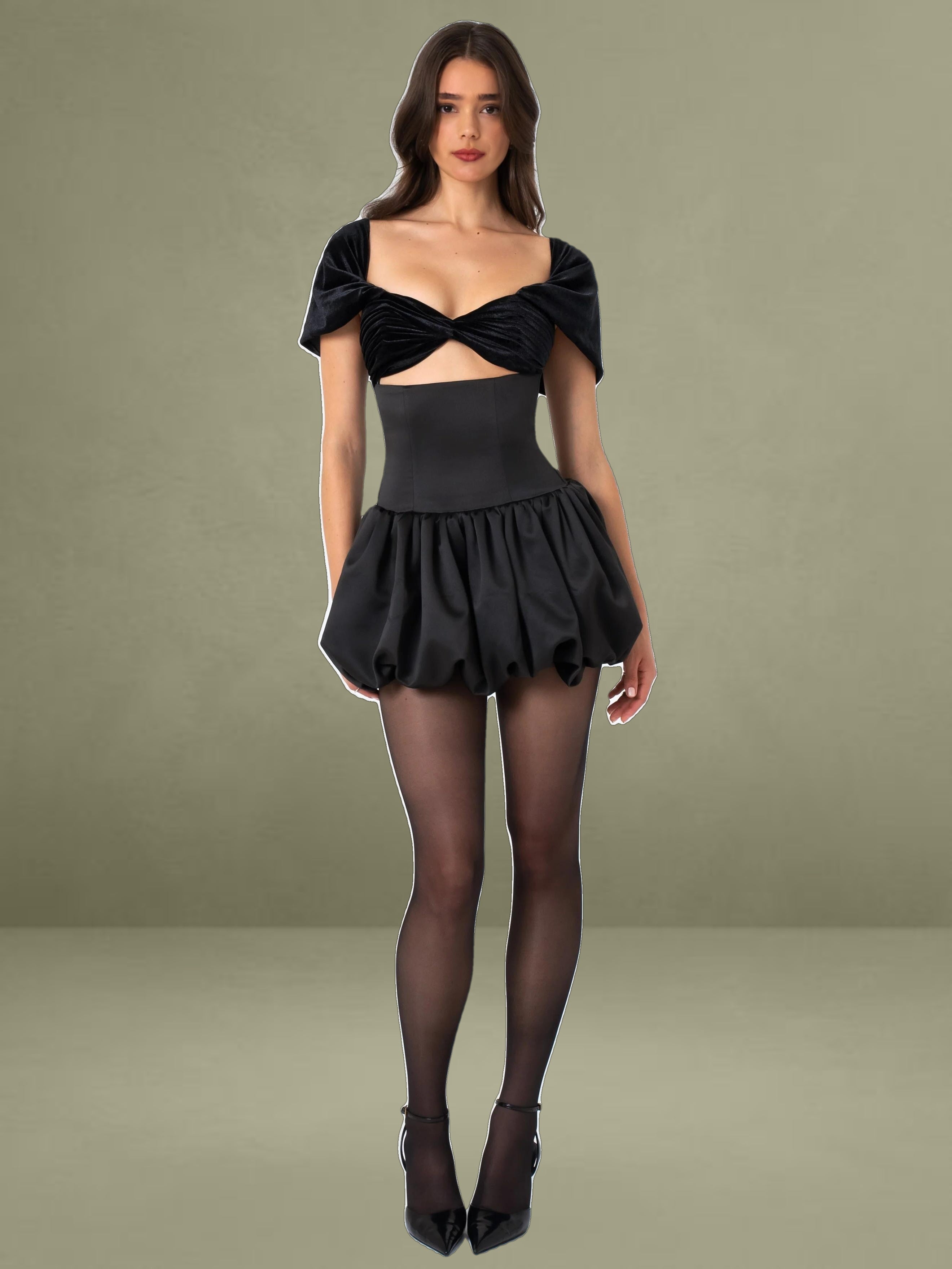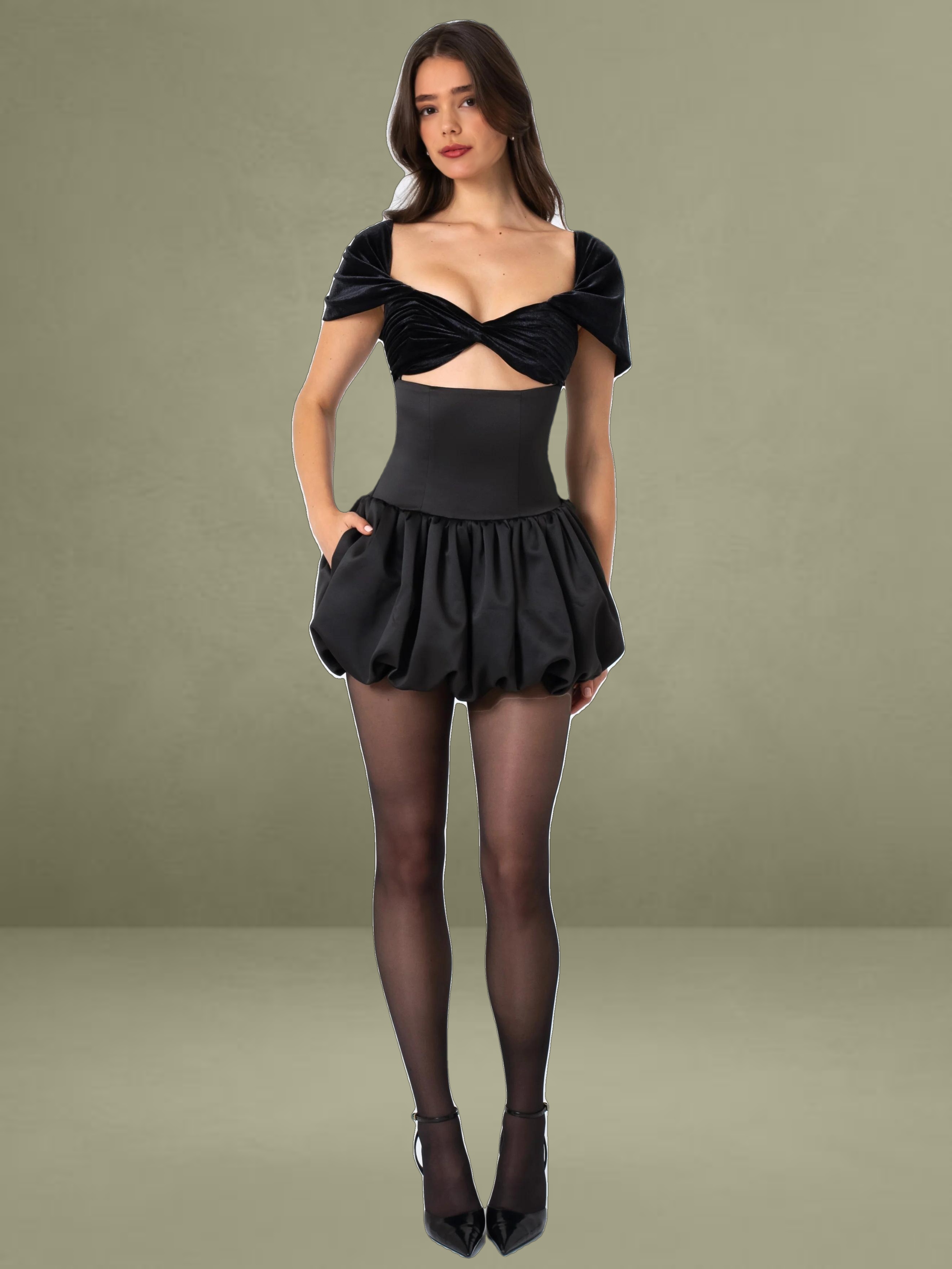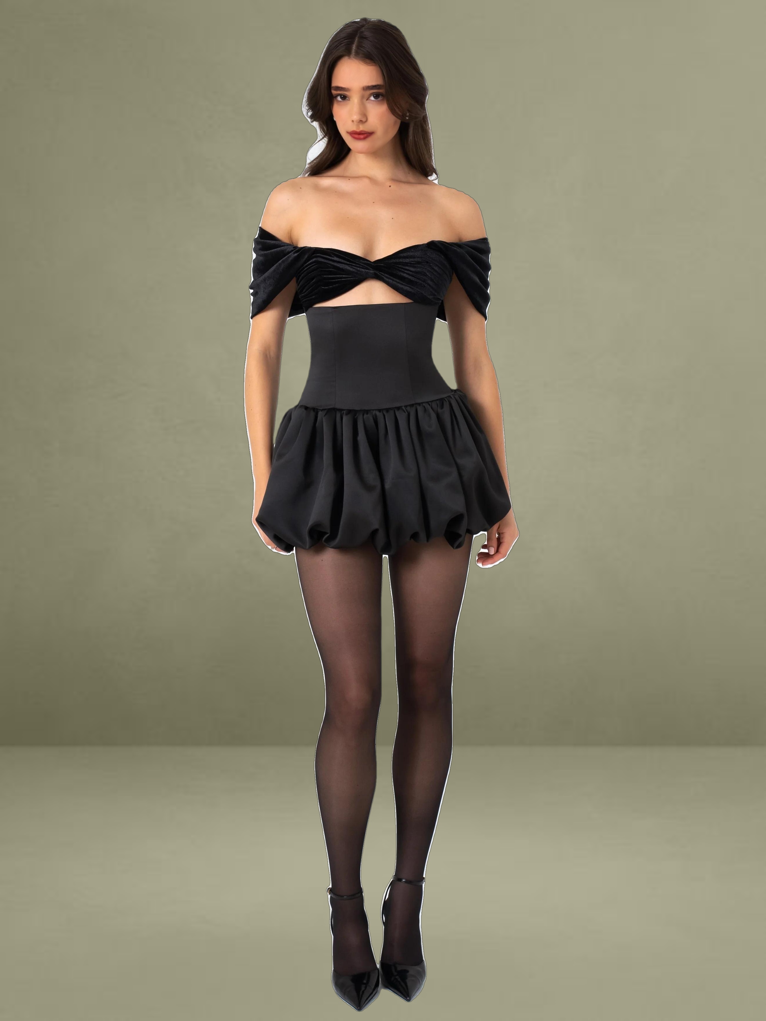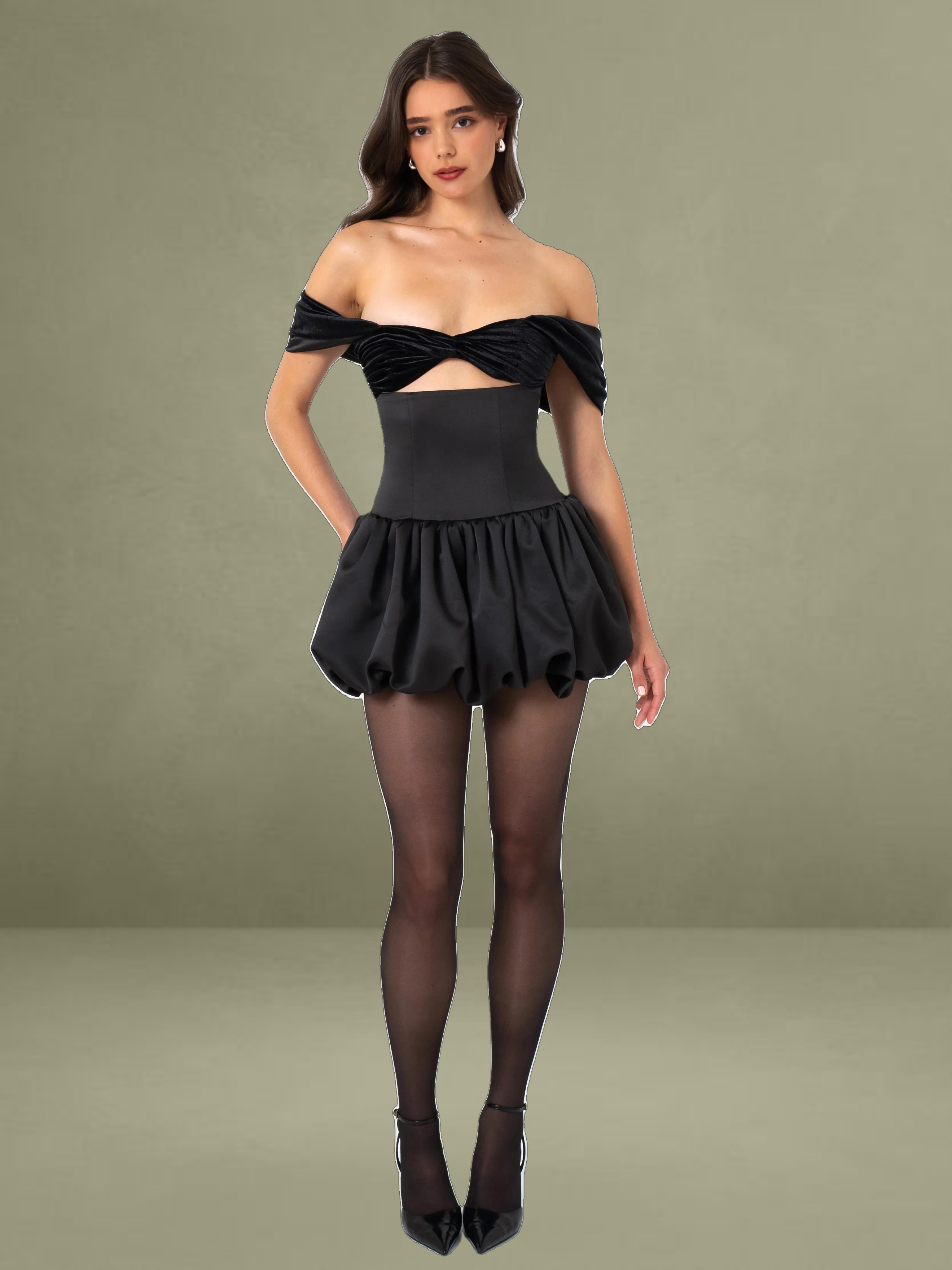 Discover a beautiful mini dress, a refined Fall-Winter version. It features an elegant off-shoulder design, with pleated luxury velvet cups adding a touch of grandeur. The drop waist enhances the silhouette, and the bubble hem creates a playful, voluminous appearance. It has convenient pockets and a fully lined interior for comfort, combining practicality with style. An invisible zipper gives it a seamless look, effortlessly merging classic sophistication with contemporary charm, making it perfect for special occasions. This style also comes in White with Black Polka Dots and Pure White.