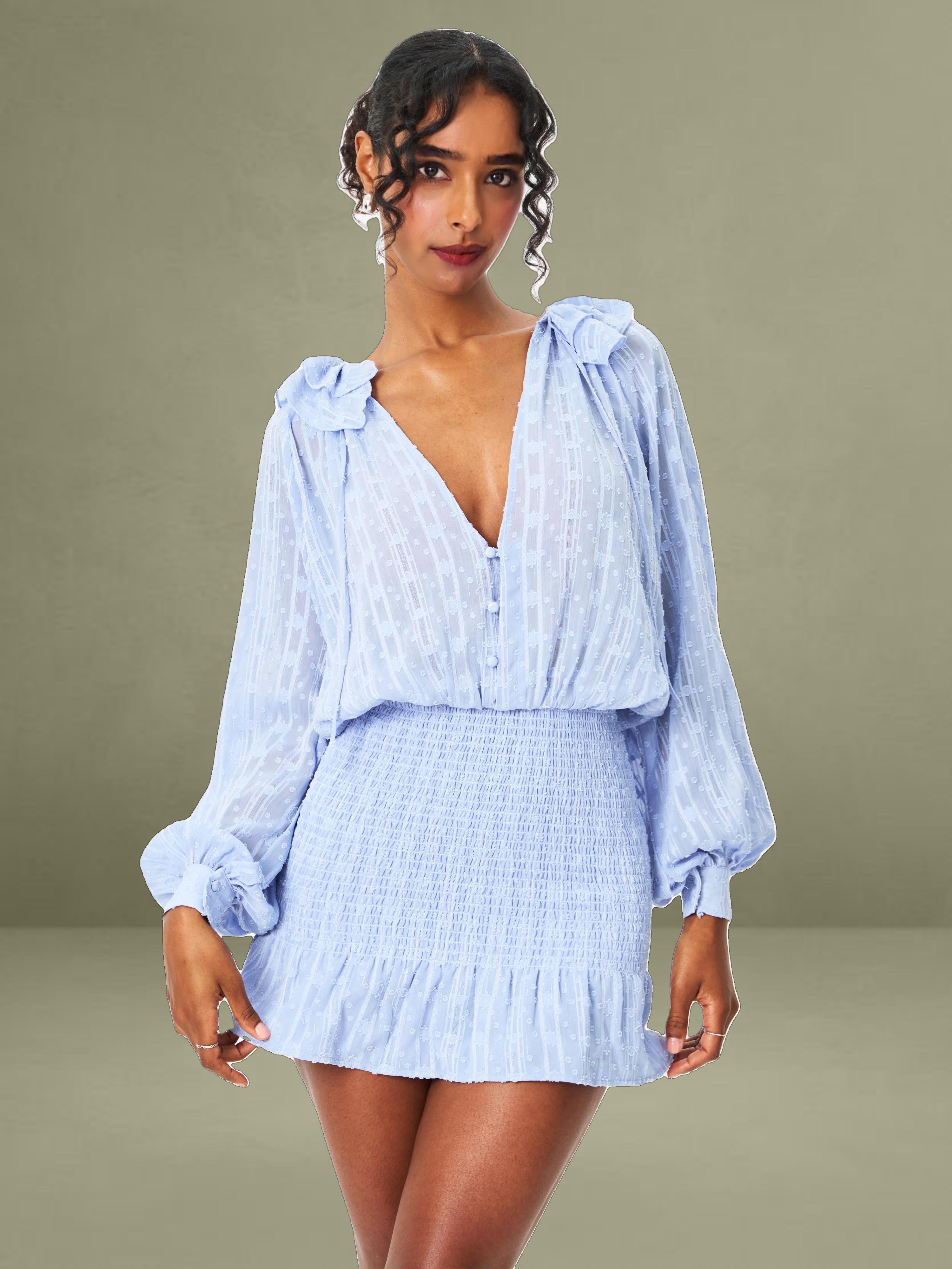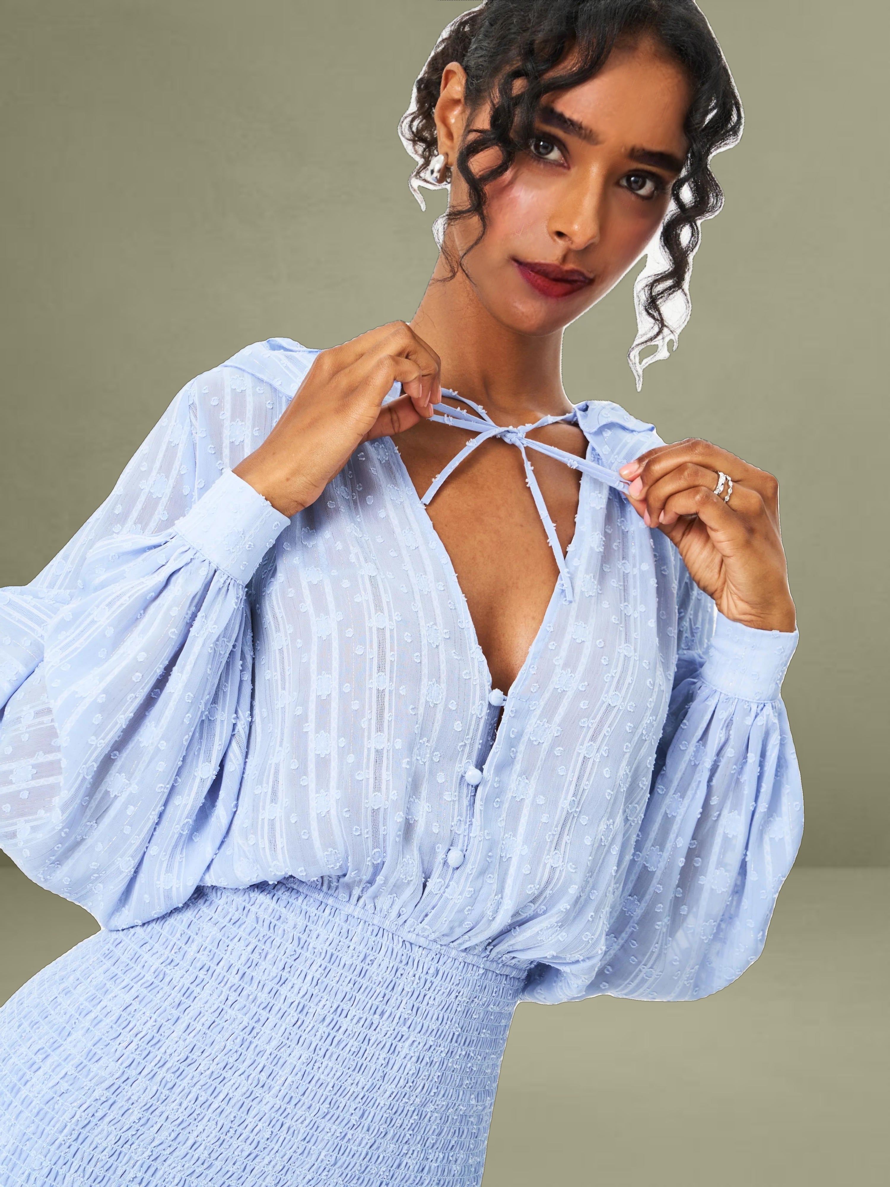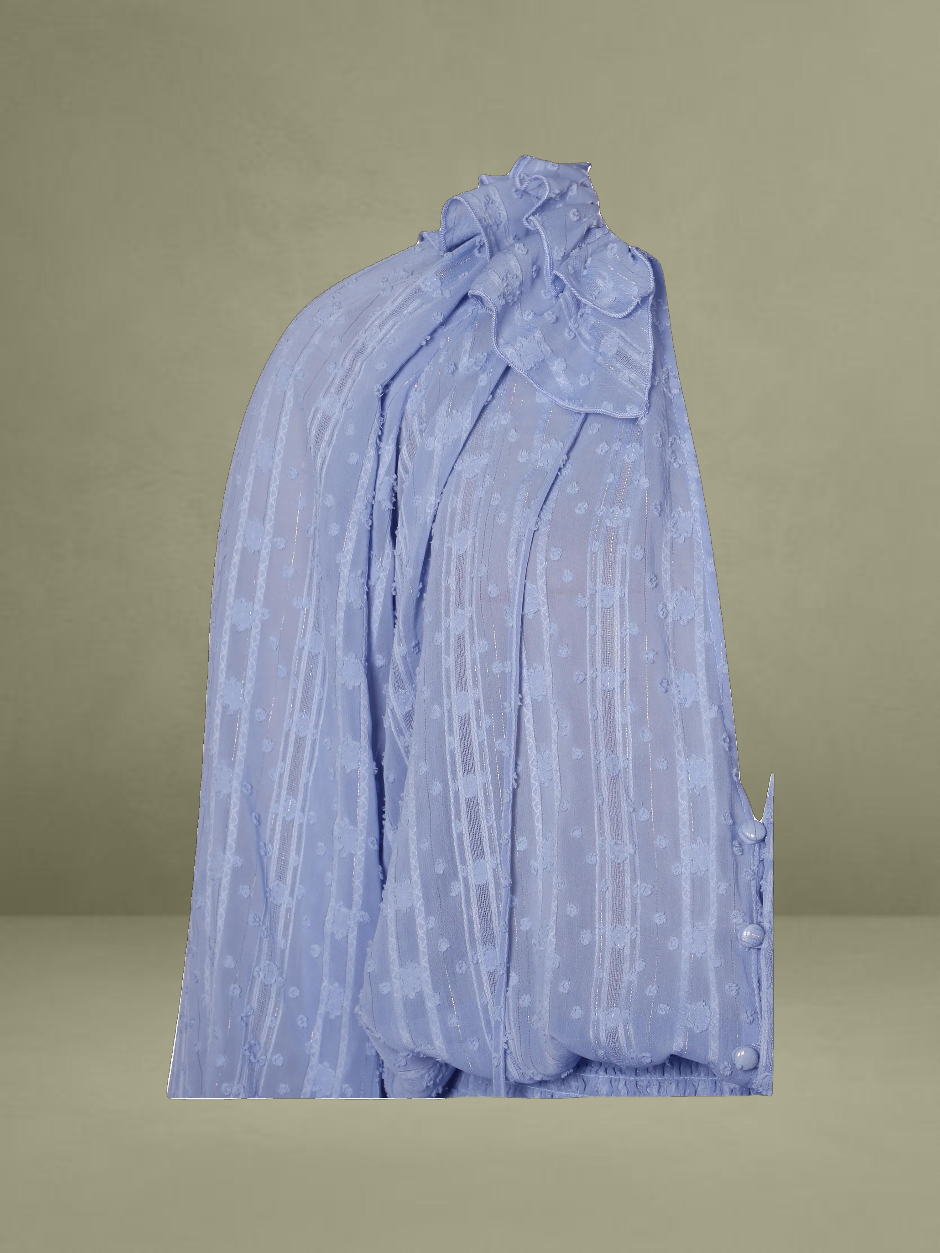 Charming and stylish, this dress is made from light blue jacquard chiffon, giving it a dreamy and airy feel. It has a standout flared collar, romantic long balloon sleeves, and a gently flared hem that adds grace to your every move. The smocked bottom and cinched waist create an attractive figure, while the front button closure adds a touch of vintage charm. Ideal for sunny walks, weekend trips, or enhancing your daily outfit.