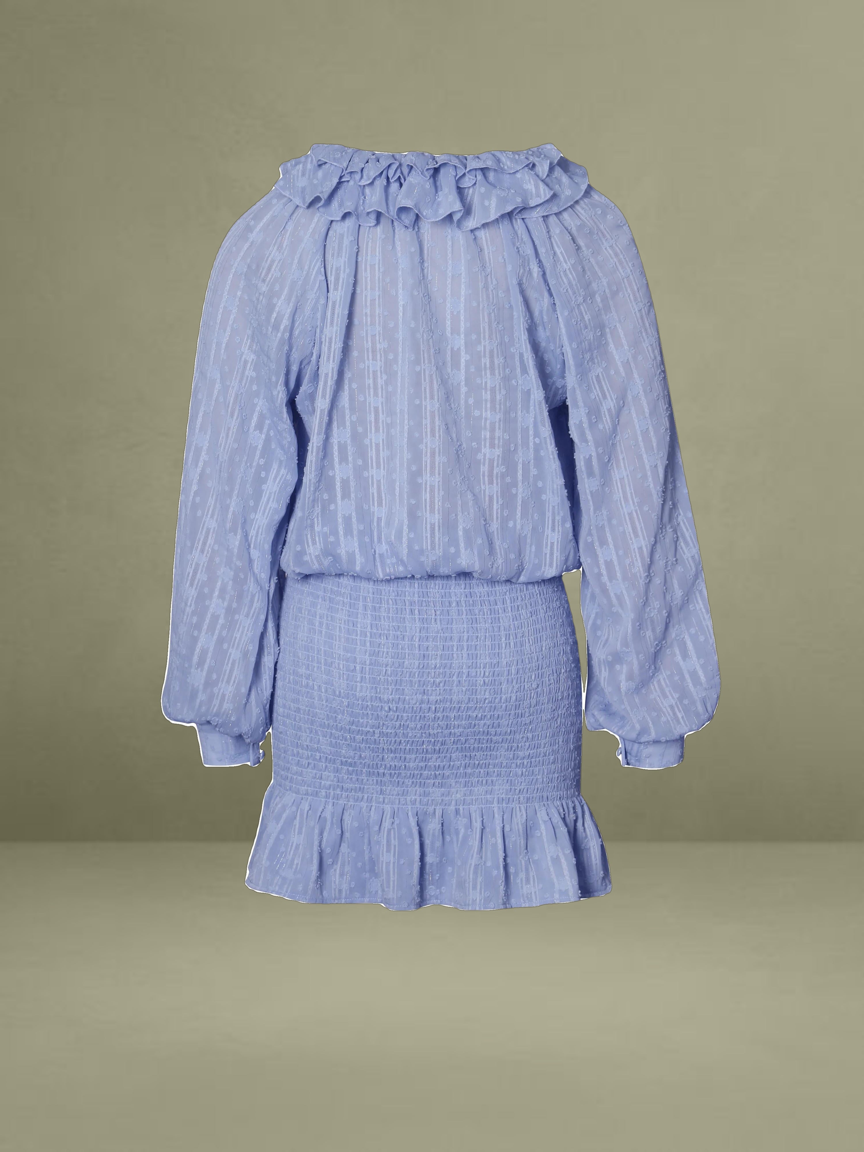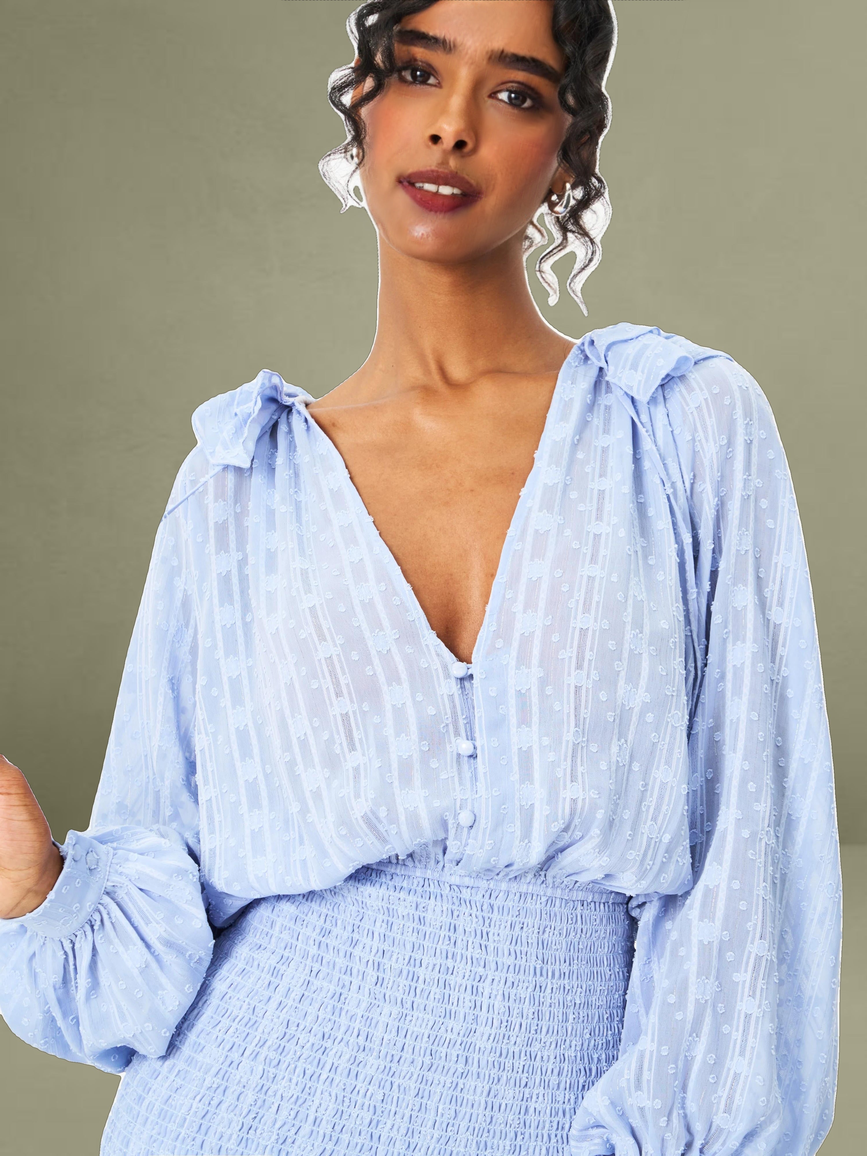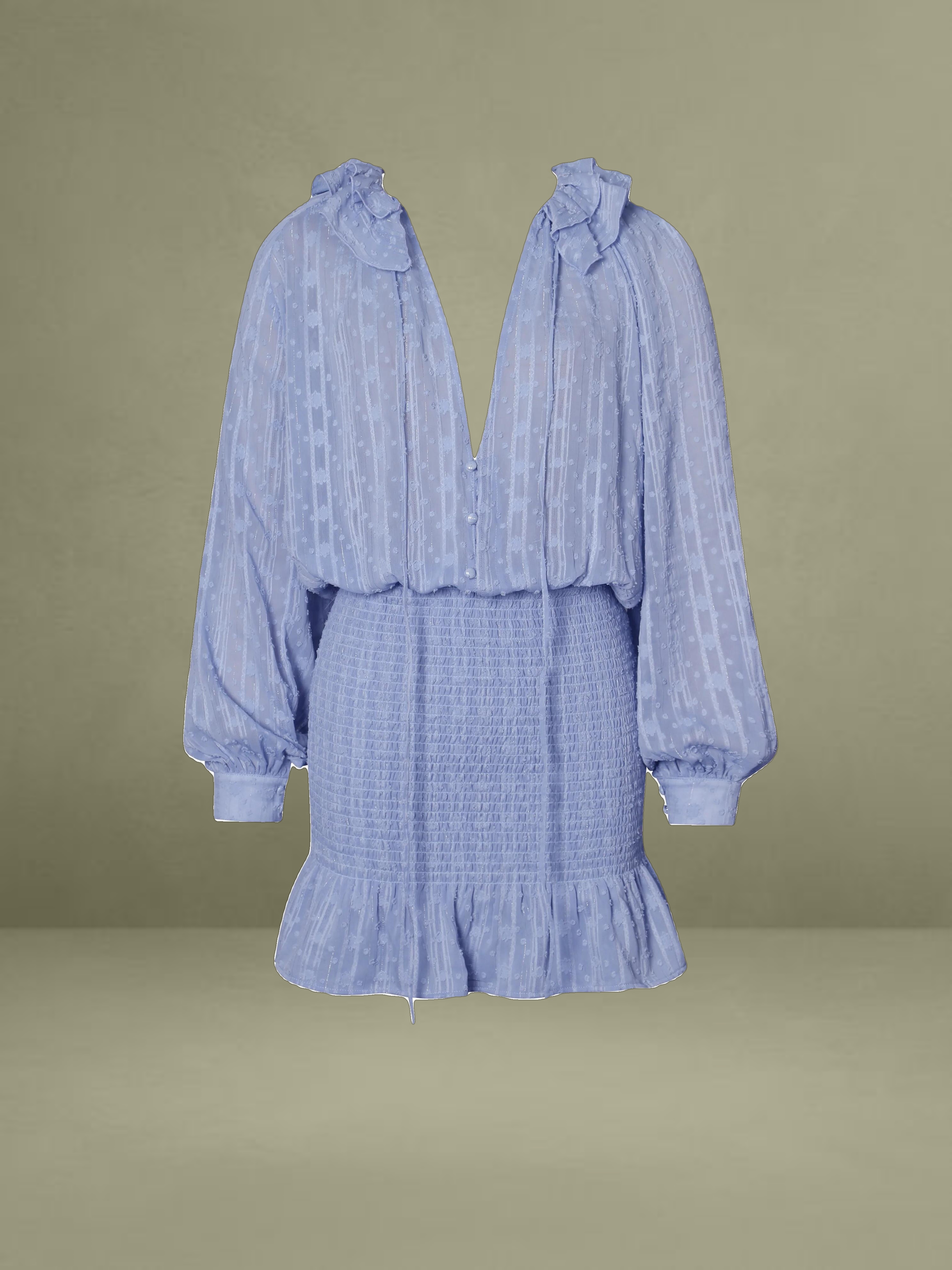 Charming and stylish, this dress is made from light blue jacquard chiffon, giving it a dreamy and airy feel. It has a standout flared collar, romantic long balloon sleeves, and a gently flared hem that adds grace to your every move. The smocked bottom and cinched waist create an attractive figure, while the front button closure adds a touch of vintage charm. Ideal for sunny walks, weekend trips, or enhancing your daily outfit.
