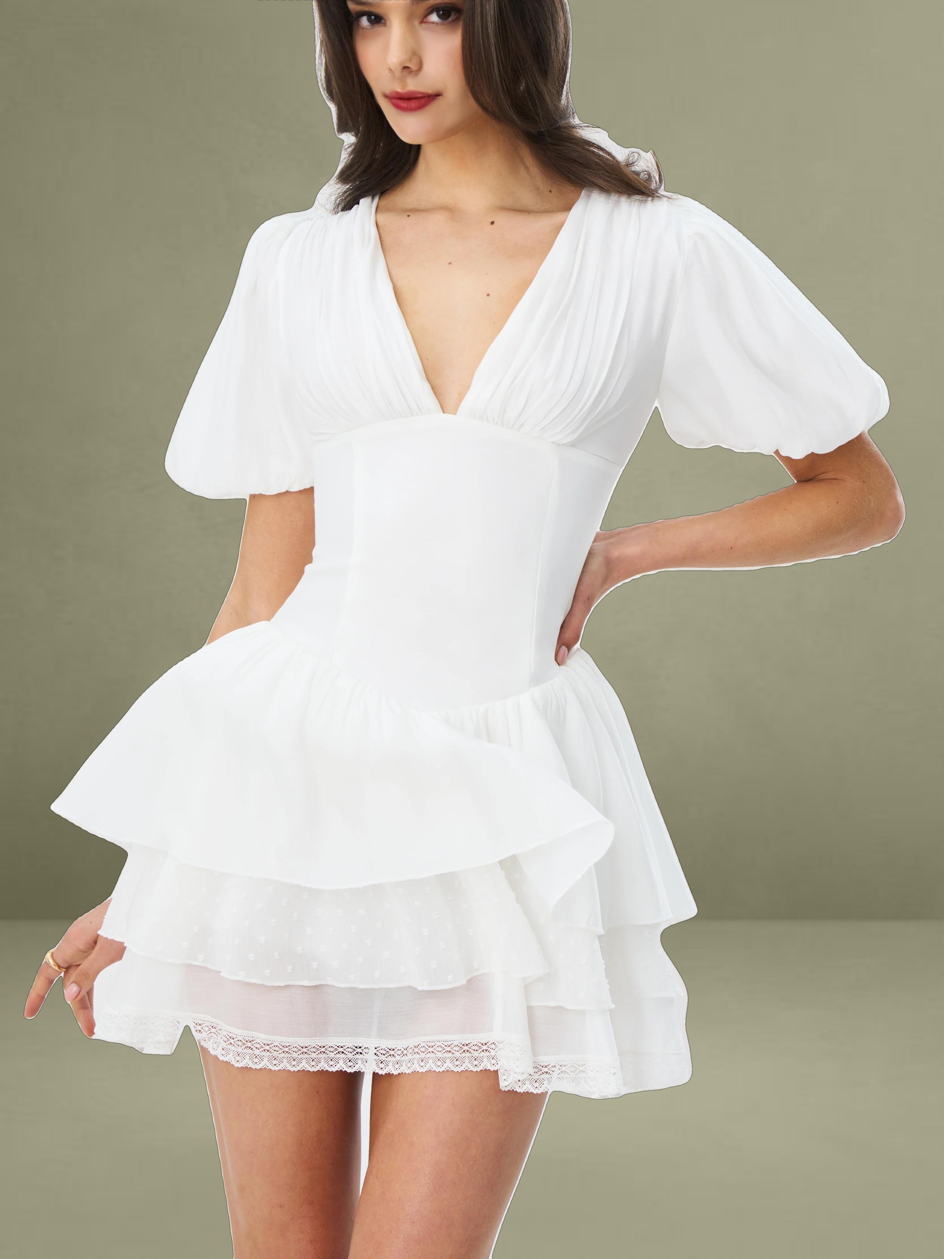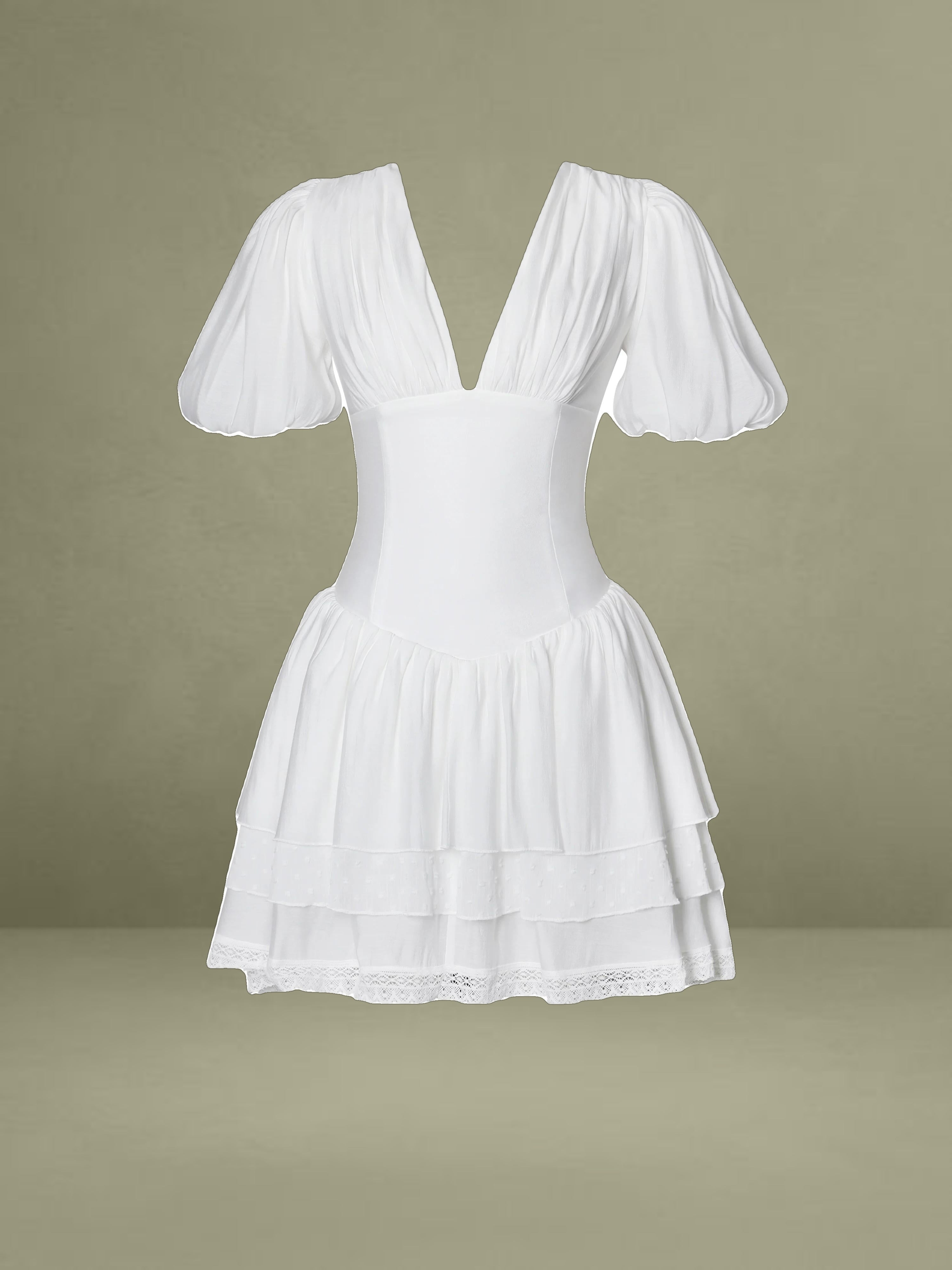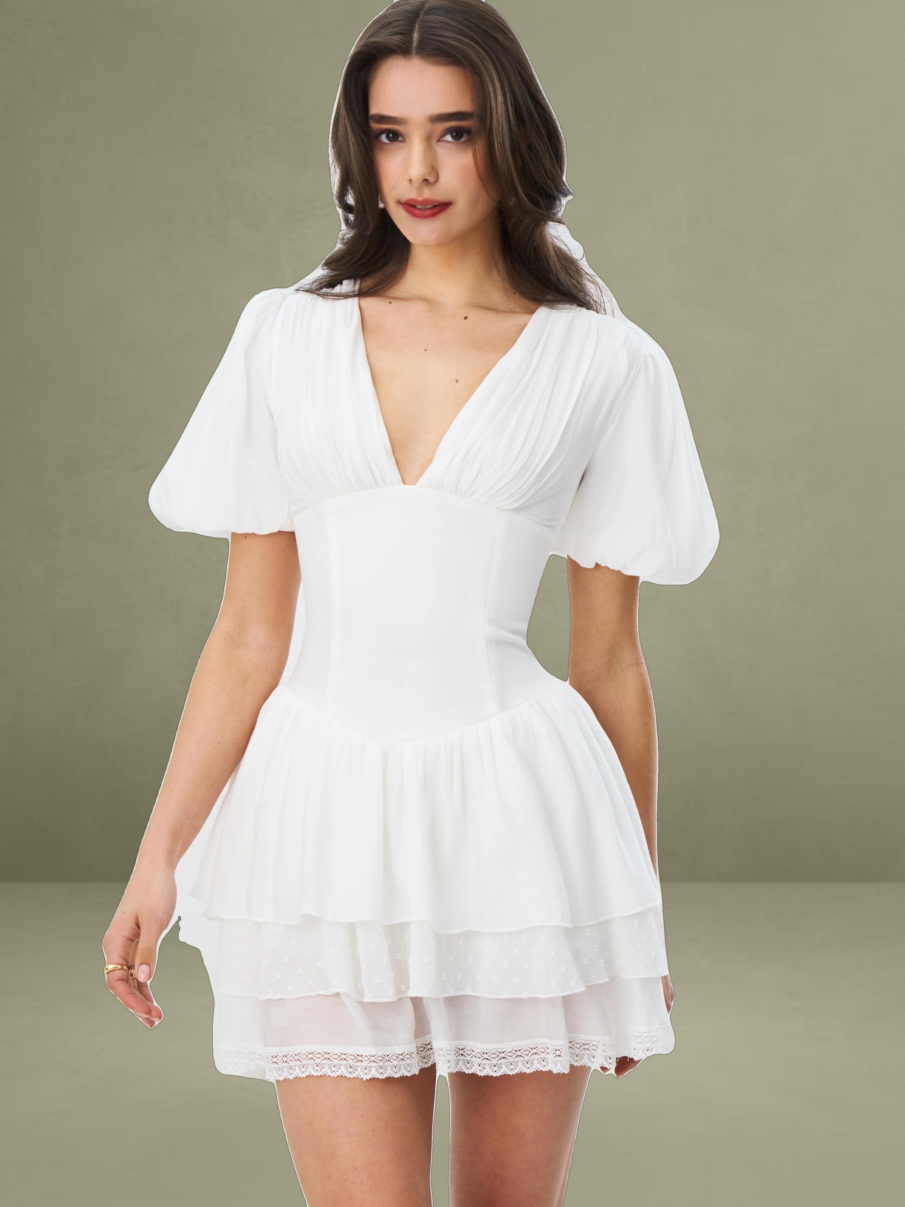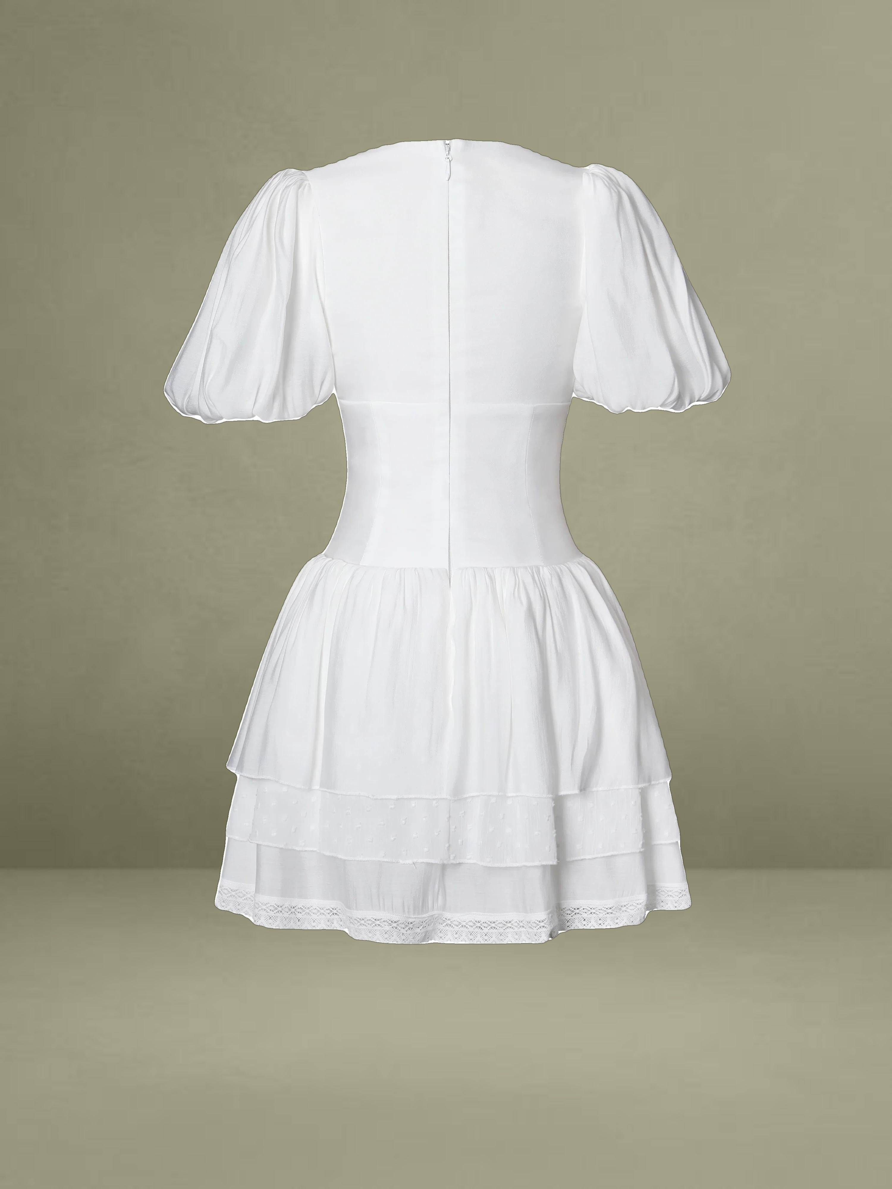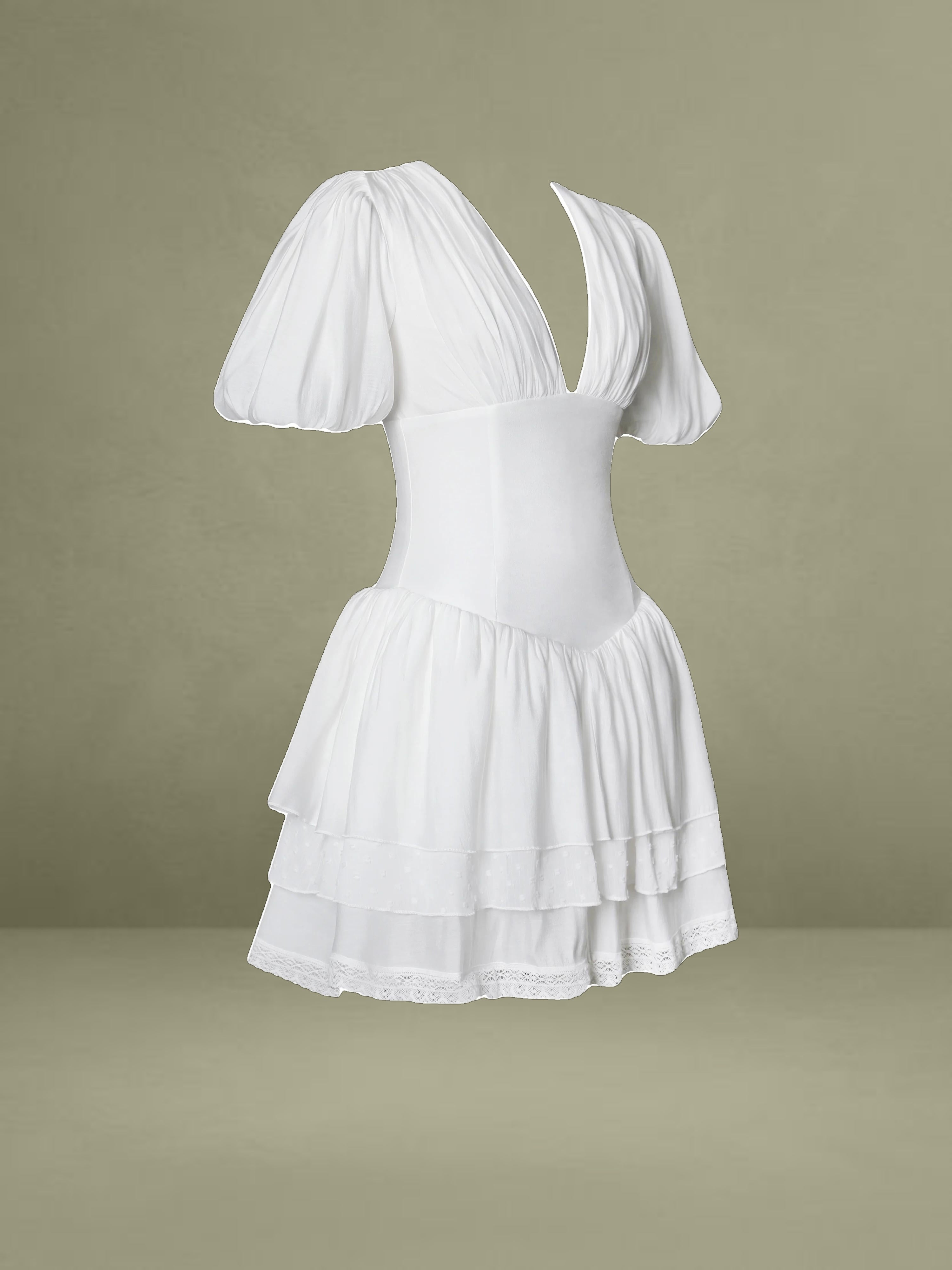 Embrace summer romance with the Caitlyn Dress, a dreamy vision in white designed for warm, sunlit days. Featuring delicate bubble short sleeves and a ruched front bodice, this piece flatters effortlessly with a built-in corset that enhances your natural silhouette. The three-layer skirt adds ethereal movement, showcasing a dotted mesh mid layer and a lace-trimmed bottom layer for a soft, whimsical finish. Crafted from eco-luxe fabric and fully lined for comfort, this dress is finished with an invisible zipper for a seamless fit—perfect for summer occasions, garden strolls, or weekend escapes.