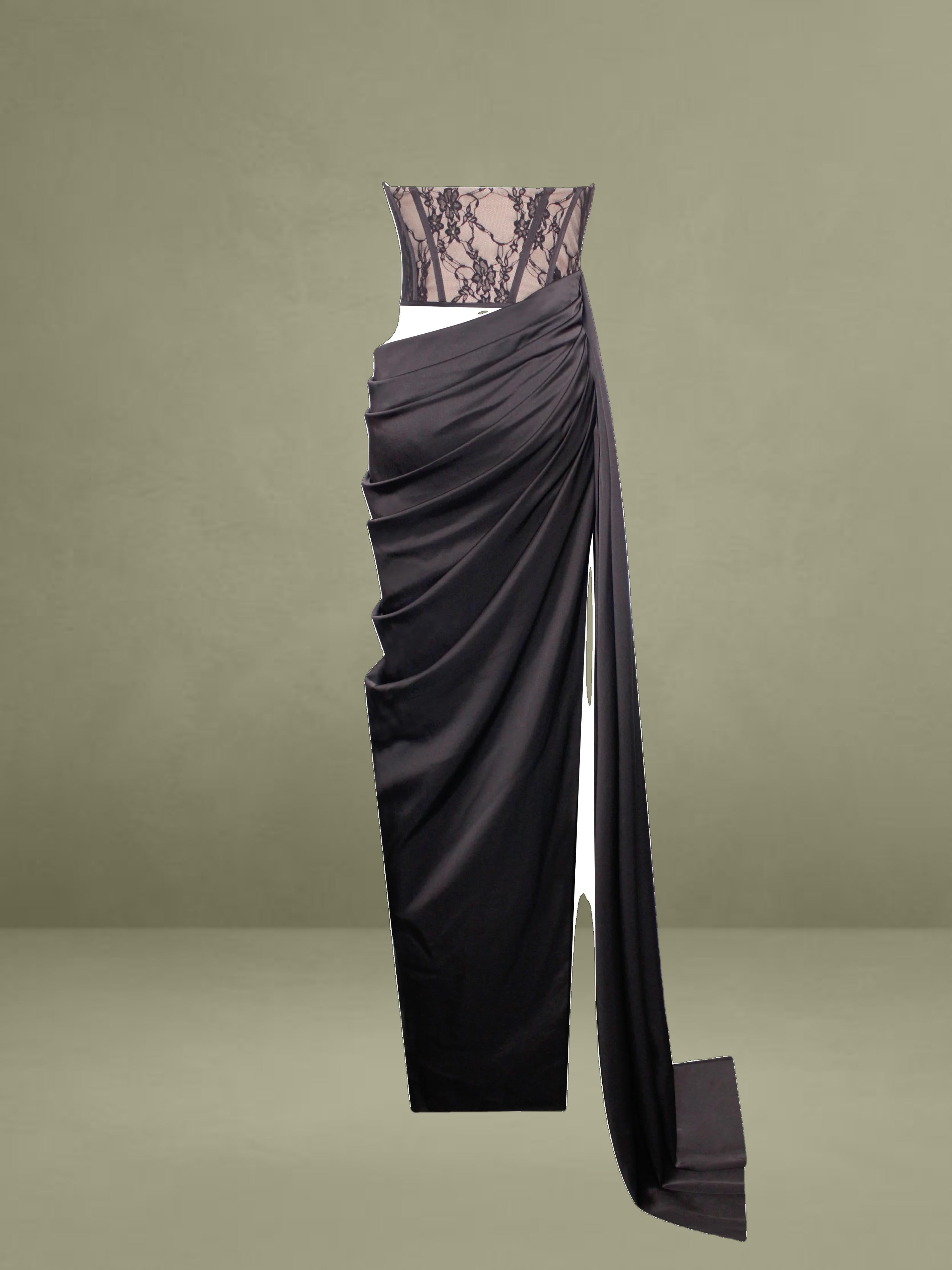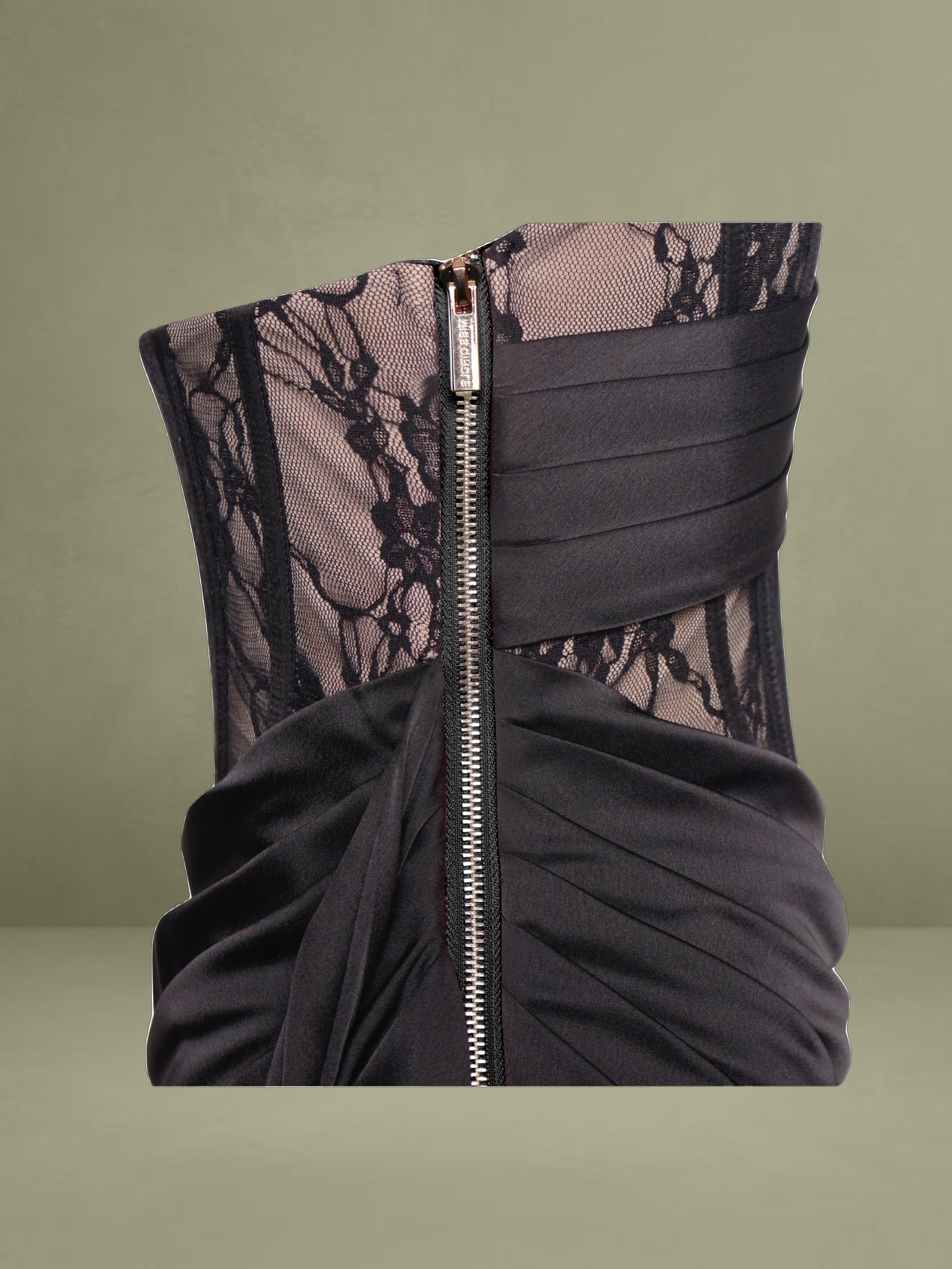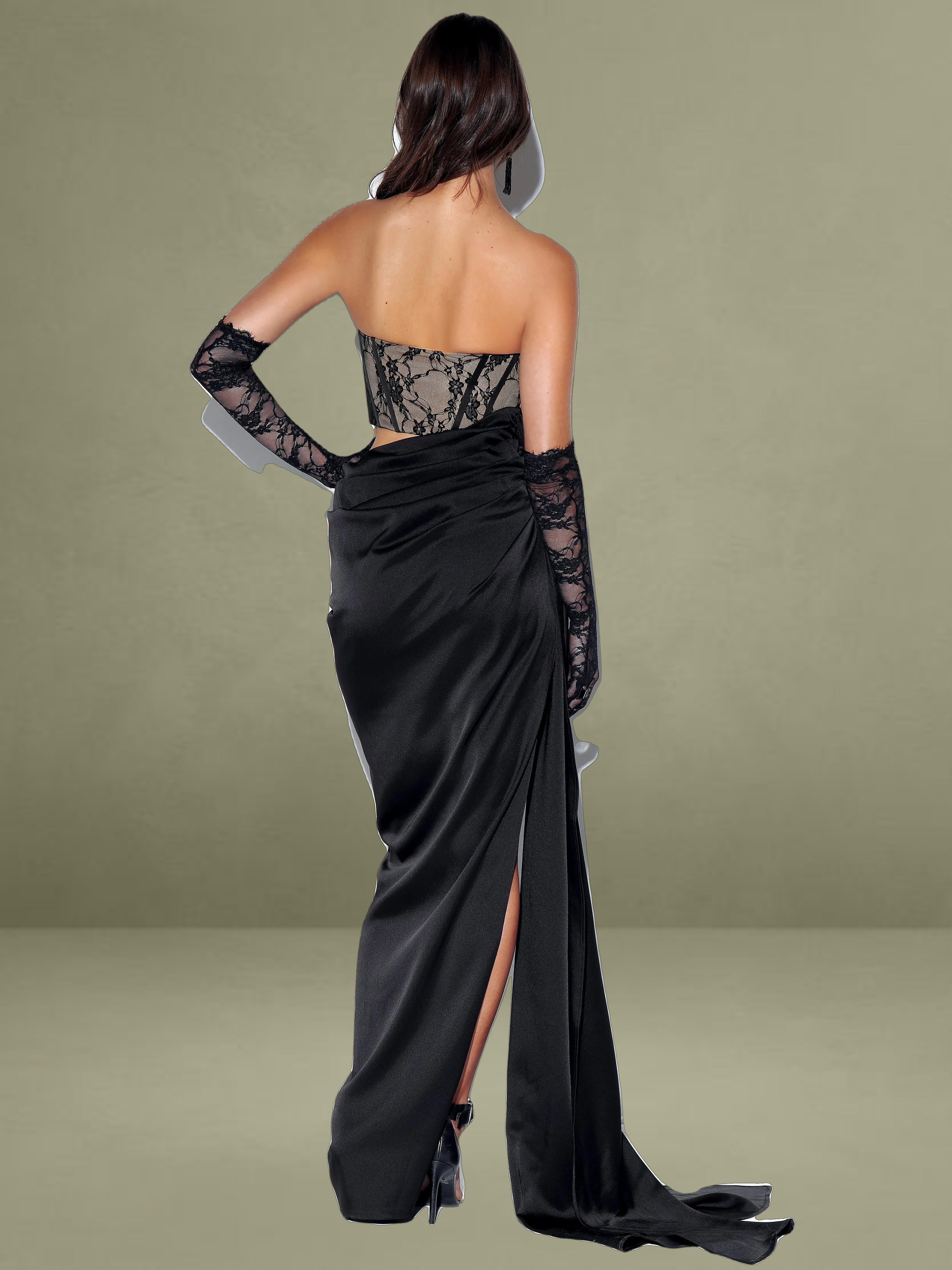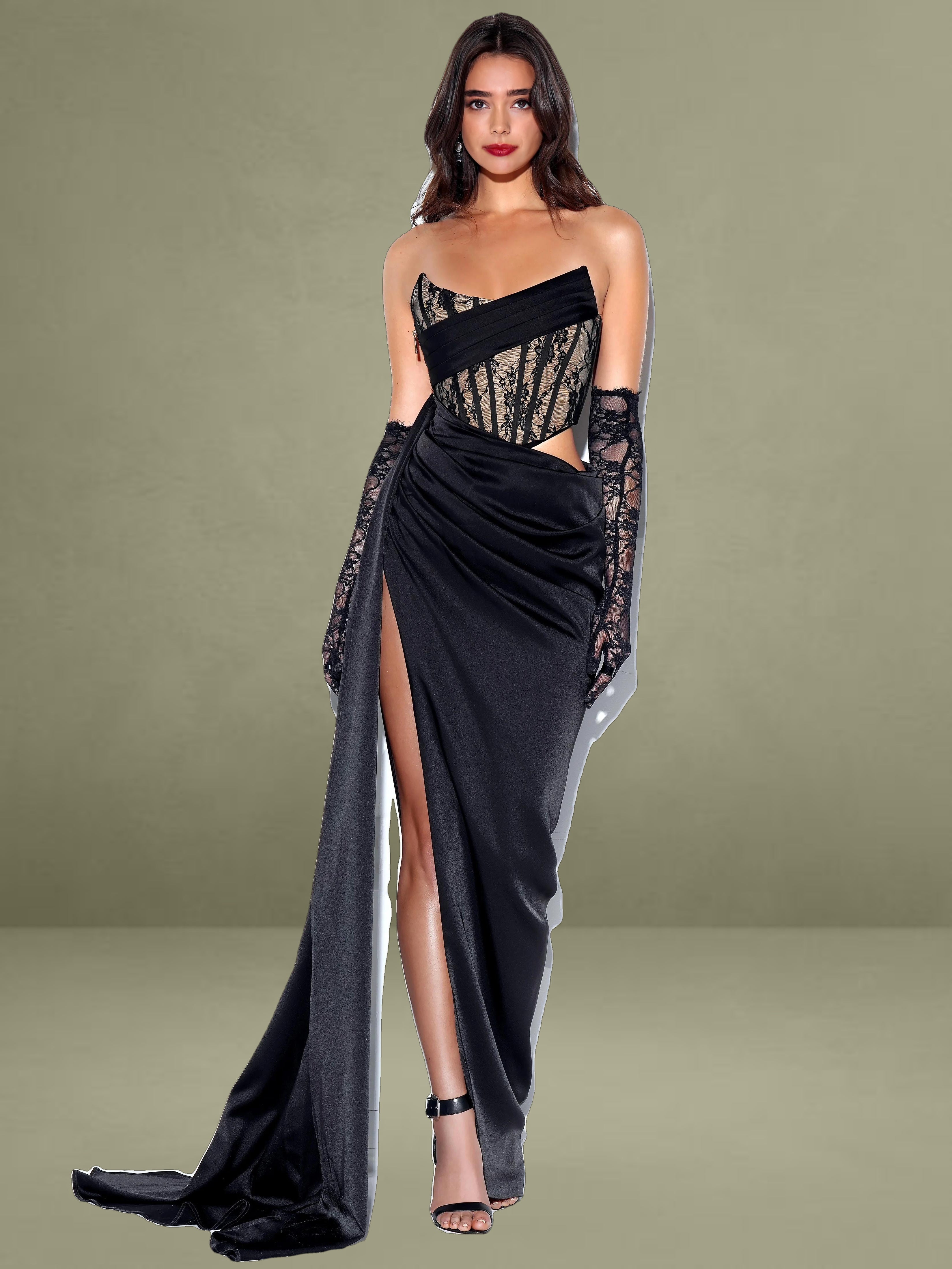 Step out in style in this gorgeous classic Miss Circle strapless corset gown. The stunning silhouette with draping and ruching details across the waist and hip will have all eyes on you. The light weave double duchess luxury satin flatters your figure and the exposed gold Miss Circle engraved zipper makes a luxurious statement. On the side, the peek-a-boo cutouts and high slit add sass and sex appeal, while the outside is luxe with a touch of lace peeking through the corset. Available exclusively in black, pearl white, red versions. Get ready to slay with this must-have dress! The matching Rae Black Lace Opera-length Gloves are sold separately!