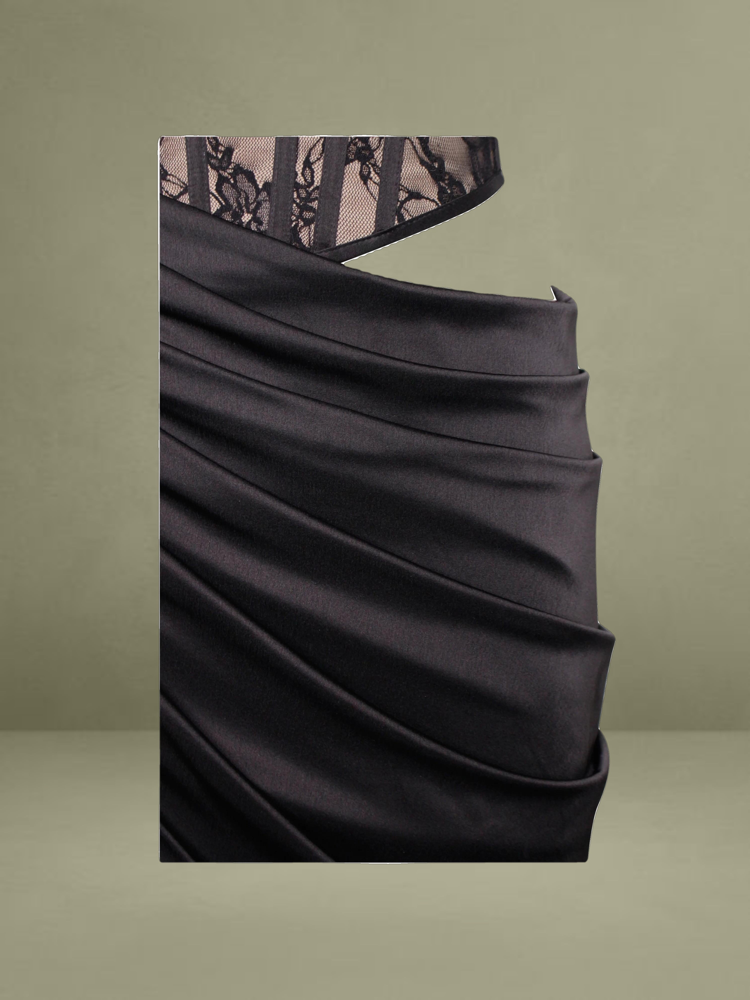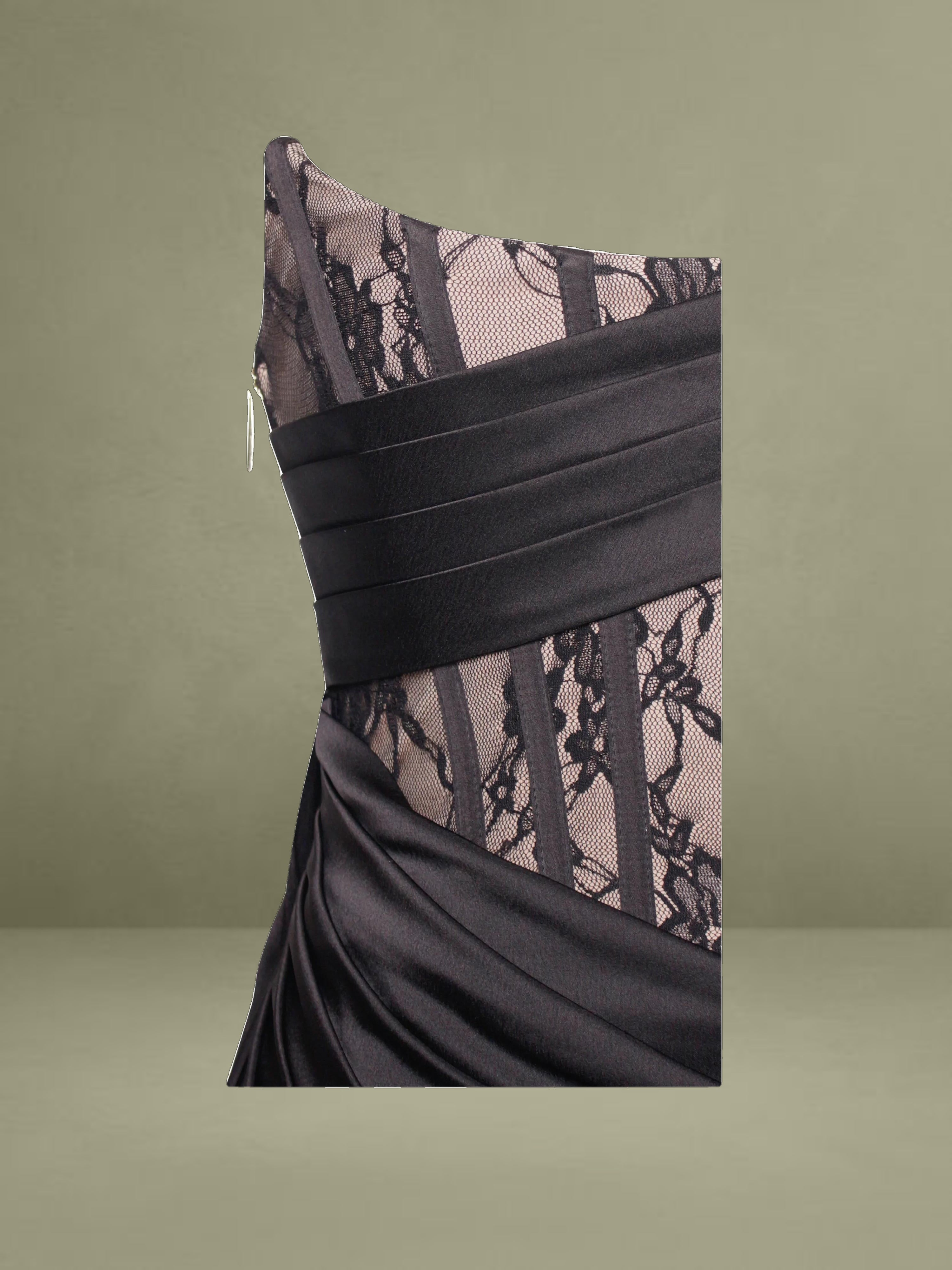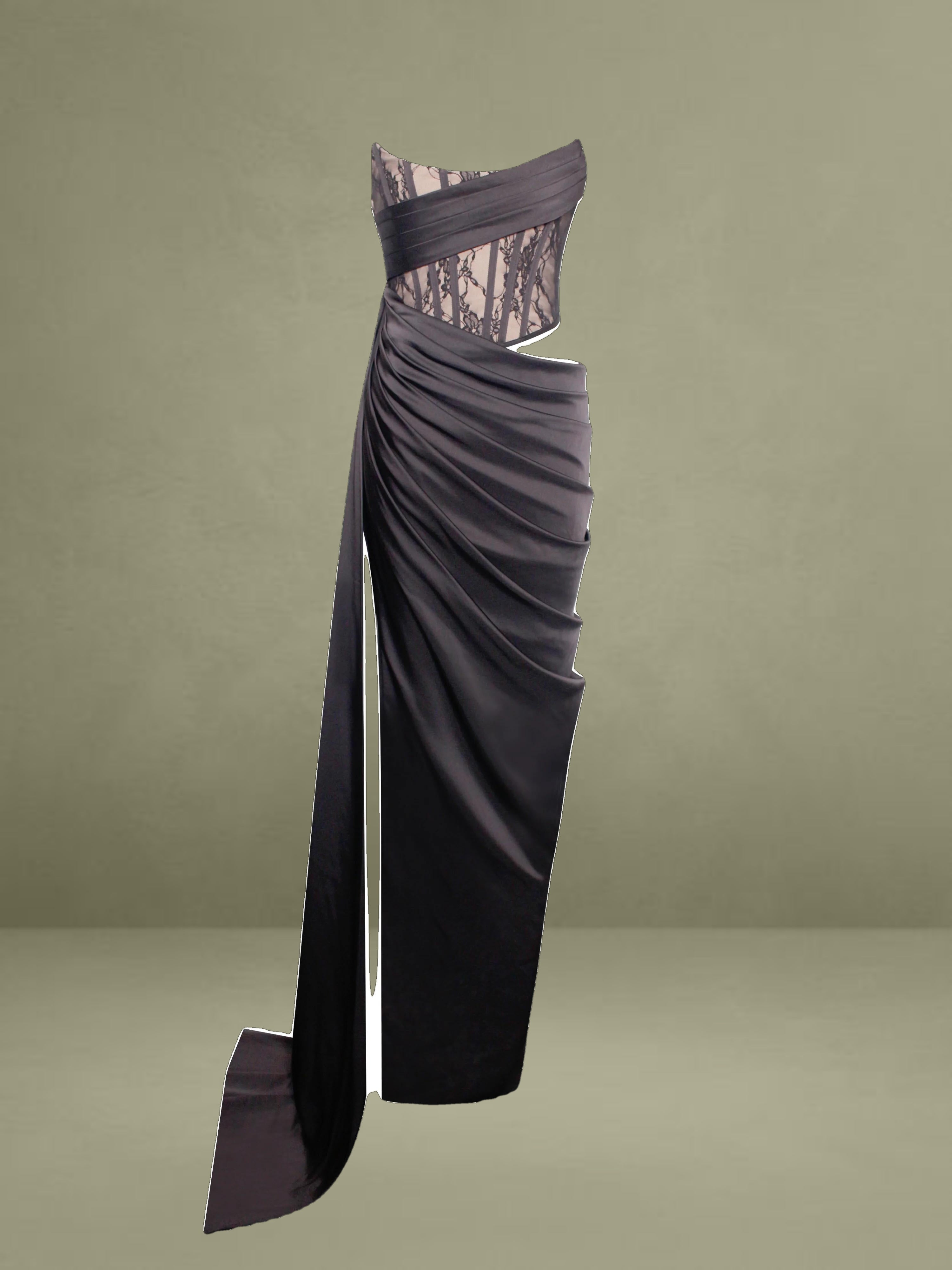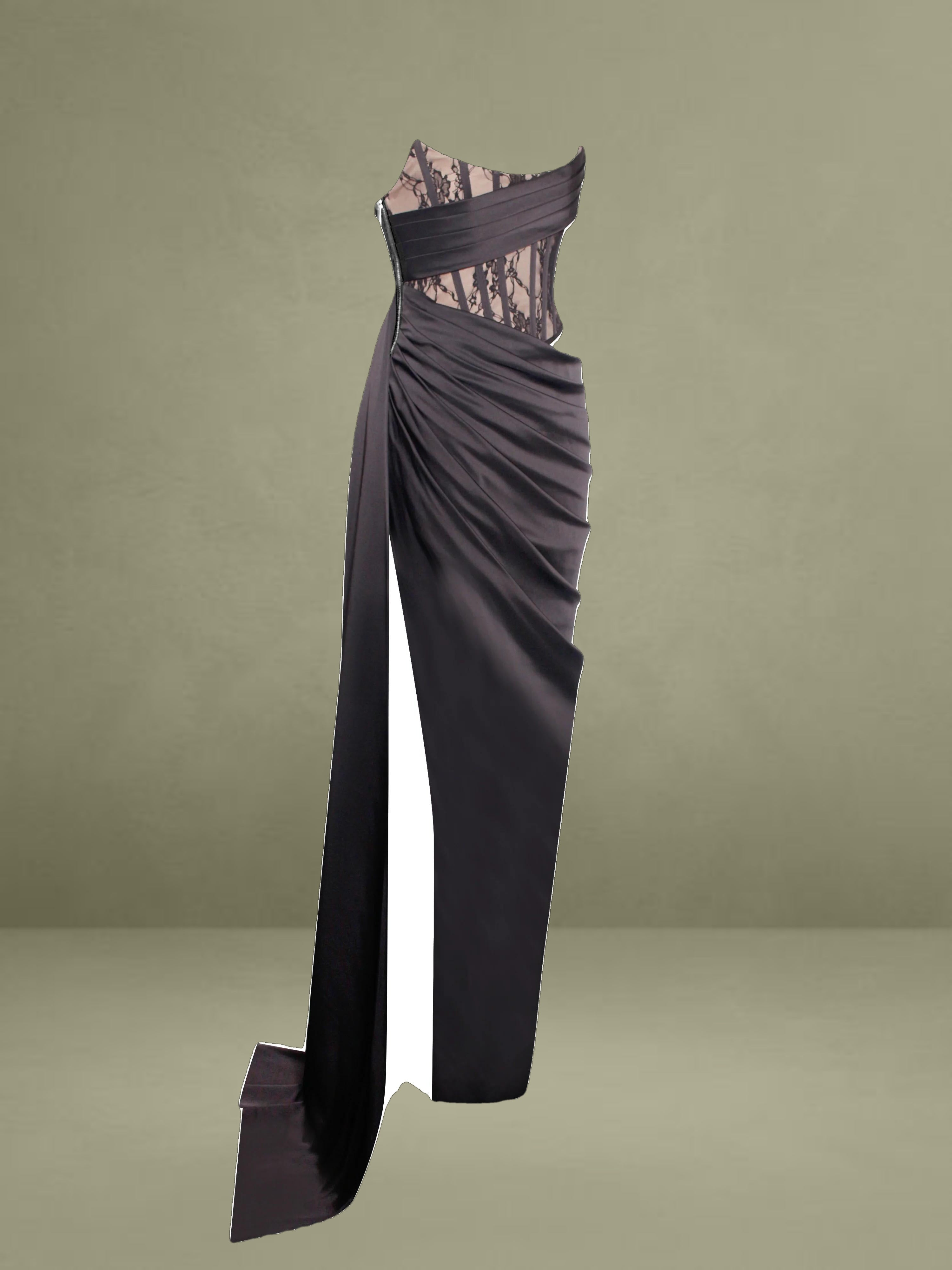 Step out in style in this gorgeous classic Miss Circle strapless corset gown. The stunning silhouette with draping and ruching details across the waist and hip will have all eyes on you. The light weave double duchess luxury satin flatters your figure and the exposed gold Miss Circle engraved zipper makes a luxurious statement. On the side, the peek-a-boo cutouts and high slit add sass and sex appeal, while the outside is luxe with a touch of lace peeking through the corset. Available exclusively in black, pearl white, red versions. Get ready to slay with this must-have dress! The matching Rae Black Lace Opera-length Gloves are sold separately!