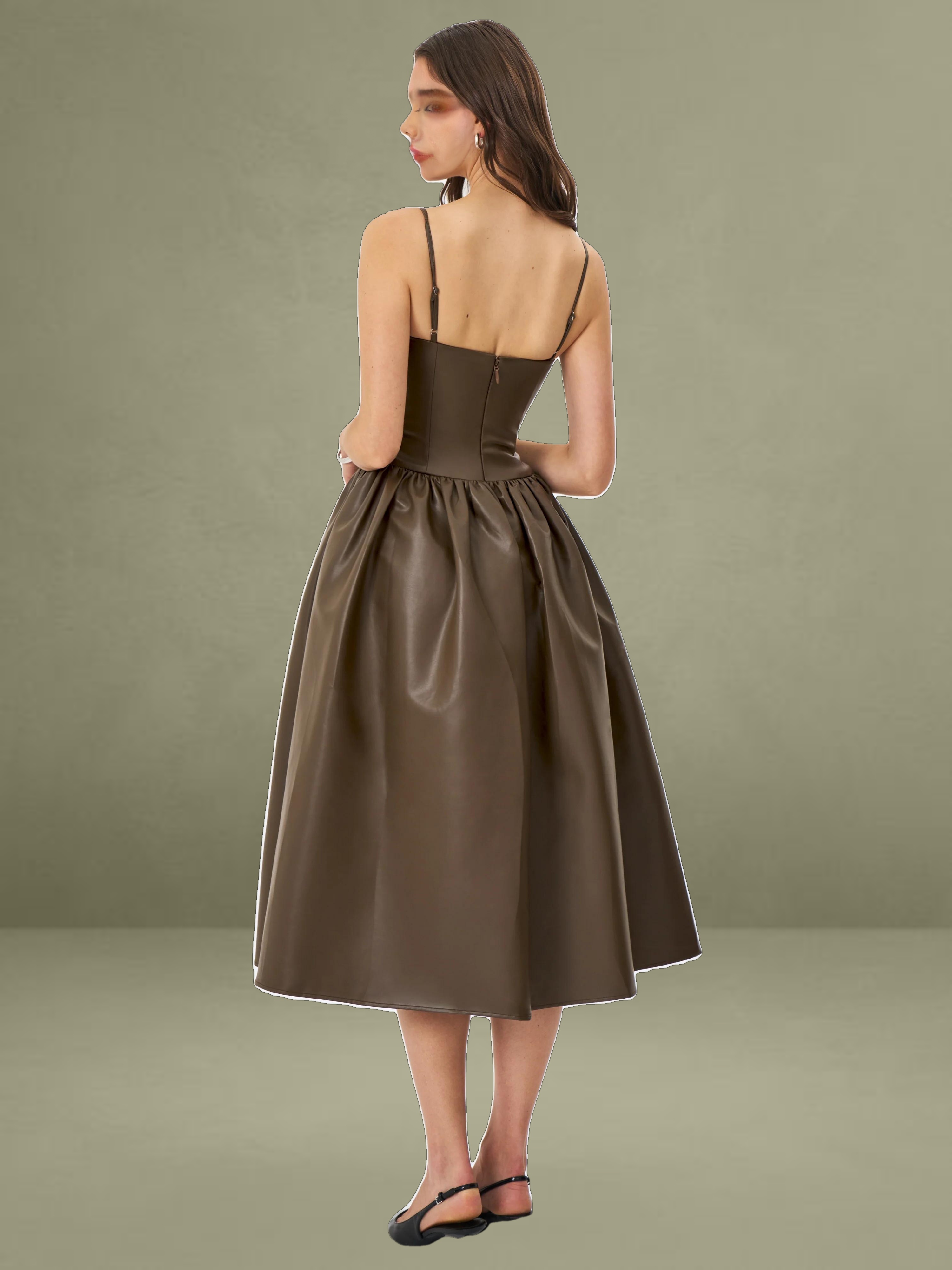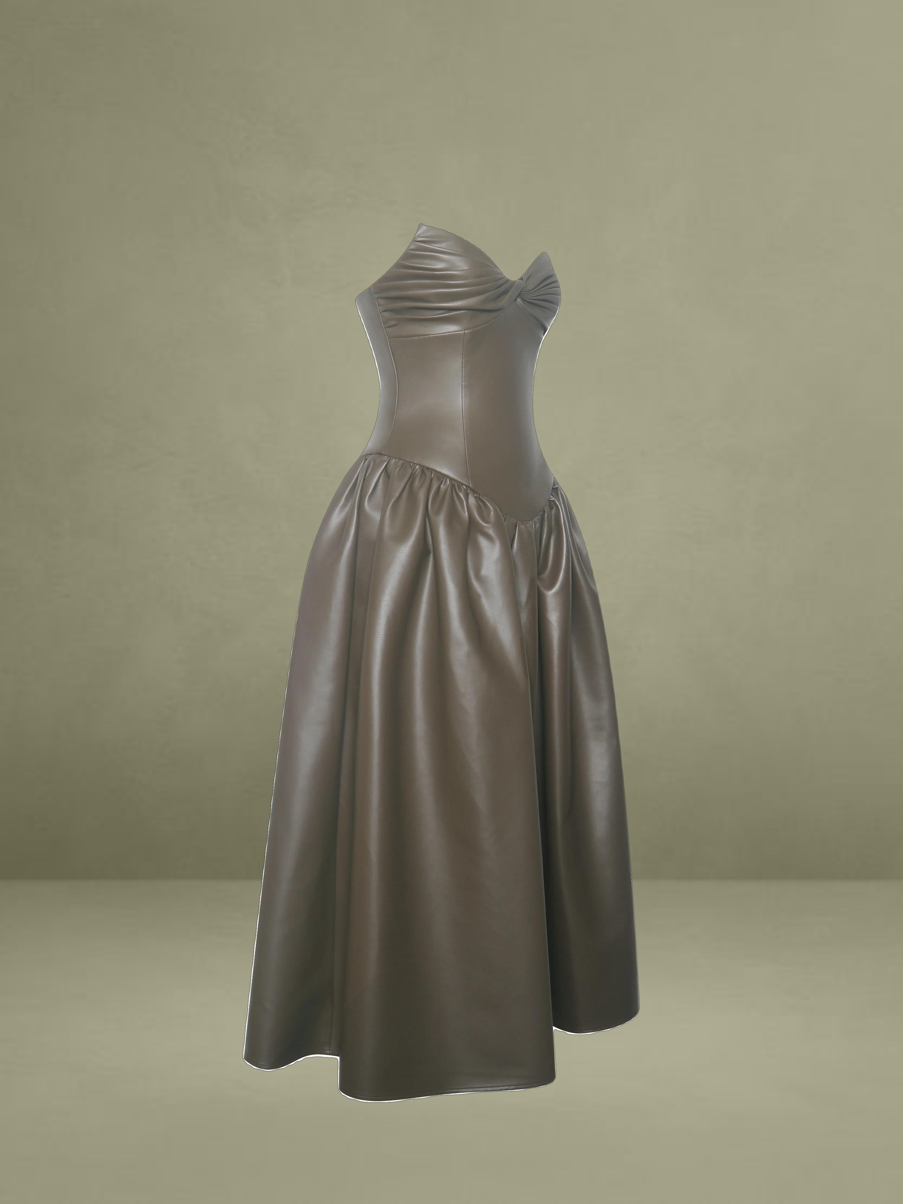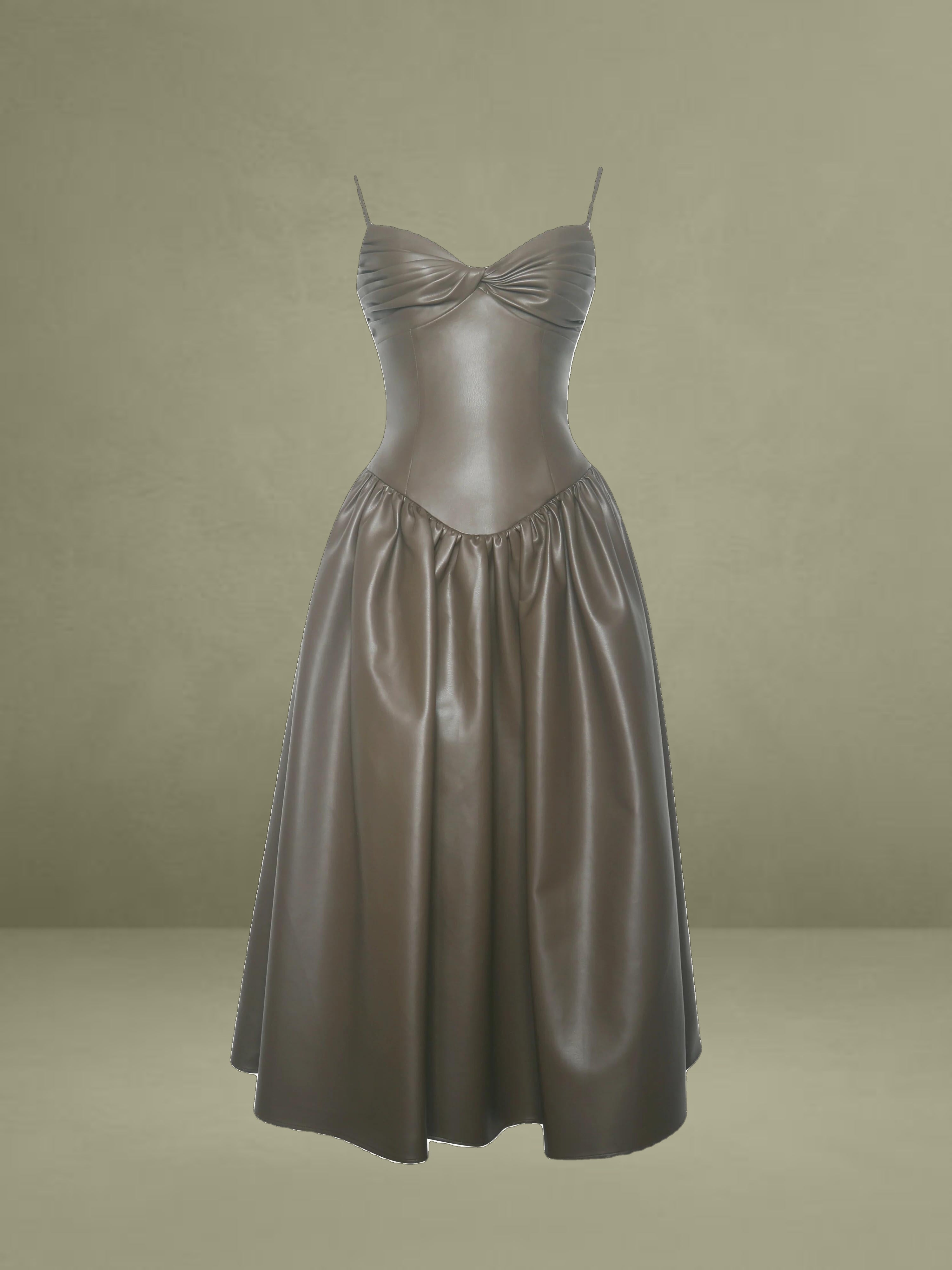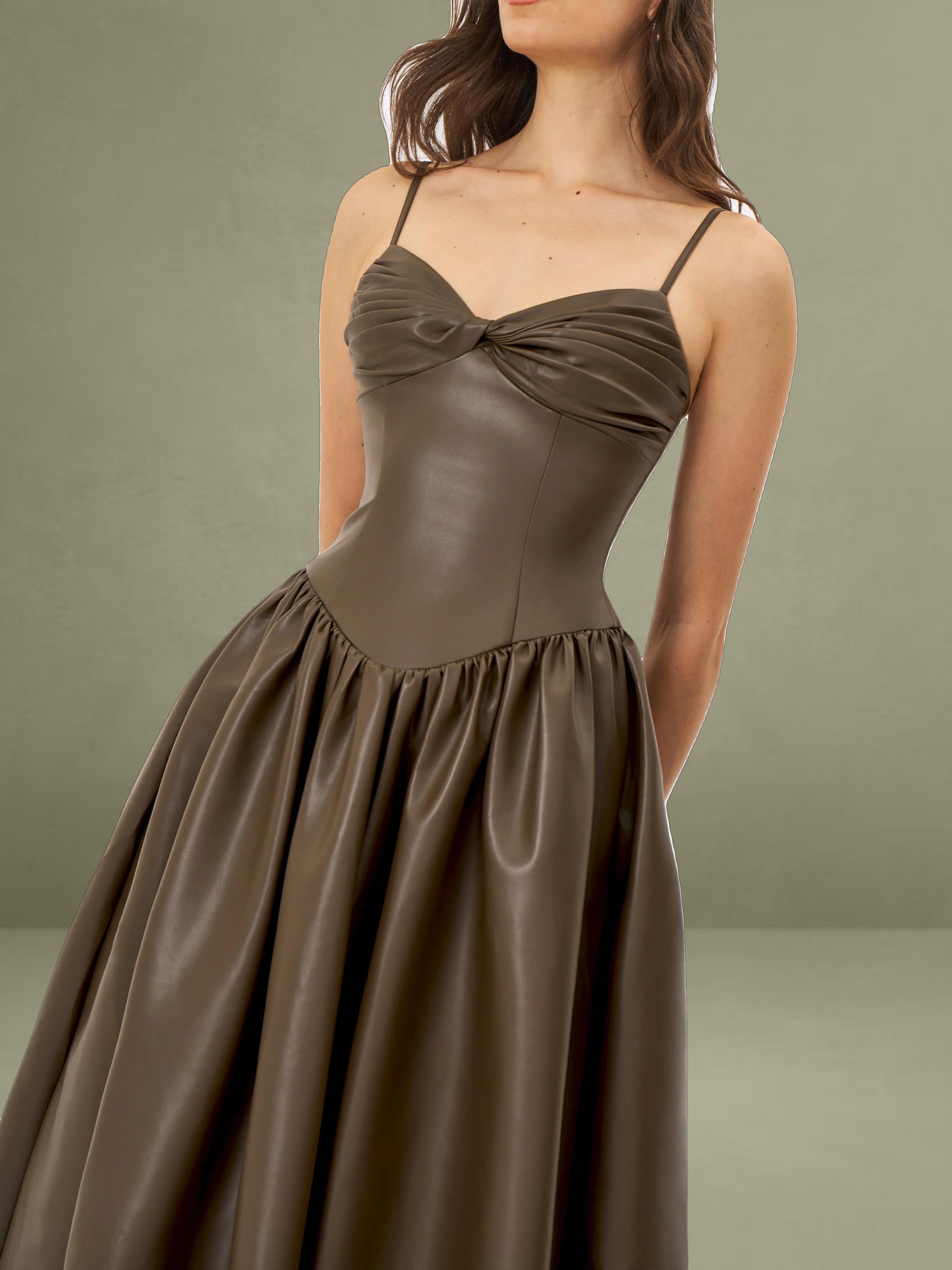 This dress showcases cocoa tones in smooth vegan leather. It features a ruched bust, padded cups, and thin spaghetti straps, offering a blend of allure and structure. Princess seams and a tightened waist lead to a drop-waist shape, flowing into a gathered A-line maxi skirt for a dramatic entrance. Lined with satin and finished with an invisible back zipper, it's perfect for rooftop dates, gallery events, or any evening where you want to make a statement sustainably.