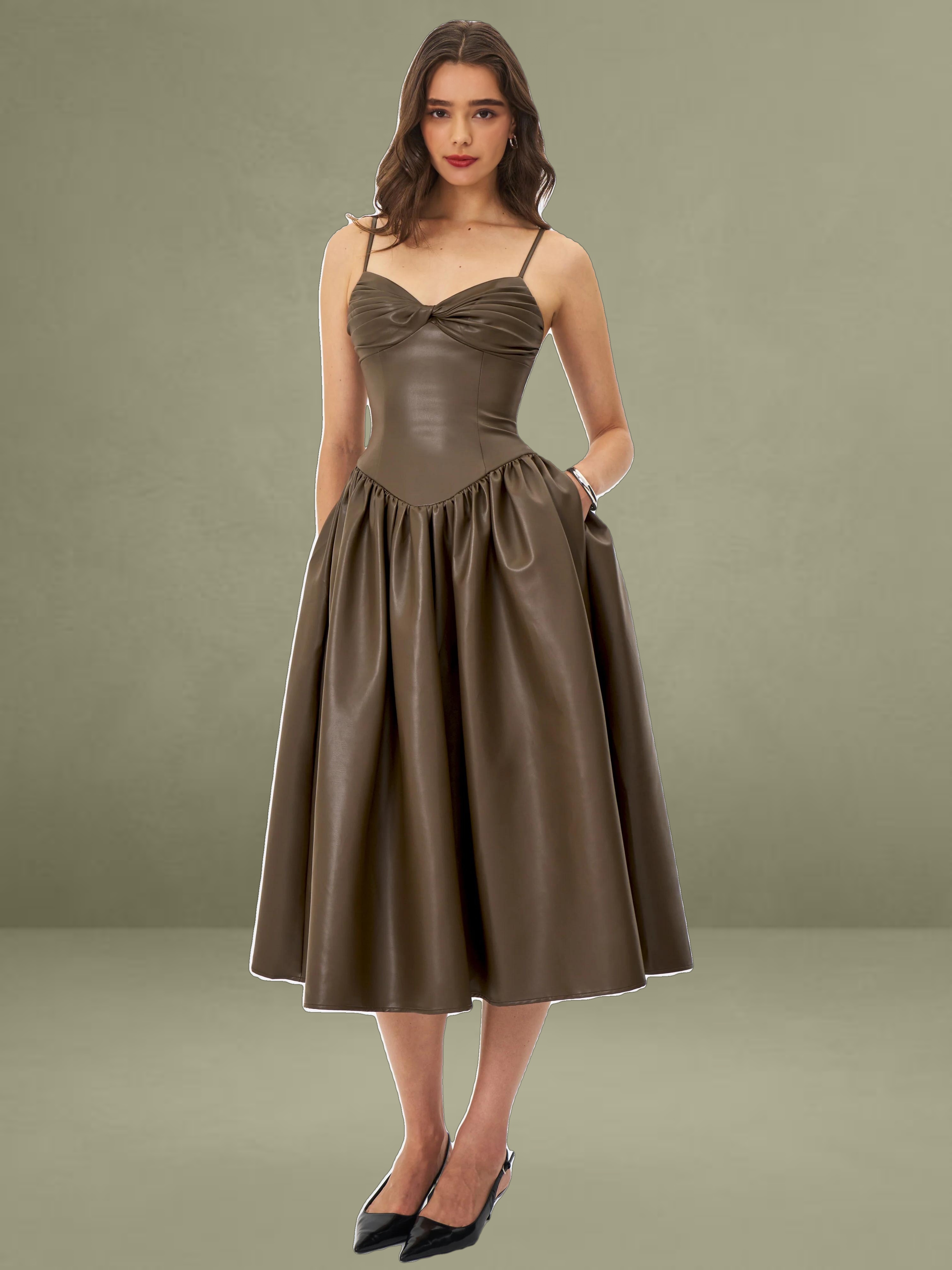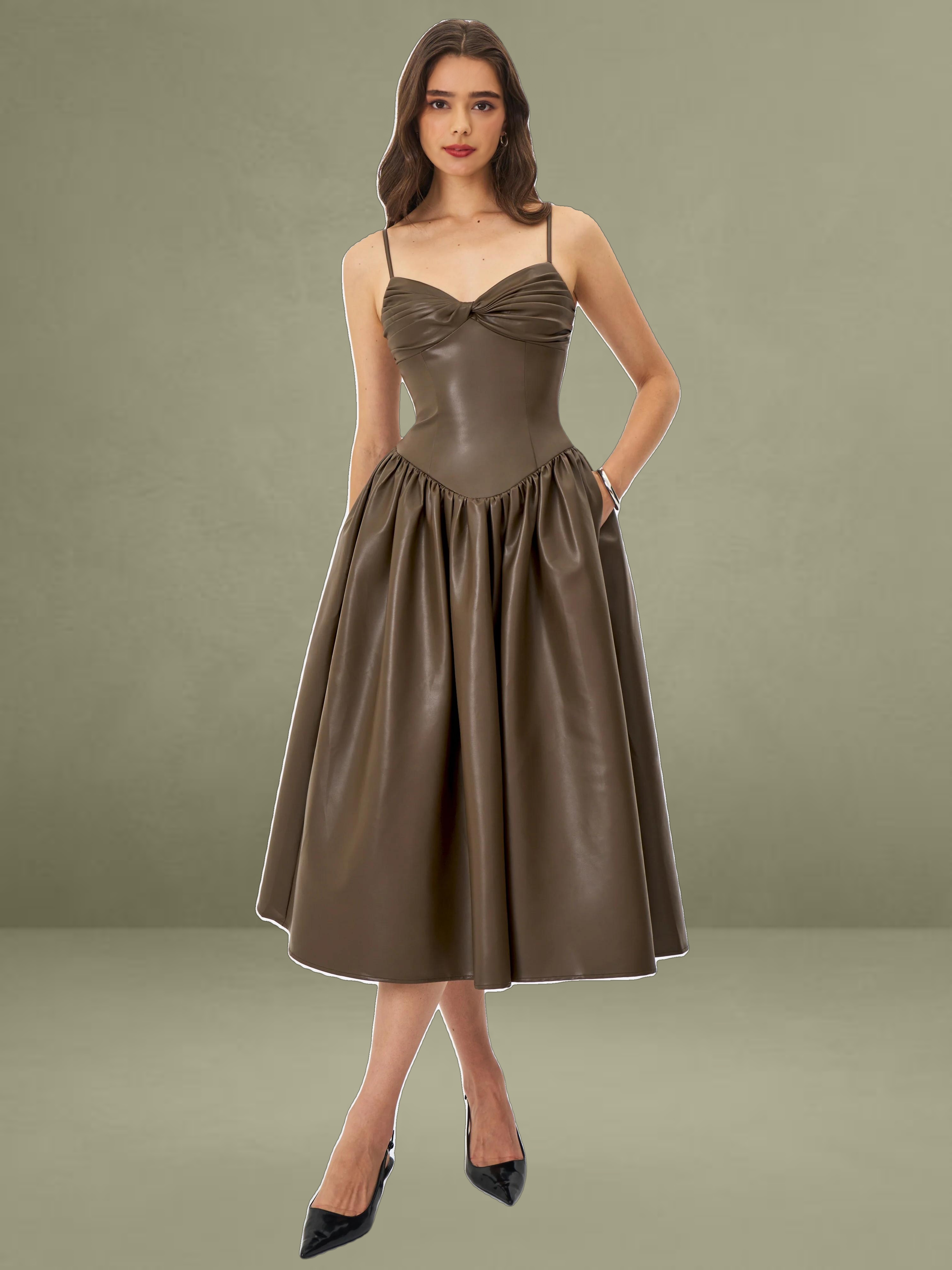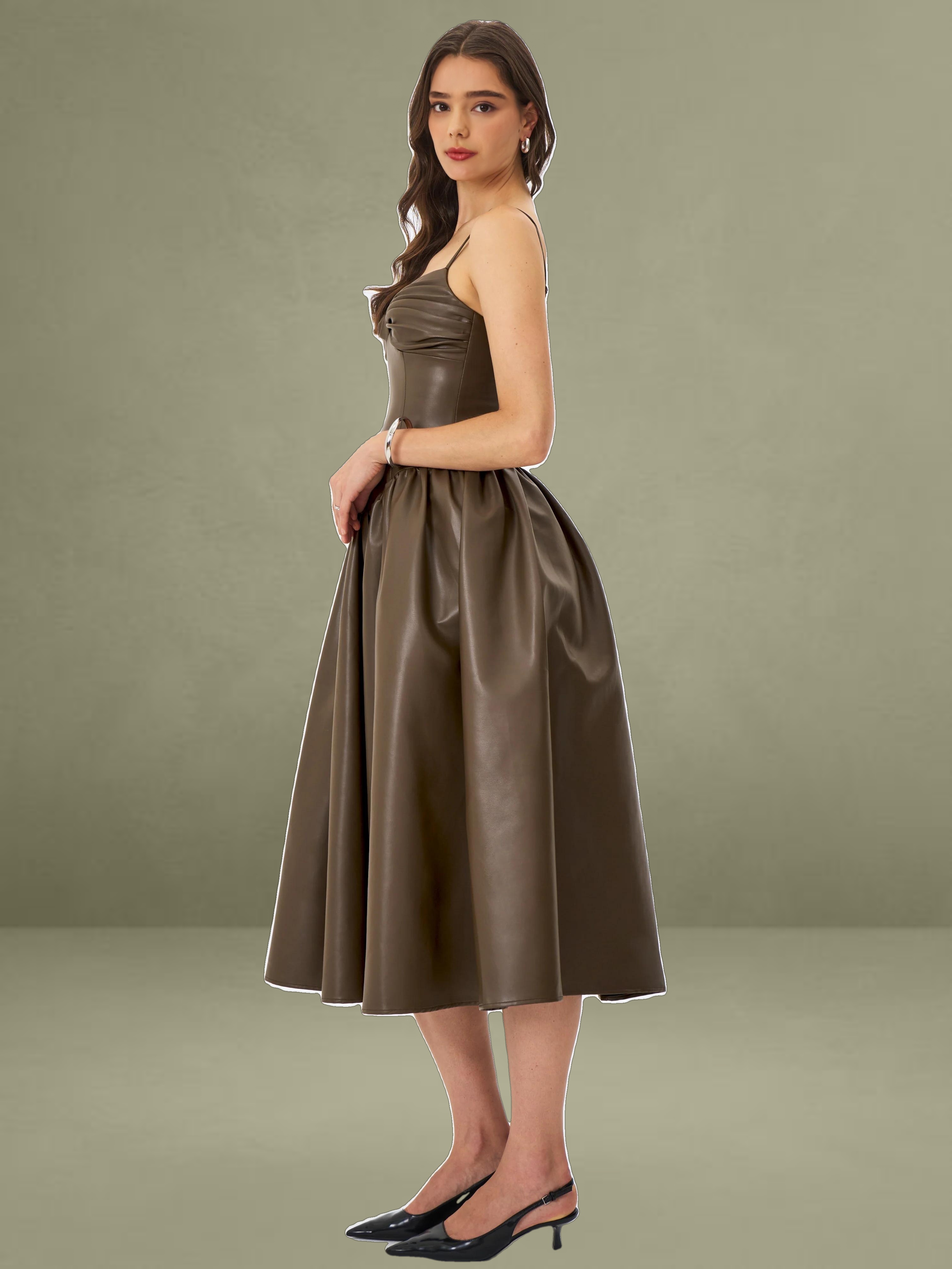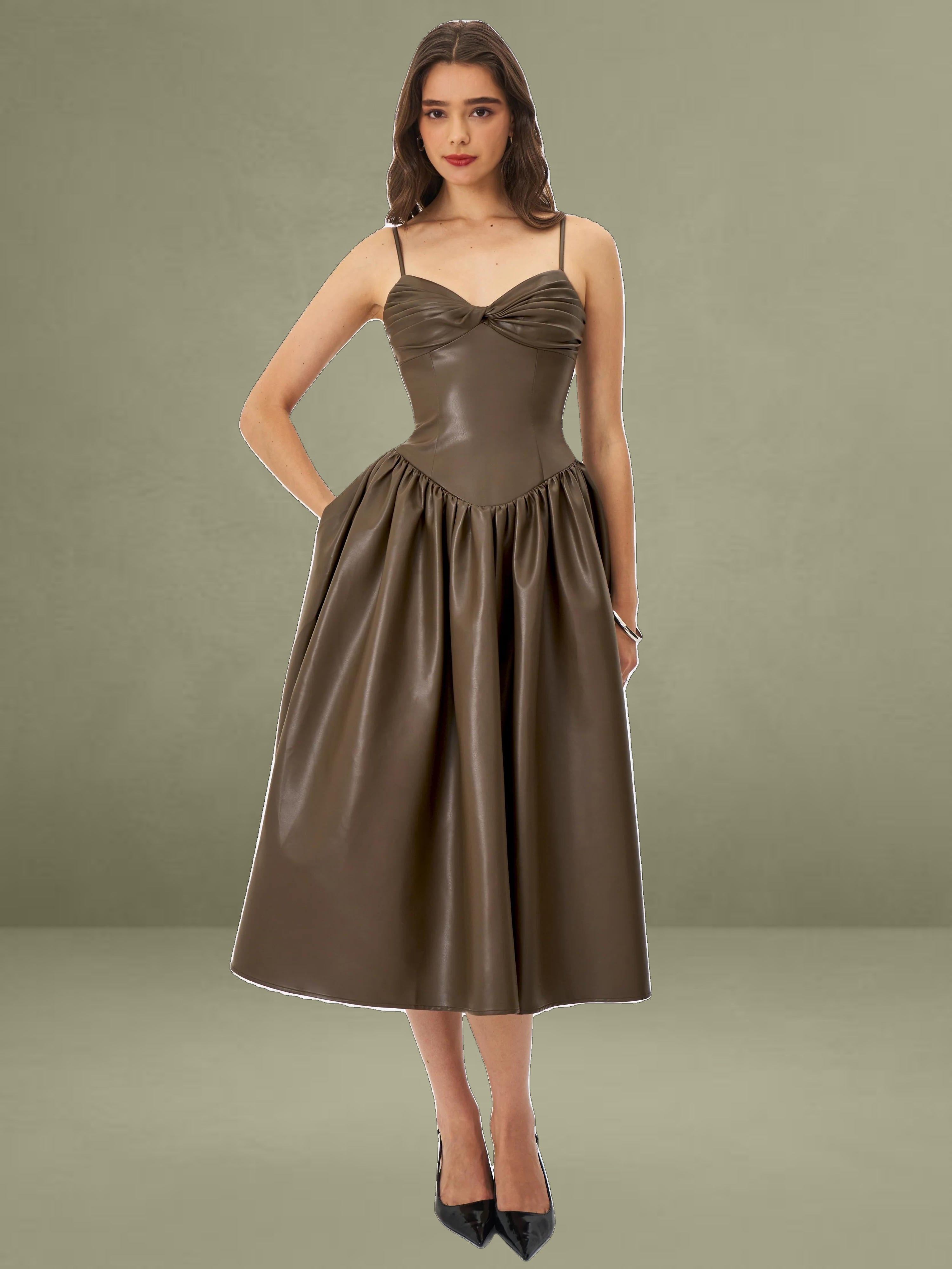This dress showcases cocoa tones in smooth vegan leather. It features a ruched bust, padded cups, and thin spaghetti straps, offering a blend of allure and structure. Princess seams and a tightened waist lead to a drop-waist shape, flowing into a gathered A-line maxi skirt for a dramatic entrance. Lined with satin and finished with an invisible back zipper, it's perfect for rooftop dates, gallery events, or any evening where you want to make a statement sustainably.