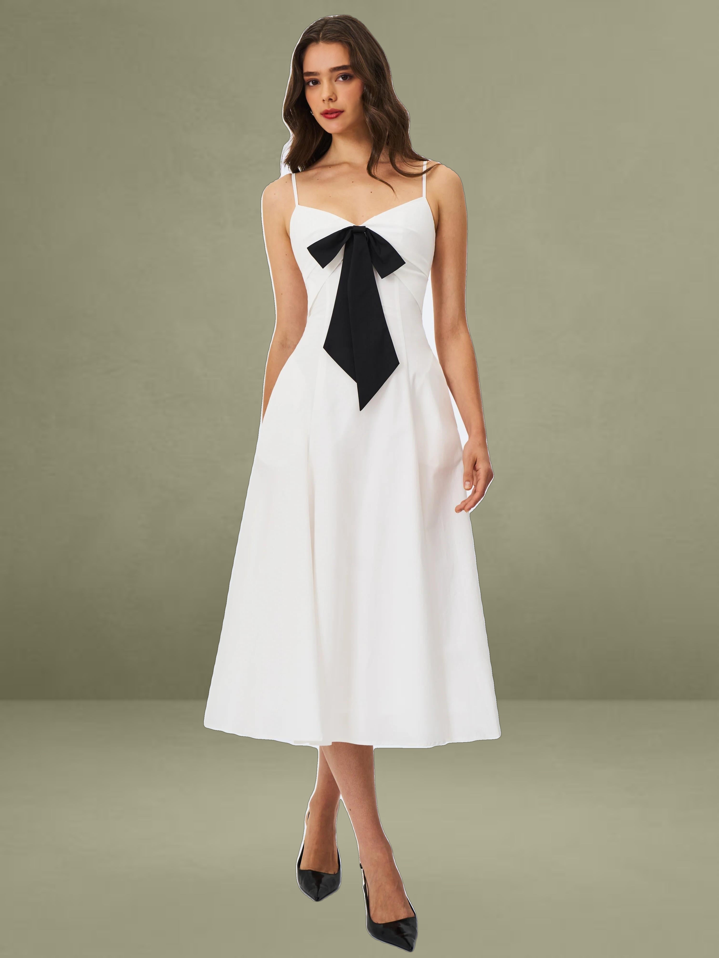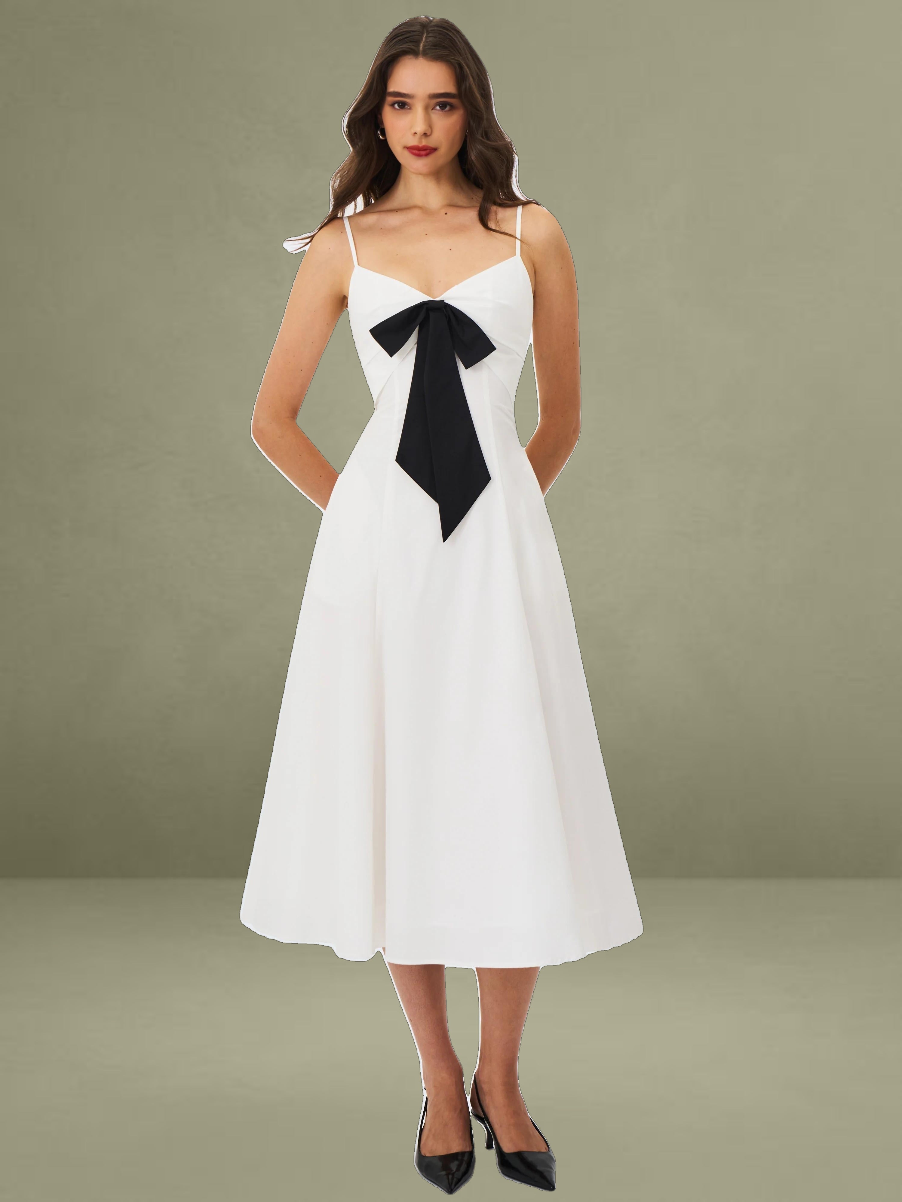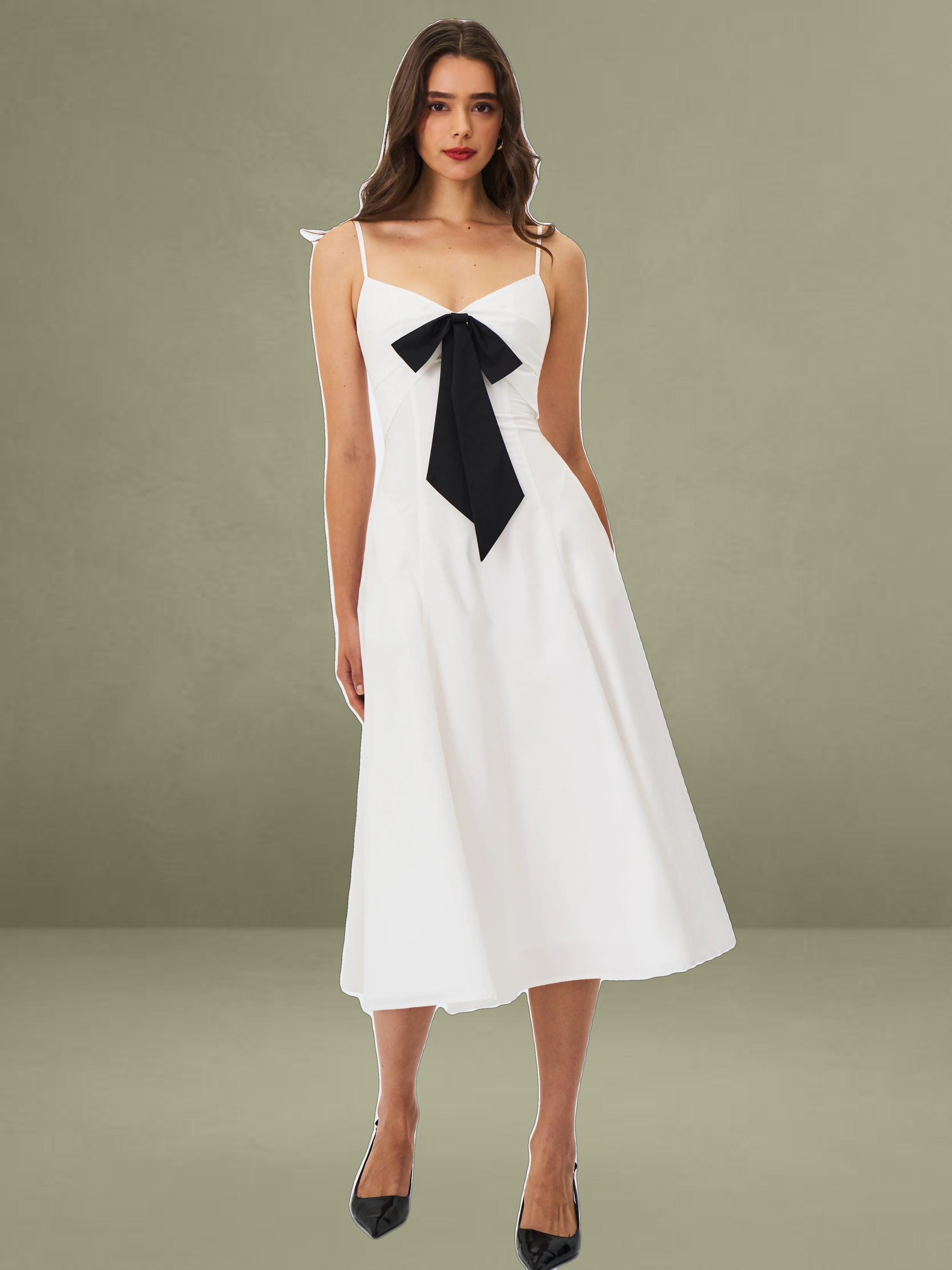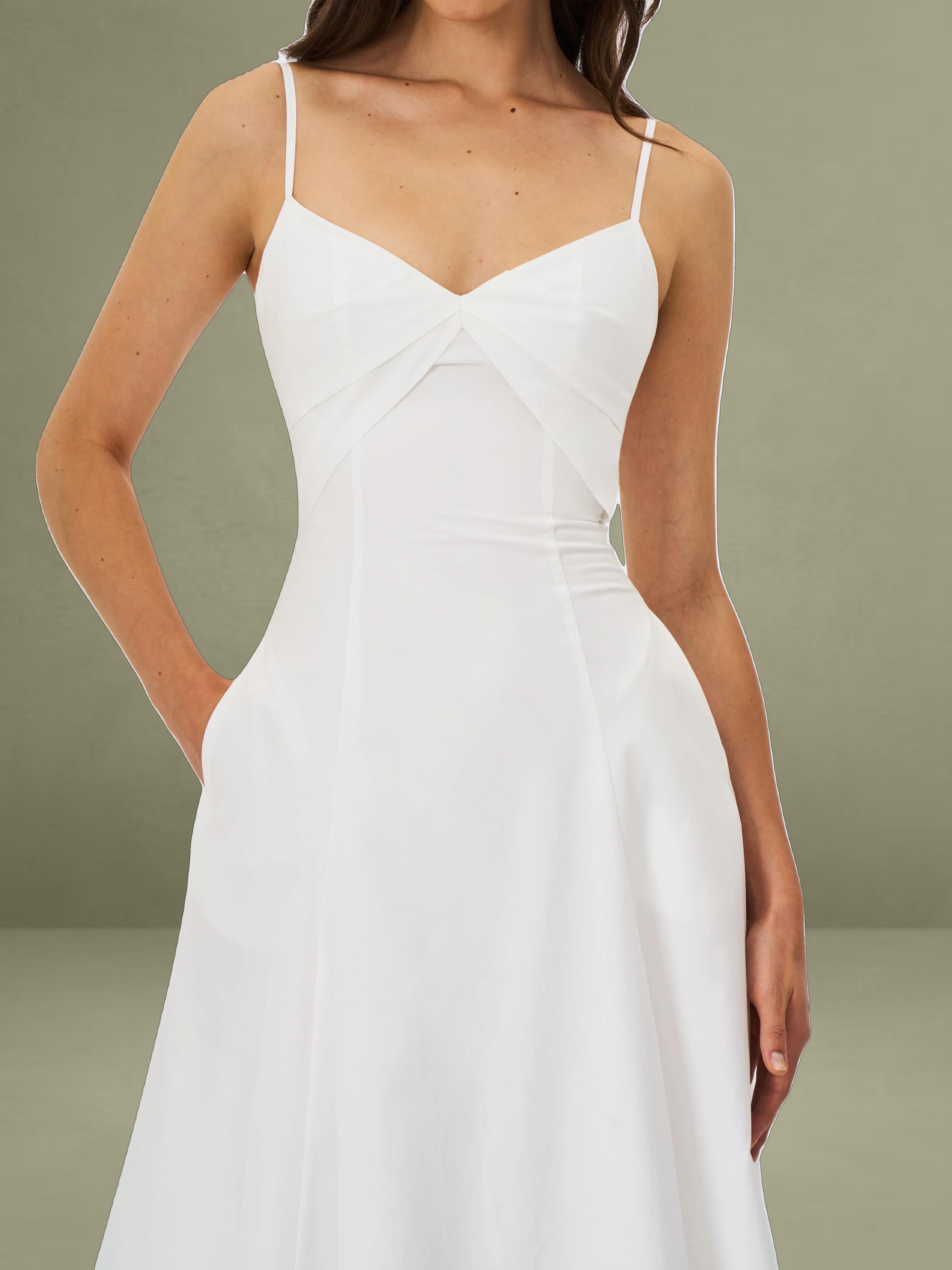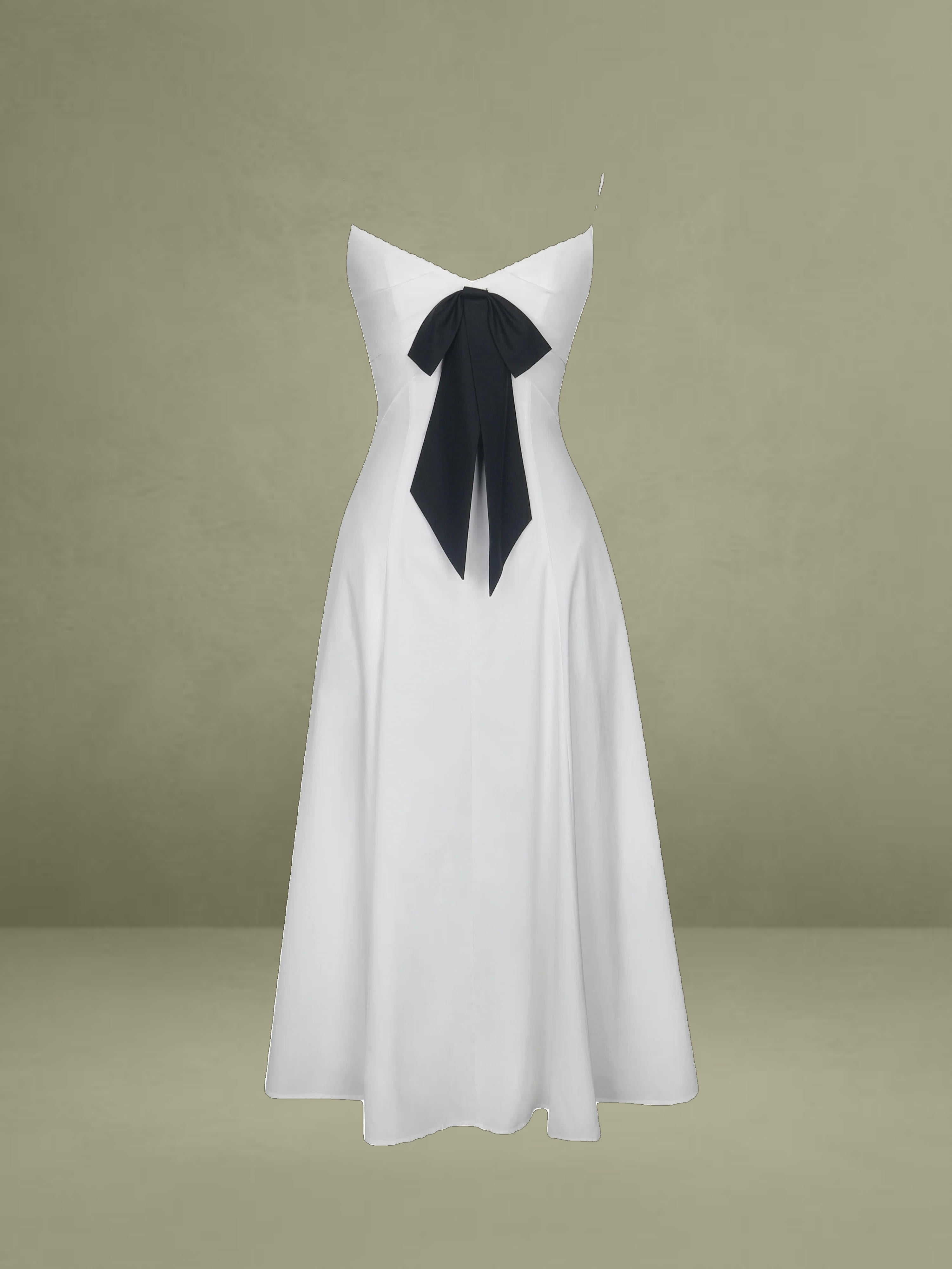 Sweet with structure, the Corinne Dress is cut in crisp white cotton poplin and features a pleated bustline that strikes just the right balance between dainty and polished. Princess seams sculpt a flattering silhouette, while a removable black satin bow at the neckline lets you toggle between subtle and standout. Adjustable straps keep things comfy, and the full-length skirt flows with ease—complete with hidden side pockets. Fully lined in cotton and finished with an invisible zipper in the back, it’s your go-to for garden parties, museum dates, or any outing that deserves a touch of romantic effortlessness.