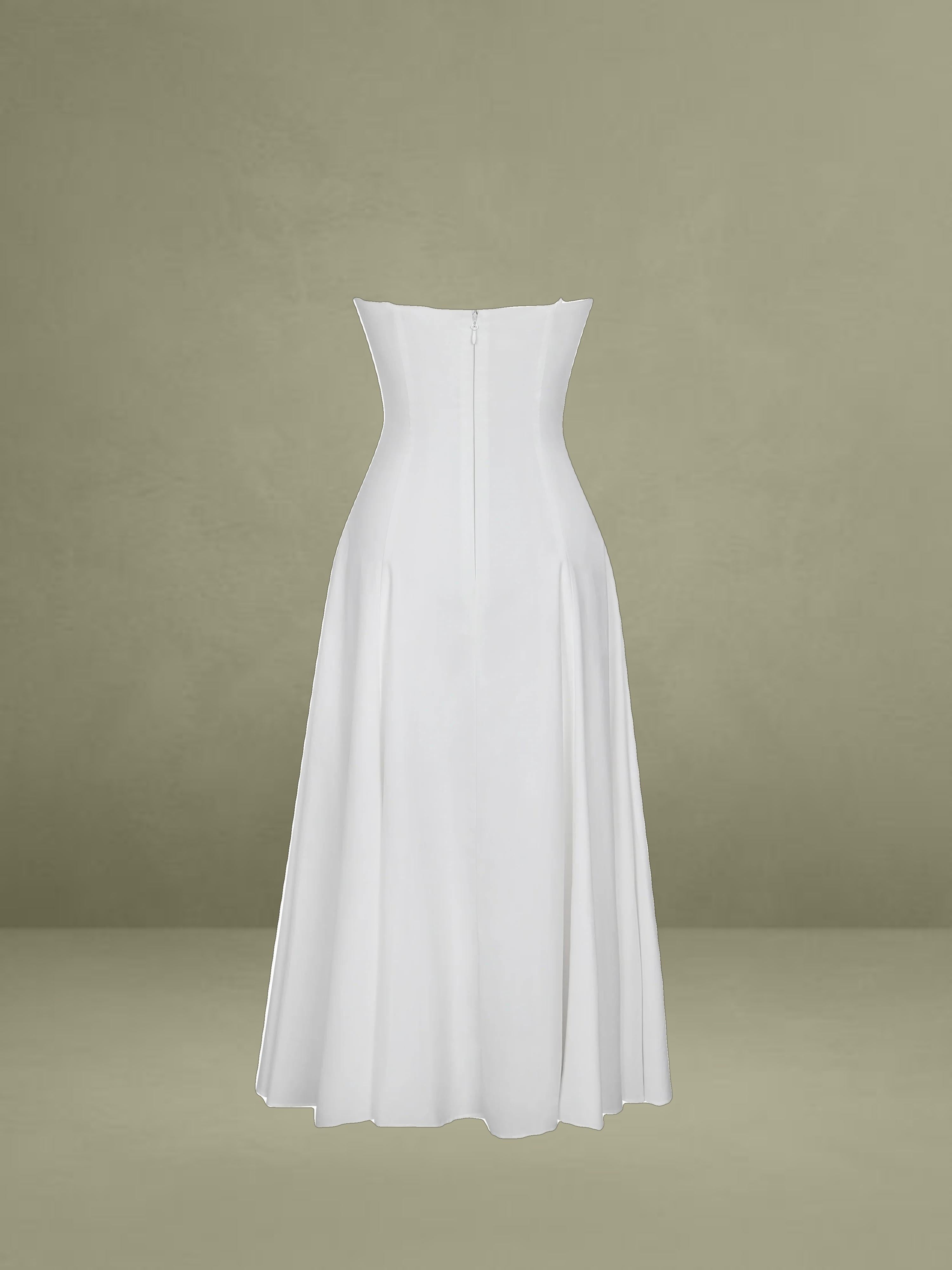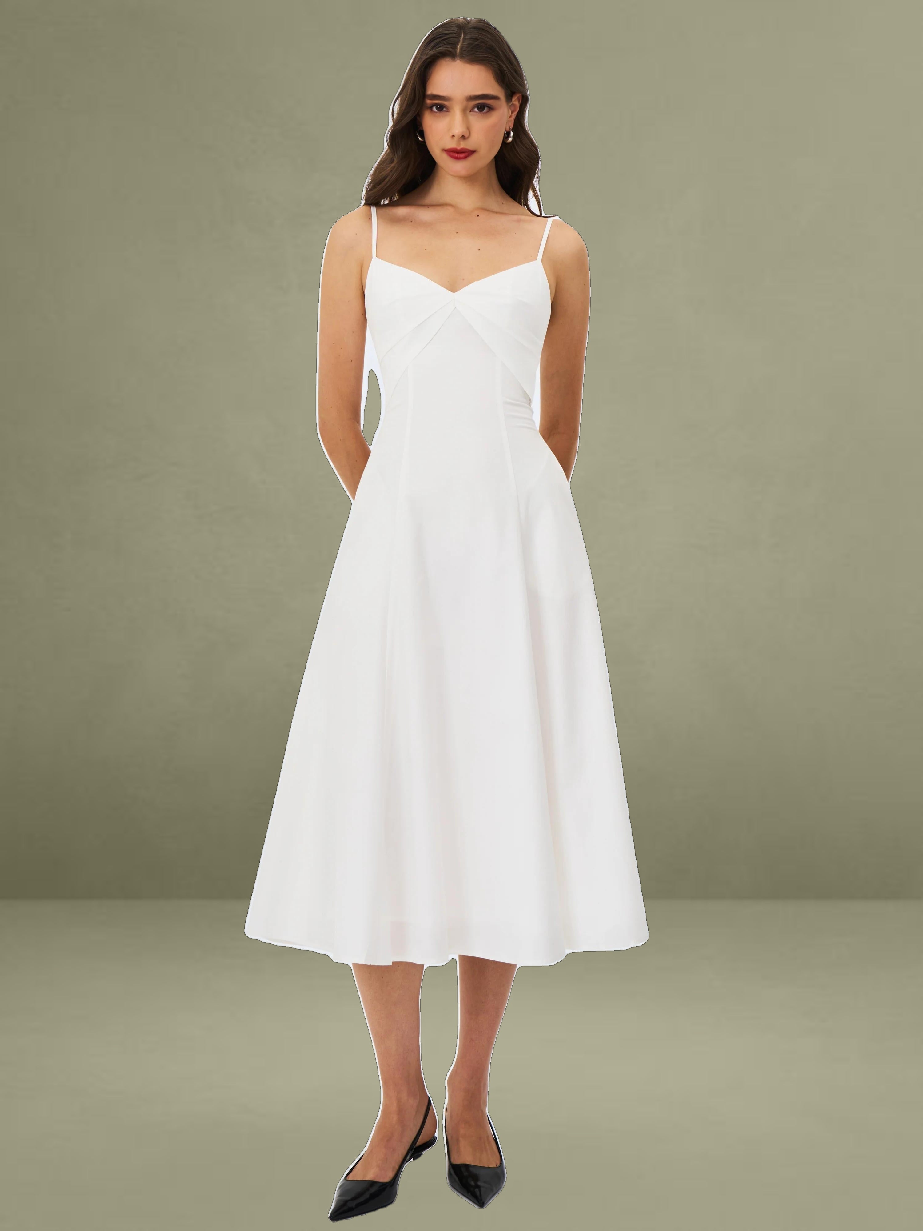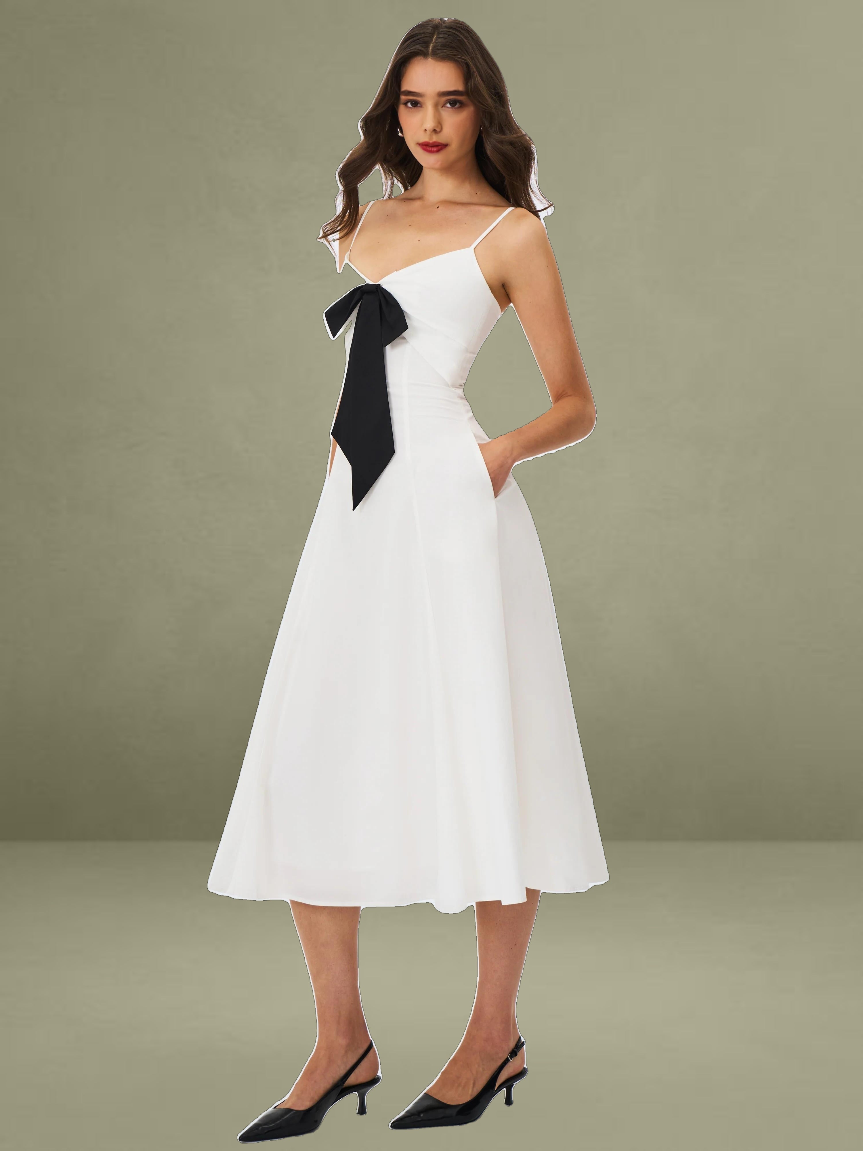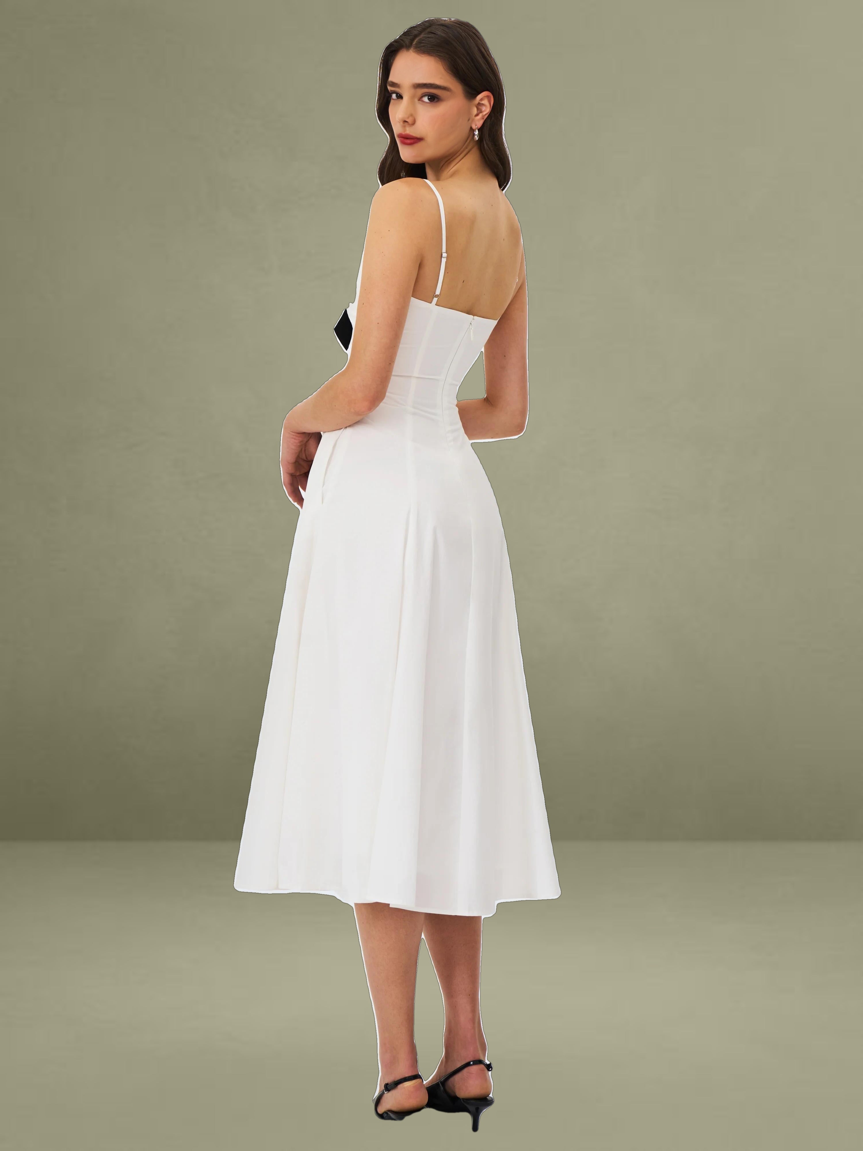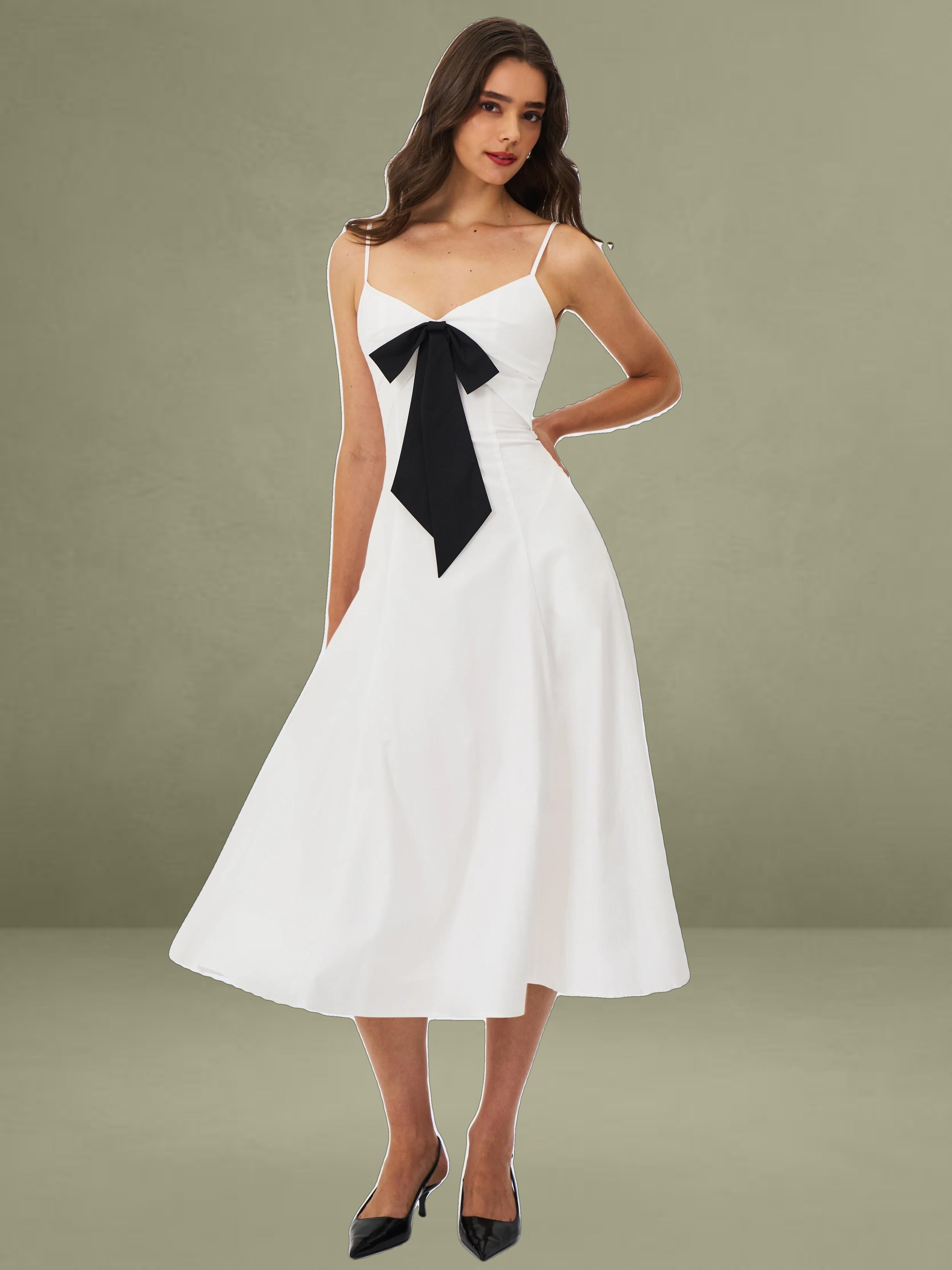 Sweet with structure, the Corinne Dress is cut in crisp white cotton poplin and features a pleated bustline that strikes just the right balance between dainty and polished. Princess seams sculpt a flattering silhouette, while a removable black satin bow at the neckline lets you toggle between subtle and standout. Adjustable straps keep things comfy, and the full-length skirt flows with ease—complete with hidden side pockets. Fully lined in cotton and finished with an invisible zipper in the back, it’s your go-to for garden parties, museum dates, or any outing that deserves a touch of romantic effortlessness.