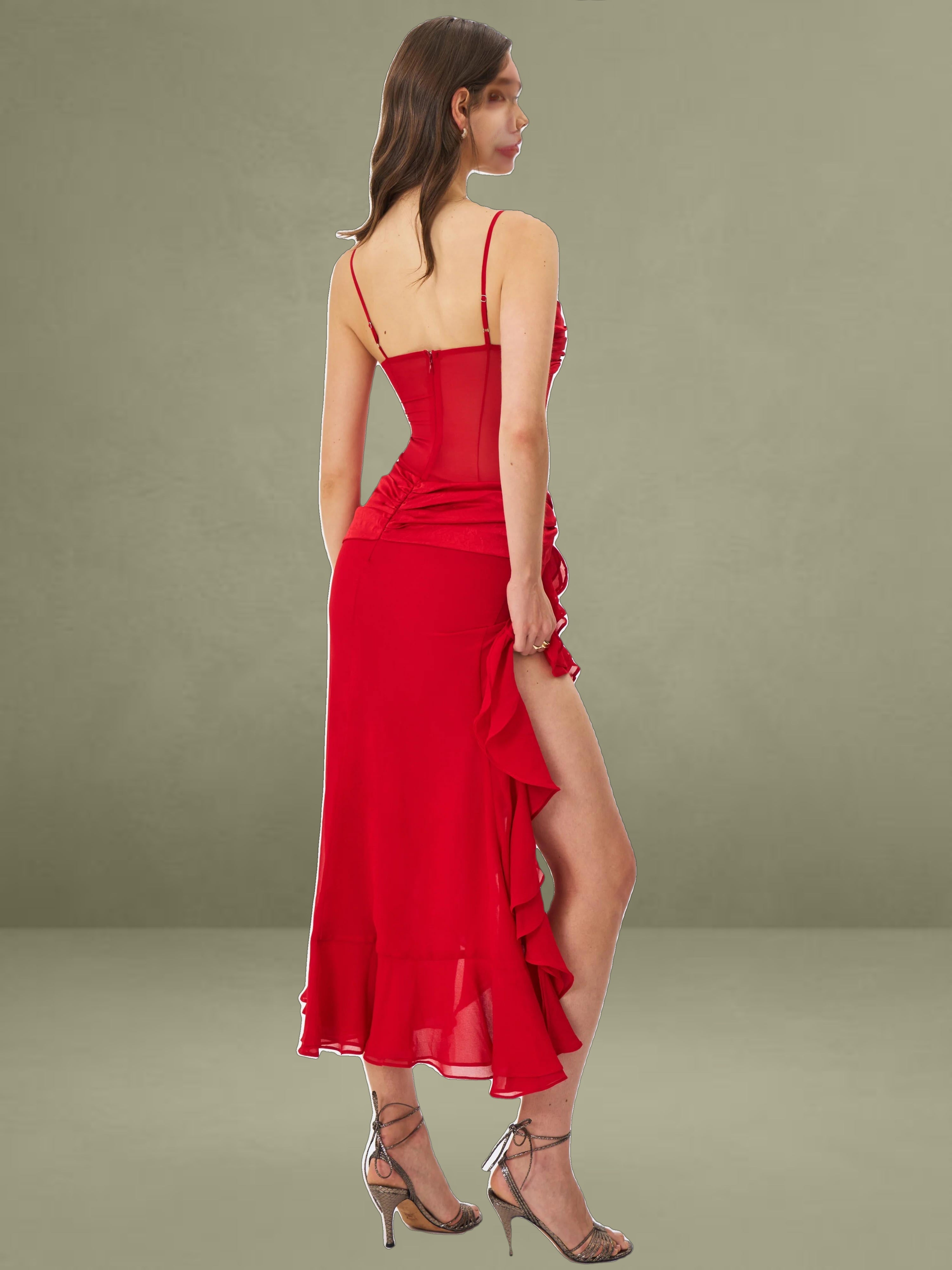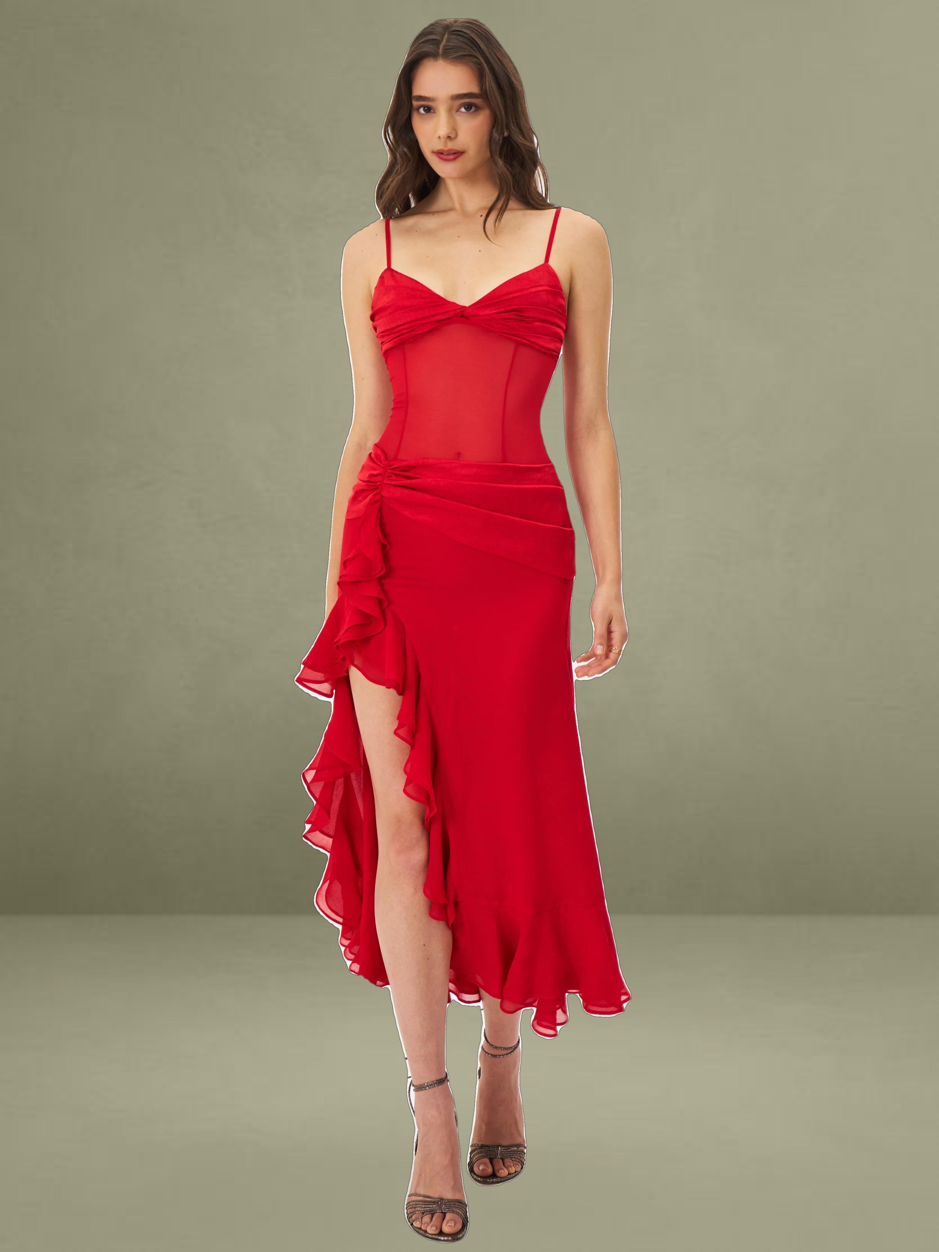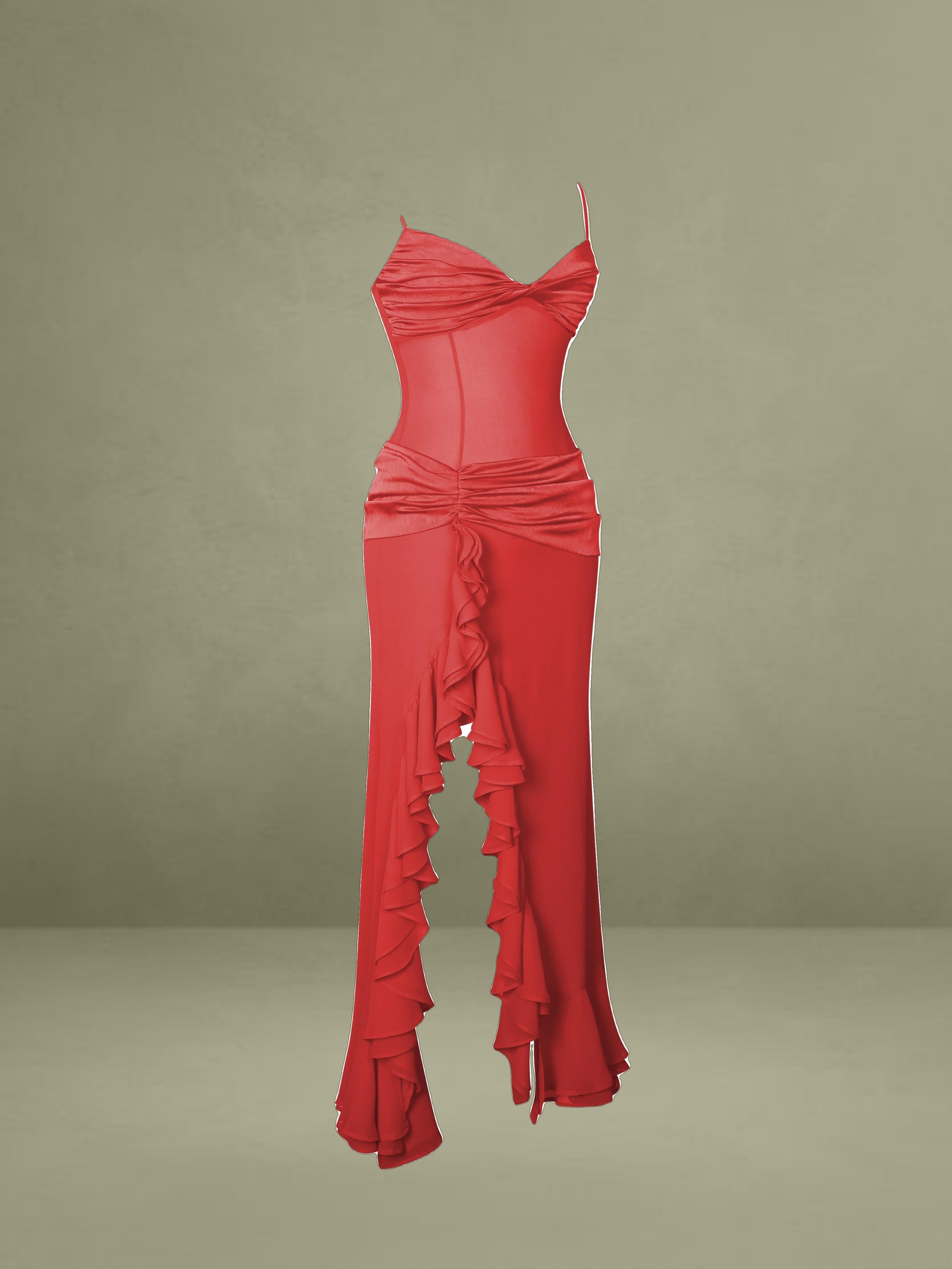 Turn up the heat and outshine the season in the Dahlina Dress, a fiery red maxi designed to make an entrance. With a bodycon silhouette and padded cups, it sculpts and supports in all the right places, while satin bust ruching is perfectly complemented by princess seams that enhance every curve. Asymmetrical satin gathers wrap the waist for a cinched effect, leading to a dramatic high slit traced with cascading waterfall ruffles. A flared hemline adds playful movement, and mesh lining keeps things comfortable all night long. Finished with an invisible zipper, this showstopper is your answer to gloomy weather—because nothing beats winter like a red-hot moment.