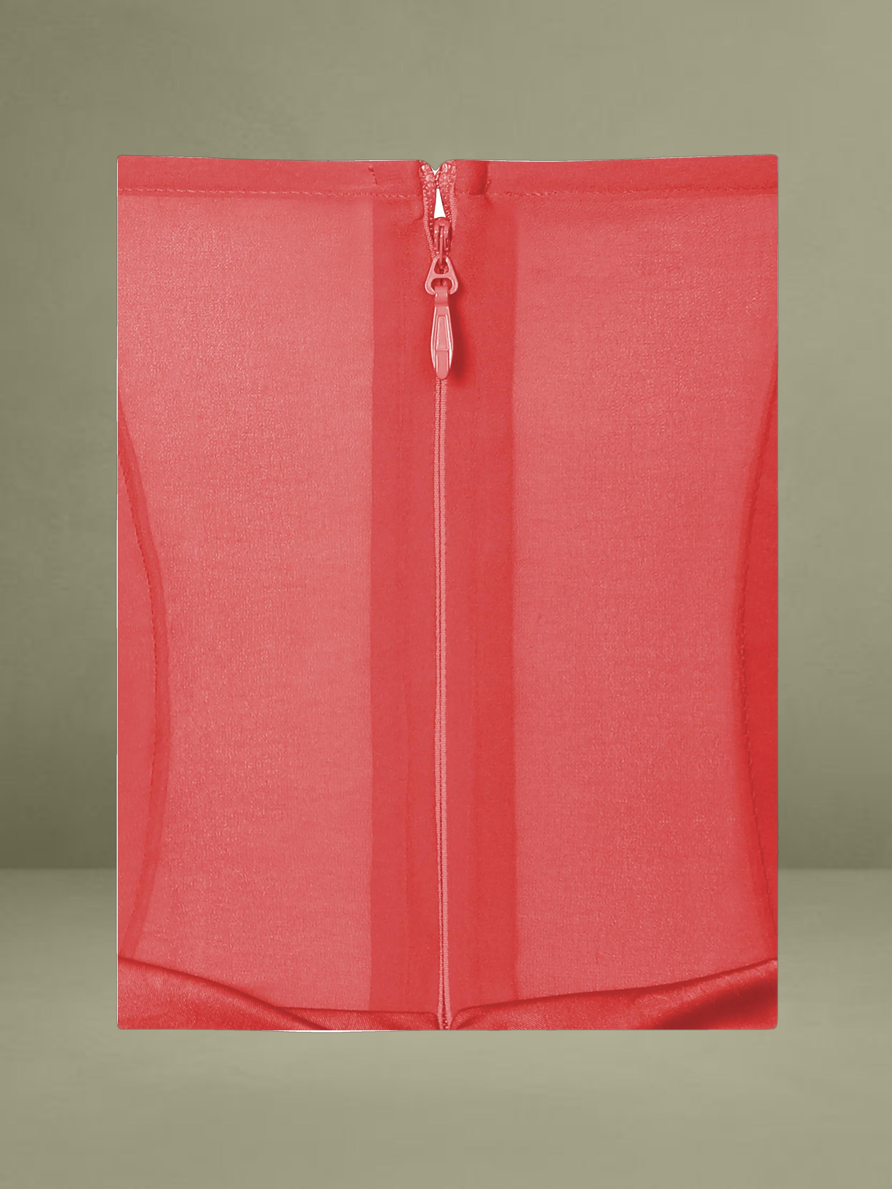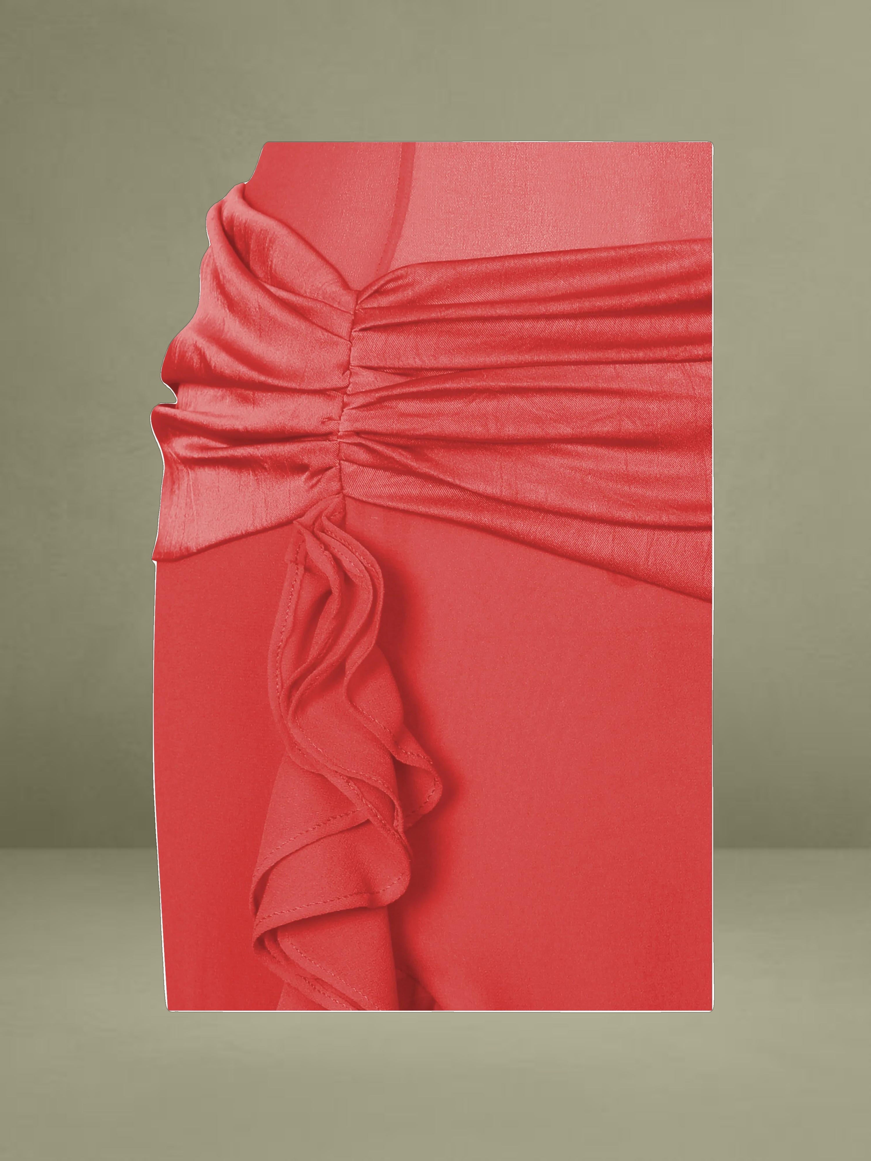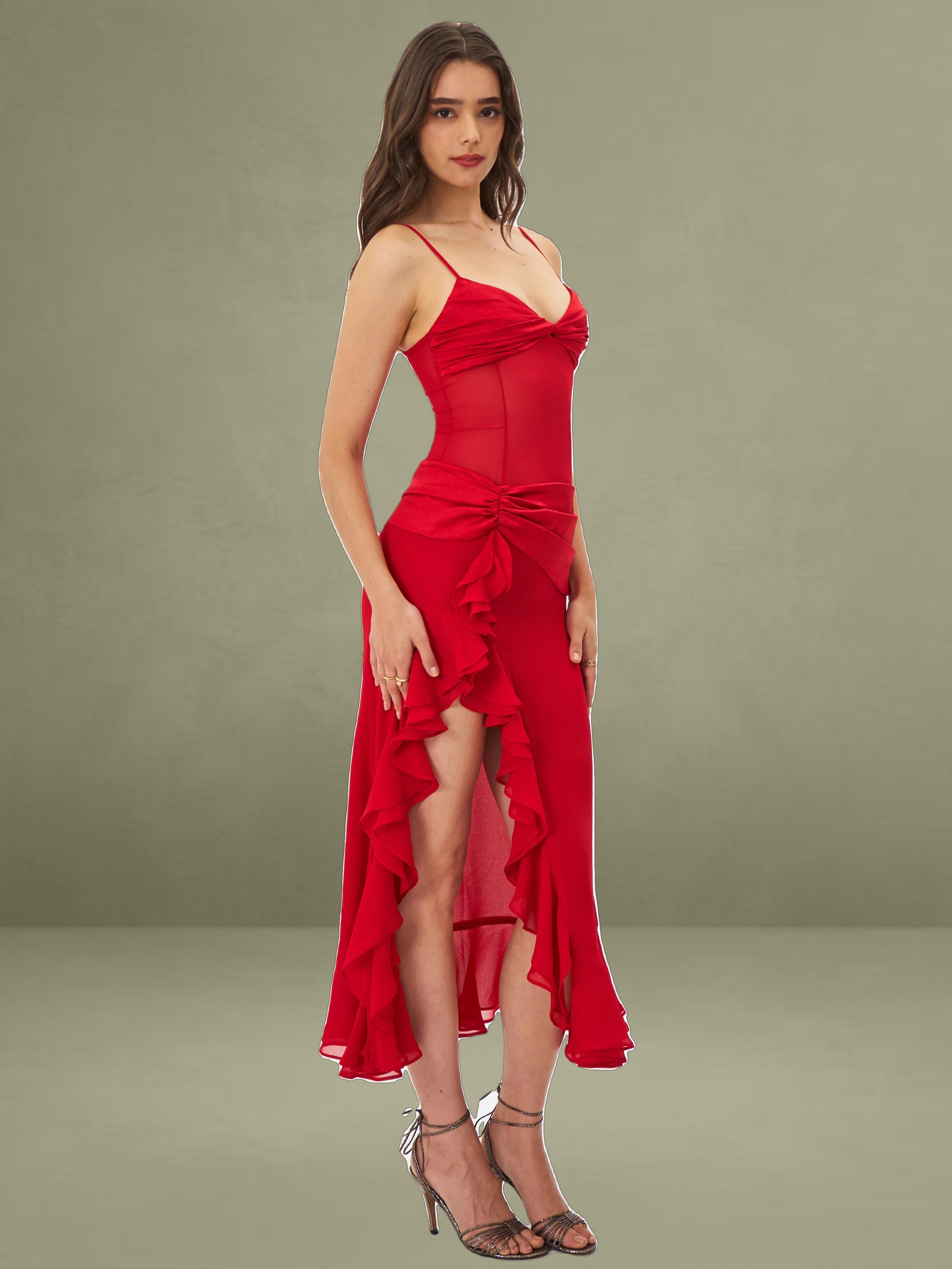 Turn up the heat and outshine the season in the Dahlina Dress, a fiery red maxi designed to make an entrance. With a bodycon silhouette and padded cups, it sculpts and supports in all the right places, while satin bust ruching is perfectly complemented by princess seams that enhance every curve. Asymmetrical satin gathers wrap the waist for a cinched effect, leading to a dramatic high slit traced with cascading waterfall ruffles. A flared hemline adds playful movement, and mesh lining keeps things comfortable all night long. Finished with an invisible zipper, this showstopper is your answer to gloomy weather—because nothing beats winter like a red-hot moment.