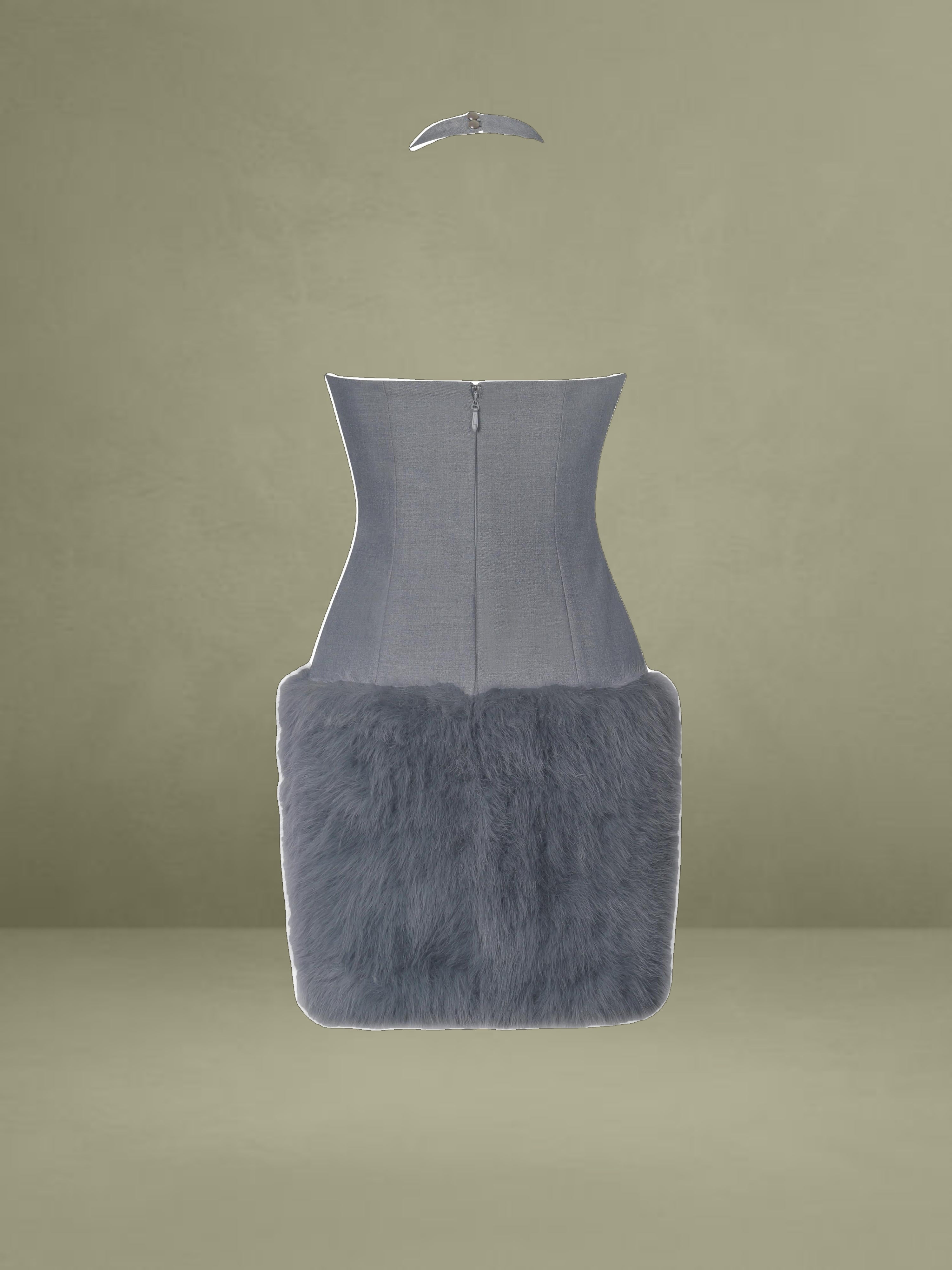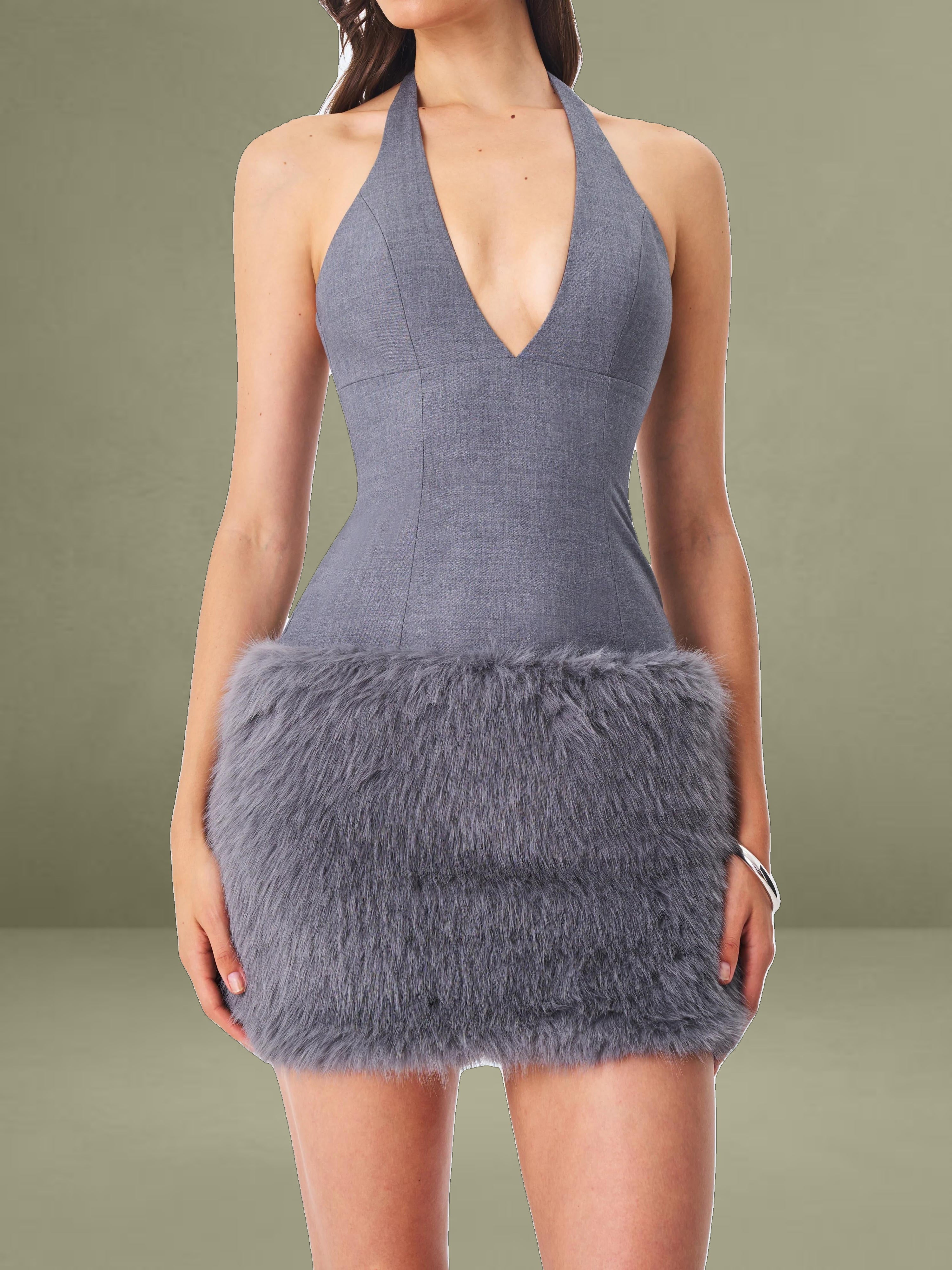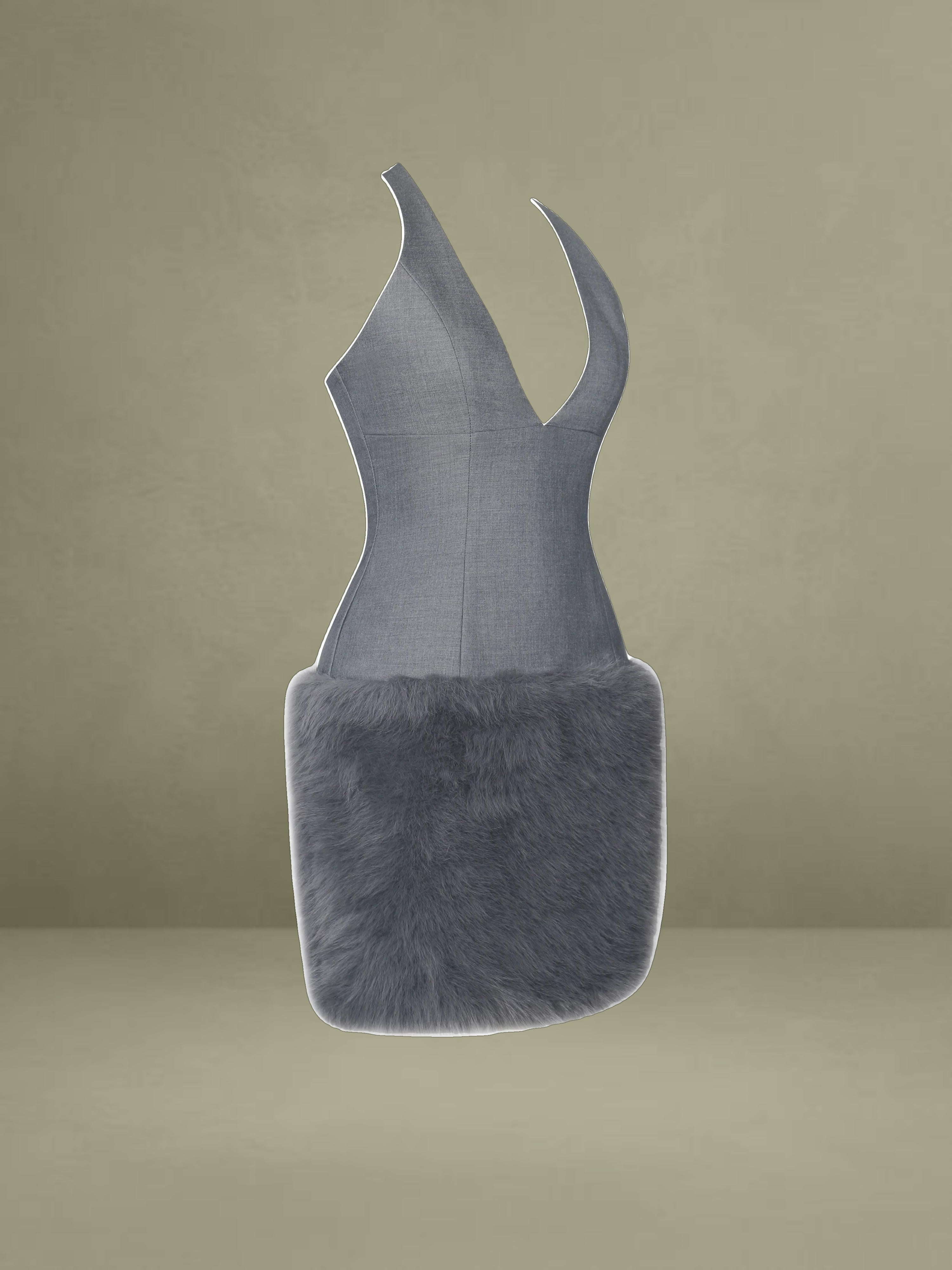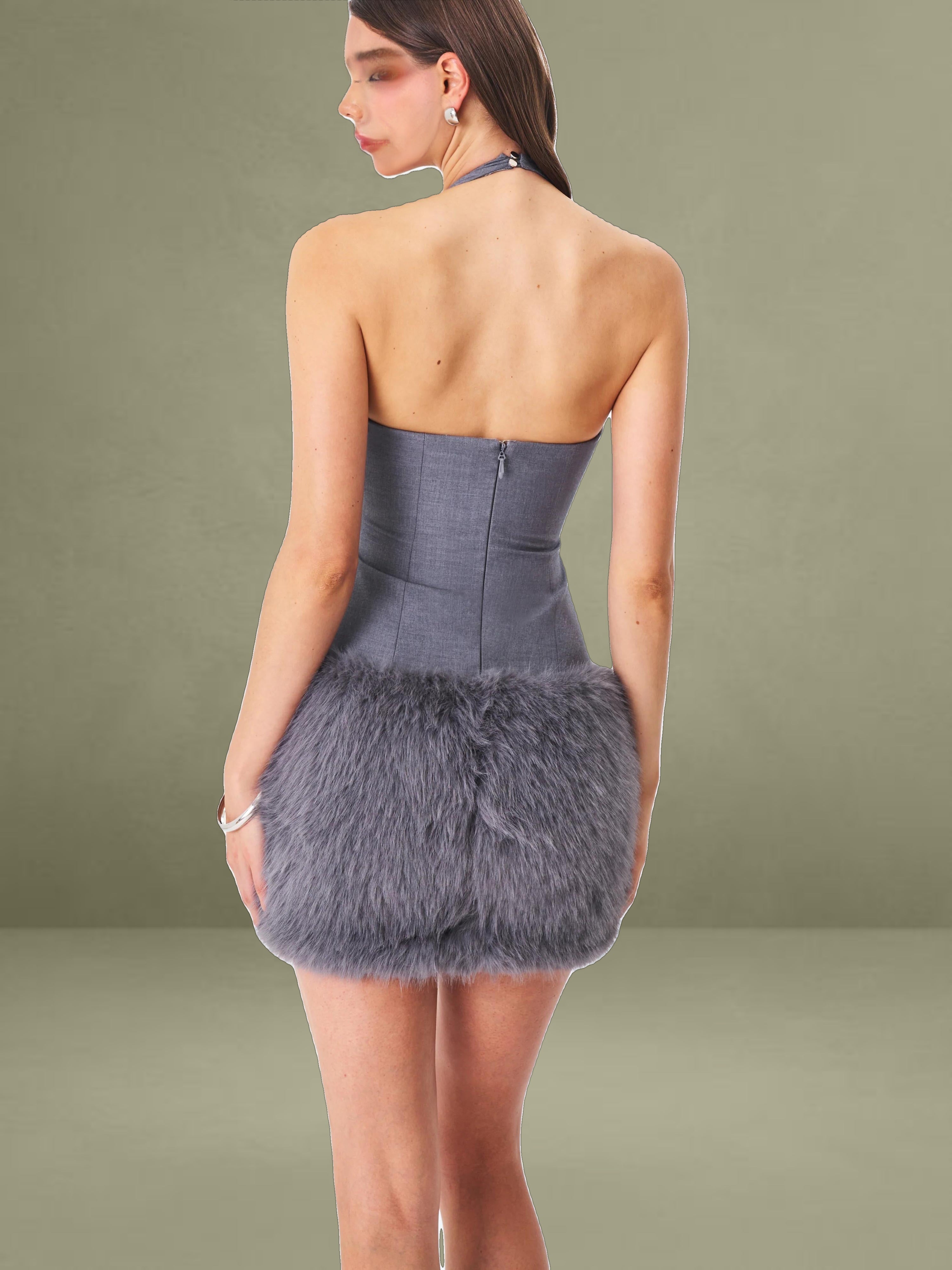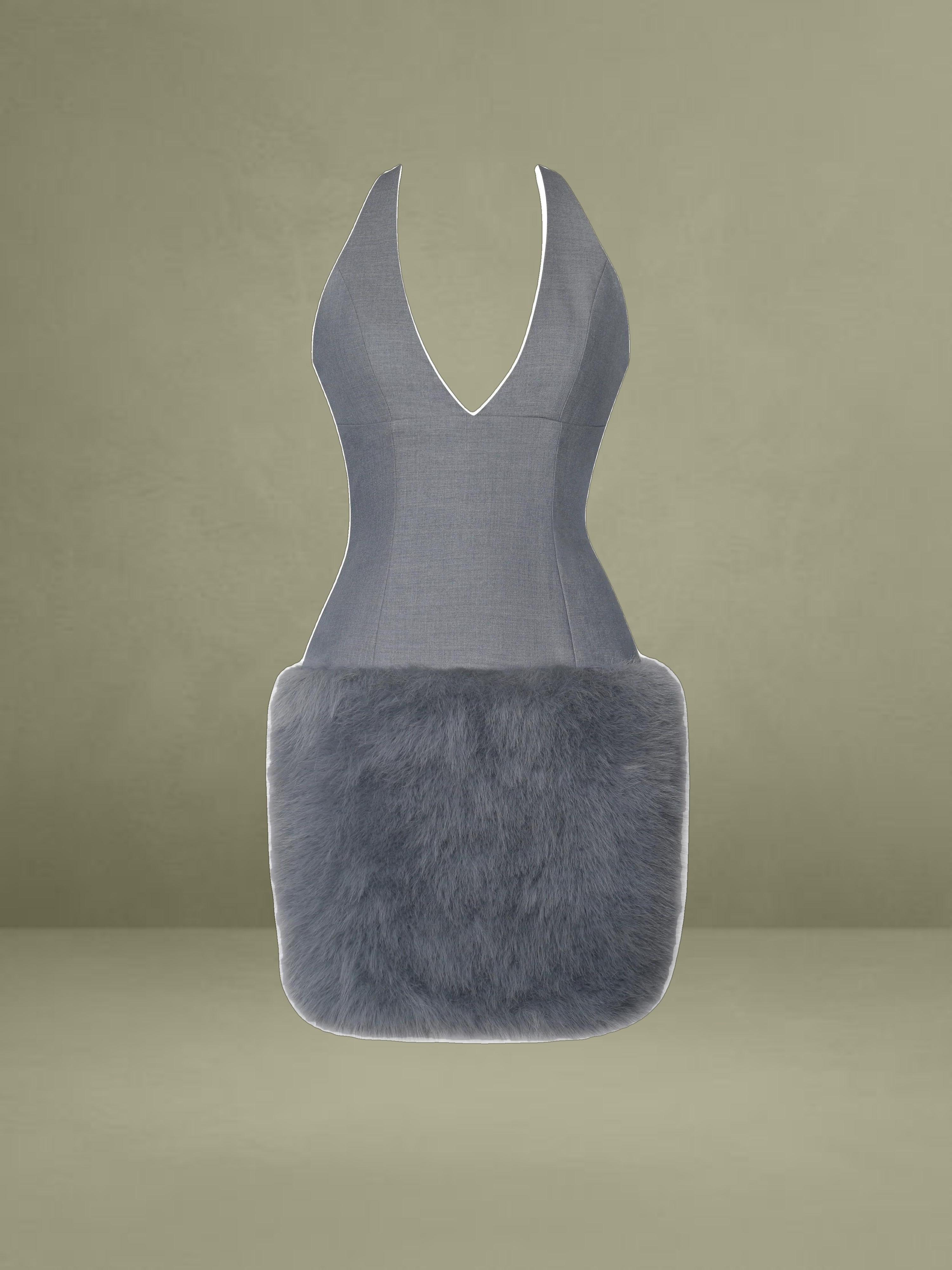 The Daisy Dress is your ticket to turning winter blues into winter oohs. Crafted from sleek grey crepe and fully lined in satin for comfort, this mini is equal parts cool and coquettish. A plunging halter neckline and flattering princess seams sculpt the body, while shank buttons at the neck and an invisible back zipper keep things smooth. The low-waisted silhouette is finished with a wide fur trim that brings après-ski energy. Perfect for chilly night-outs, snow globe dates, or holiday parties where looking hot is the assignment.