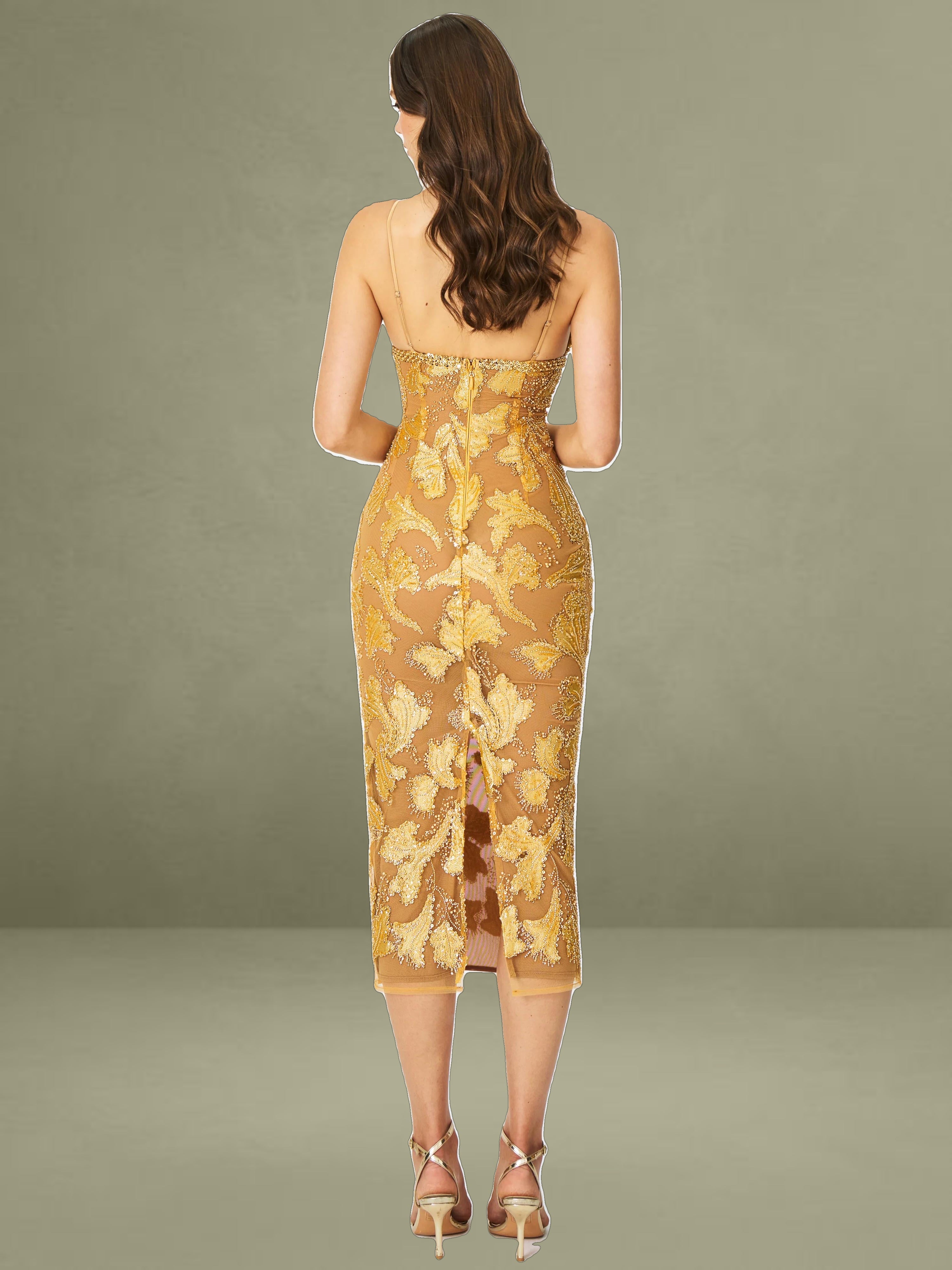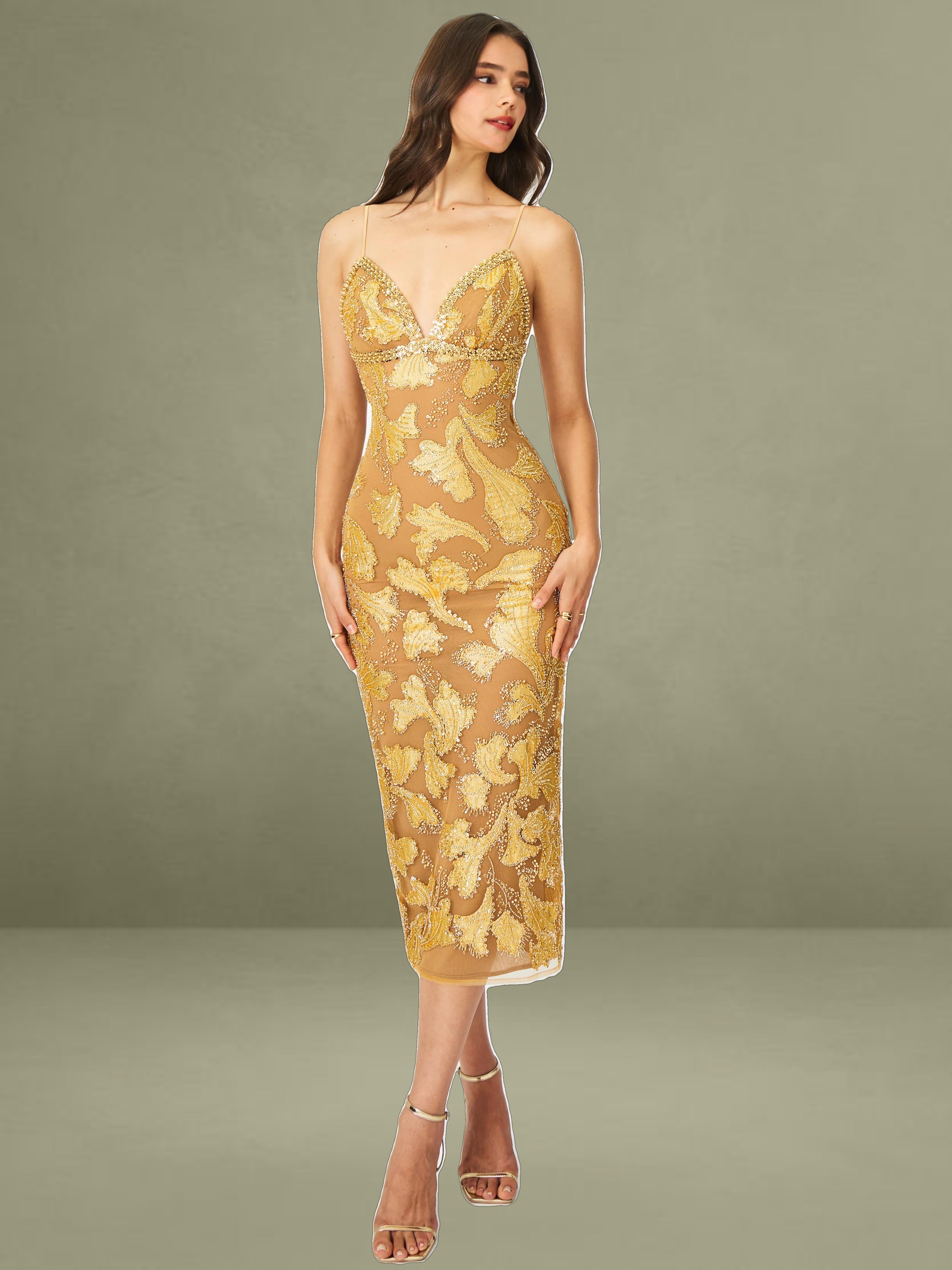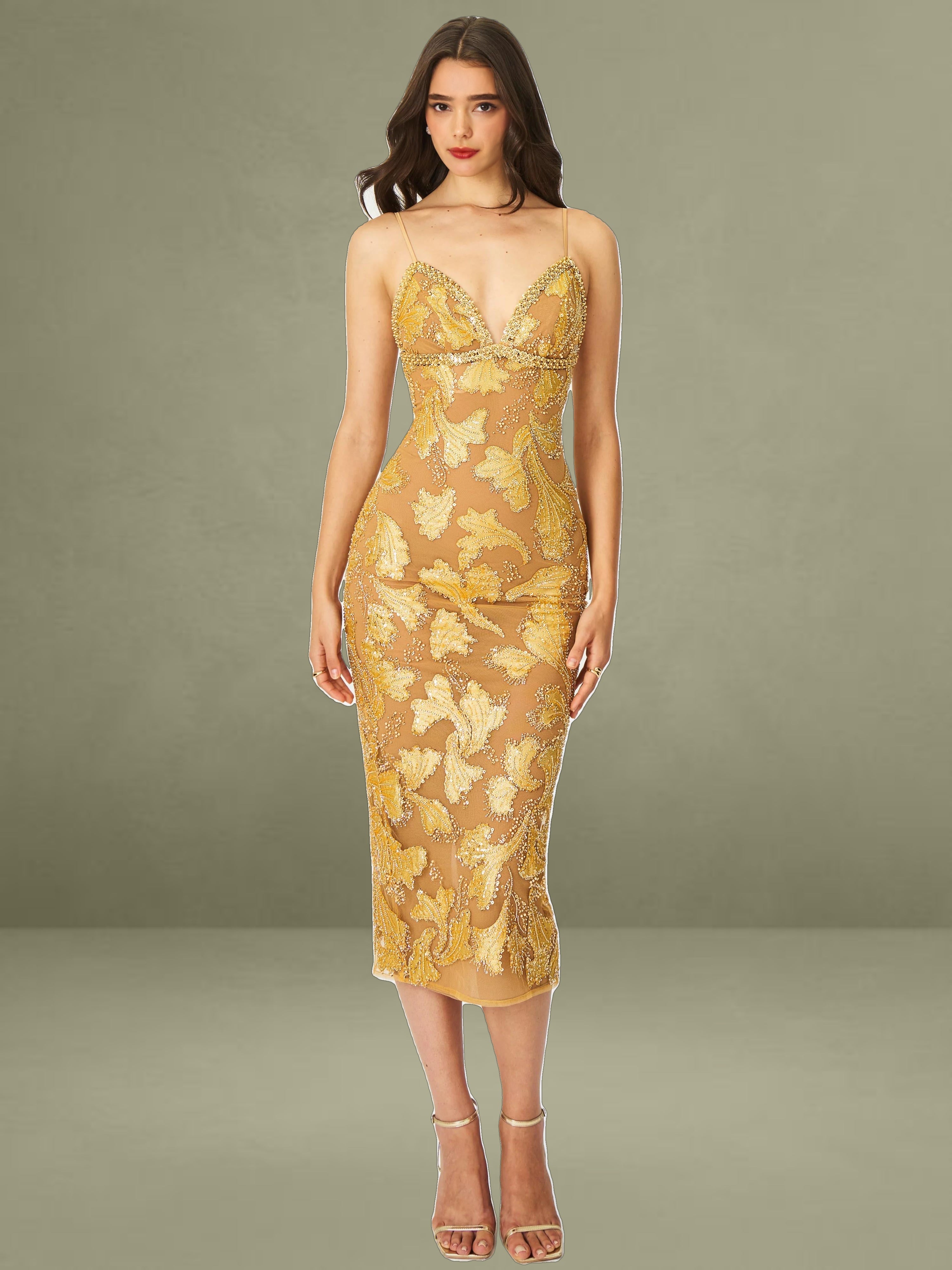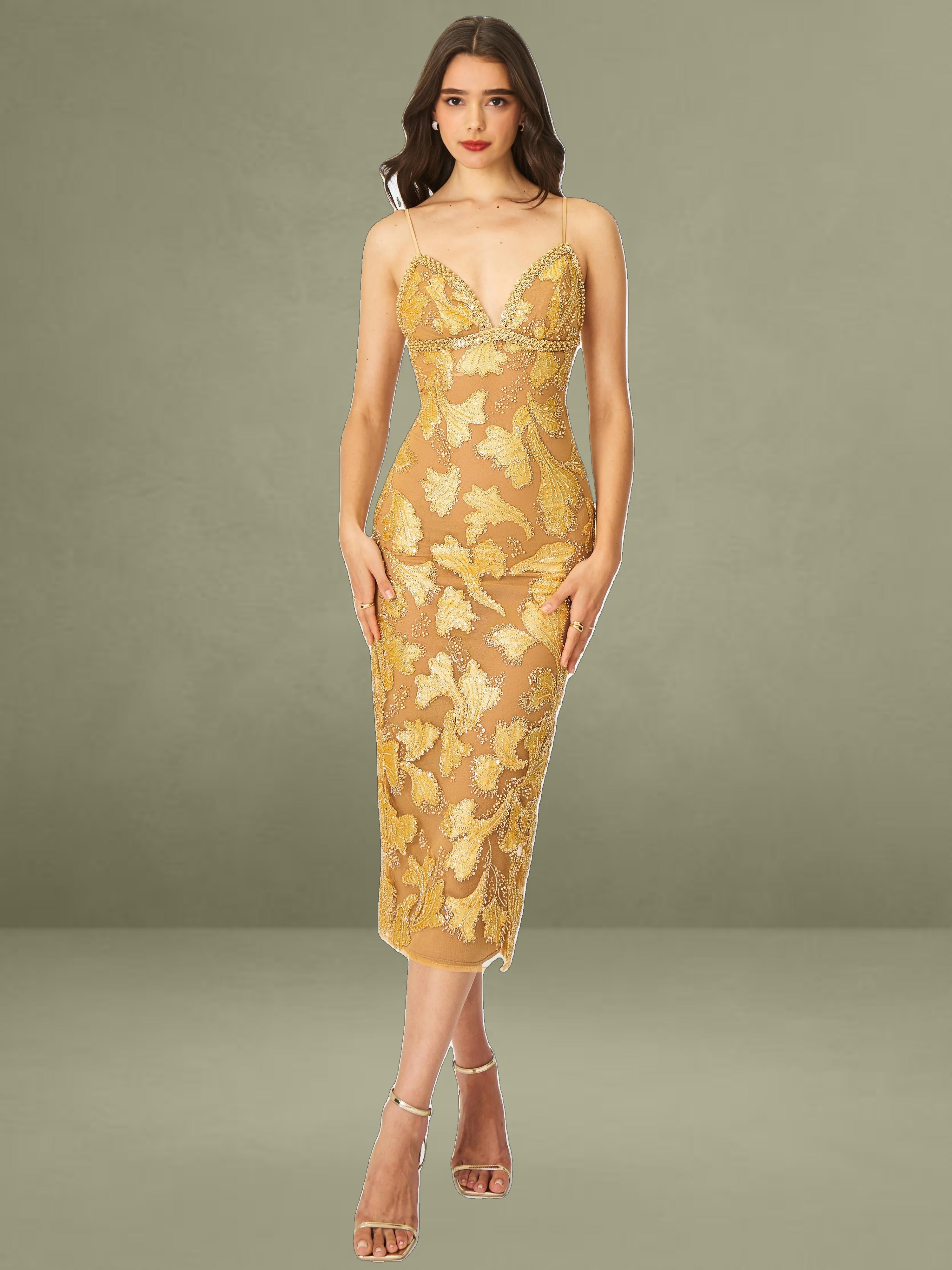 Elevate your evening wardrobe with the Edie Dress in a radiant golden bronze hue. Dusted in intricate beadwork, this V-neck silhouette shimmers like a spellbound constellation, each glimmer catching the light with celestial charm. Nude mesh lining offers subtle coverage, while adjustable straps and a back vent ensure comfort and graceful movement. Blending floral allure with refined elegance, it’s finished with a back zipper for a smooth fit. The Edie Dress is a dazzling choice for cocktail hours, star-lit celebrations, or whenever your horoscope calls for main-character energy.