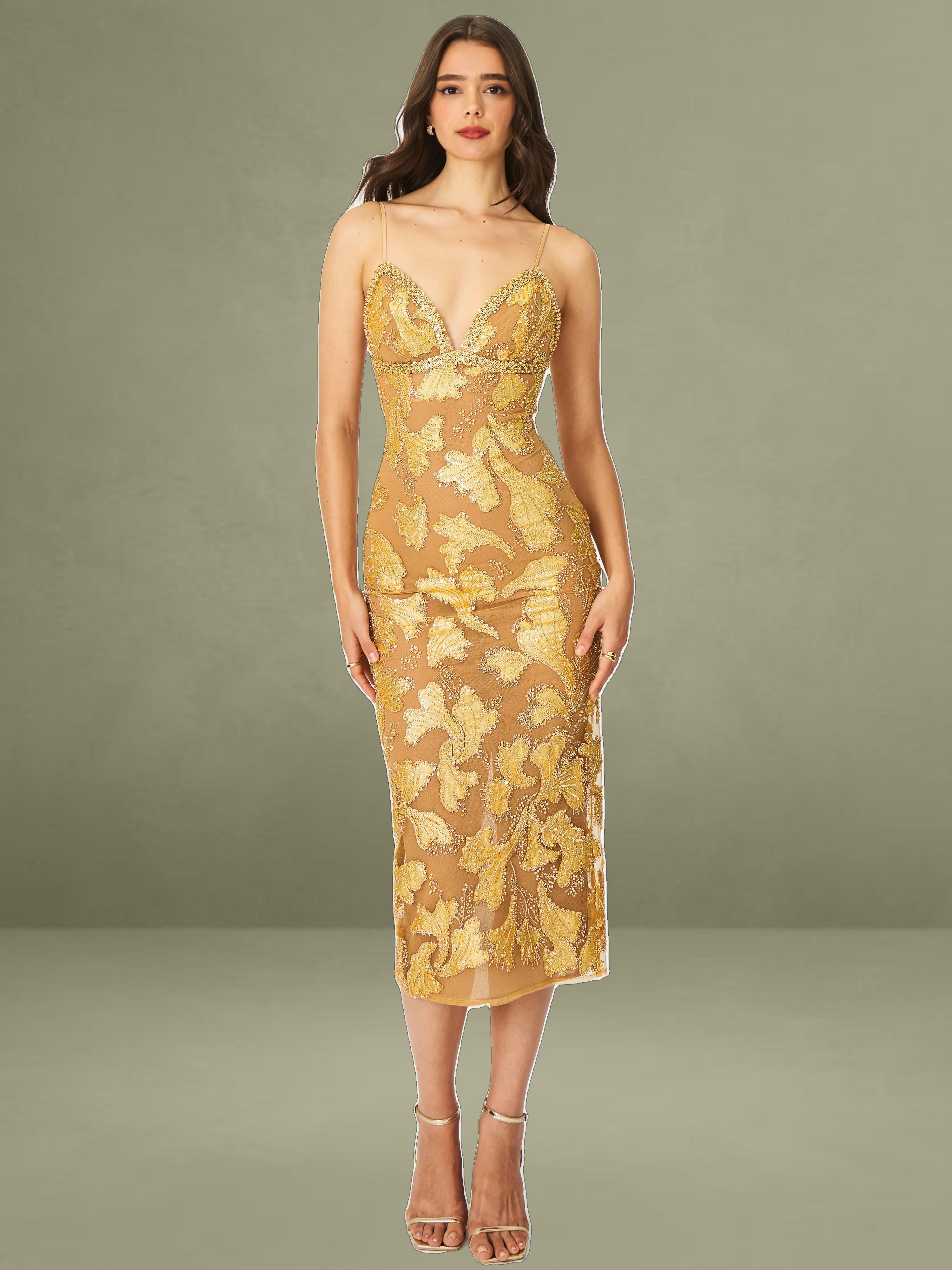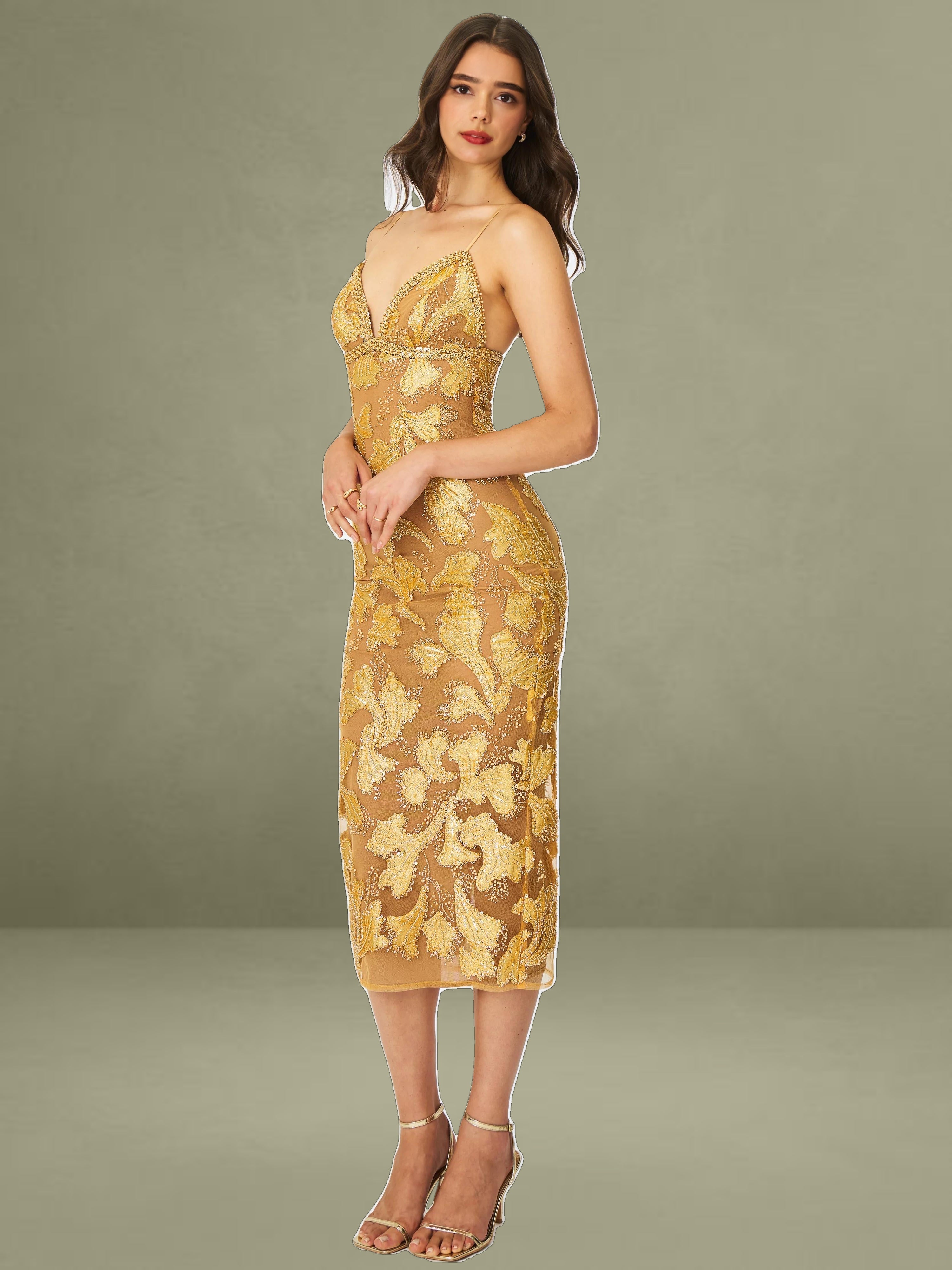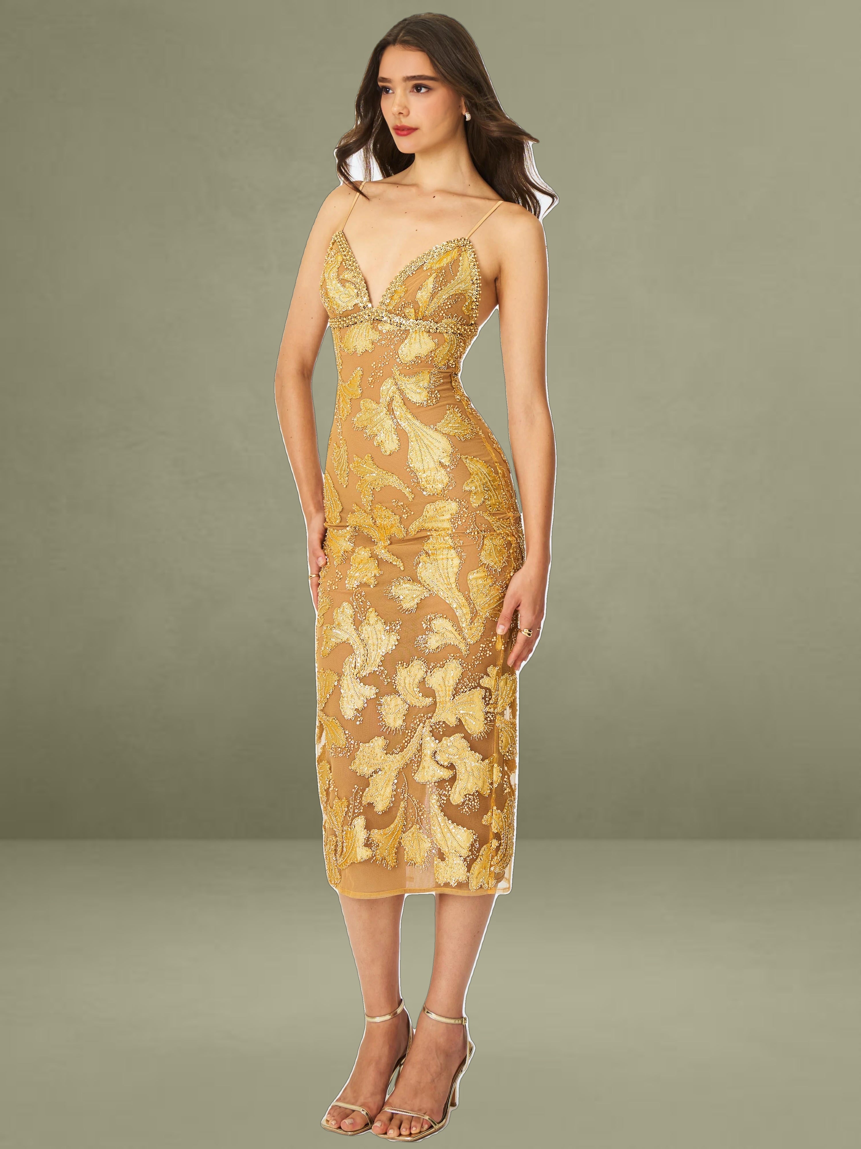 Elevate your evening wardrobe with the Edie Dress in a radiant golden bronze hue. Dusted in intricate beadwork, this V-neck silhouette shimmers like a spellbound constellation, each glimmer catching the light with celestial charm. Nude mesh lining offers subtle coverage, while adjustable straps and a back vent ensure comfort and graceful movement. Blending floral allure with refined elegance, it’s finished with a back zipper for a smooth fit. The Edie Dress is a dazzling choice for cocktail hours, star-lit celebrations, or whenever your horoscope calls for main-character energy.
