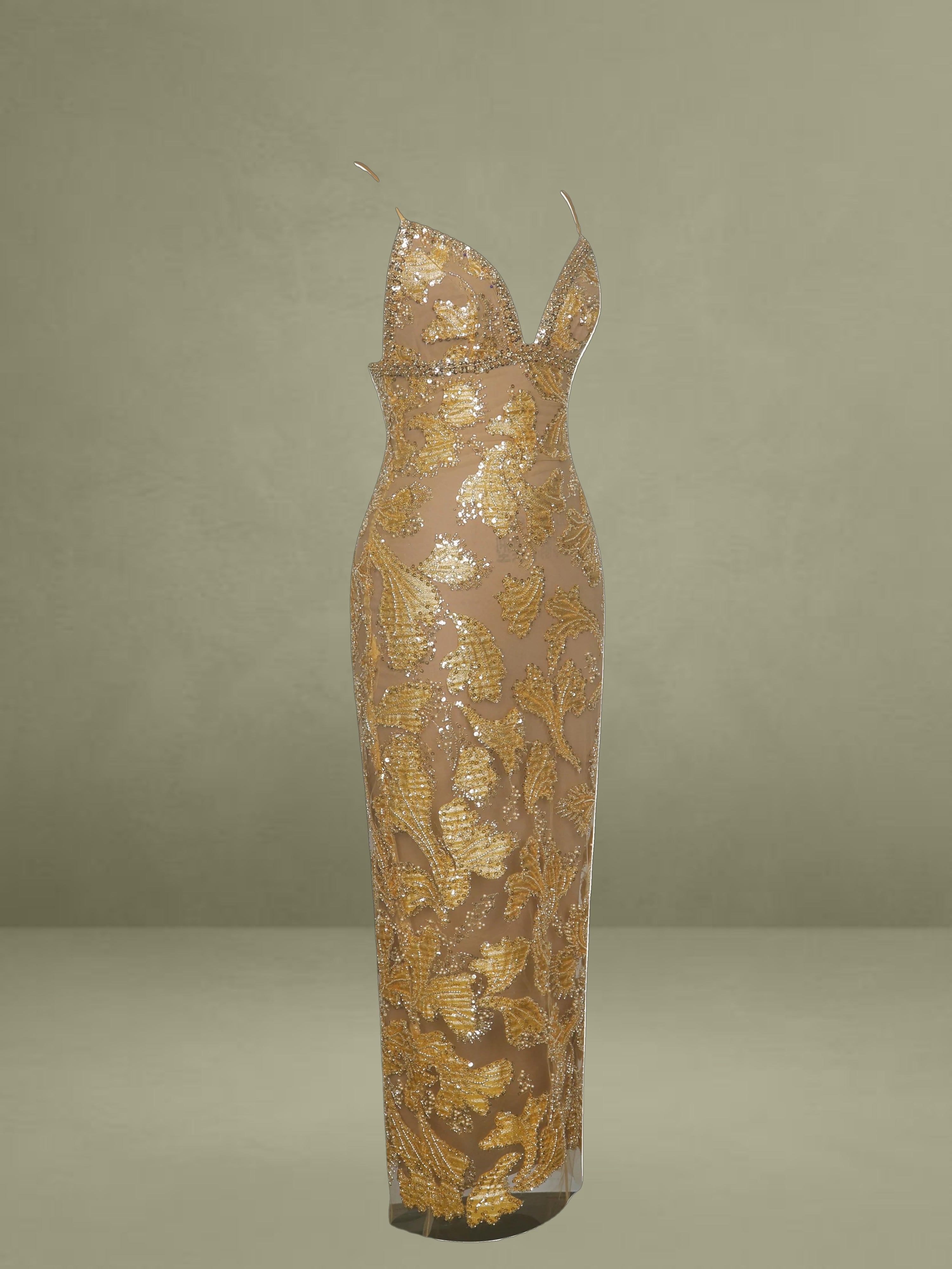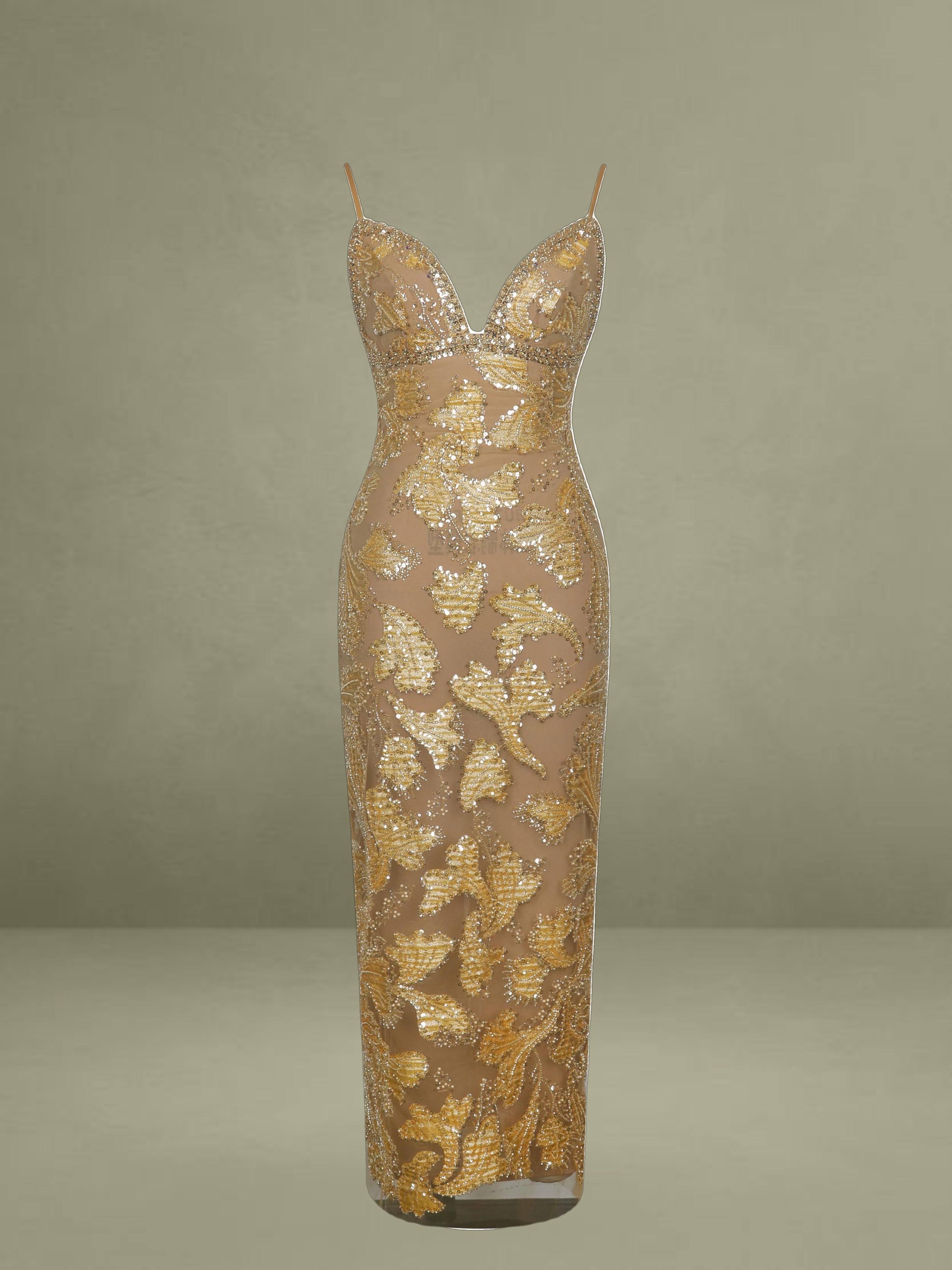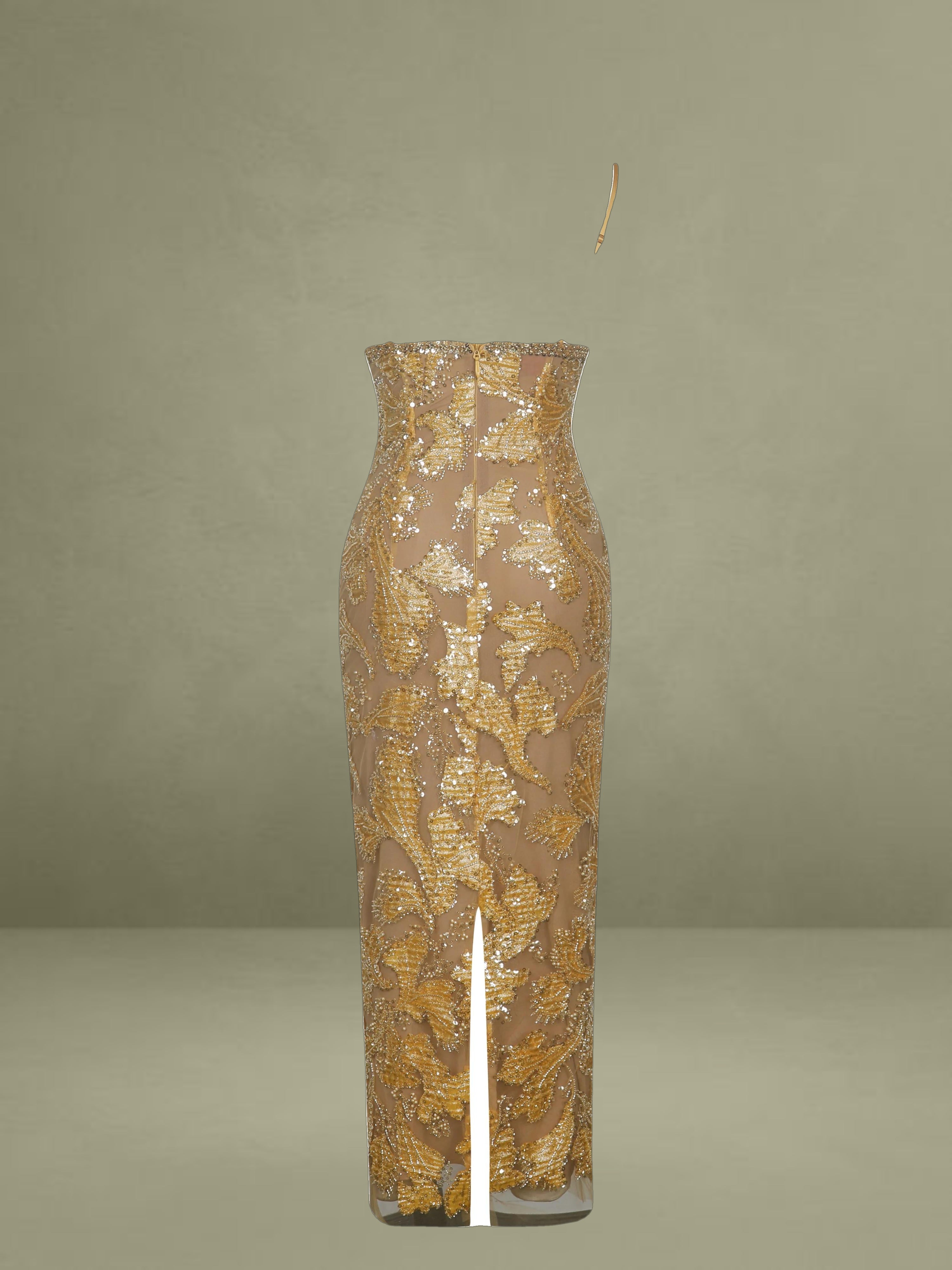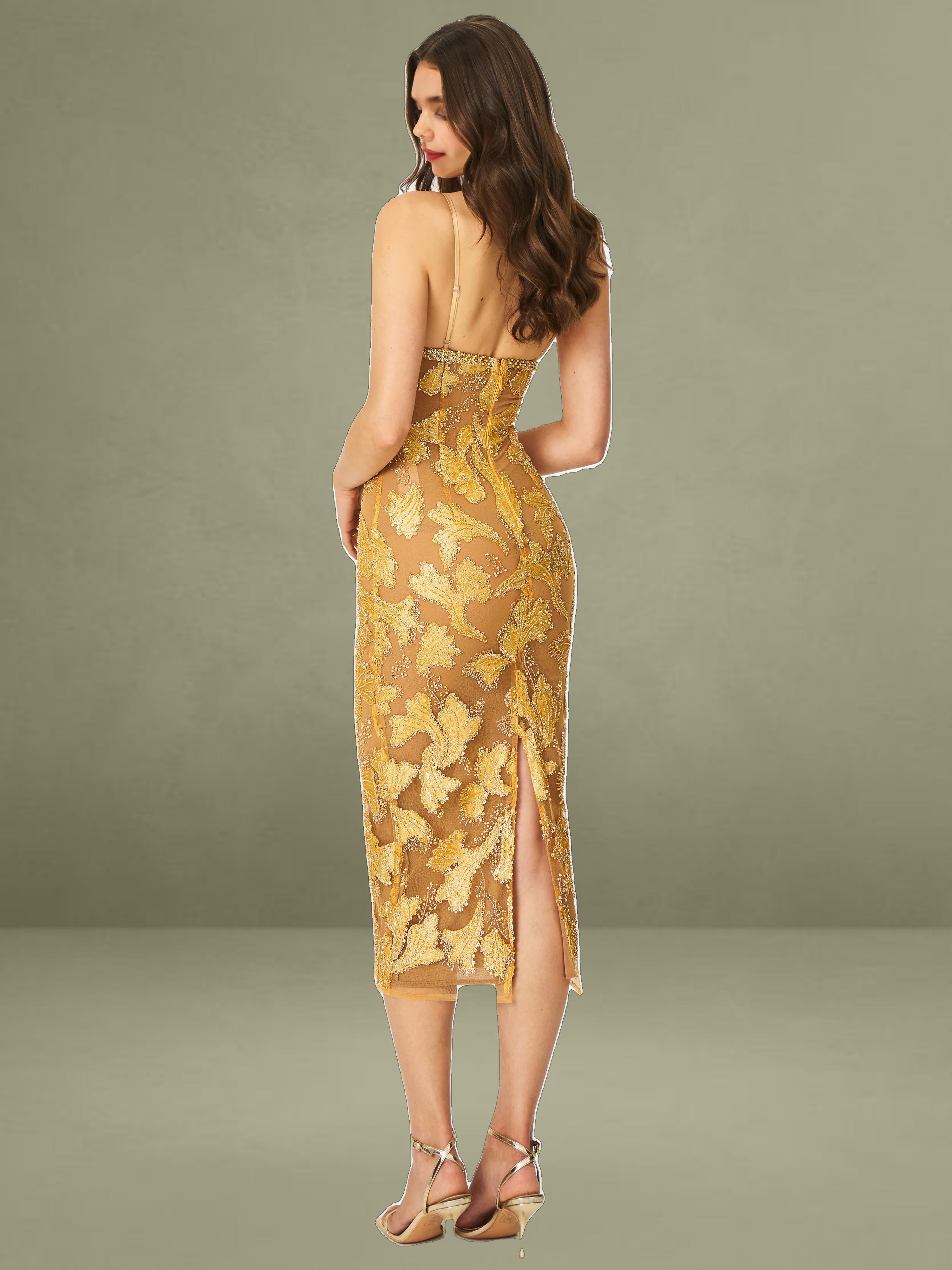 Elevate your evening wardrobe with the Edie Dress in a radiant golden bronze hue. Dusted in intricate beadwork, this V-neck silhouette shimmers like a spellbound constellation, each glimmer catching the light with celestial charm. Nude mesh lining offers subtle coverage, while adjustable straps and a back vent ensure comfort and graceful movement. Blending floral allure with refined elegance, it’s finished with a back zipper for a smooth fit. The Edie Dress is a dazzling choice for cocktail hours, star-lit celebrations, or whenever your horoscope calls for main-character energy.
