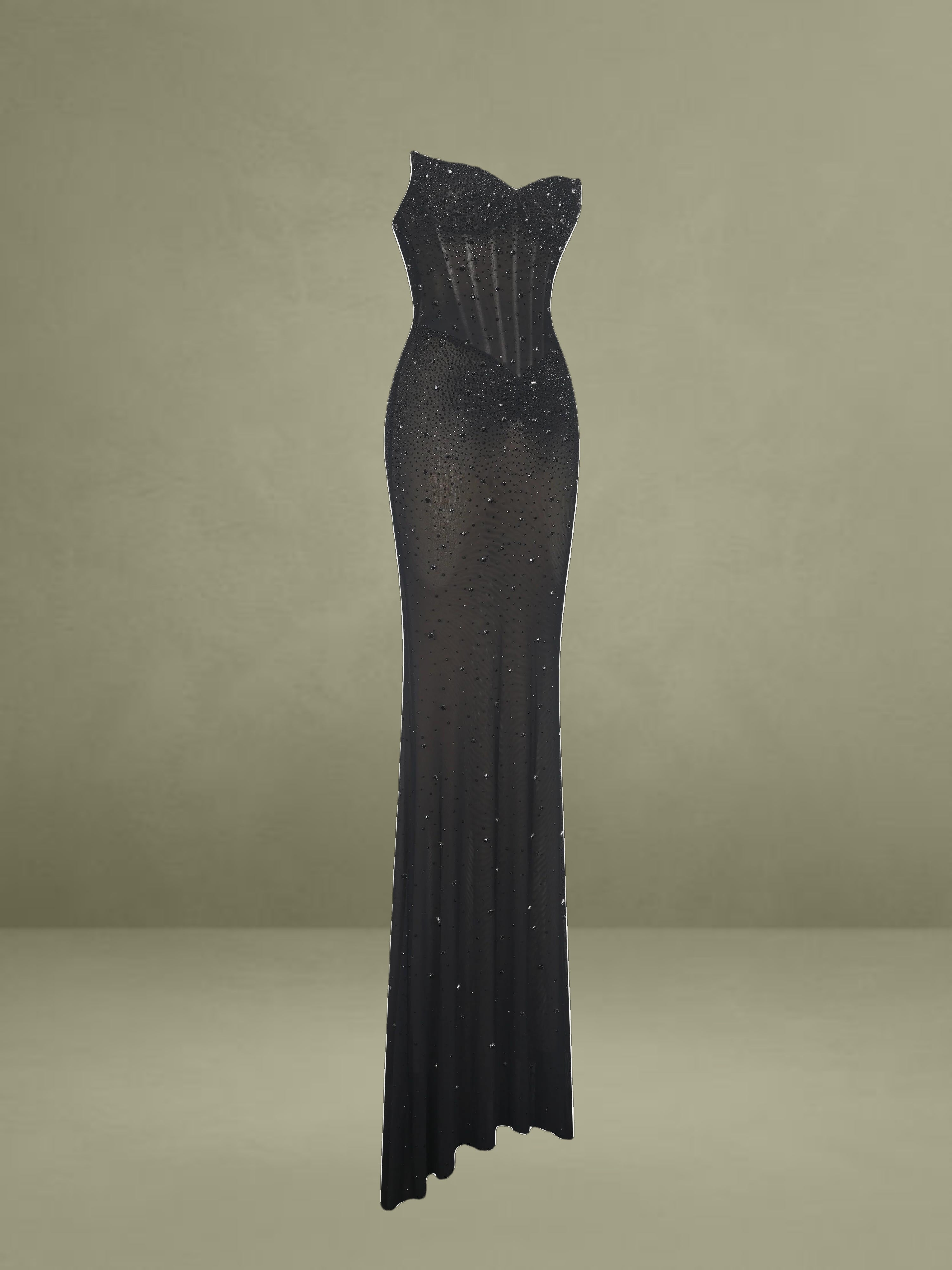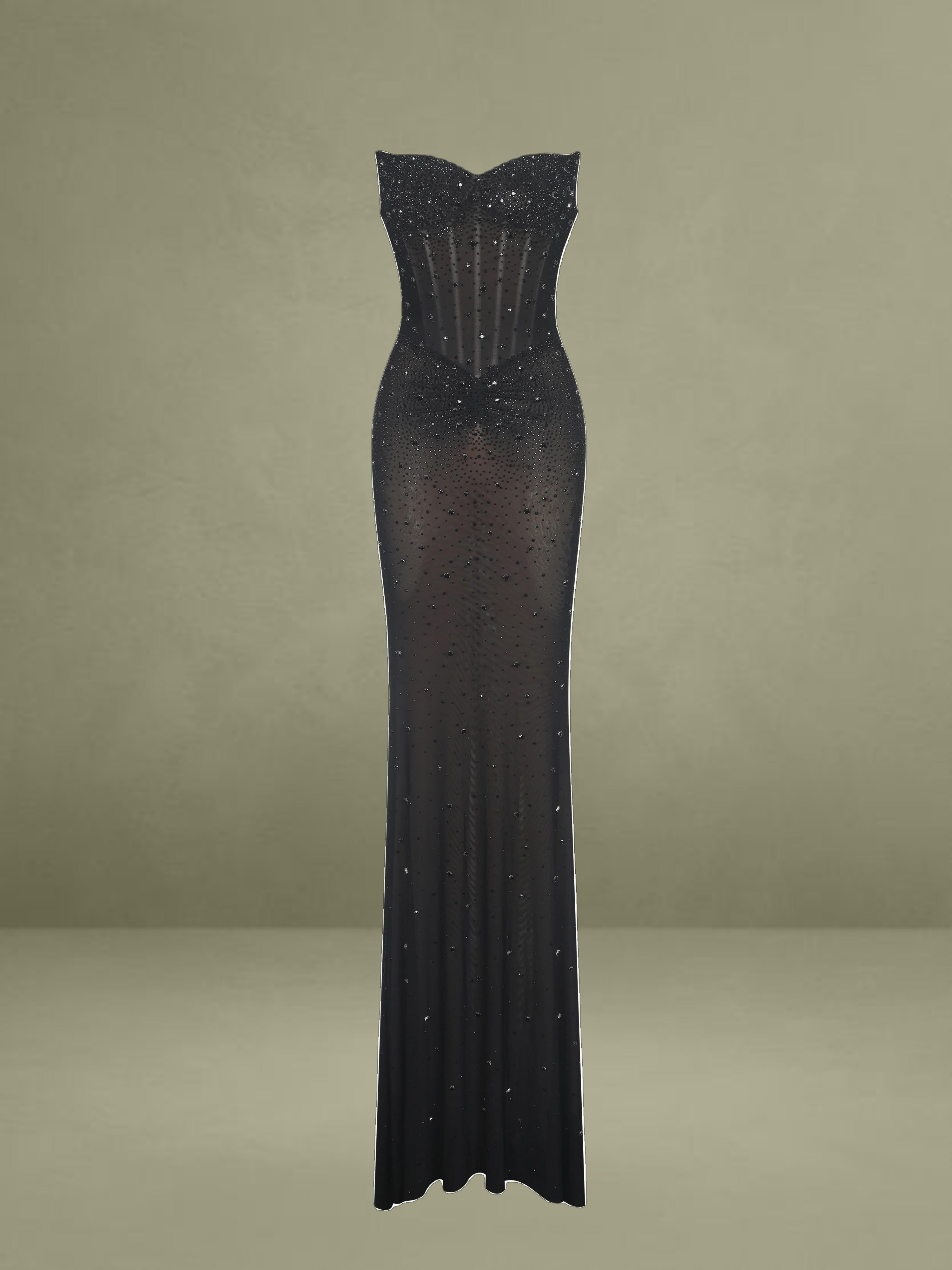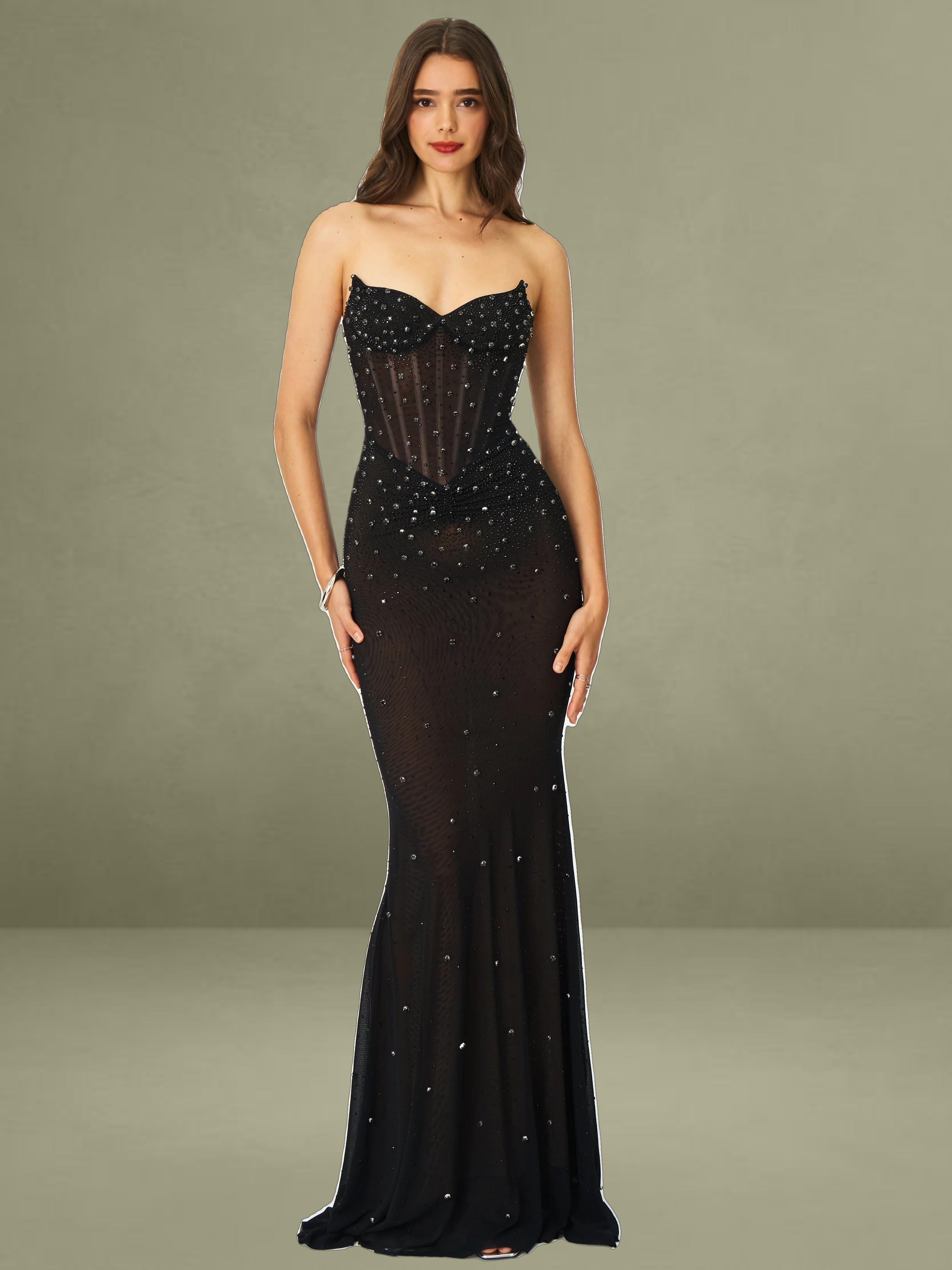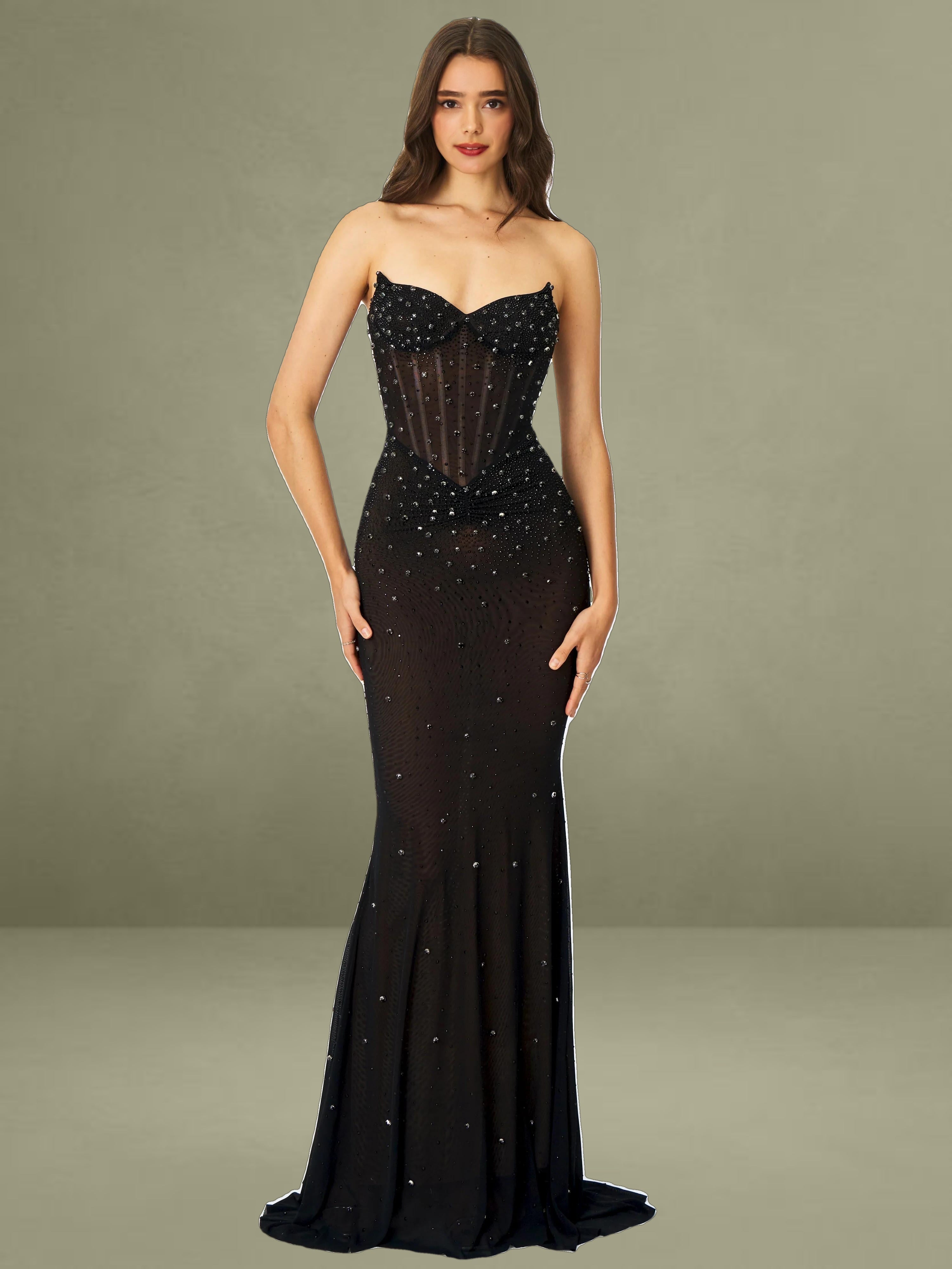 Introducing the Fatima dress, an exquisite mermaid maxi dress that embodies sophistication and glamour. Crafted from high-stretch mesh fabric and fully lined for comfort, this dress features built-in bones and padded cups, ensuring a flawless silhouette. The V-shape waistline accentuates your curves, while the crystal decorations add a touch of sparkle and elegance. Perfect for formal occasions, this dress combines luxurious details with a figure-enhancing design, making it a standout piece in any wardrobe. It is also available in Nude, Red, and Green.