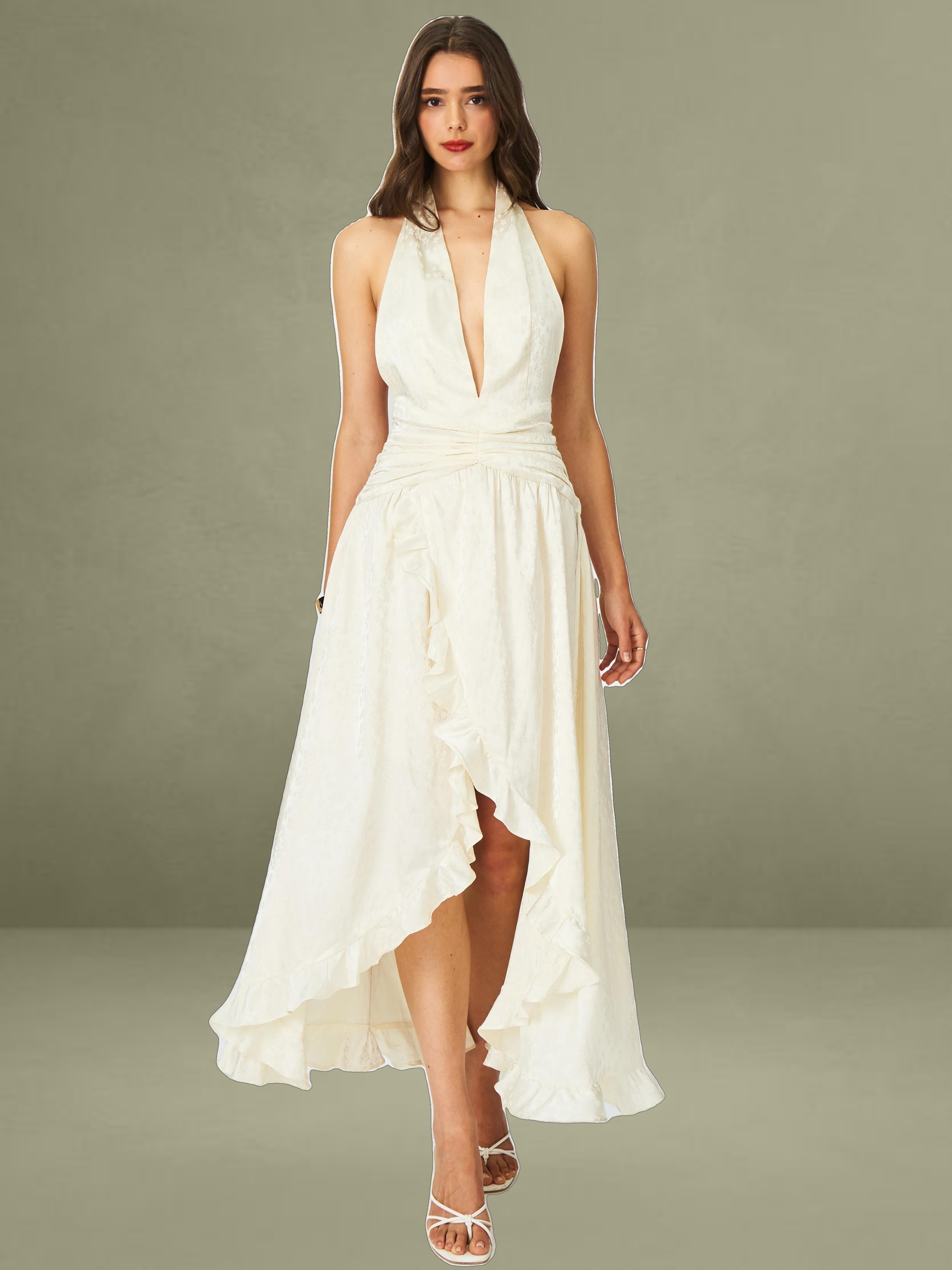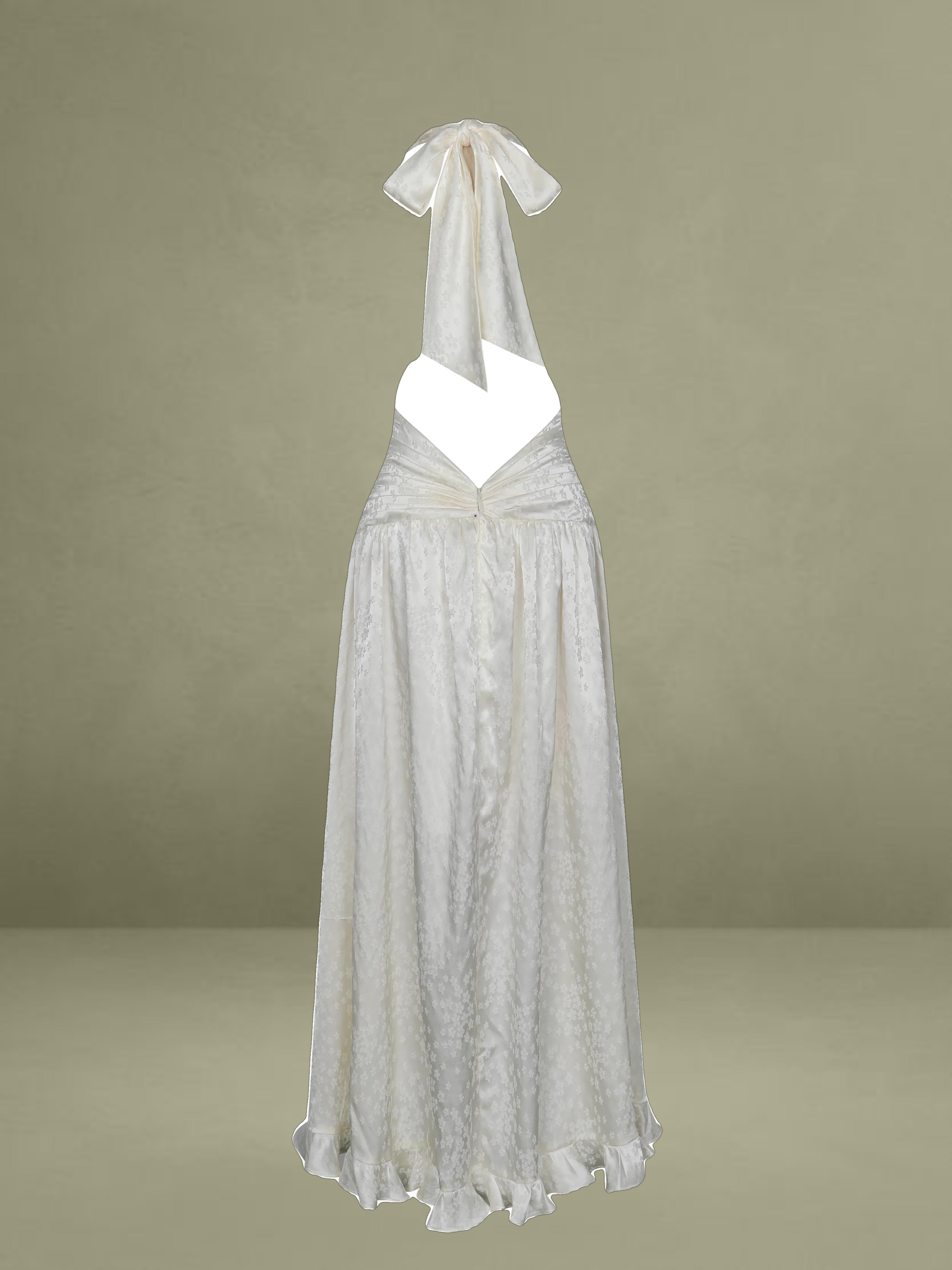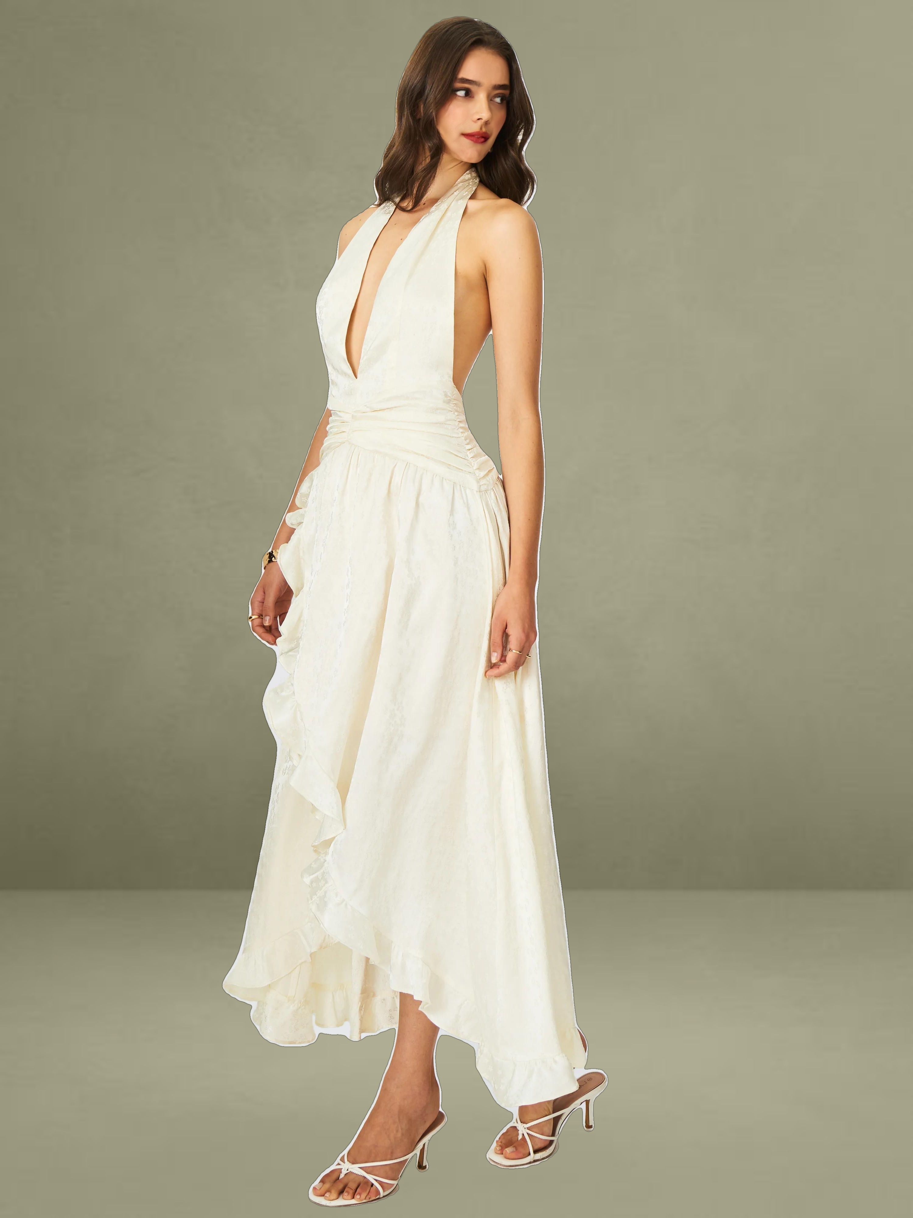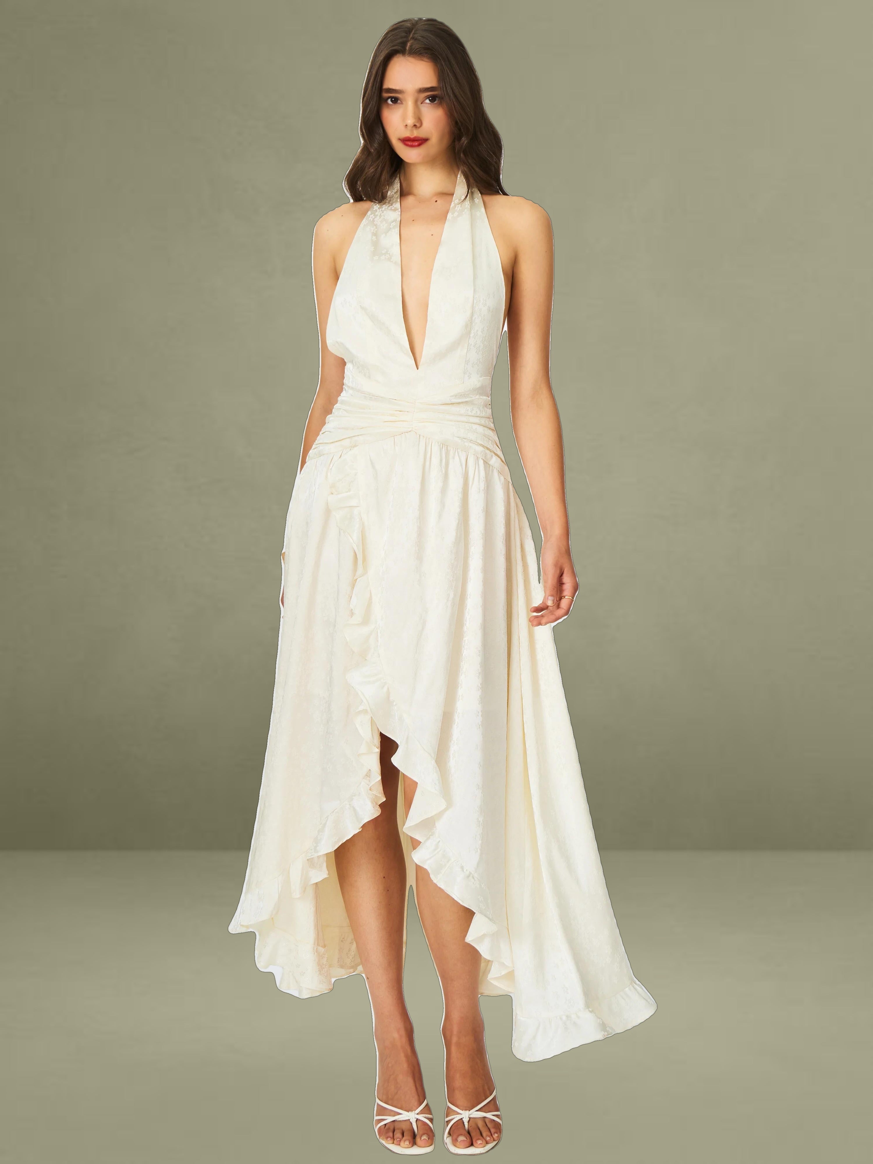 Ideal for brunches, fancy picnics, and amazing vacations. This dress is both charming and refined. It's made from a soft cream - white jacquard fabric with a lovely floral pattern. It has a sexy deep V - neck and a gathered waist, which creates a nice curved shape. The backless style adds a bold and fresh appeal. The flowing ruffles move with each step, adding a sweet and light - hearted touch. The long halter neck ties flutter gracefully, adding a bit of playfulness. It's fully lined with matching satin and has an invisible zipper for a perfect fit, combining sophistication and comfort effortlessly.