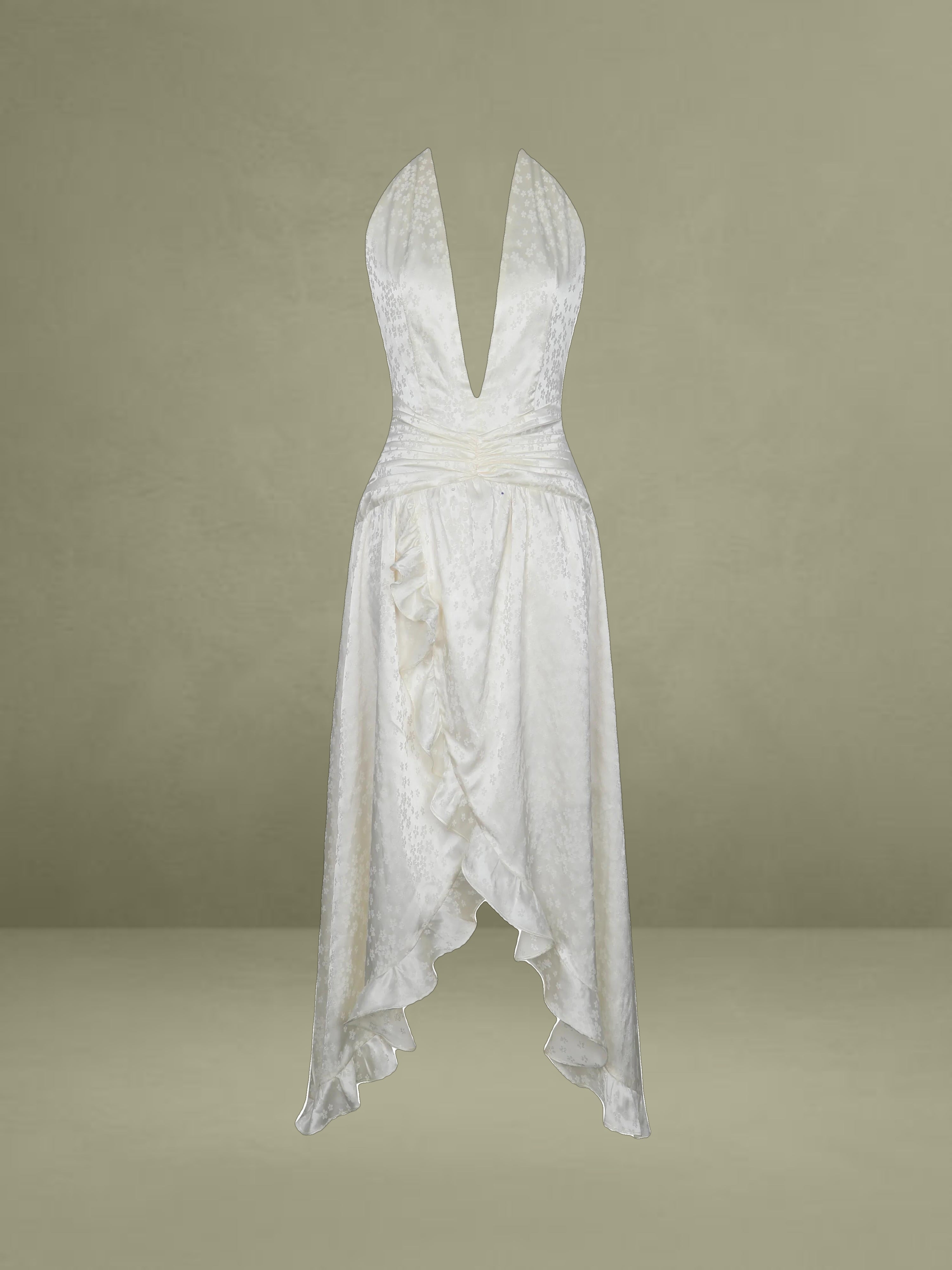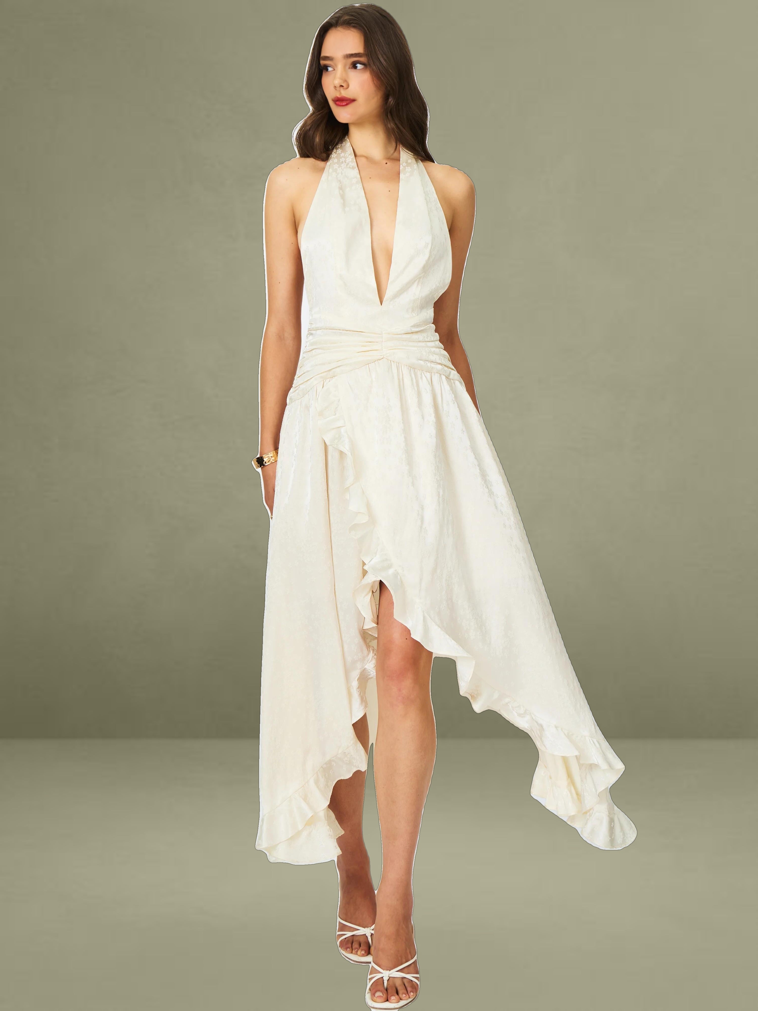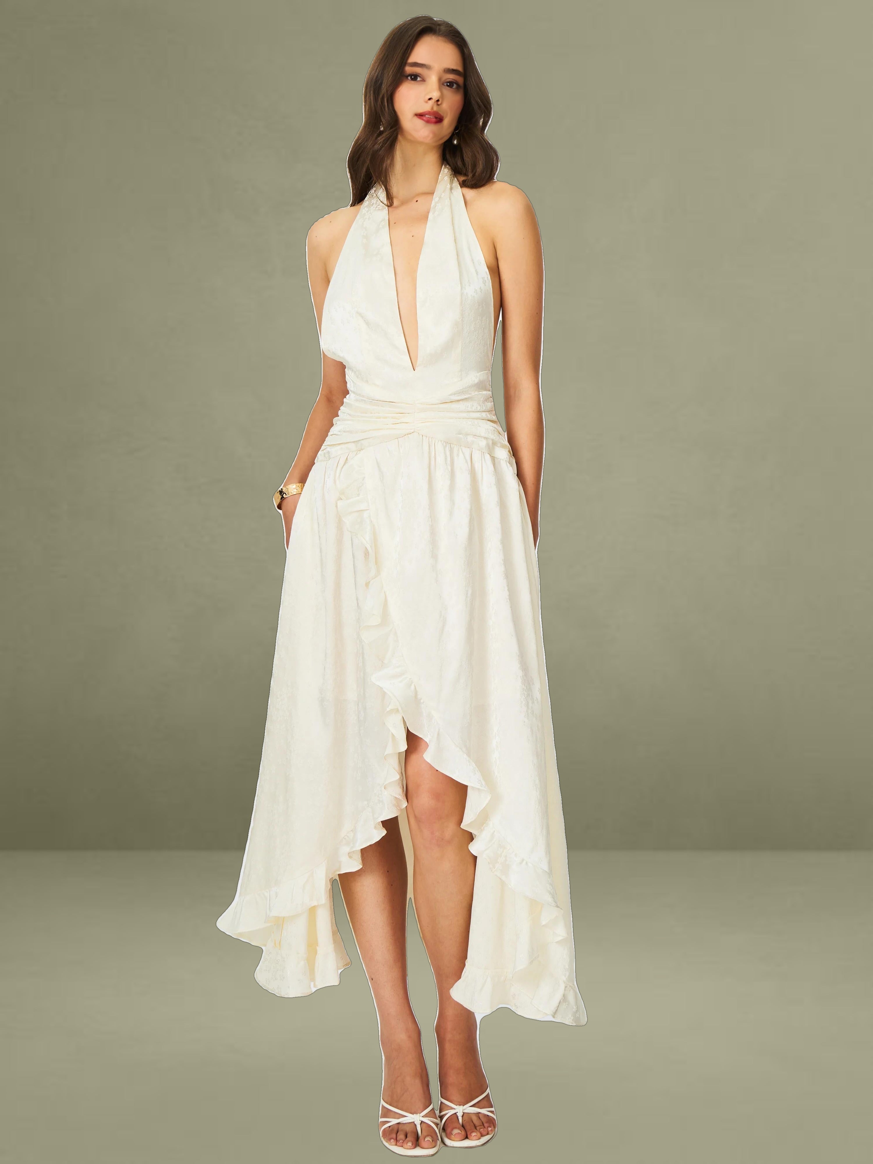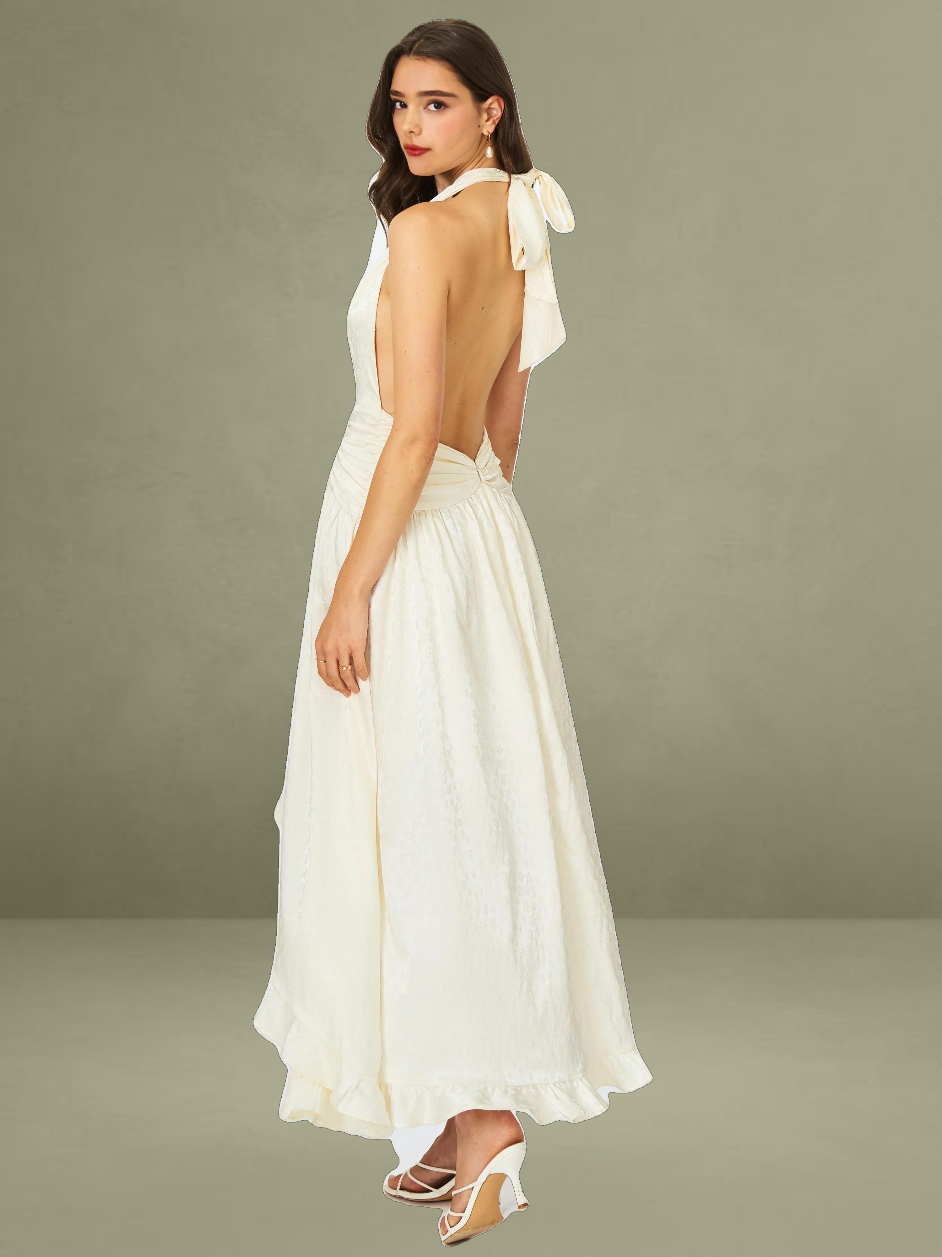 Ideal for brunches, fancy picnics, and amazing vacations. This dress is both charming and refined. It's made from a soft cream - white jacquard fabric with a lovely floral pattern. It has a sexy deep V - neck and a gathered waist, which creates a nice curved shape. The backless style adds a bold and fresh appeal. The flowing ruffles move with each step, adding a sweet and light - hearted touch. The long halter neck ties flutter gracefully, adding a bit of playfulness. It's fully lined with matching satin and has an invisible zipper for a perfect fit, combining sophistication and comfort effortlessly.