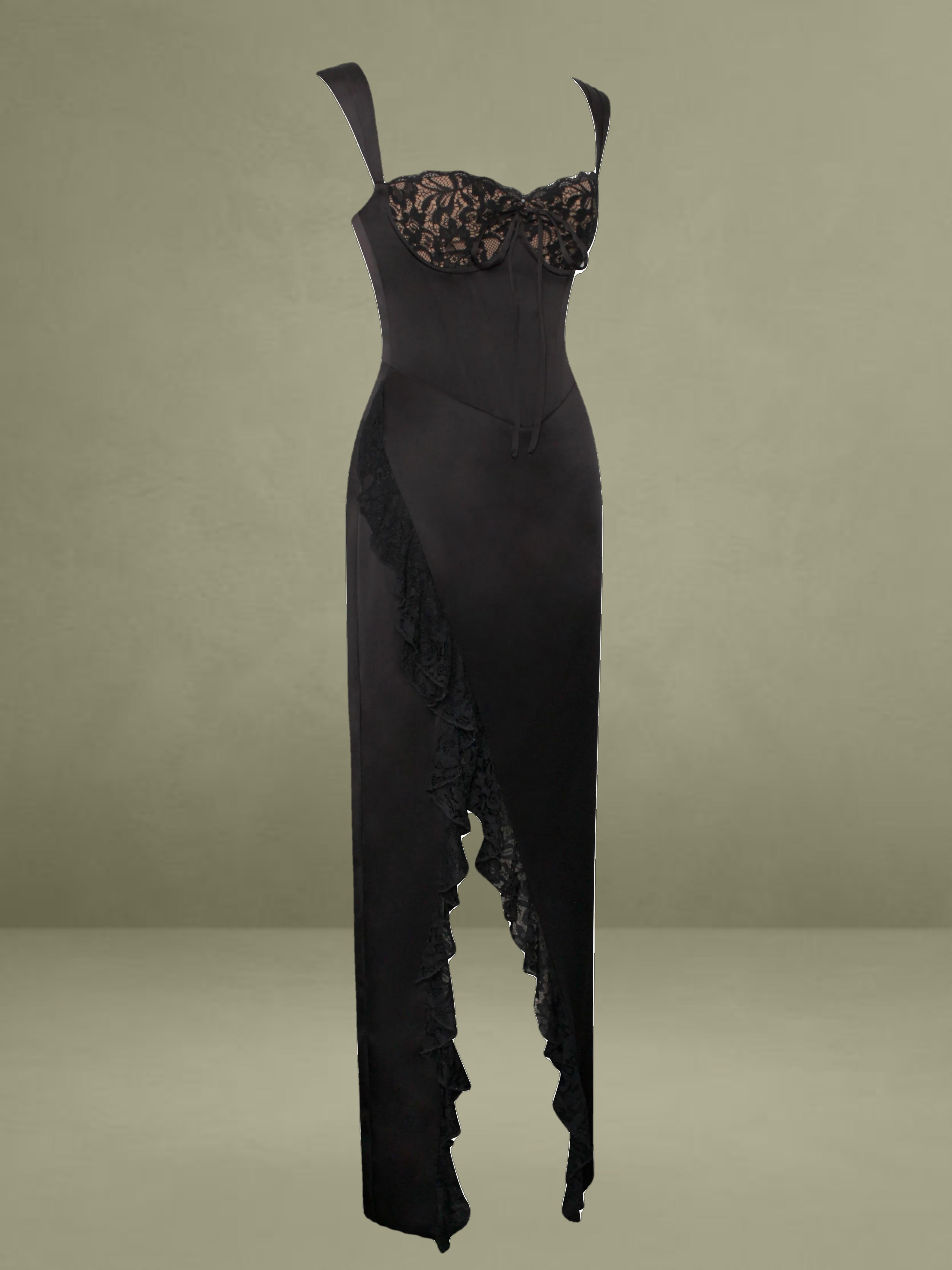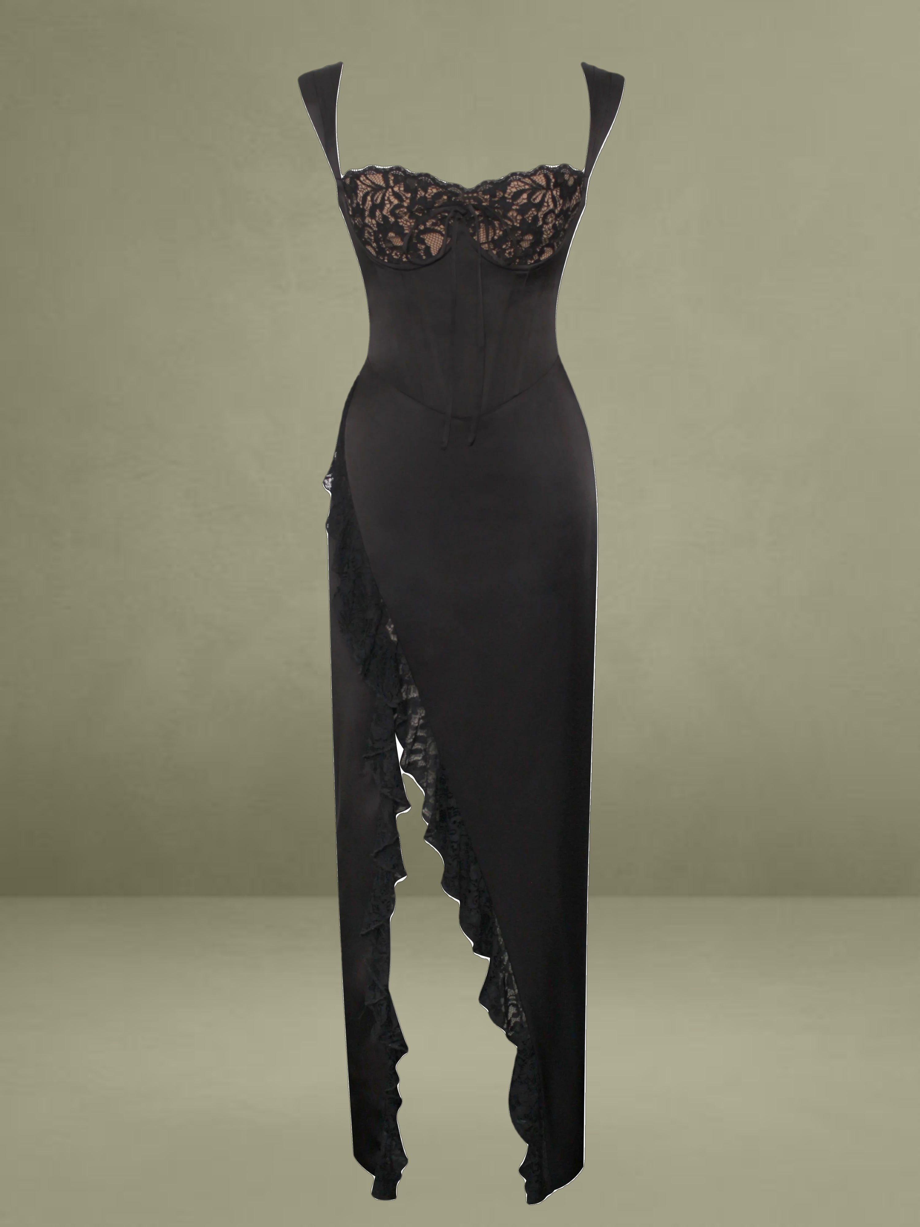 Make a statement and own the night! Featuring a classic high slit corset design, ruched straps, lace ruffle trim details, and center ribbon detail, you'll be sure to turn heads in this luxurious, show-stopping dress. Its boned corset and satin lining coupled with its monowire at the bust make for an effortlessly feminine look. Dare to conquer any special occasion! Also available in white and a teal velvet version (Odilia Teal Lace Velvet Maxi Dress).