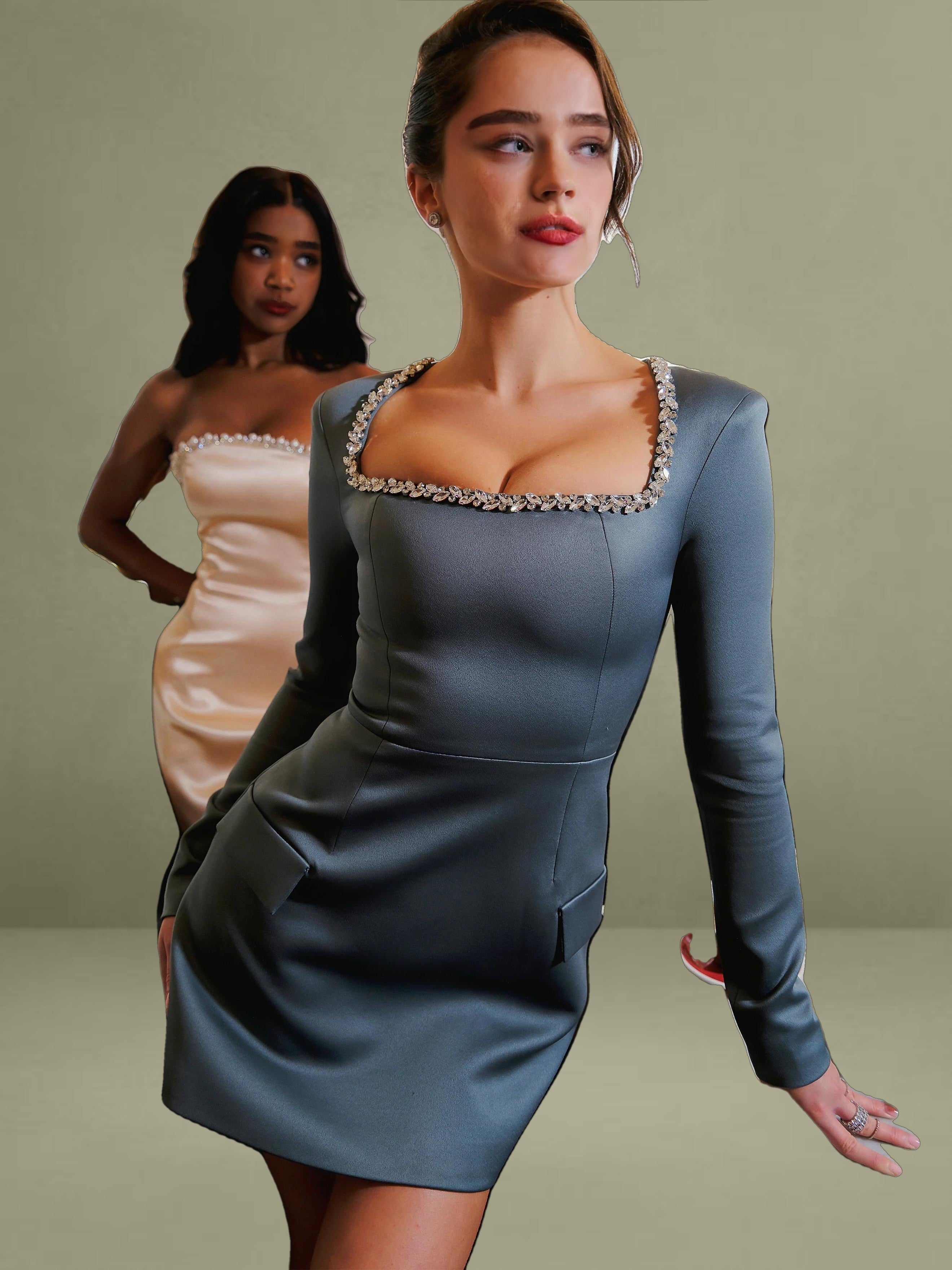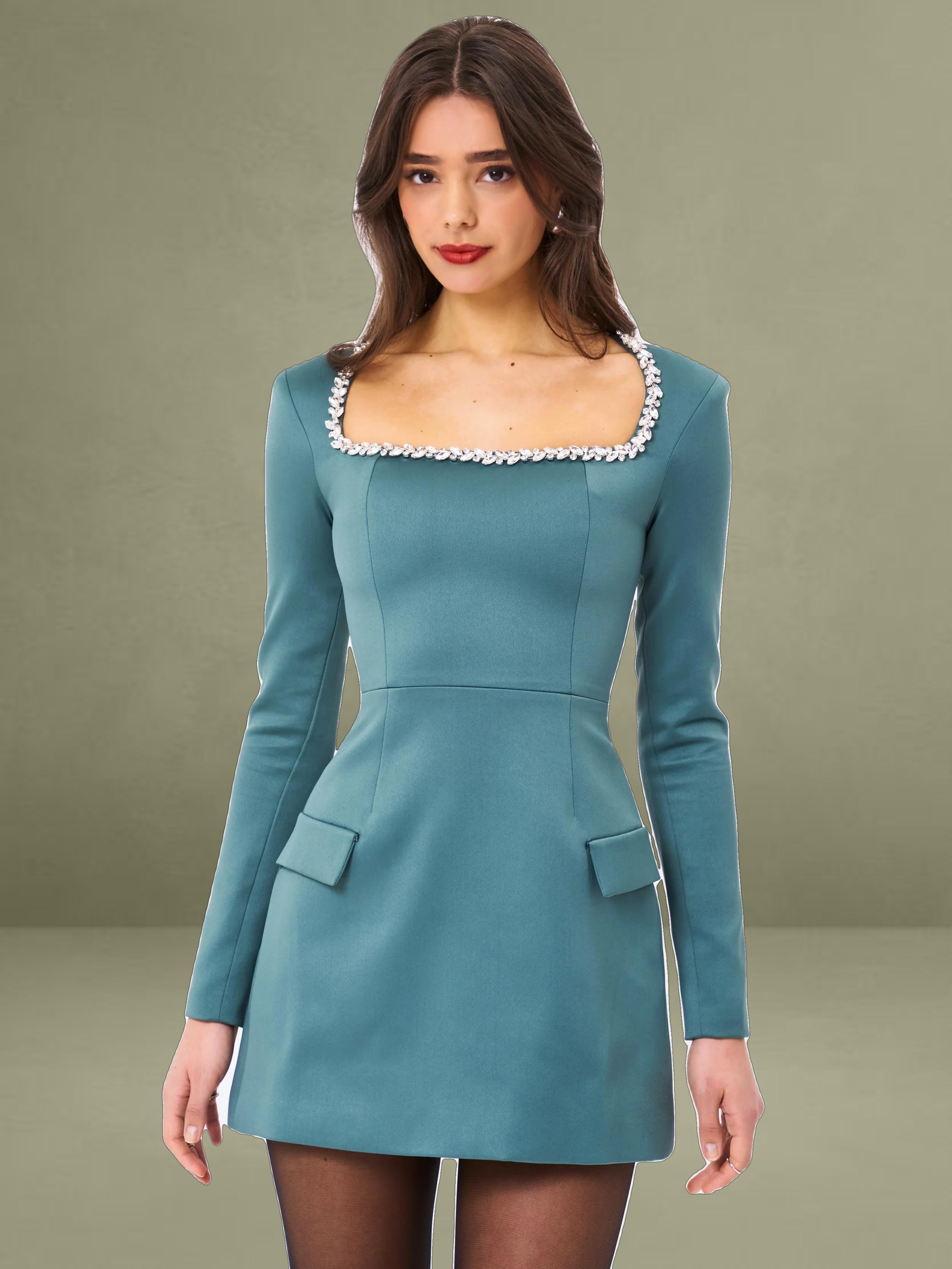 Introducing the Gabella Dress, a timeless A-line mini dress that effortlessly blends elegance and charm. Featuring sleek long sleeves and a flattering mid waist, this dress is perfect for any occasion. The striking square collar is adorned with a subtle crystal trim, adding a touch of sparkle and sophistication. Thoughtful pocket cap decorations enhance its tailored appeal, while an invisible zipper ensures a smooth, seamless finish. The Gabella Dress is a perfect choice for those who love classic style with a modern twist.