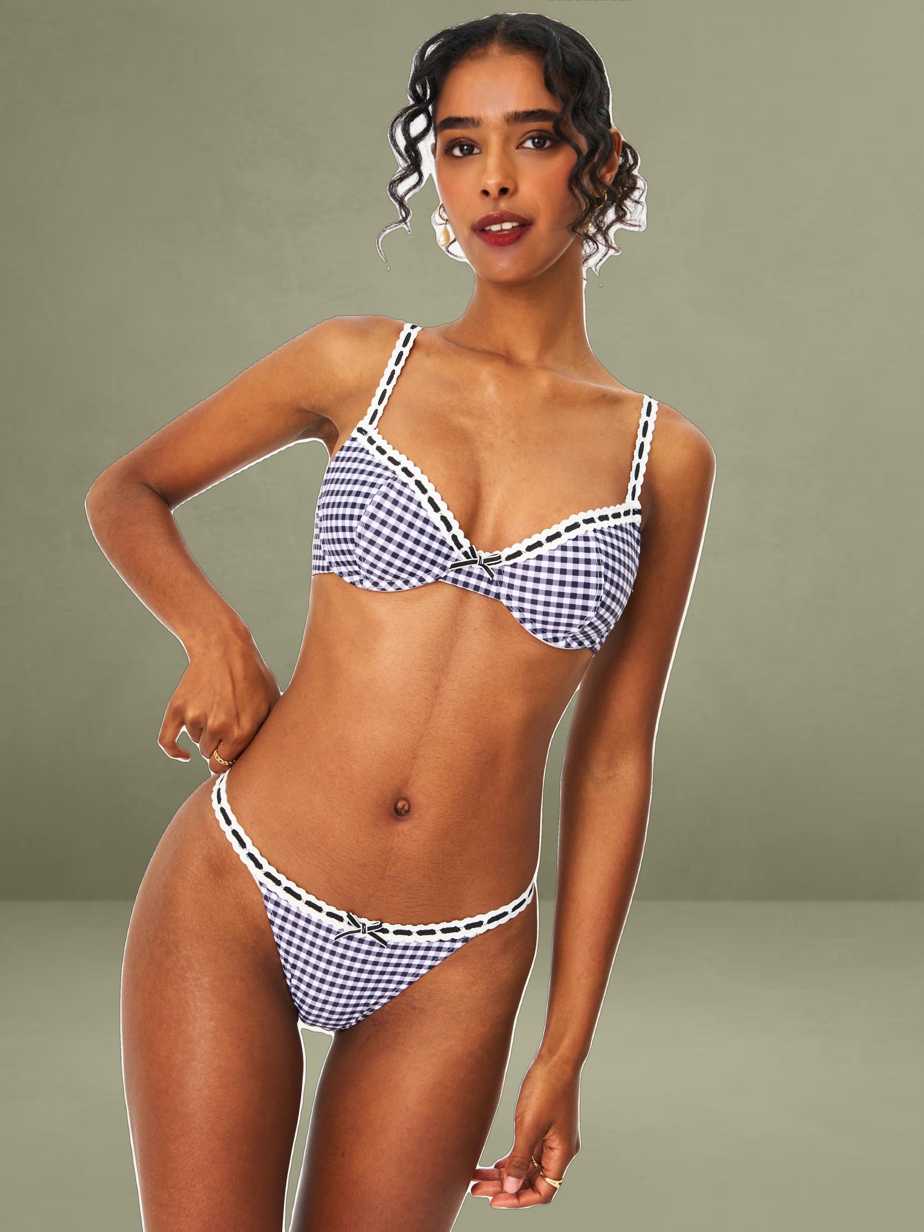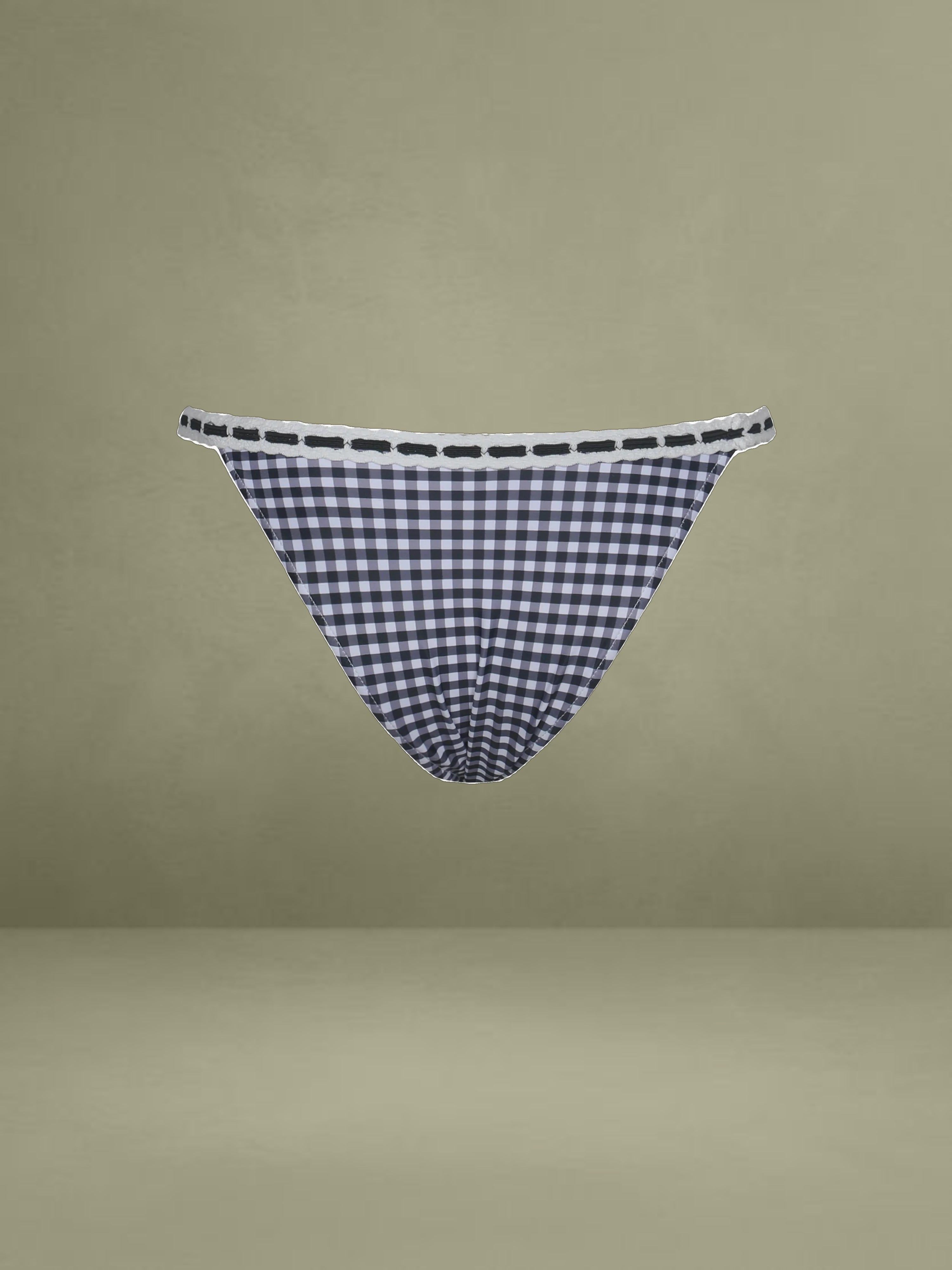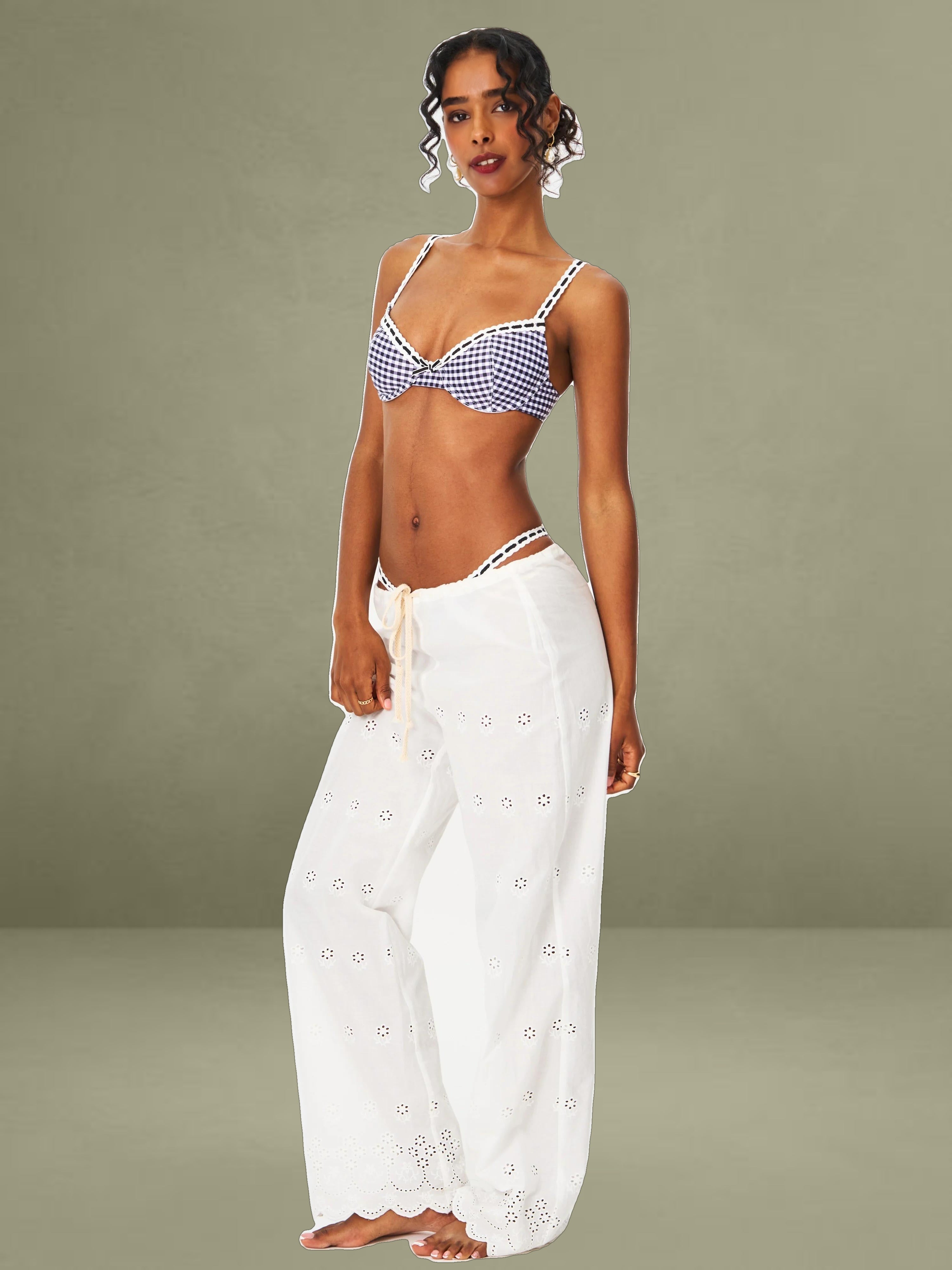 Complete your summer look with the Geneva Bikini Bottom, designed to perfectly match the Geneva Bikini Top. Featuring a timeless black gingham print and delicate lace decoration, this bottom blends sweet femininity with effortless style. Fully lined for a smooth, comfortable fit, it’s the ideal piece for summer escapes, beach days, or poolside lounging. Chic and versatile, it pairs seamlessly with the matching top for a coordinated, vintage-inspired vacation look. It could also be styled with the Raina White Cotton Eyelet Straight Pants.