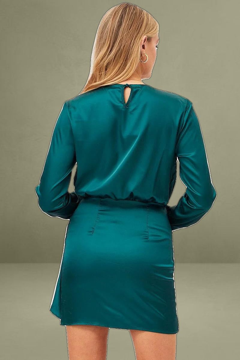 Features: Satin fabric, waist tie, long sleeves, mini length