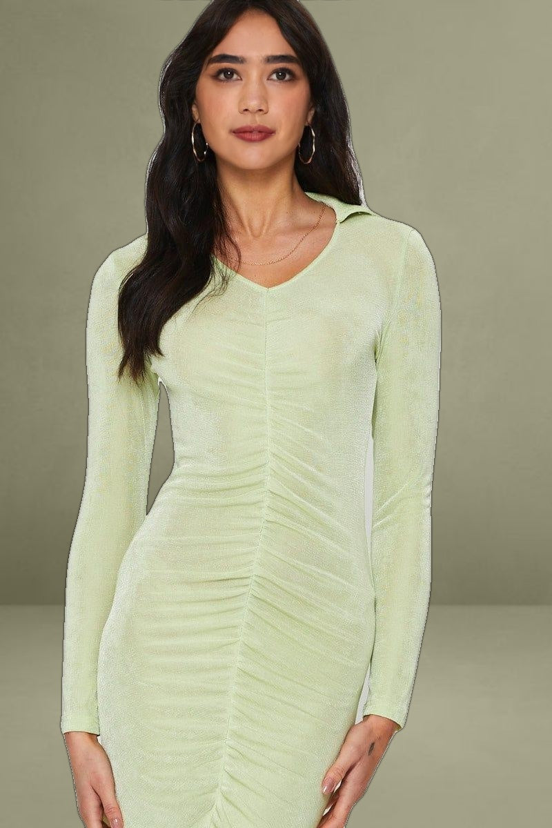 Features: Collared Neckline, Ruched Front, Long Sleeves, Stretch Material