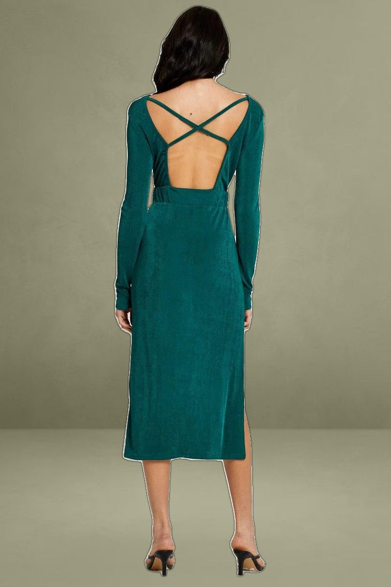 Features: Exposed Strap Detail Back, Bodycon, Side Split, Slinky Material