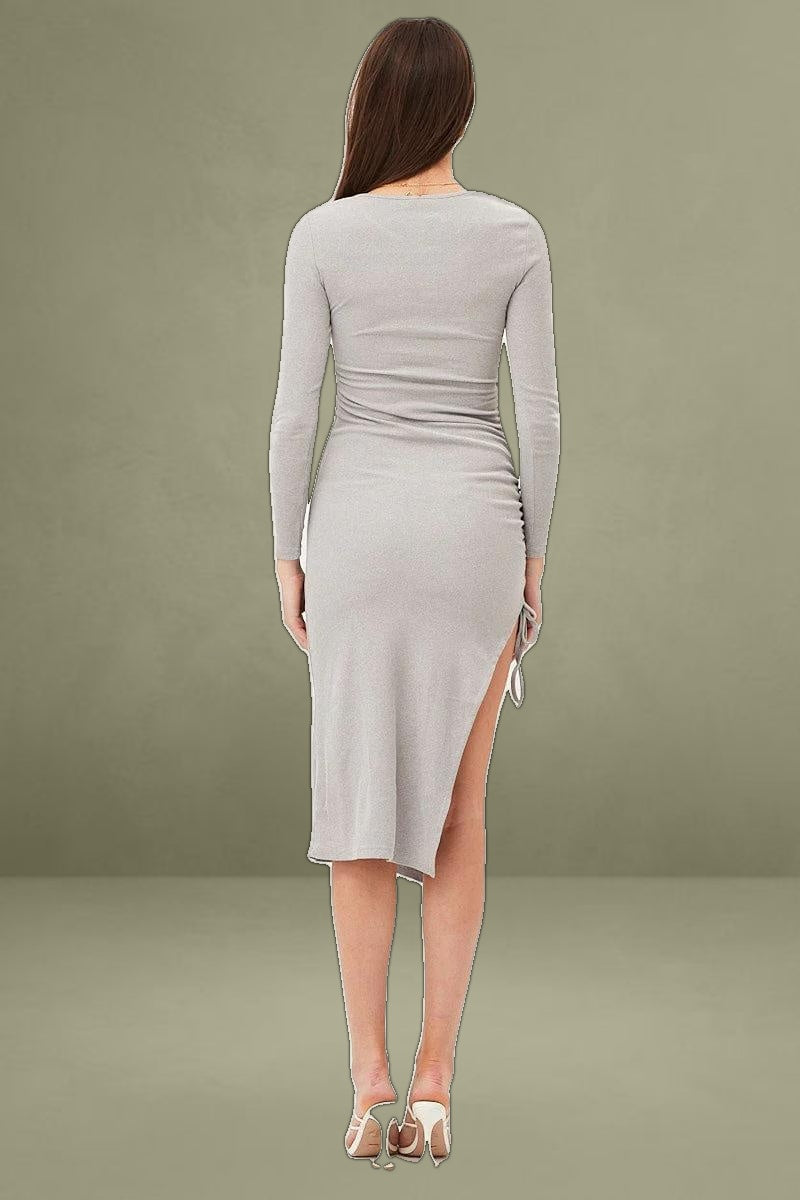 Features: Ruched Side, Midi Length, Long Sleeves, Round Neckline
