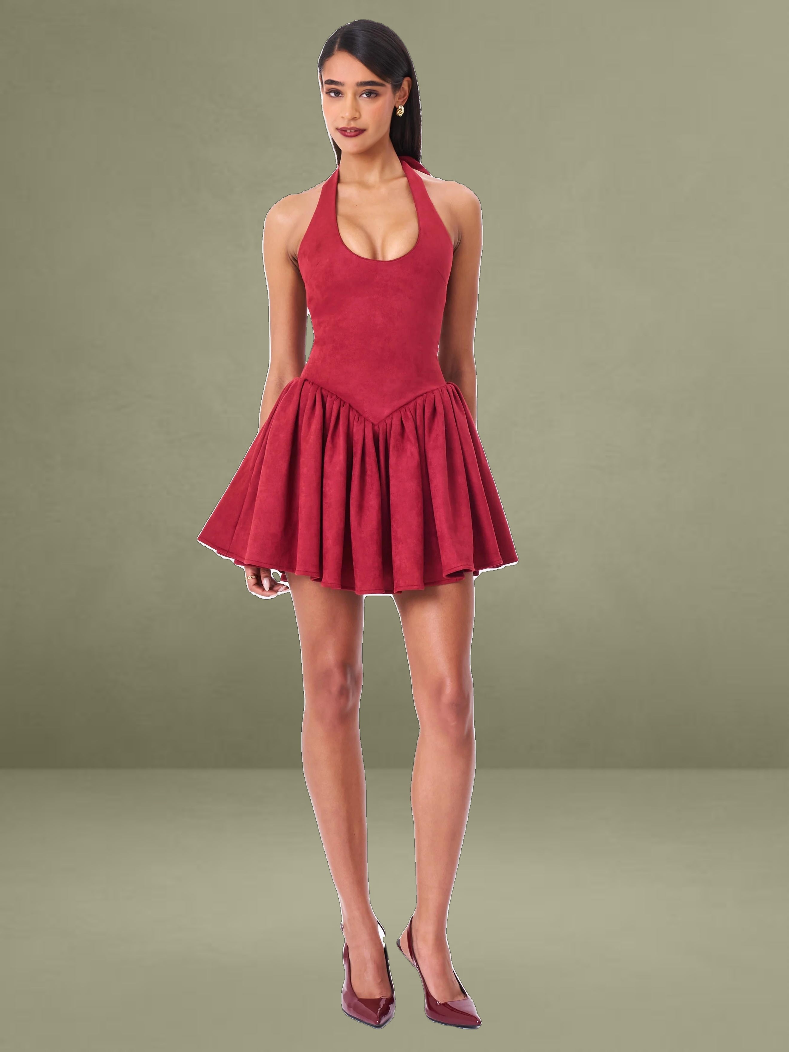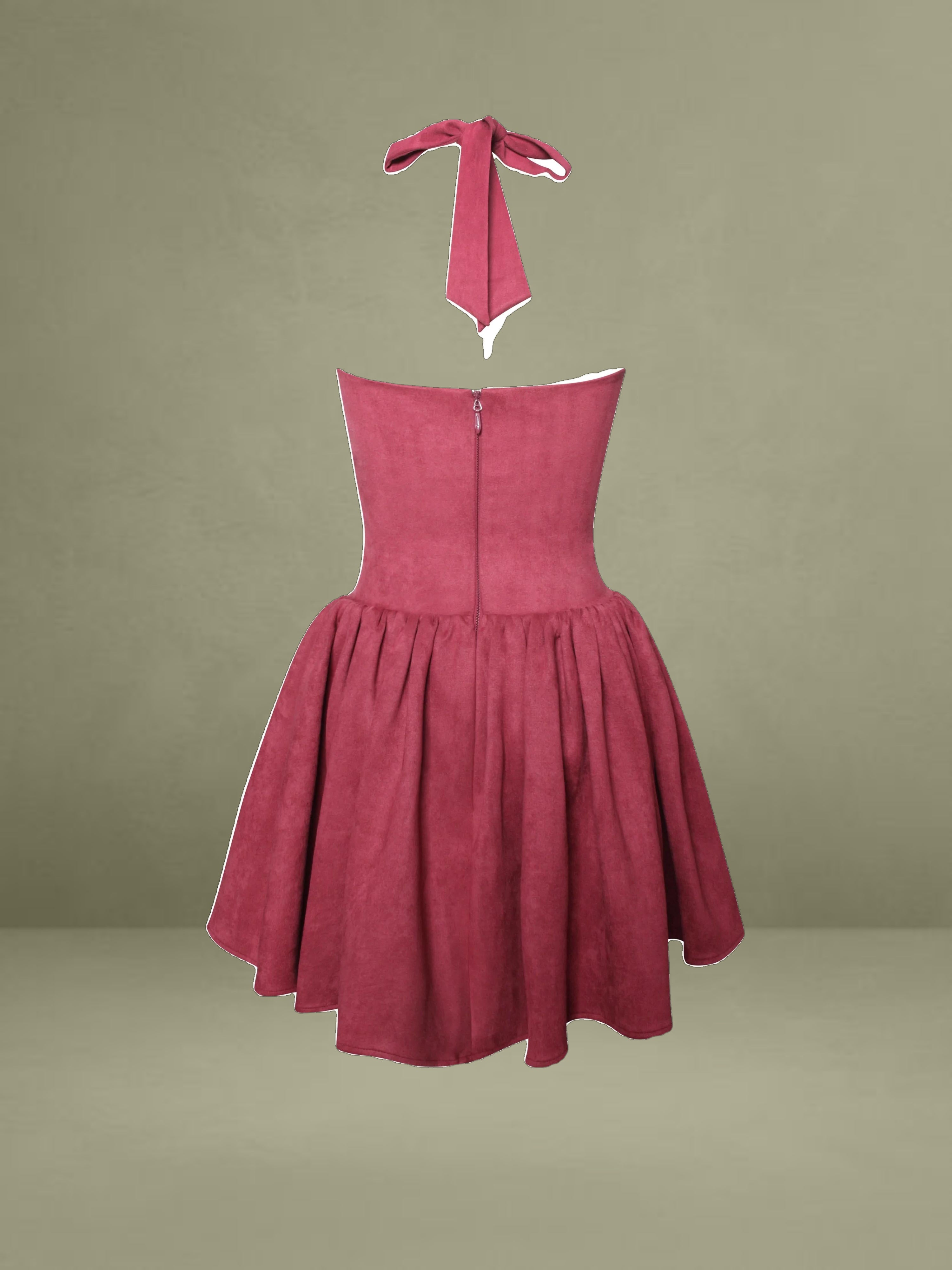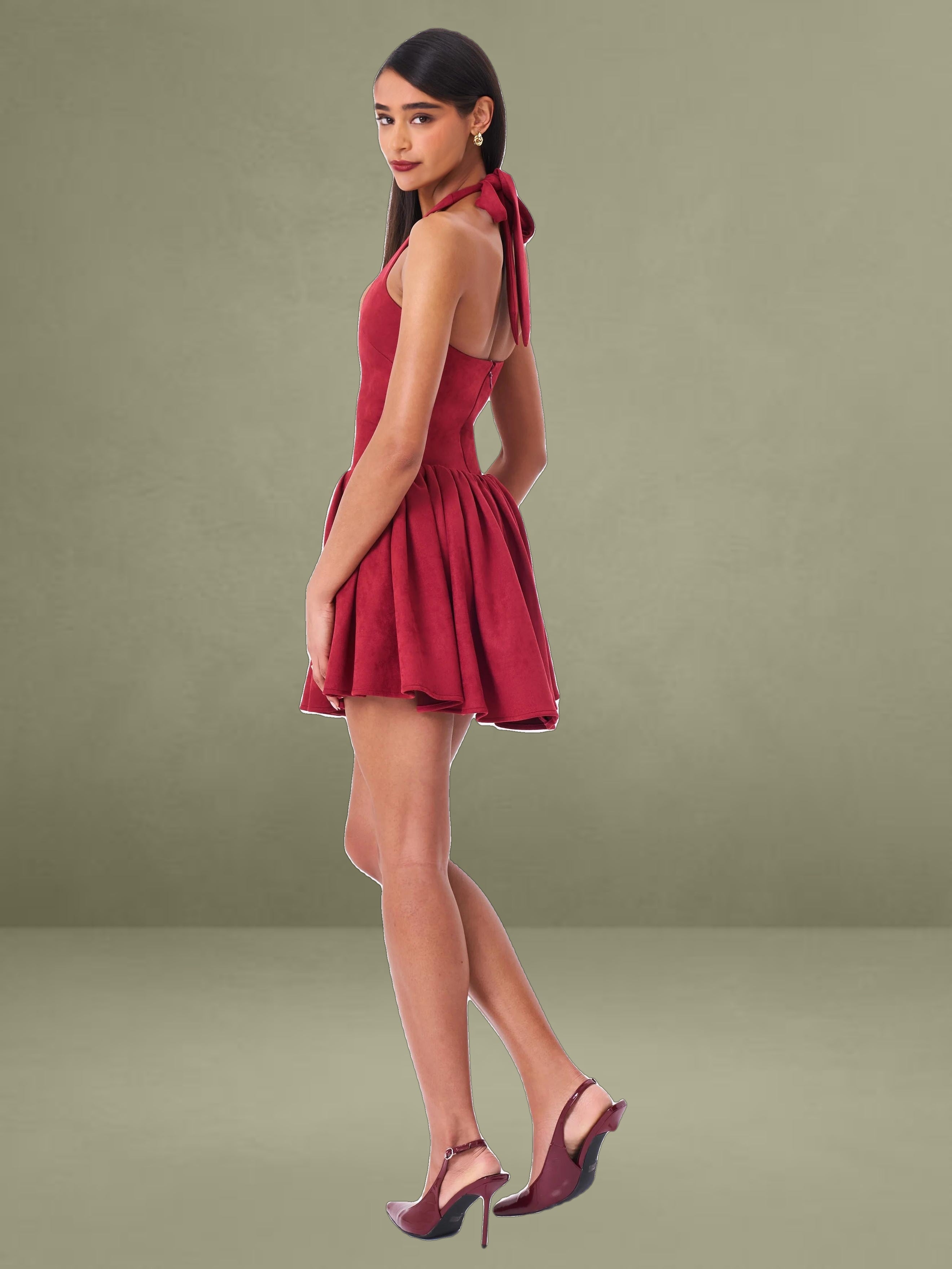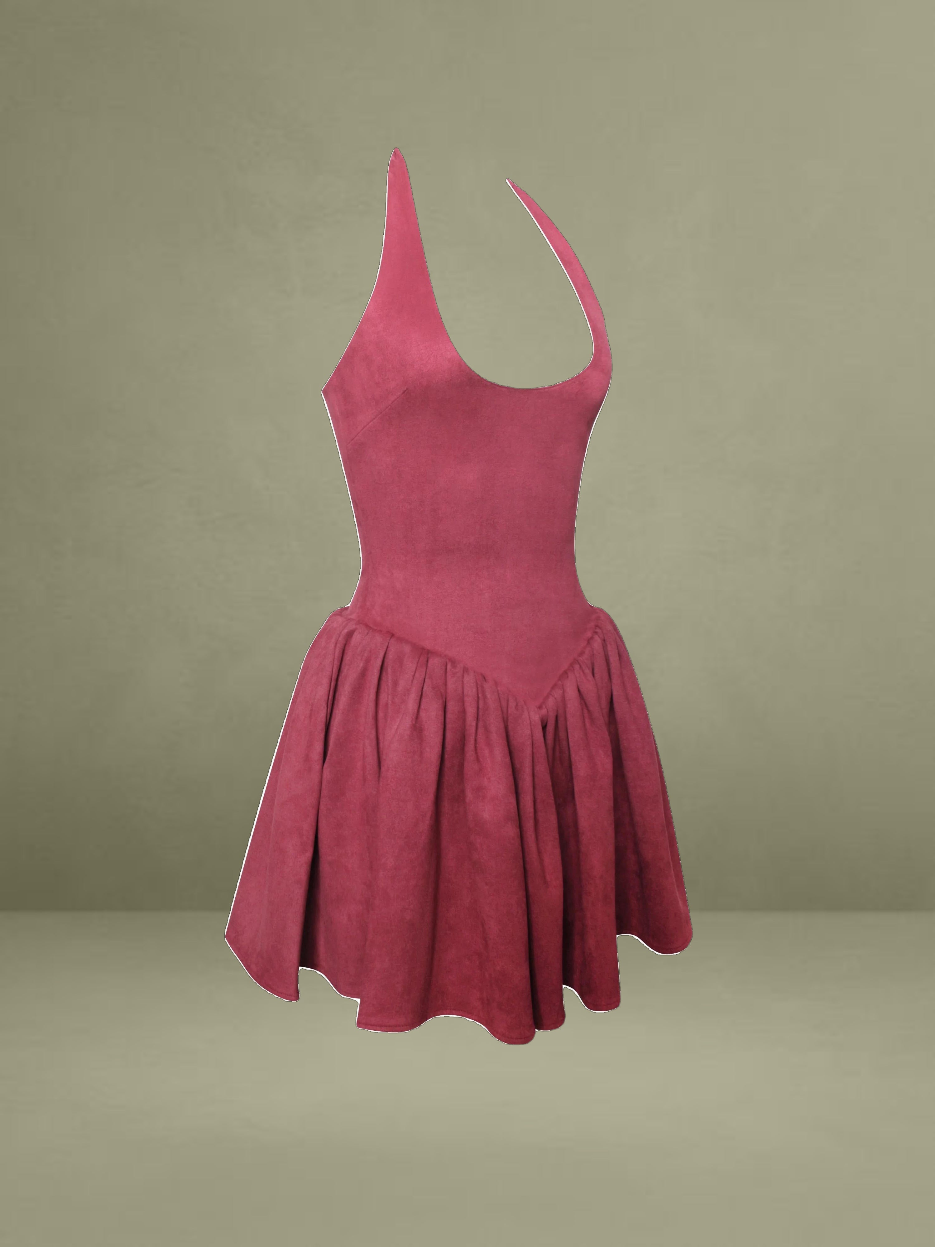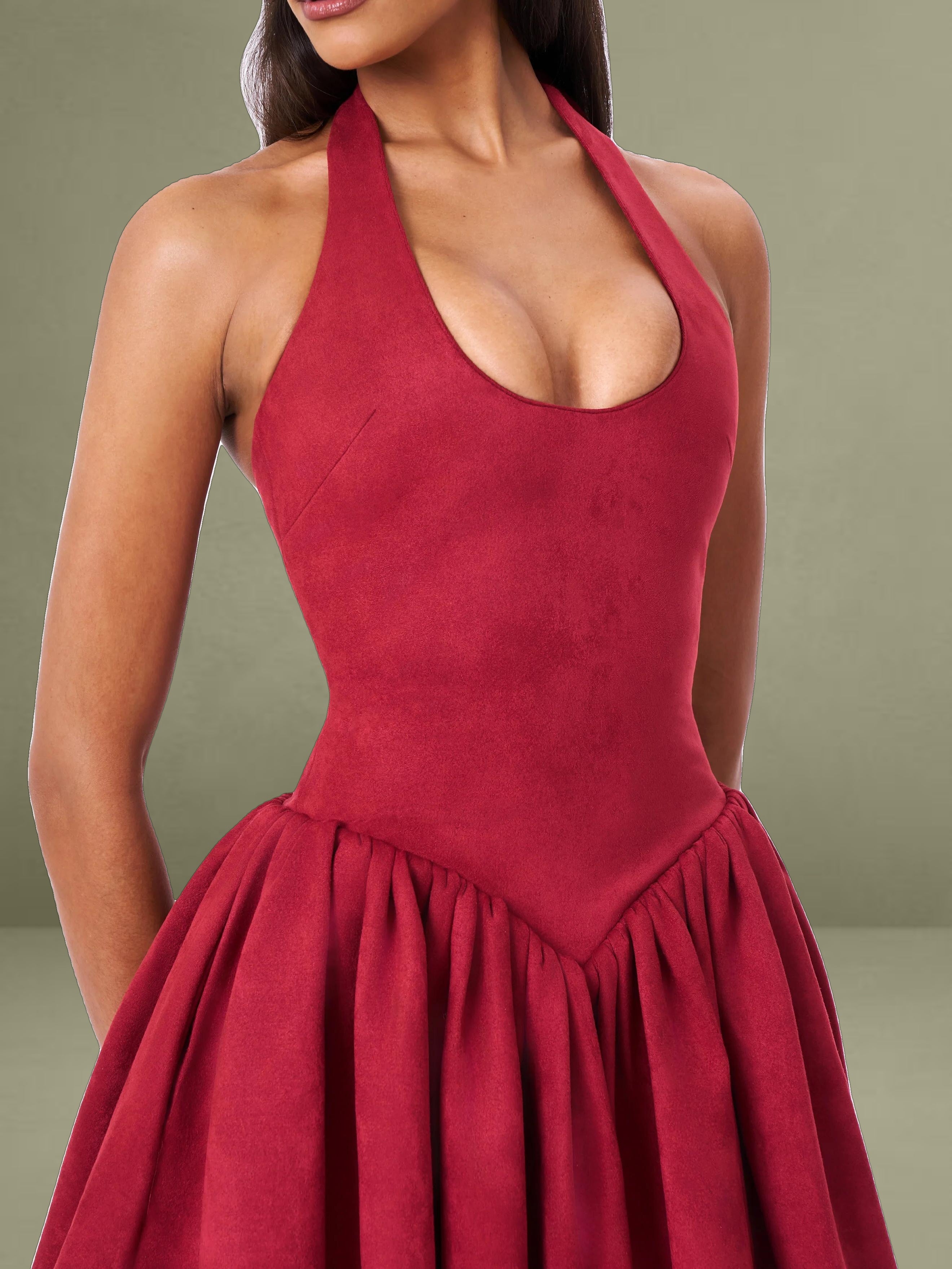 Radiate timeless elegance with the Hadara Dress, crafted from luxurious burgundy vegan suede. This stunning design features a unique U-shape halter collar with delicate trimmed edges that highlight its refined craftsmanship. The V-shape waistline enhances your silhouette, flowing into a full skirt with inside tulle support for added volume and flair. Practical pockets add functionality without compromising style, while the invisible zipper ensures a seamless fit. Fully lined for comfort, the Hadara Dress is a sophisticated choice for any occasion where you want to leave a lasting impression.