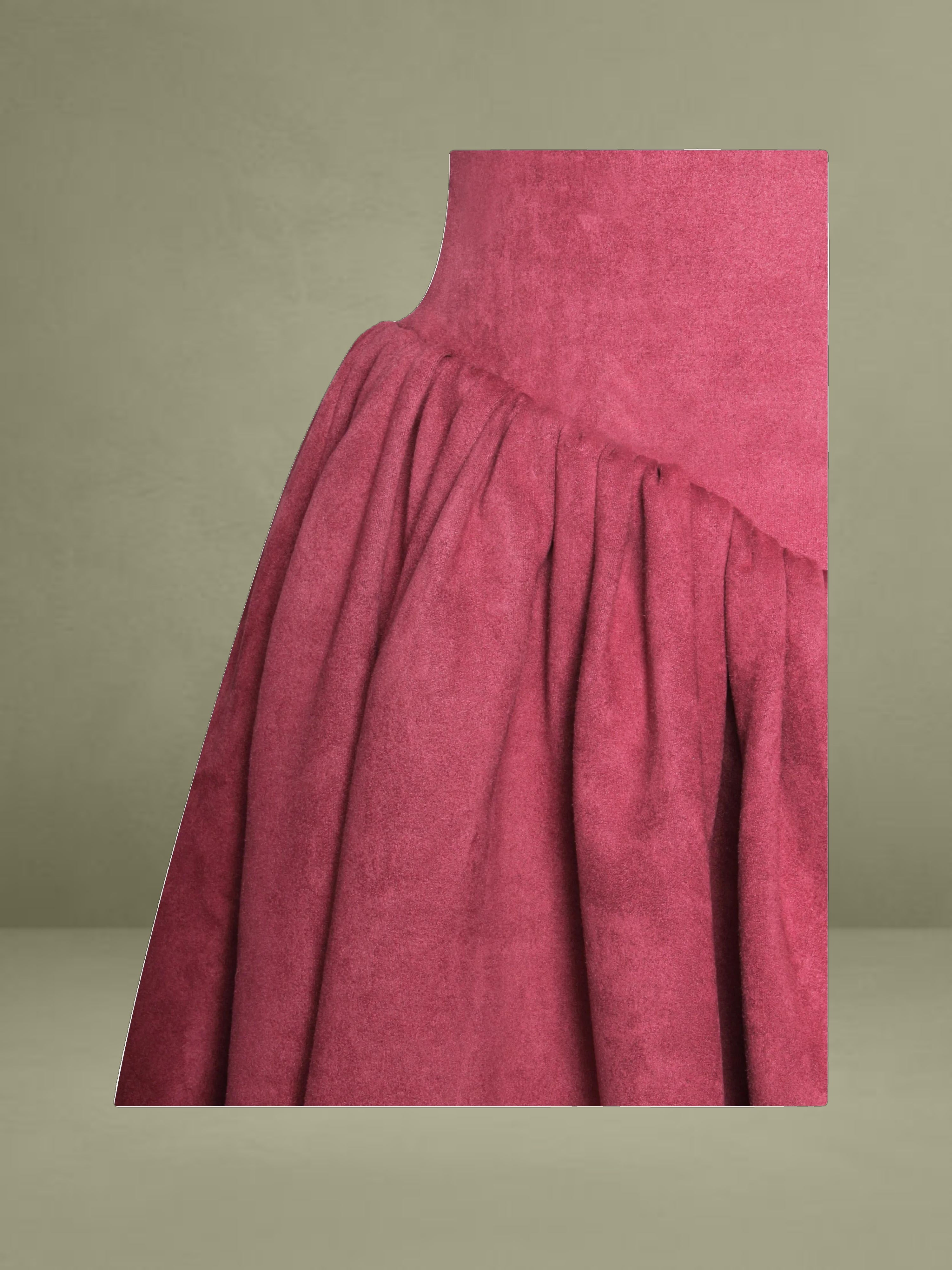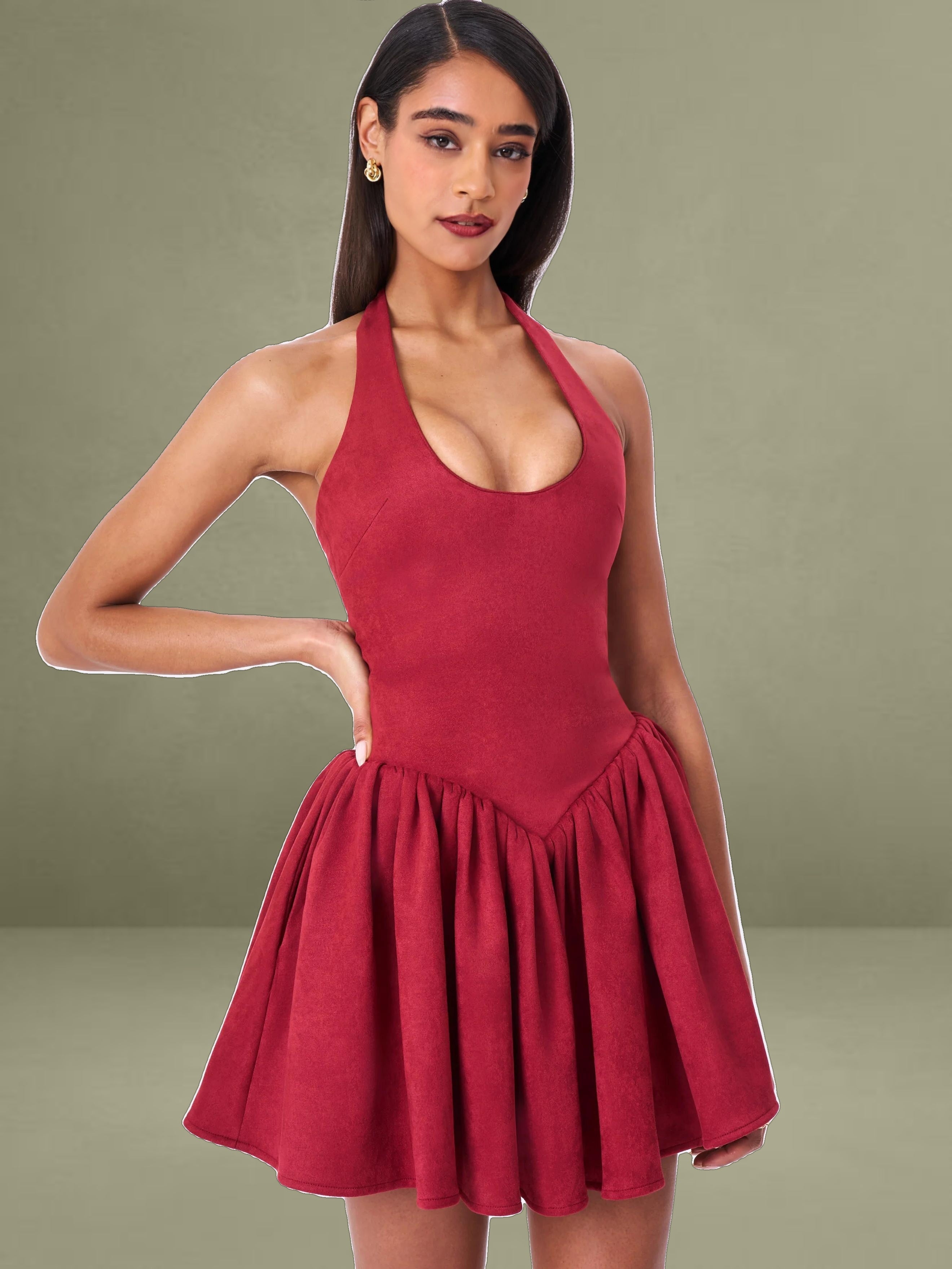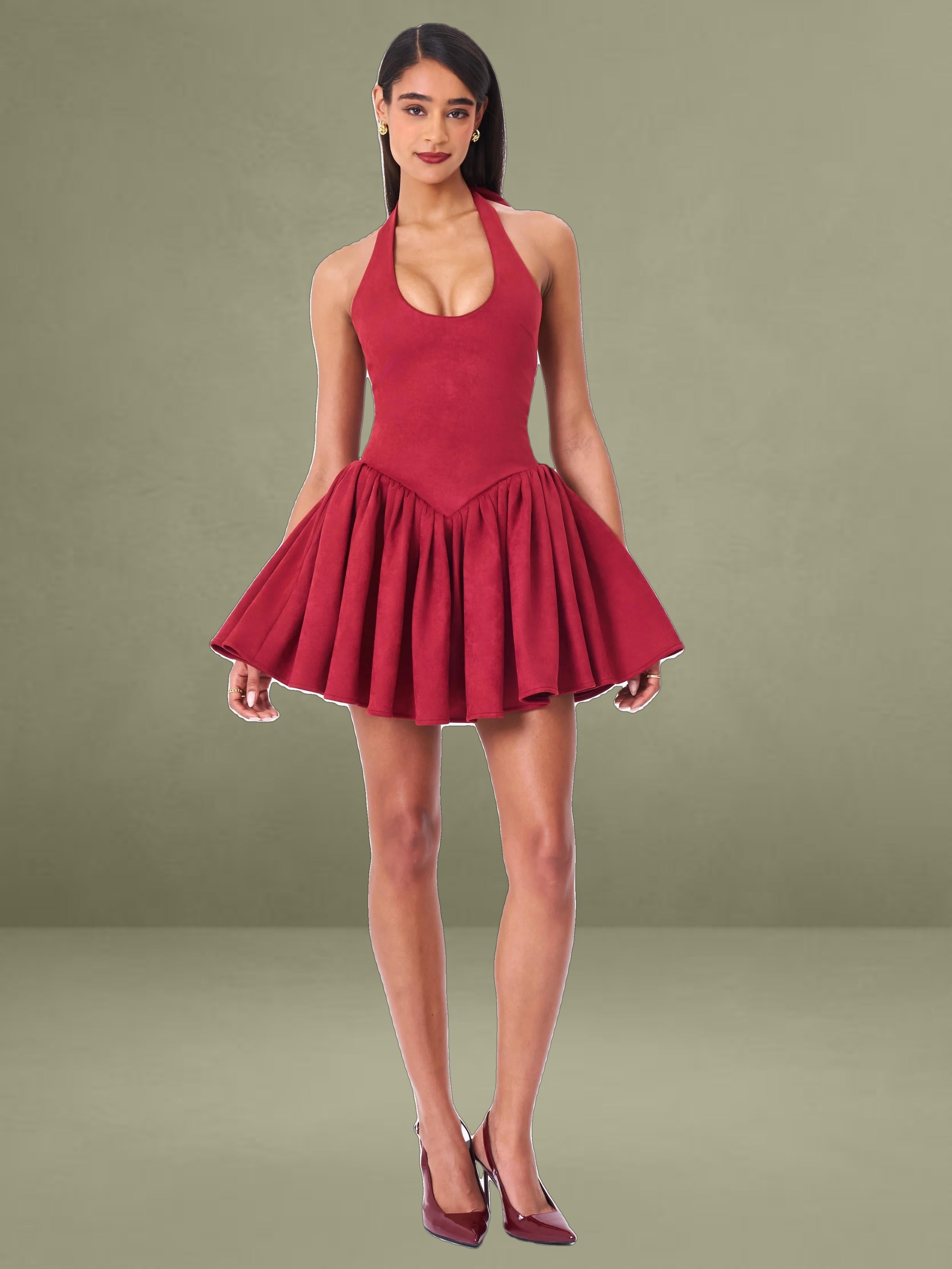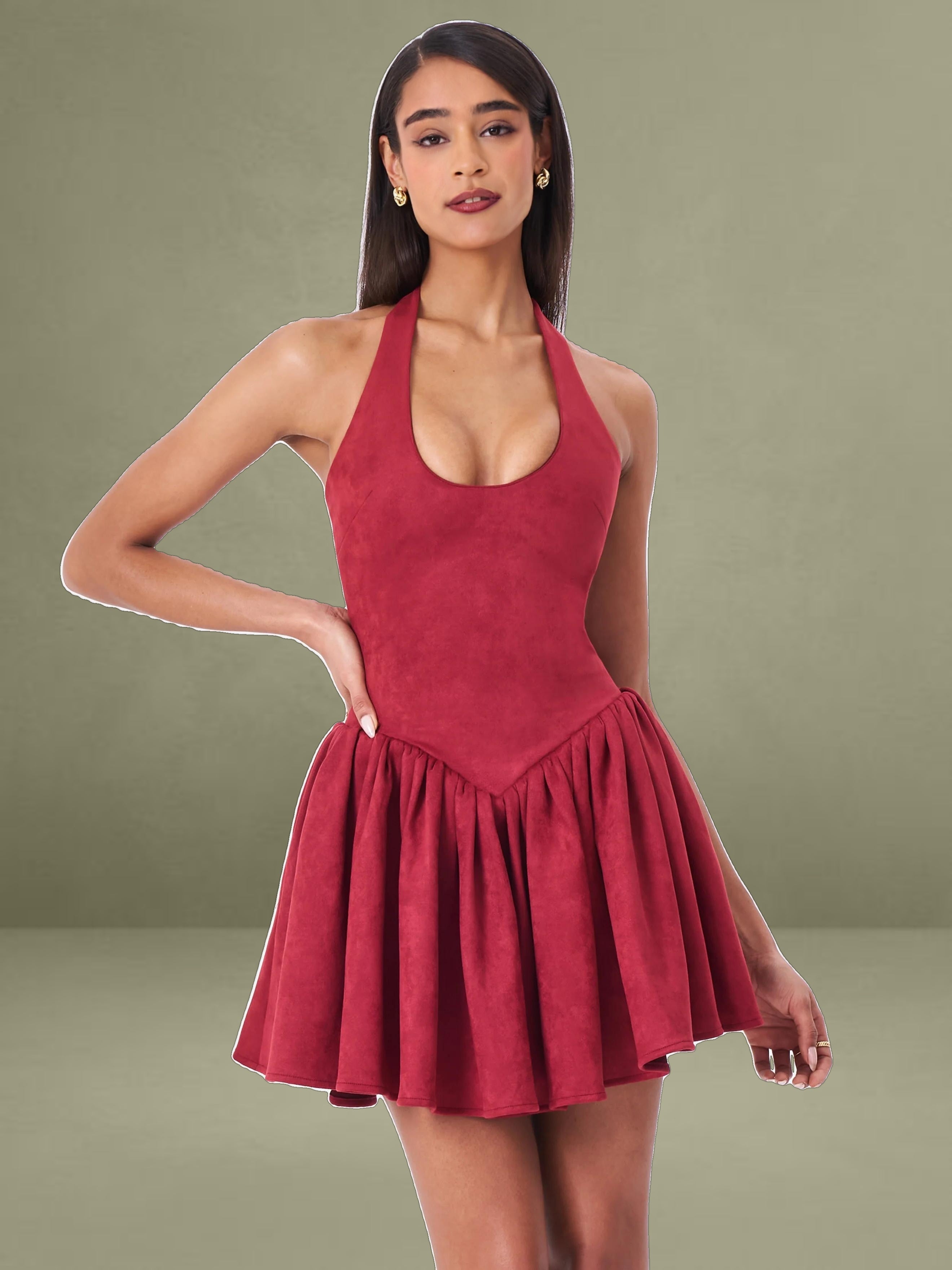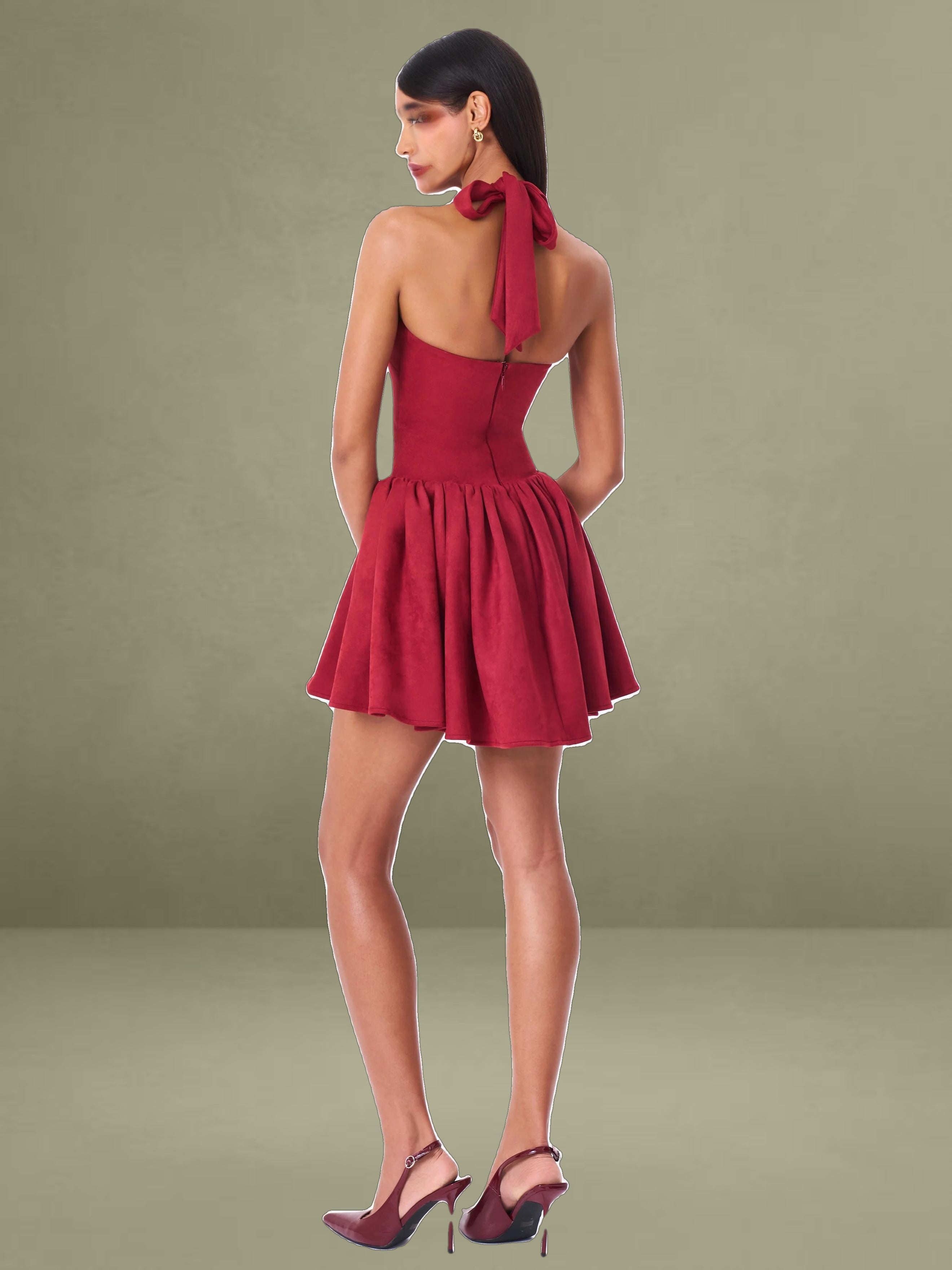 Radiate timeless elegance with the Hadara Dress, crafted from luxurious burgundy vegan suede. This stunning design features a unique U-shape halter collar with delicate trimmed edges that highlight its refined craftsmanship. The V-shape waistline enhances your silhouette, flowing into a full skirt with inside tulle support for added volume and flair. Practical pockets add functionality without compromising style, while the invisible zipper ensures a seamless fit. Fully lined for comfort, the Hadara Dress is a sophisticated choice for any occasion where you want to leave a lasting impression.