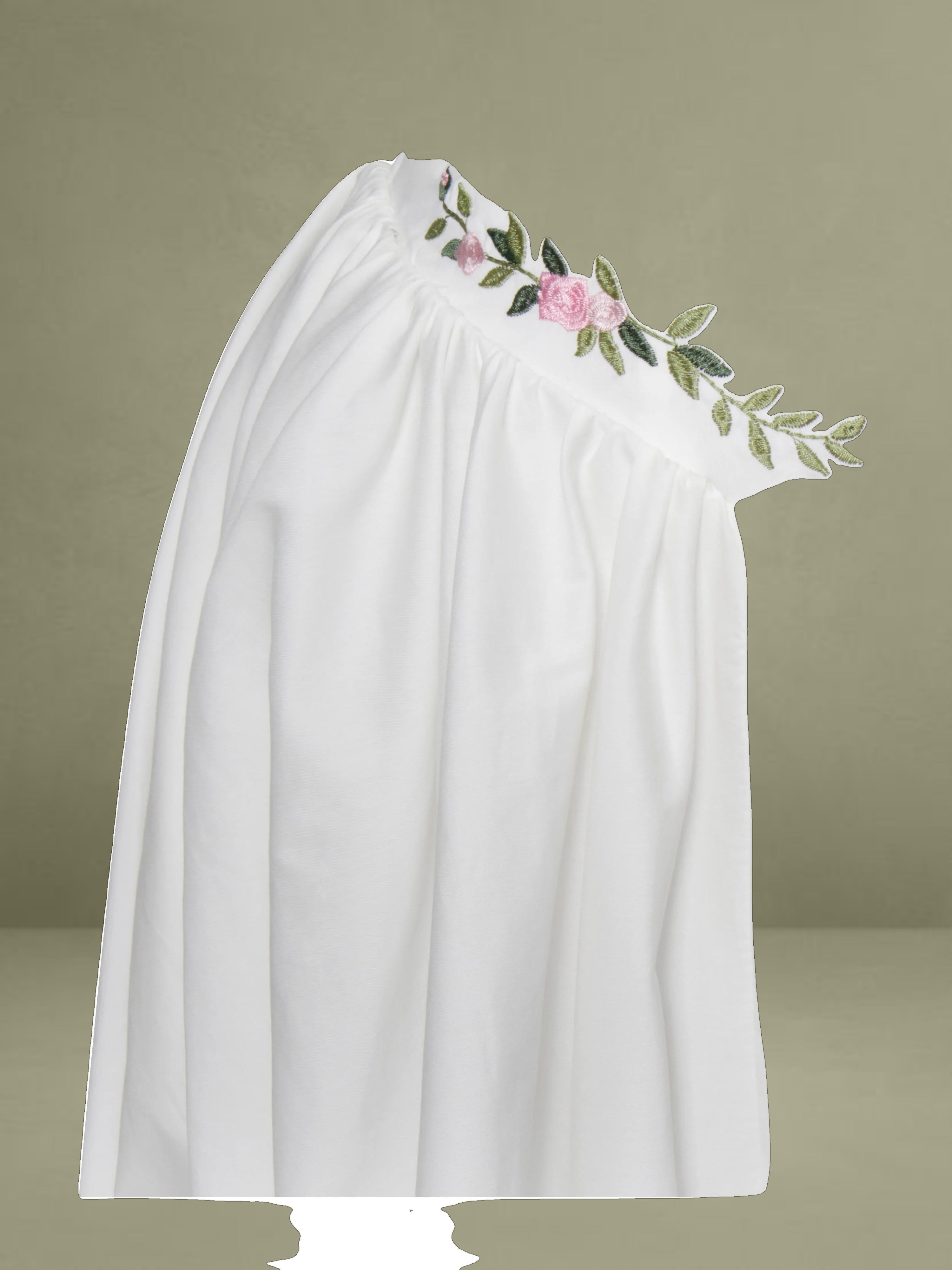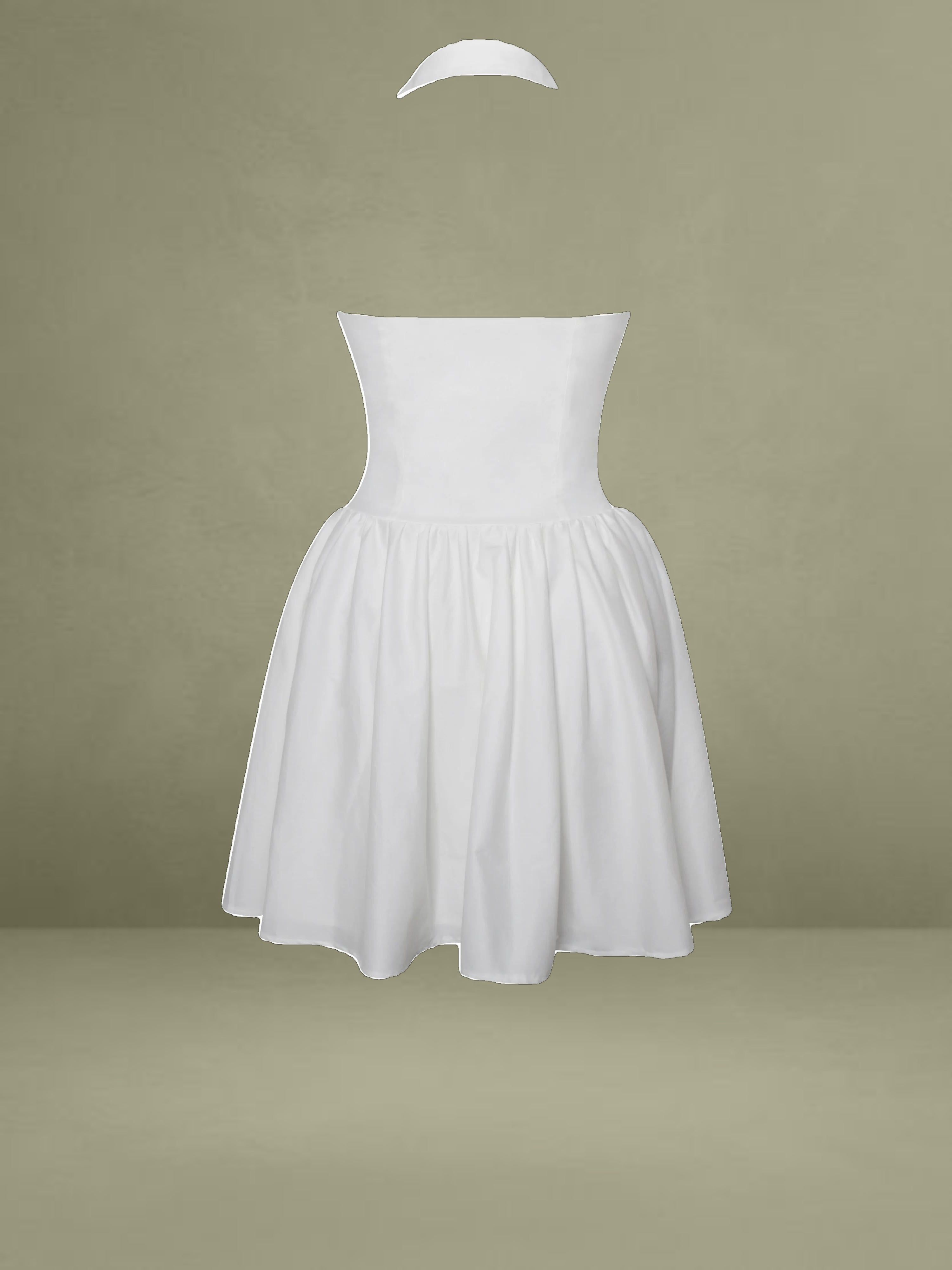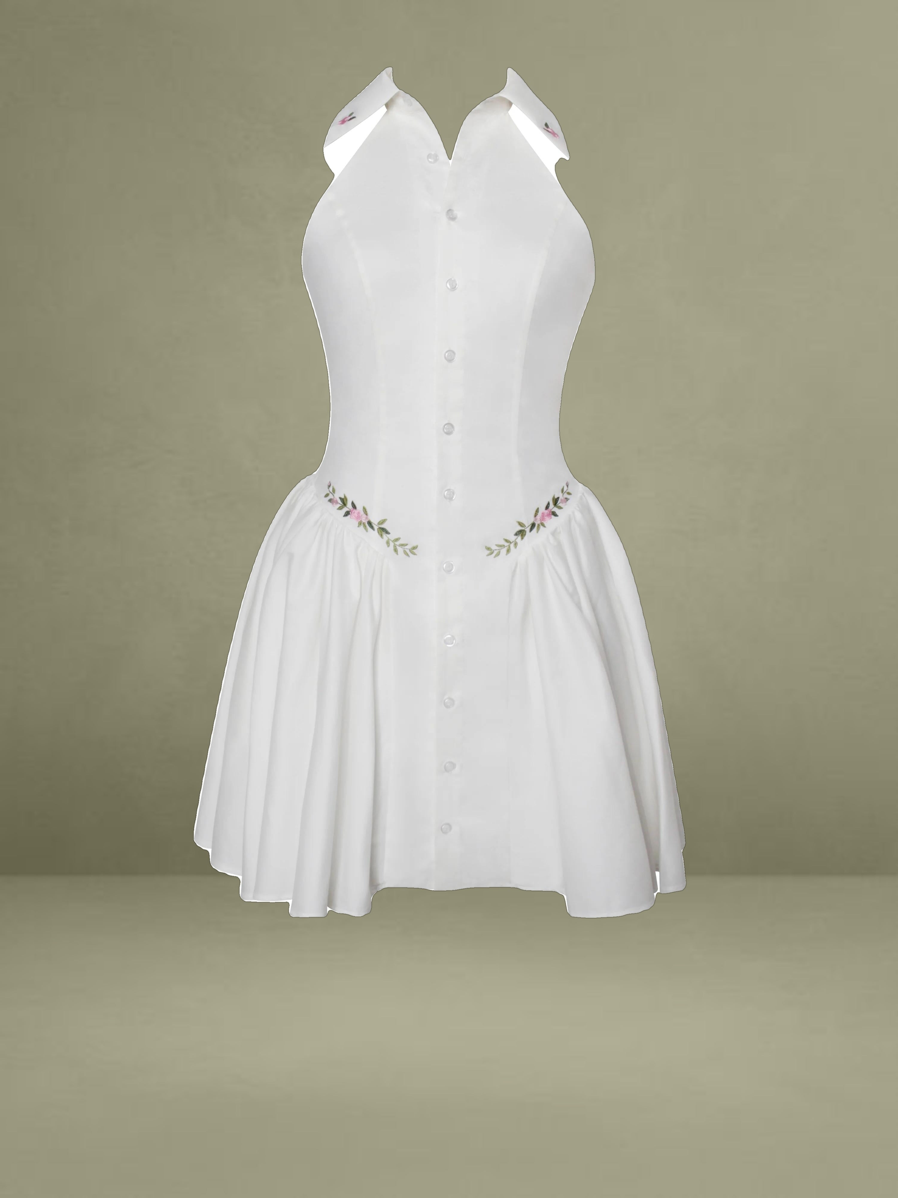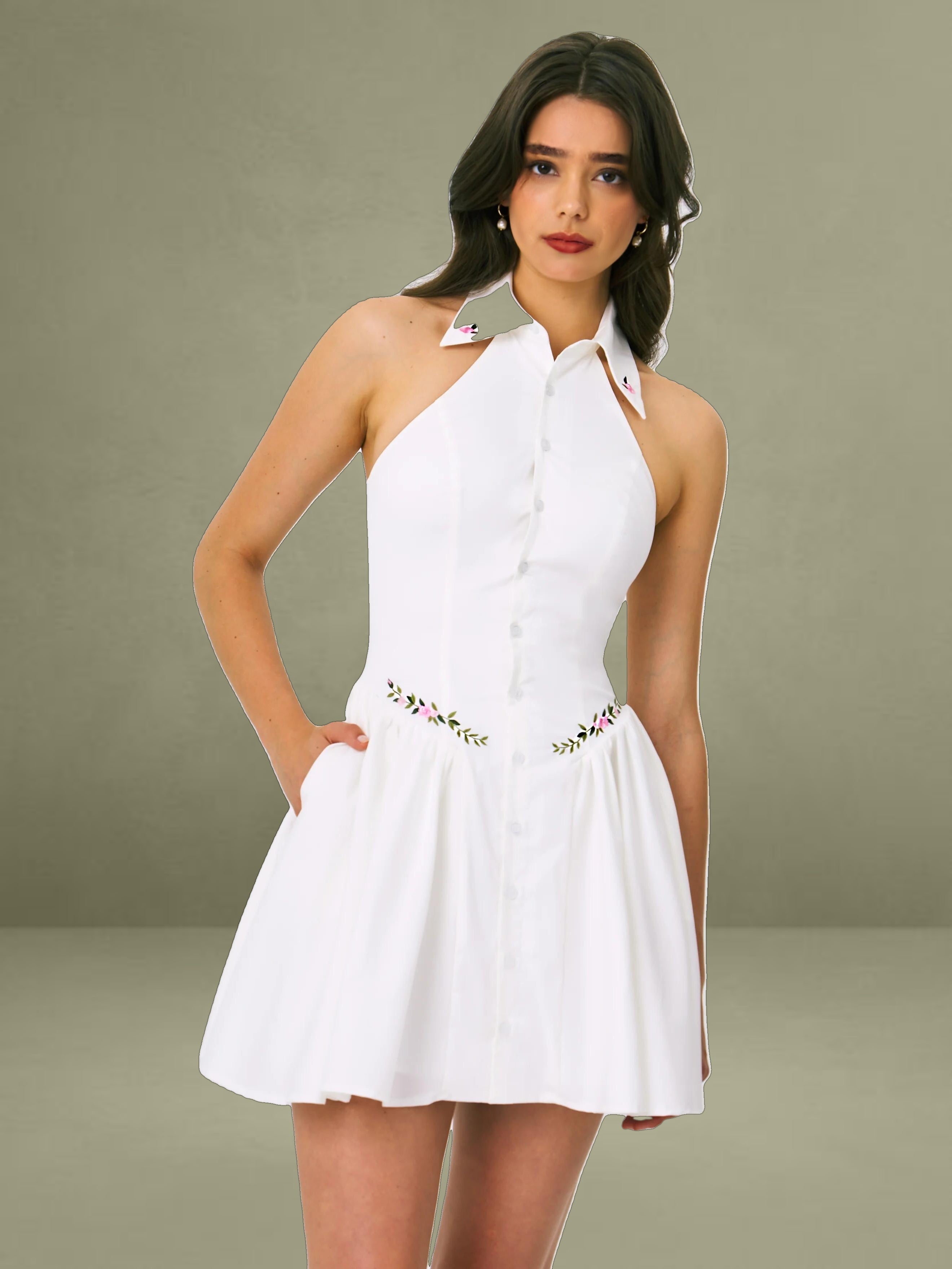 Introducing our chic eco-luxe Hailey mini dress, an embodiment of elegance and style. This dress features embroidered flowers on the collar and around the waist line, while the pleated skirt offers playful movement. Designed with a unique collared halter and a button-up front, this mini dress seamlessly blends classic and contemporary elements. Perfect for any special occasion, this dress ensures you stand out with its distinctive charm.