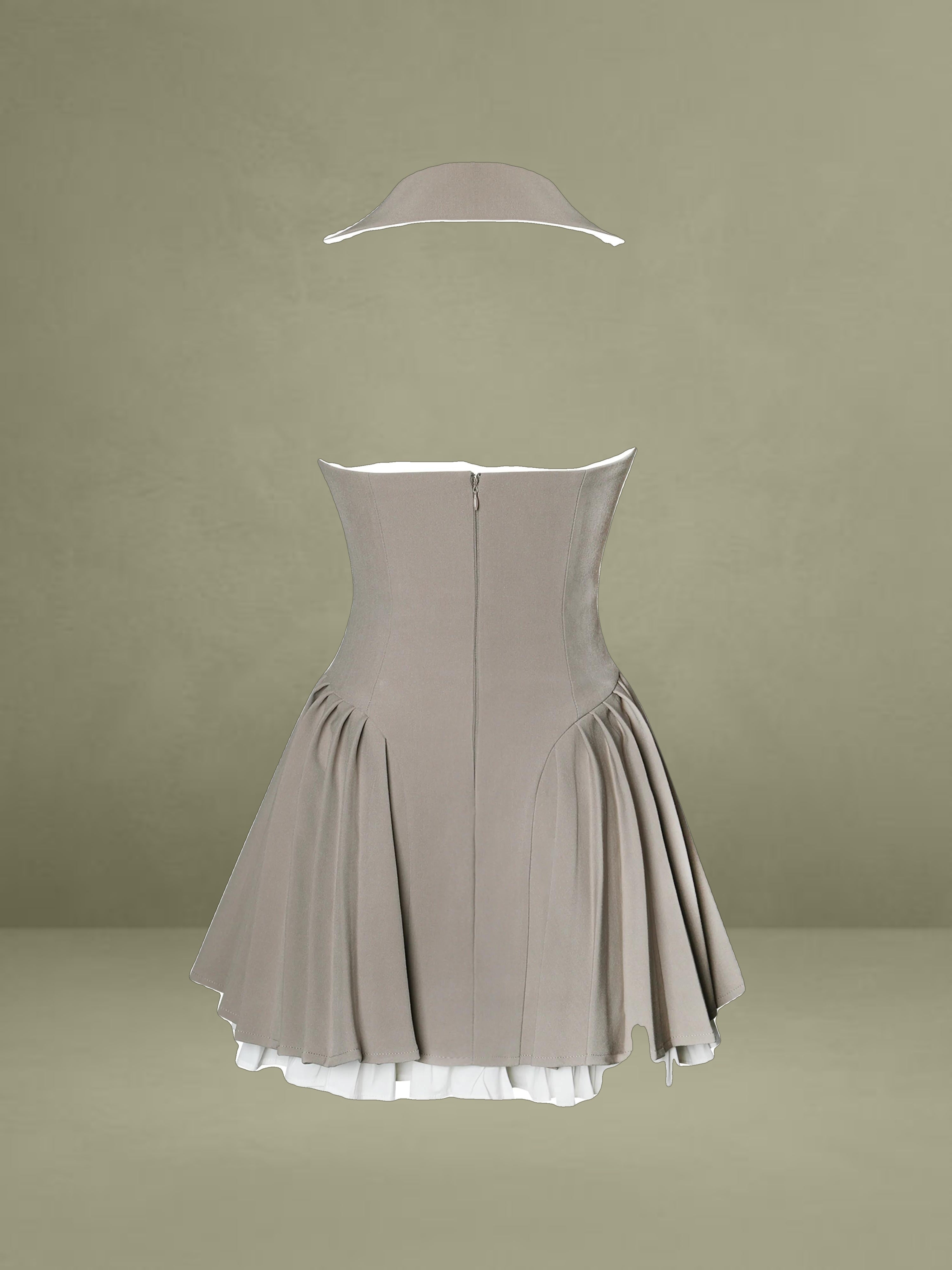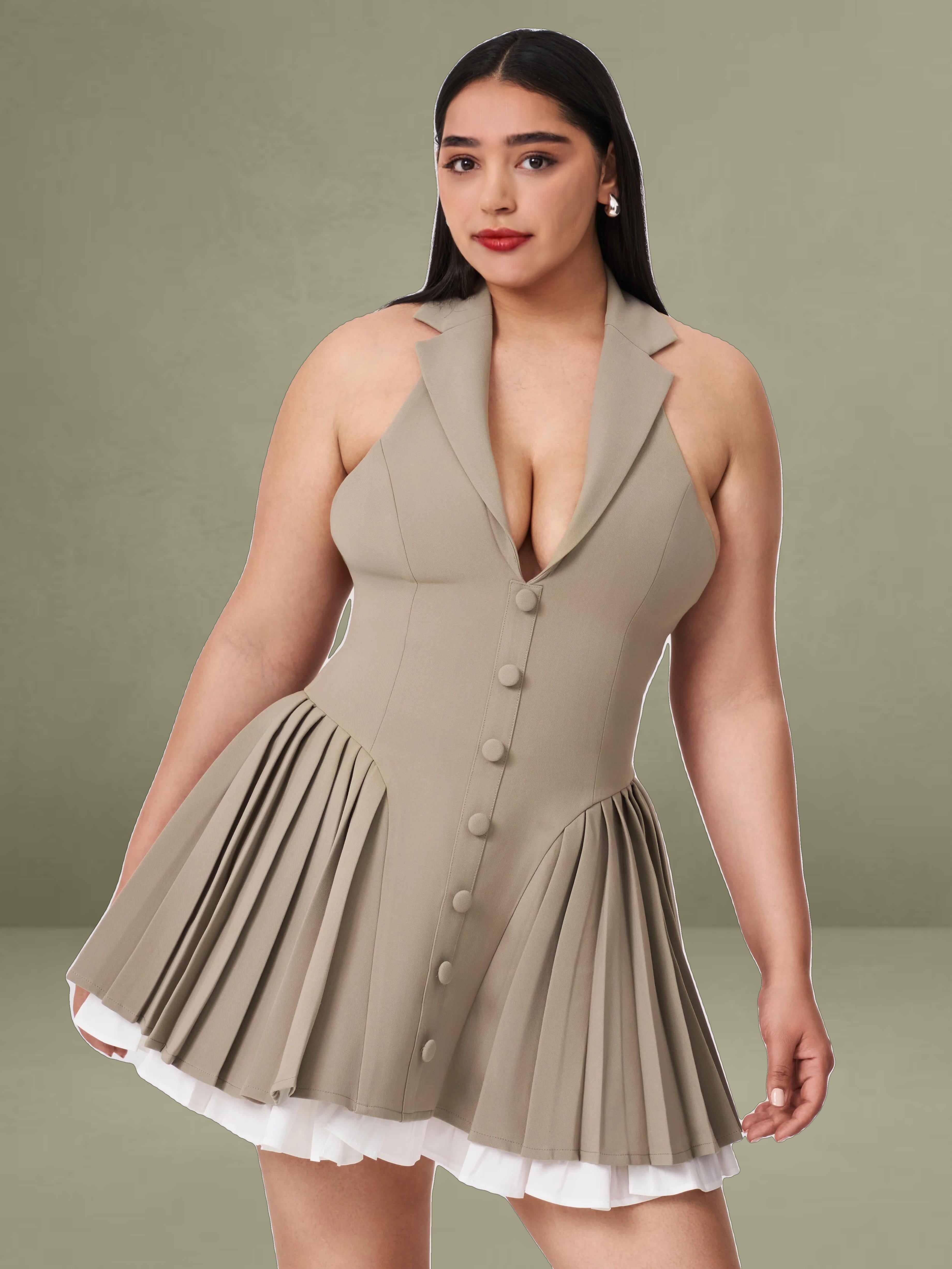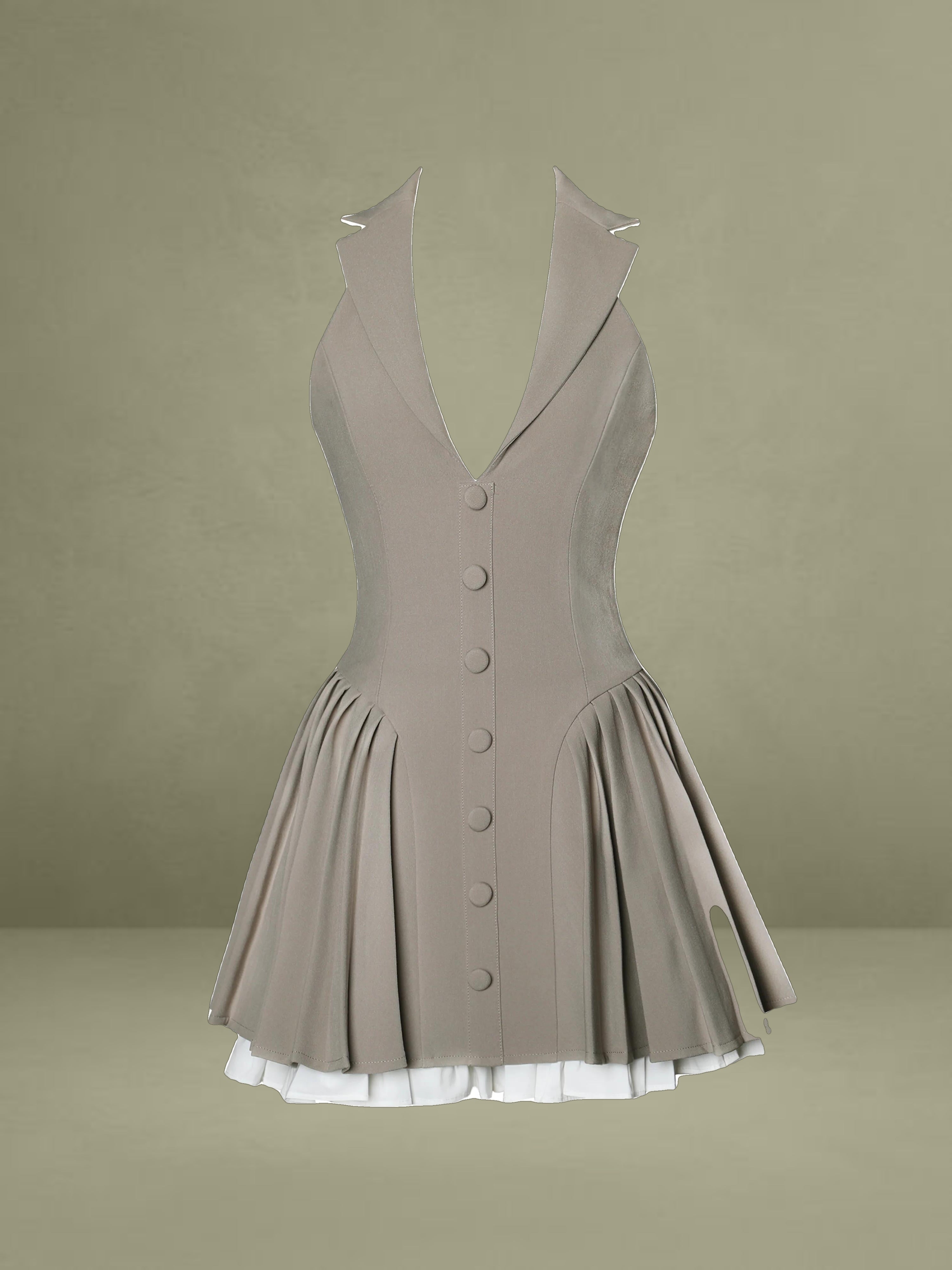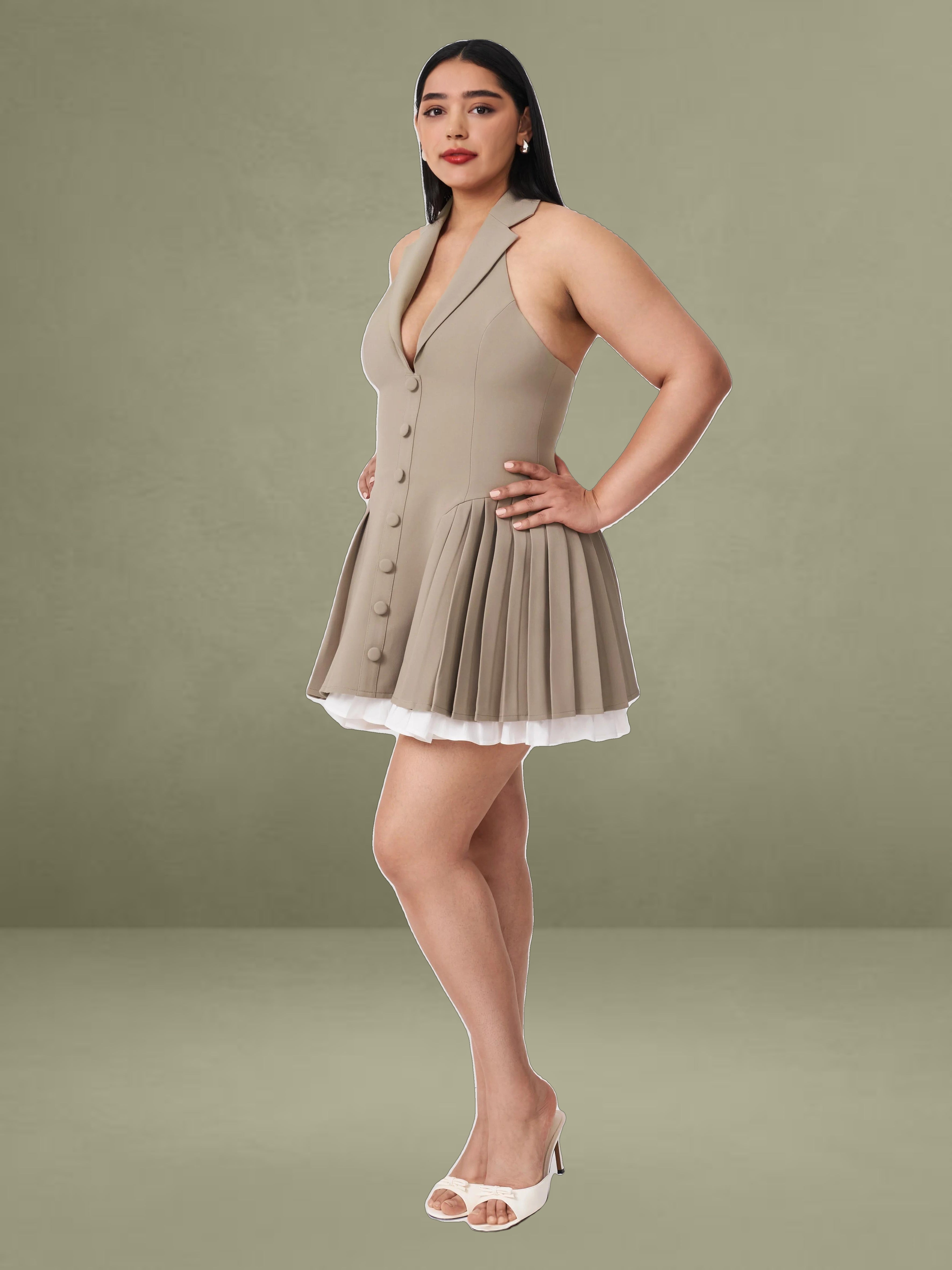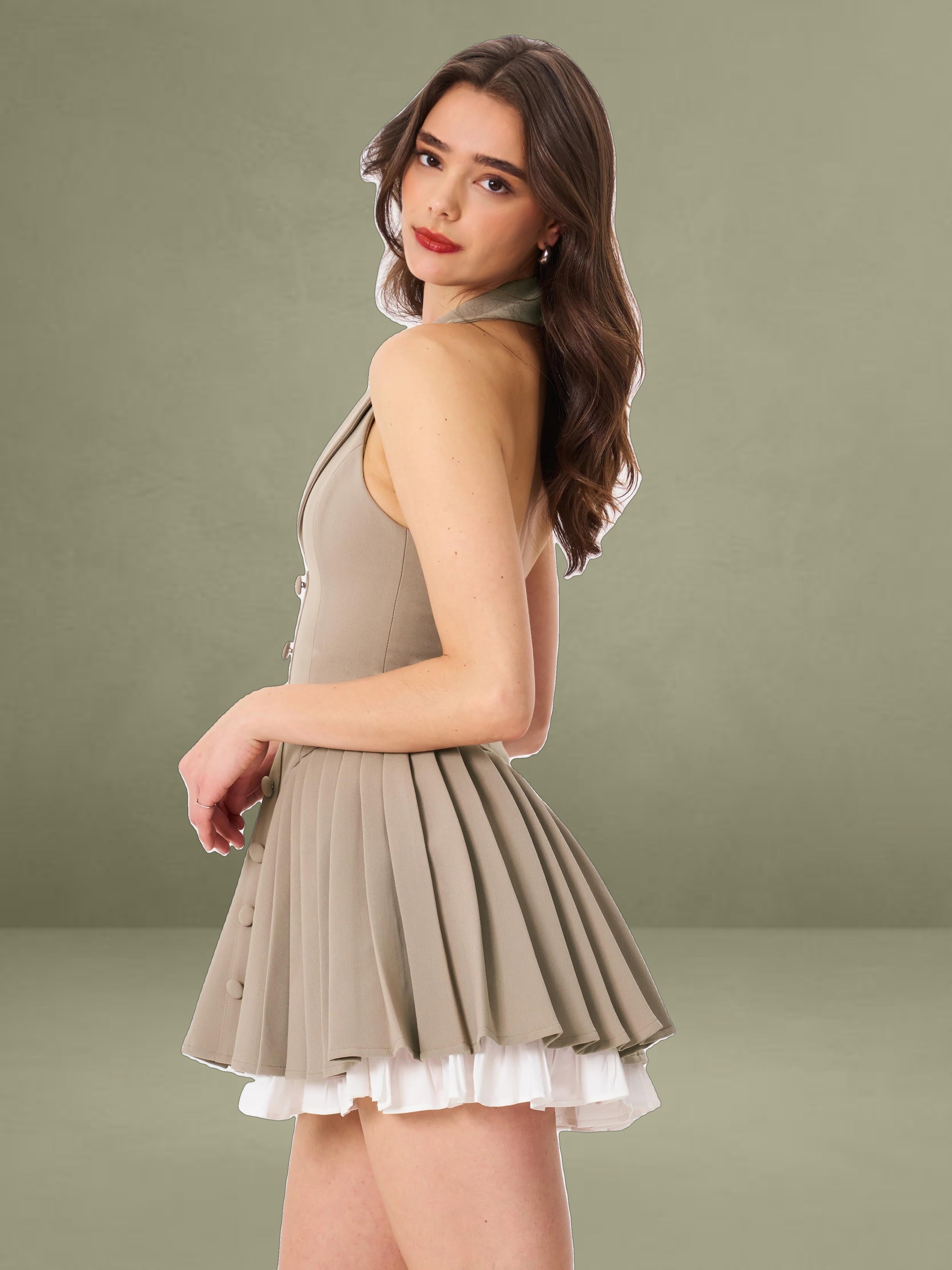 Elevate your style with our Hazel dress! Featuring a preppy style blazer dress with collared halter neck design, layered with crisp white trim and a sophisticated brown hue, this dress exudes timeless charm. The pleated skirt, supported from within, ensures a flawless silhouette, while the fabric-covered buttons add a touch of classic elegance. An invisible zipper ensures a seamless finish. Perfect for daily styling, this dress effortlessly combines refined preppy elements with modern sophistication. Make it a staple in your wardrobe and embrace its versatile allure.
