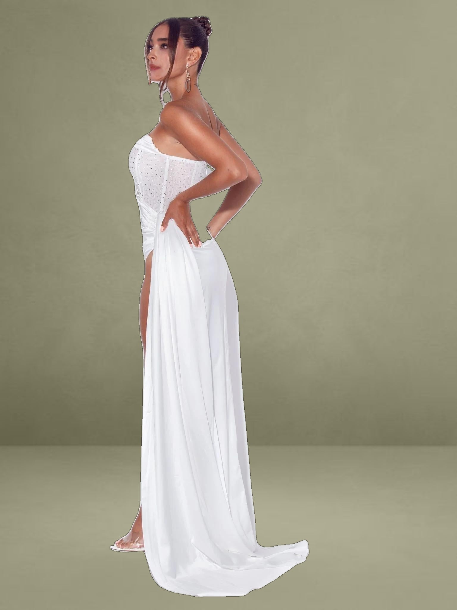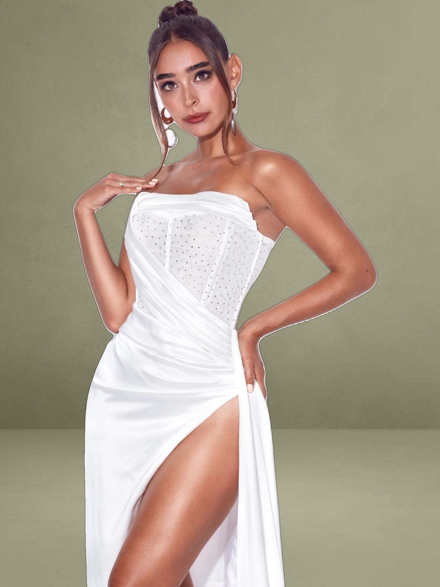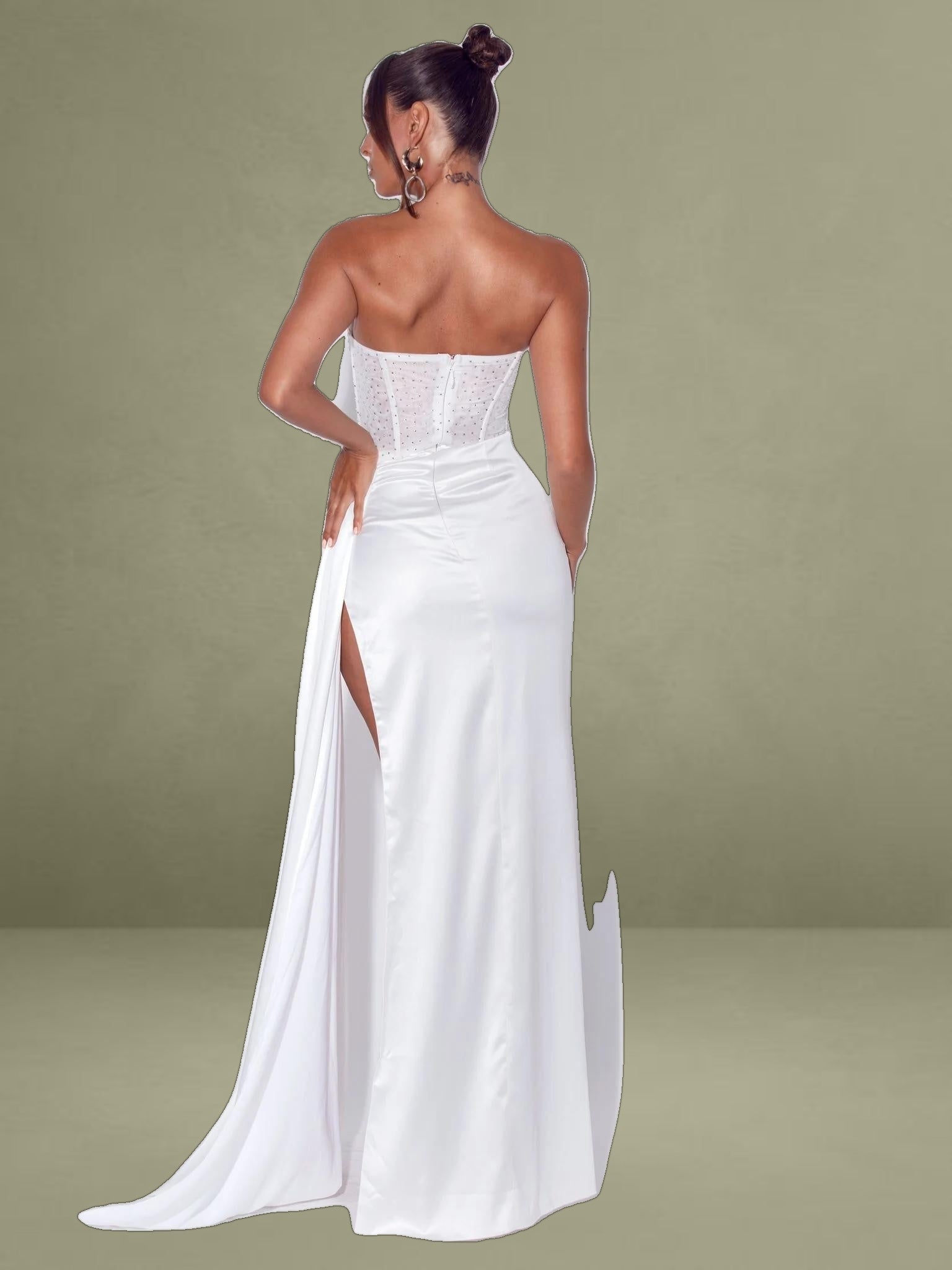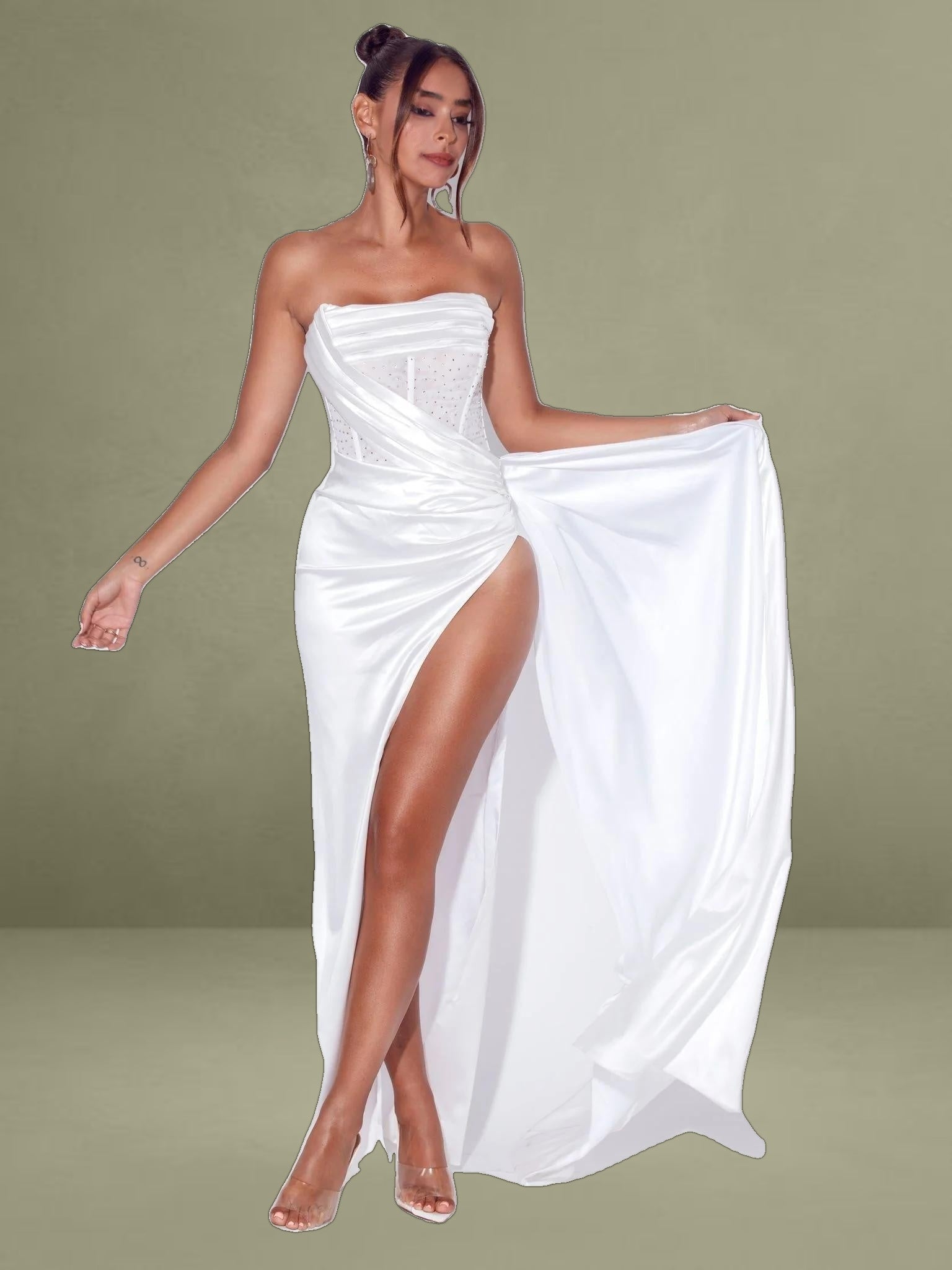 A Miss Circle favorite! This gown is bound to dazzle with its boned mesh corset adorned with hand-placed crystals and super high thigh slit. Made from luxurious satin fabric, it's fully lined and has an invisible zipper located at the center back of the garment with a single hook and eye closure at the top back edge. Perfect for a black tie party, luxury wedding, prom, ball, or gala; available in an array of colors. Make a stunning statement!