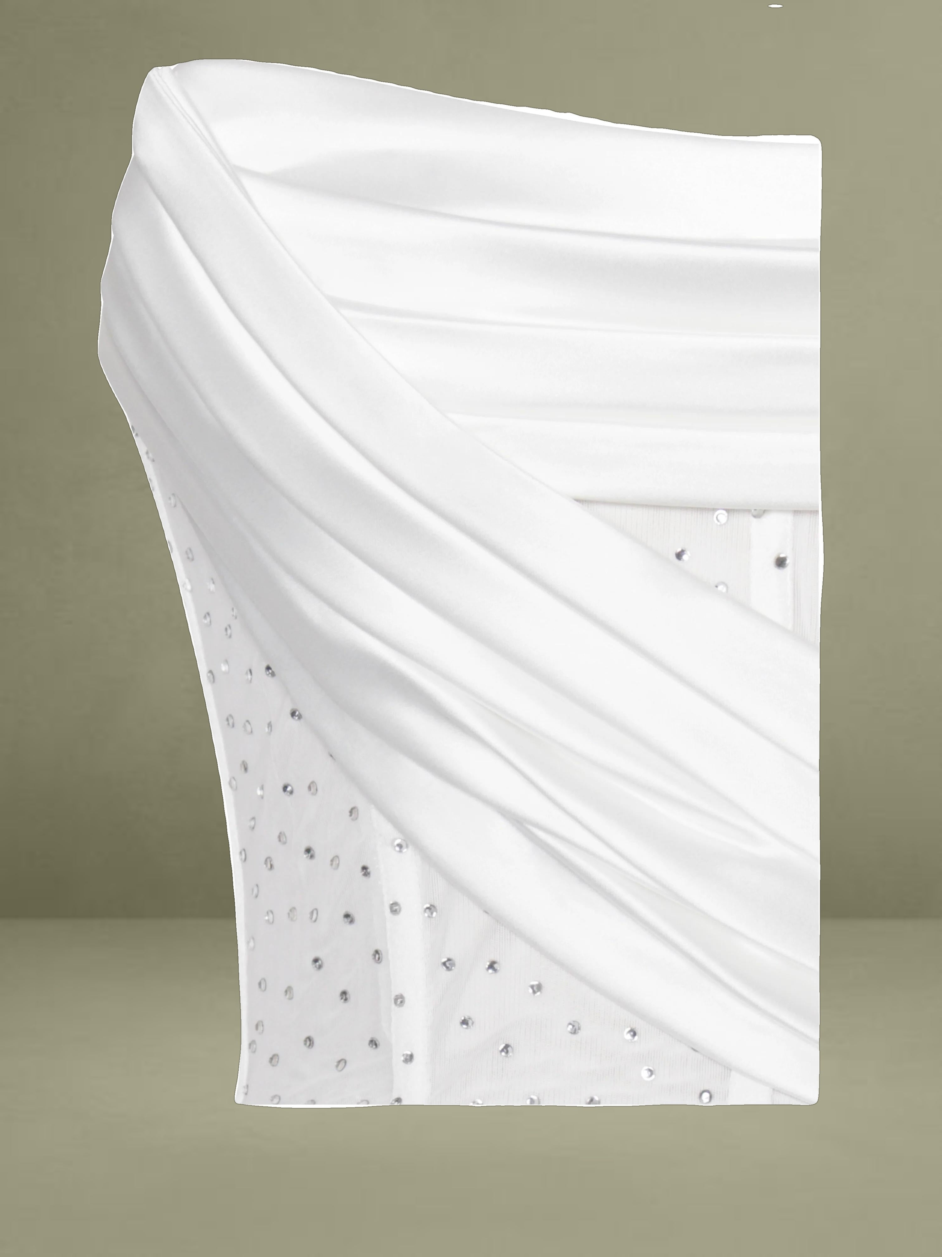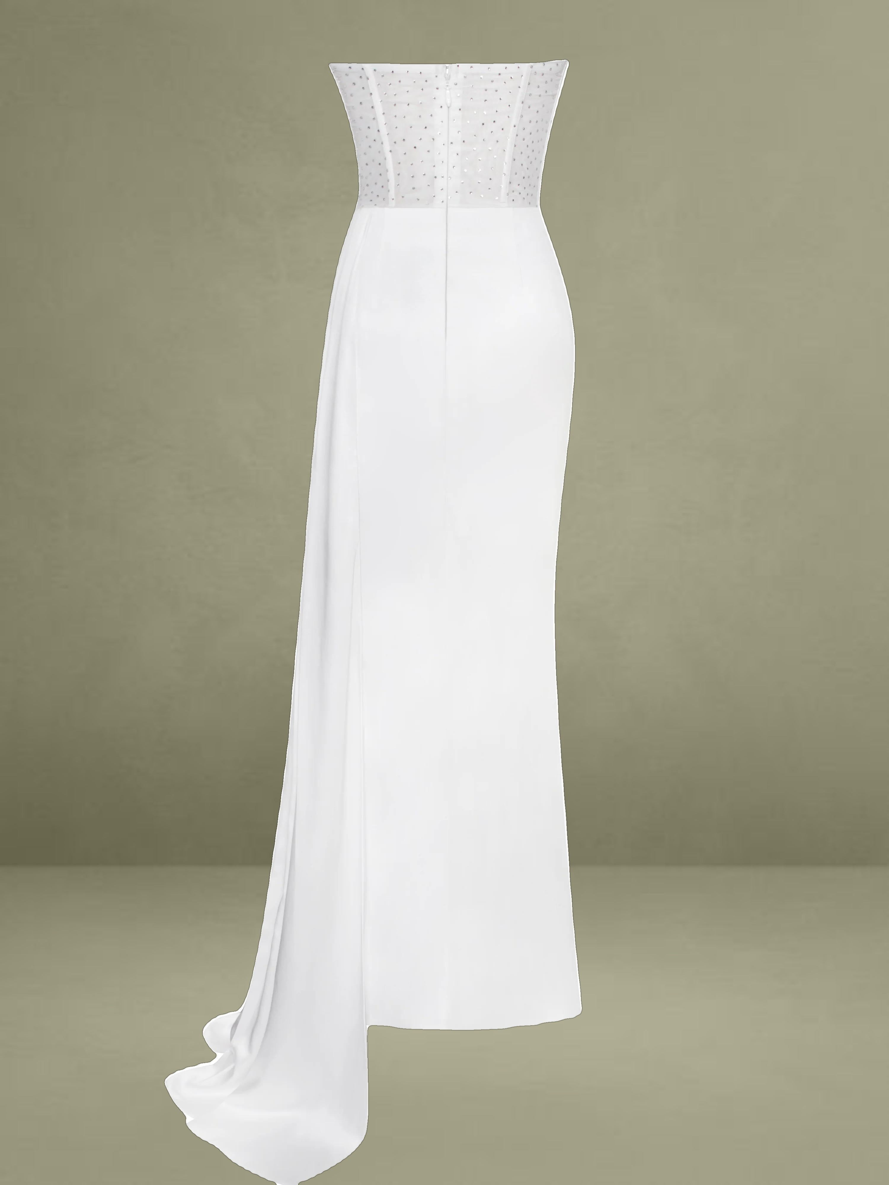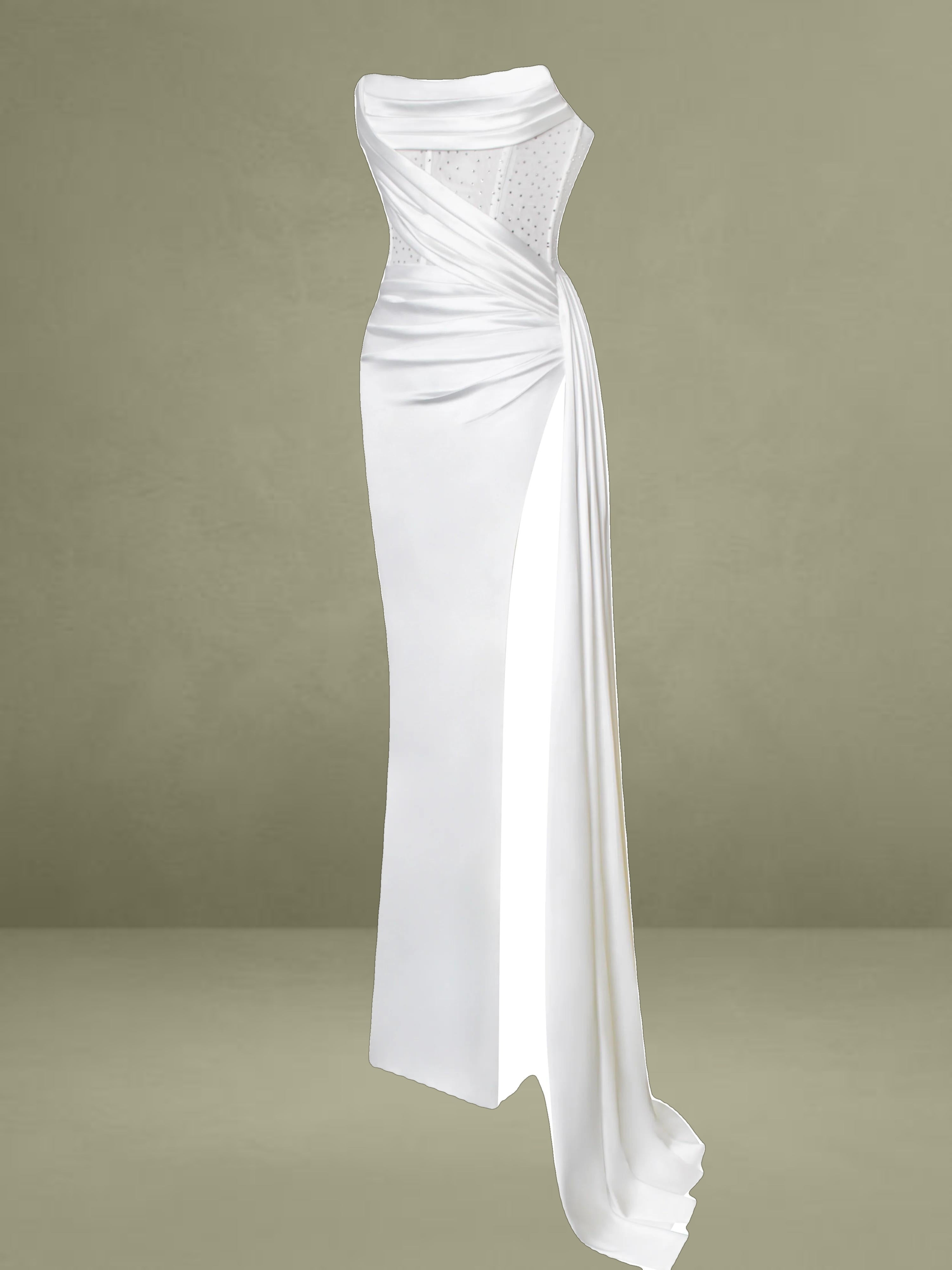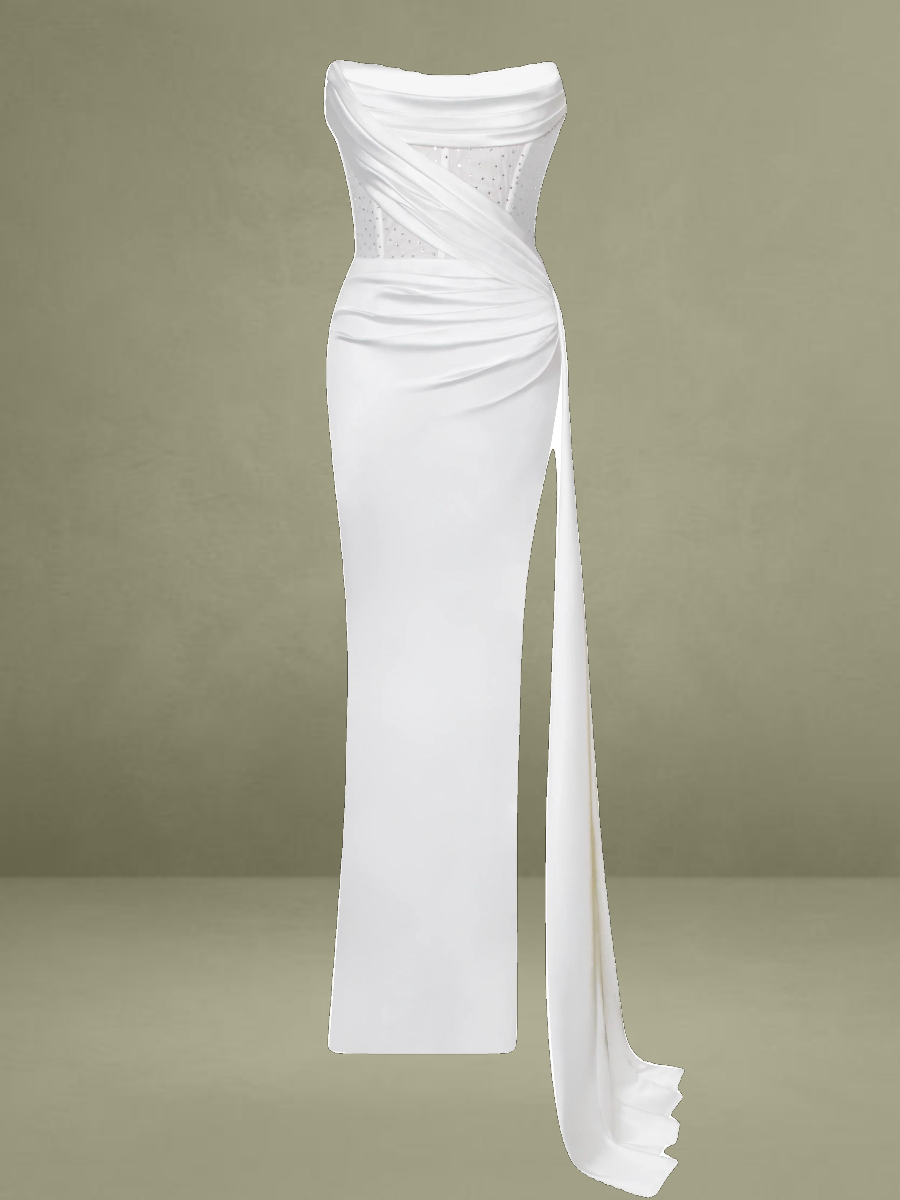 A Miss Circle favorite! This gown is bound to dazzle with its boned mesh corset adorned with hand-placed crystals and super high thigh slit. Made from luxurious satin fabric, it's fully lined and has an invisible zipper located at the center back of the garment with a single hook and eye closure at the top back edge. Perfect for a black tie party, luxury wedding, prom, ball, or gala; available in an array of colors. Make a stunning statement!