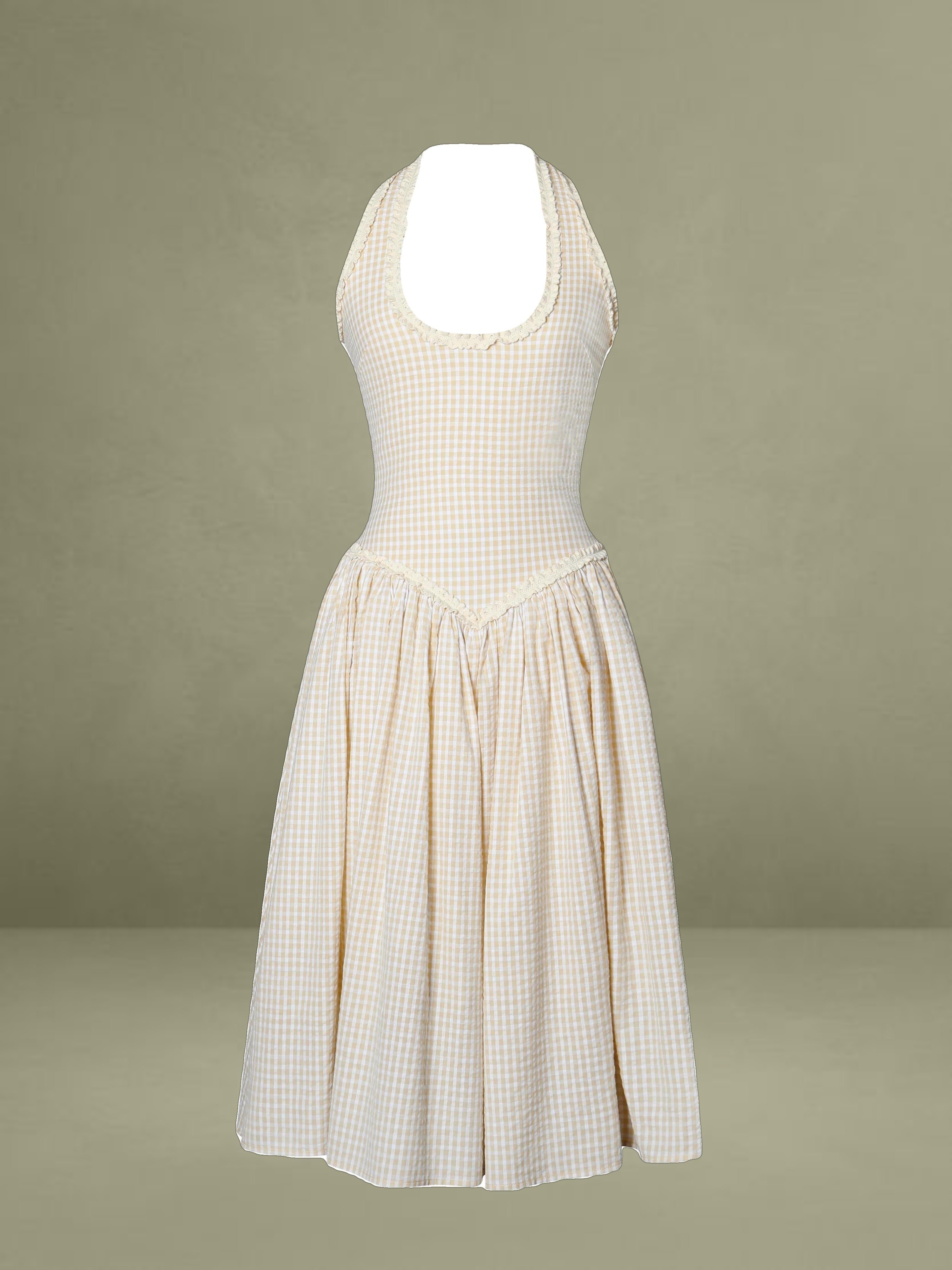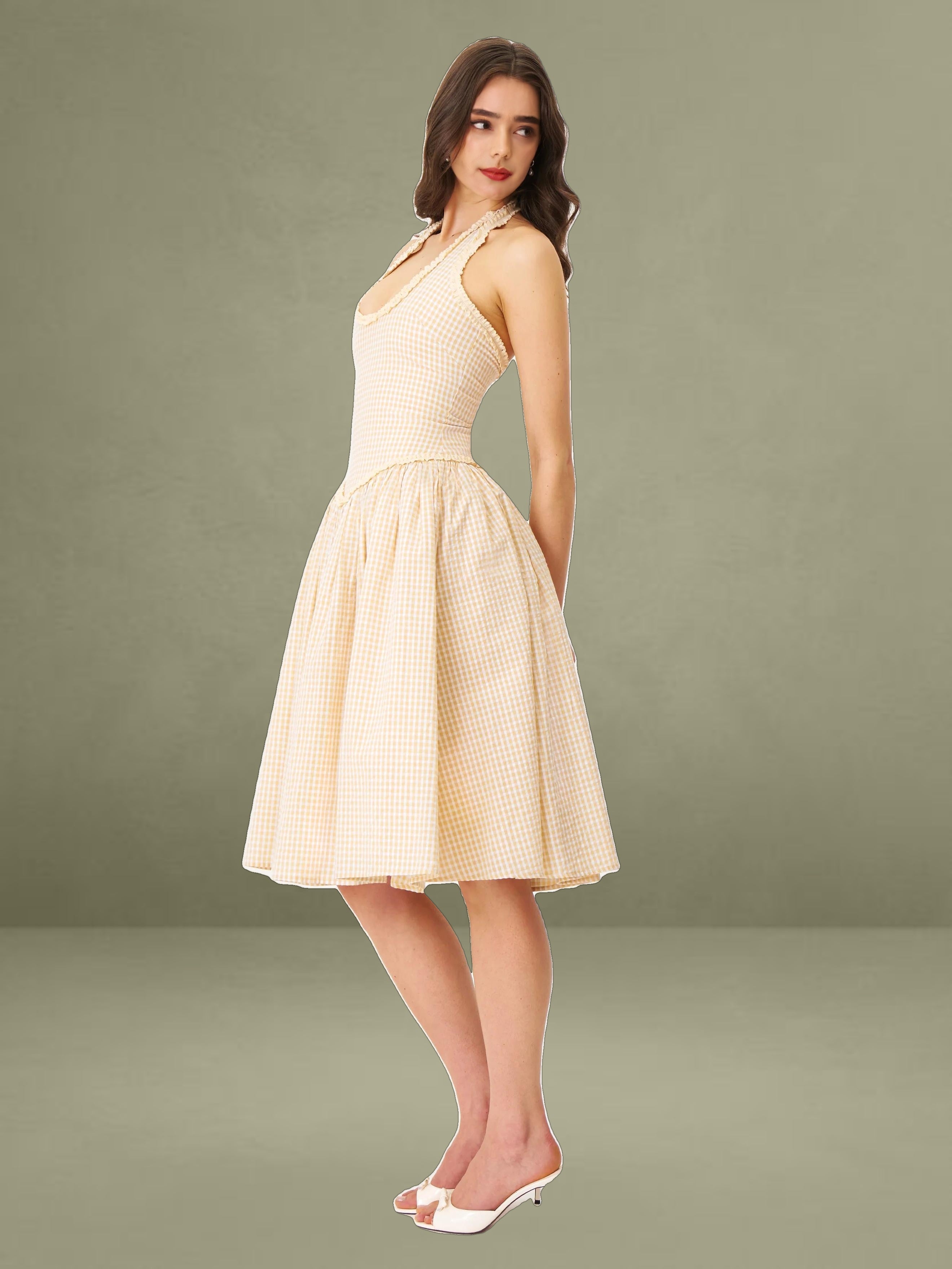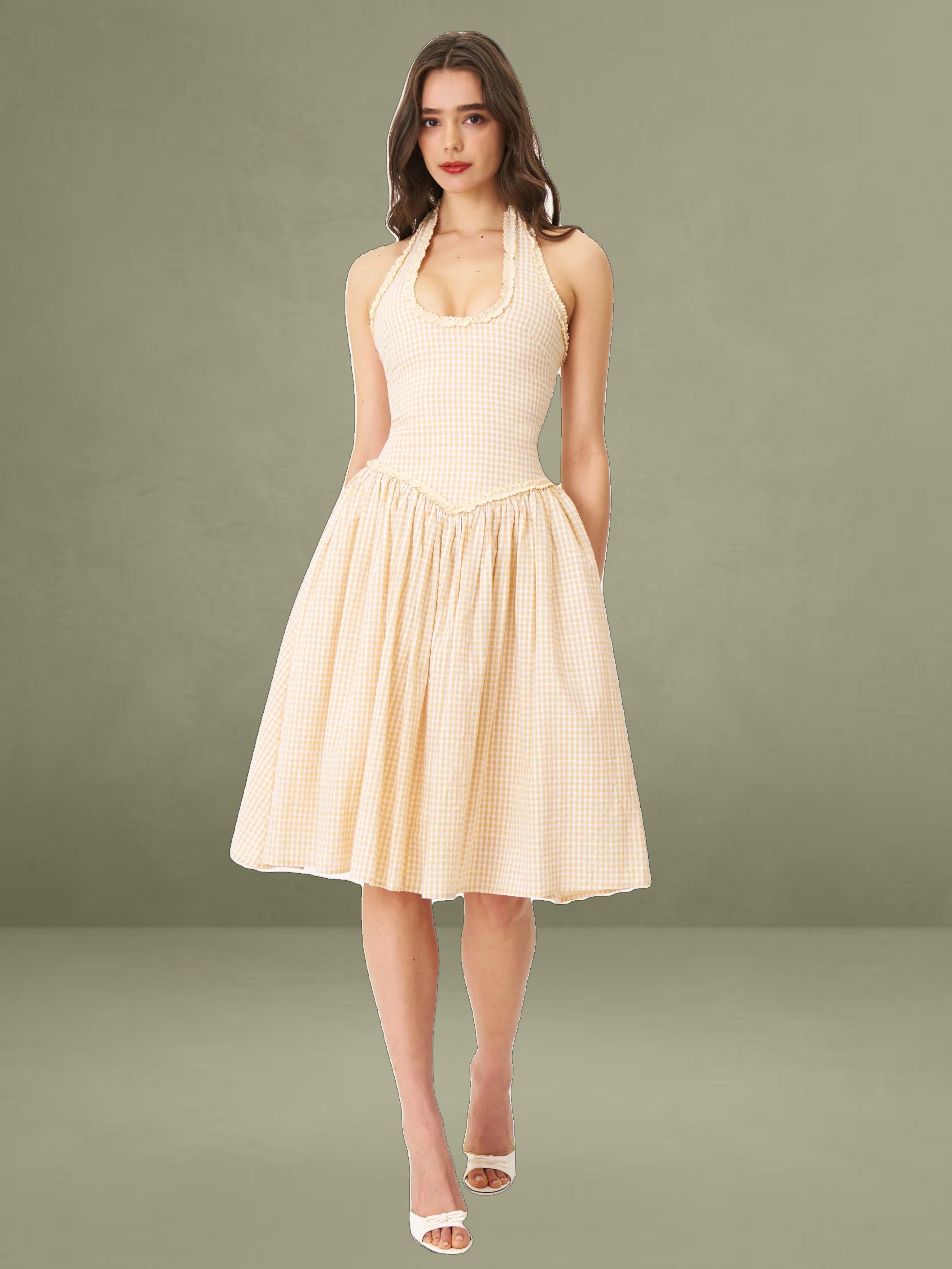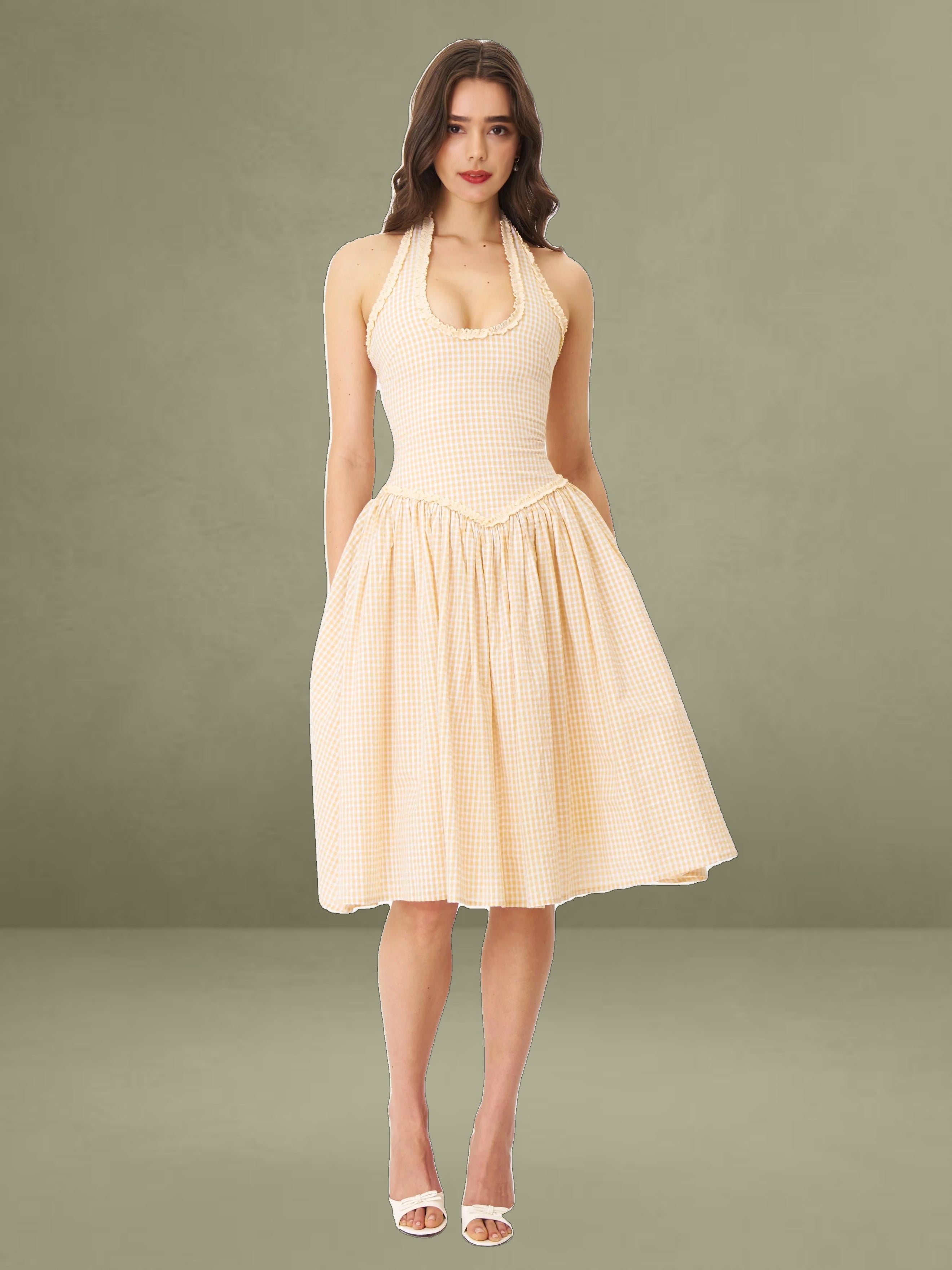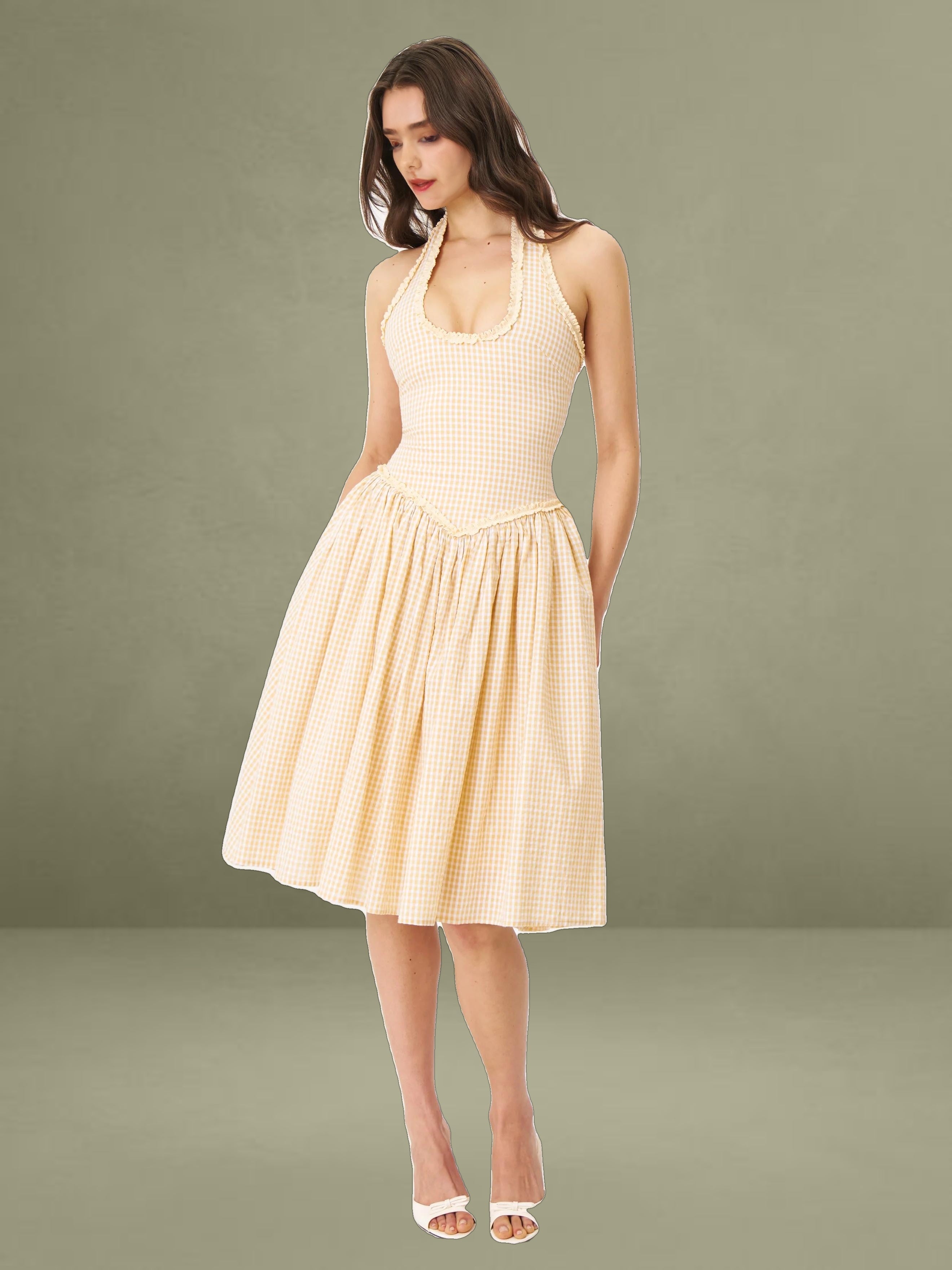 The Idella Dress is a charming ode to sunny days and timeless femininity. Crafted in a cheerful yellow gingham, this midi-length piece features a flattering U-neck halter and a delicately dropped waist that flows into a V-shaped waistline for a sculpted fit. Finished with romantic lace trim, invisible pockets, and a hidden zipper, the fully lined silhouette is perfect for springtime strolls, weekend picnics, or casual garden parties.