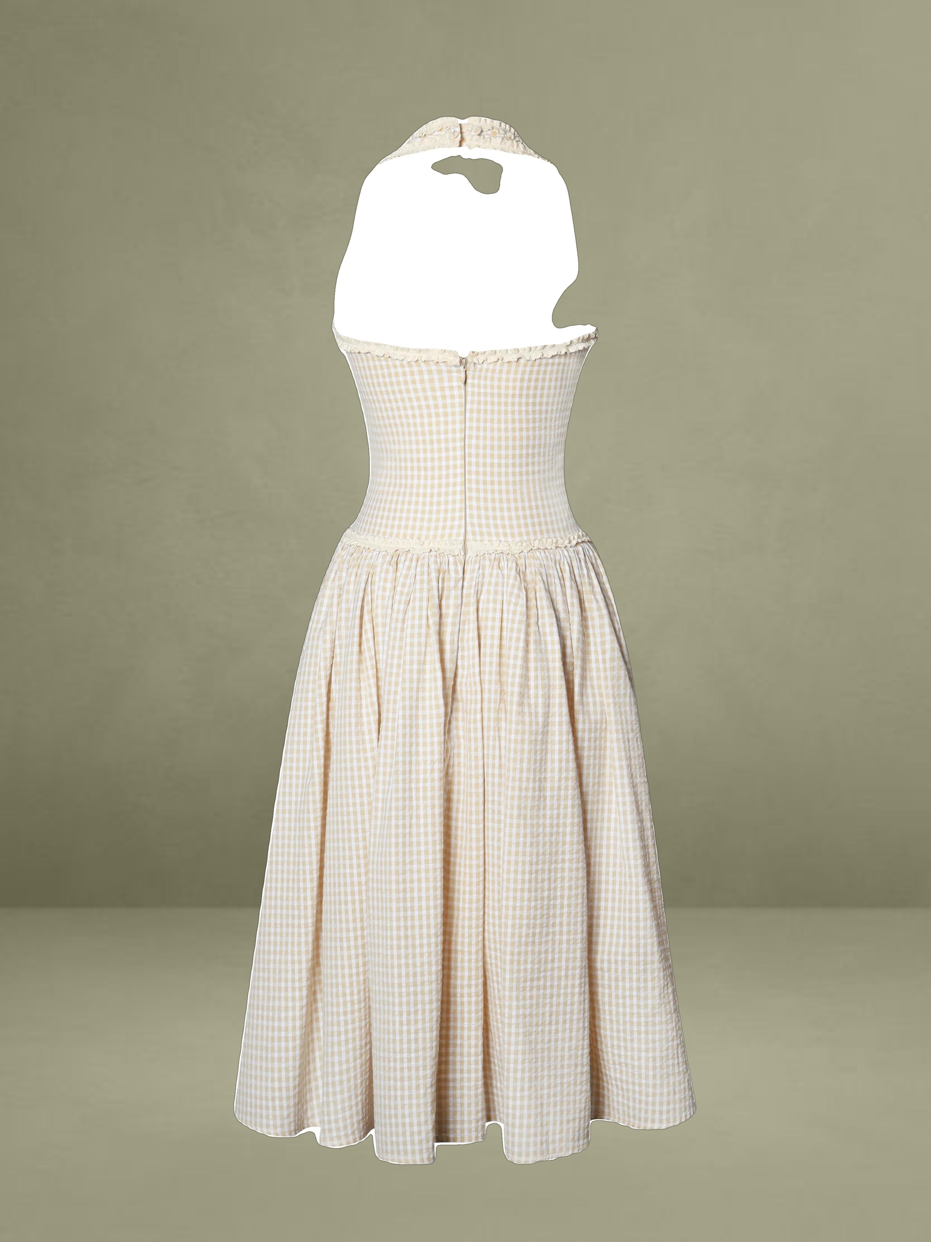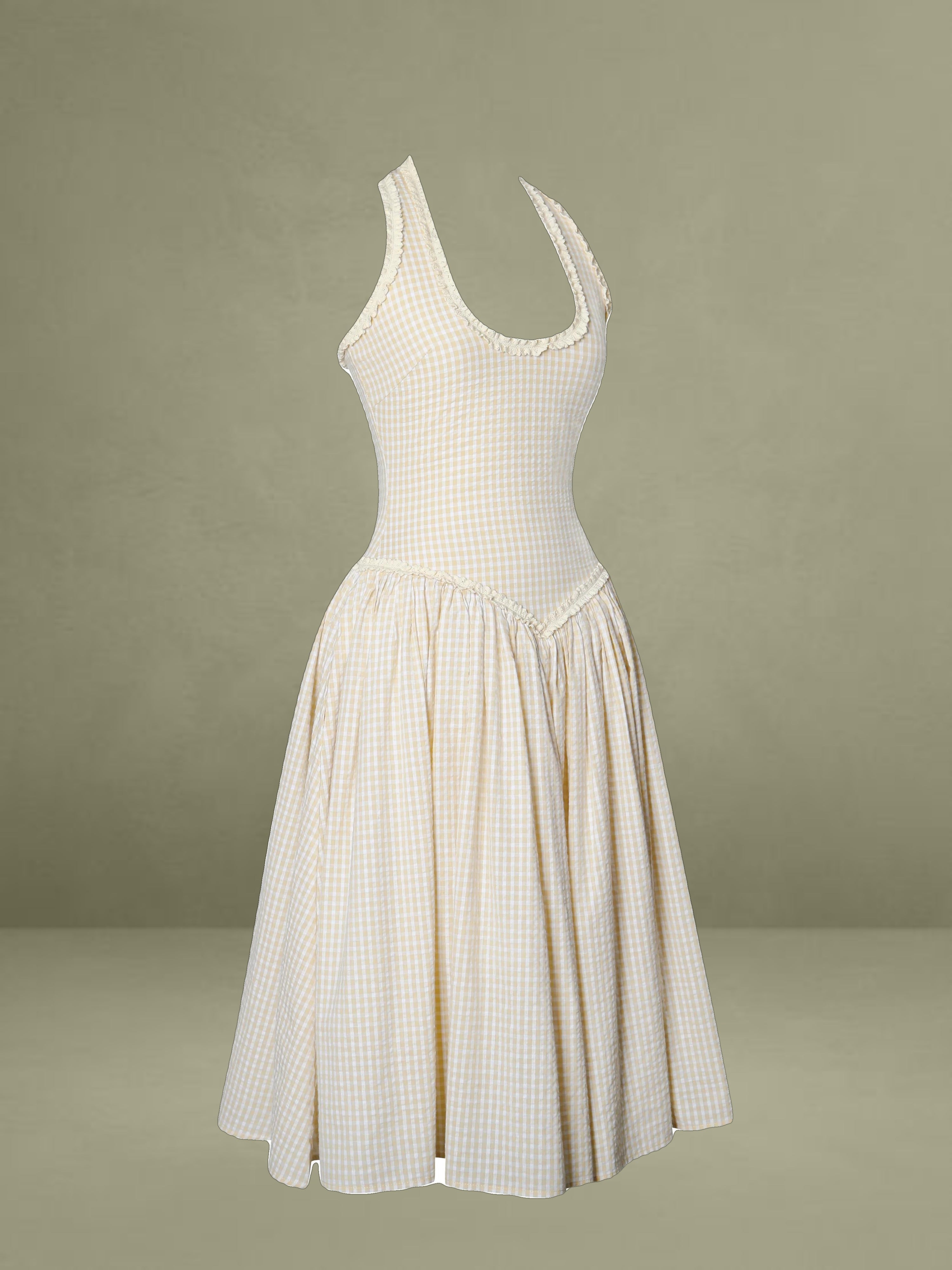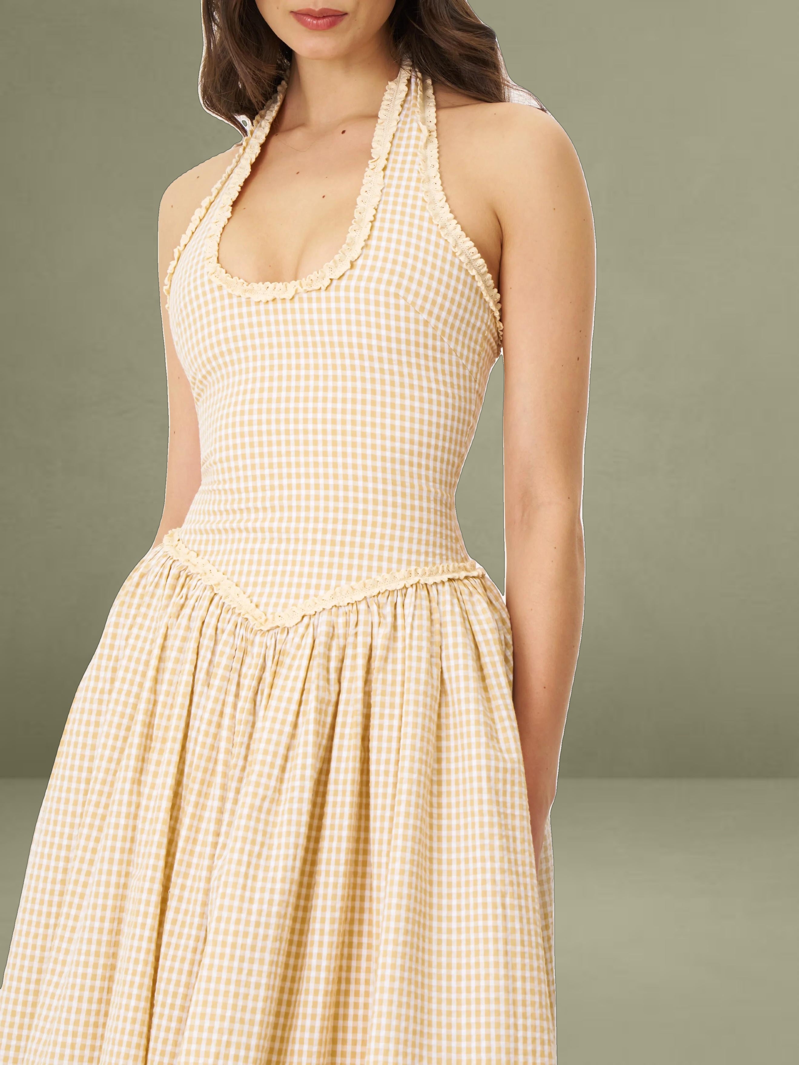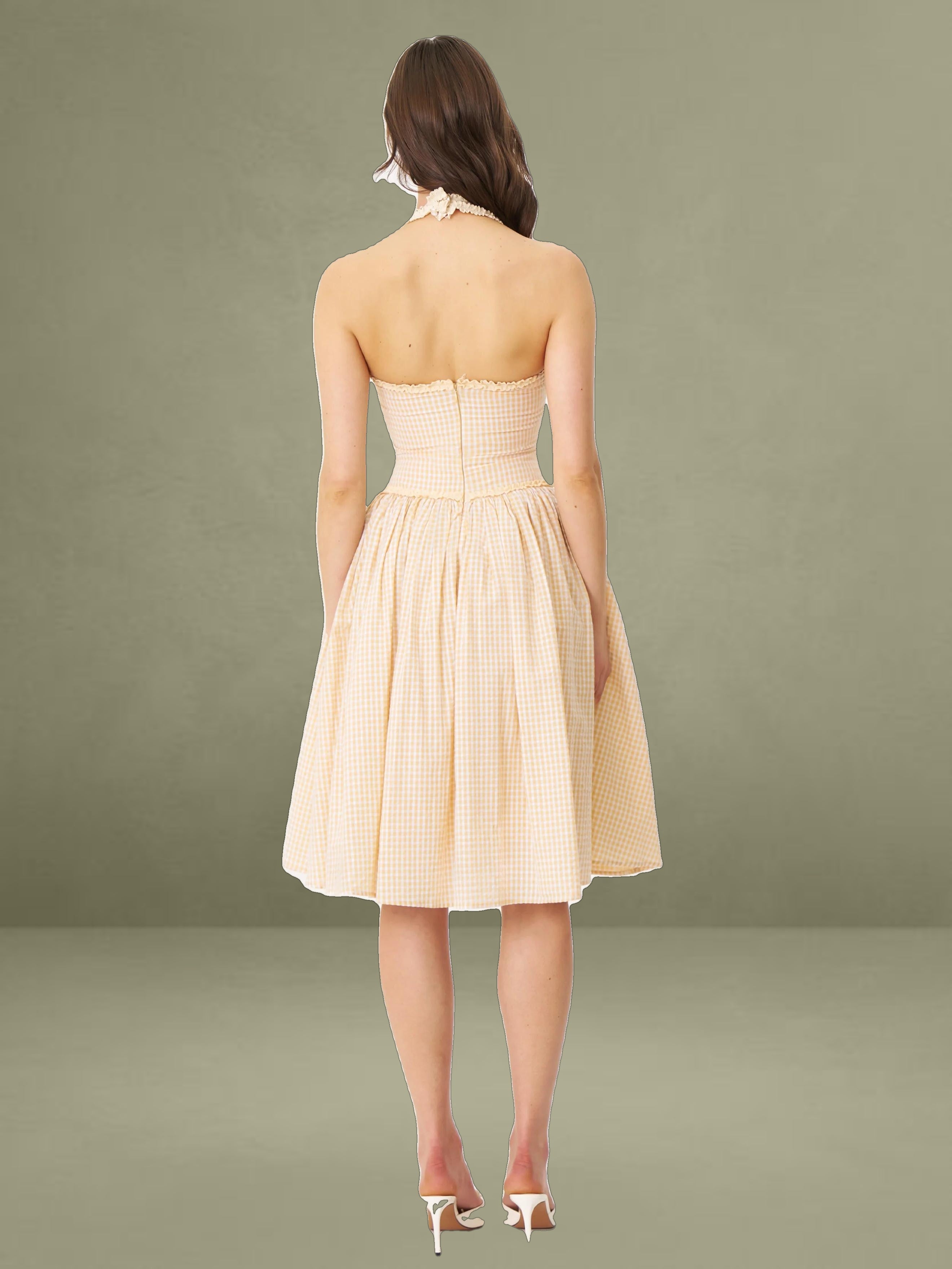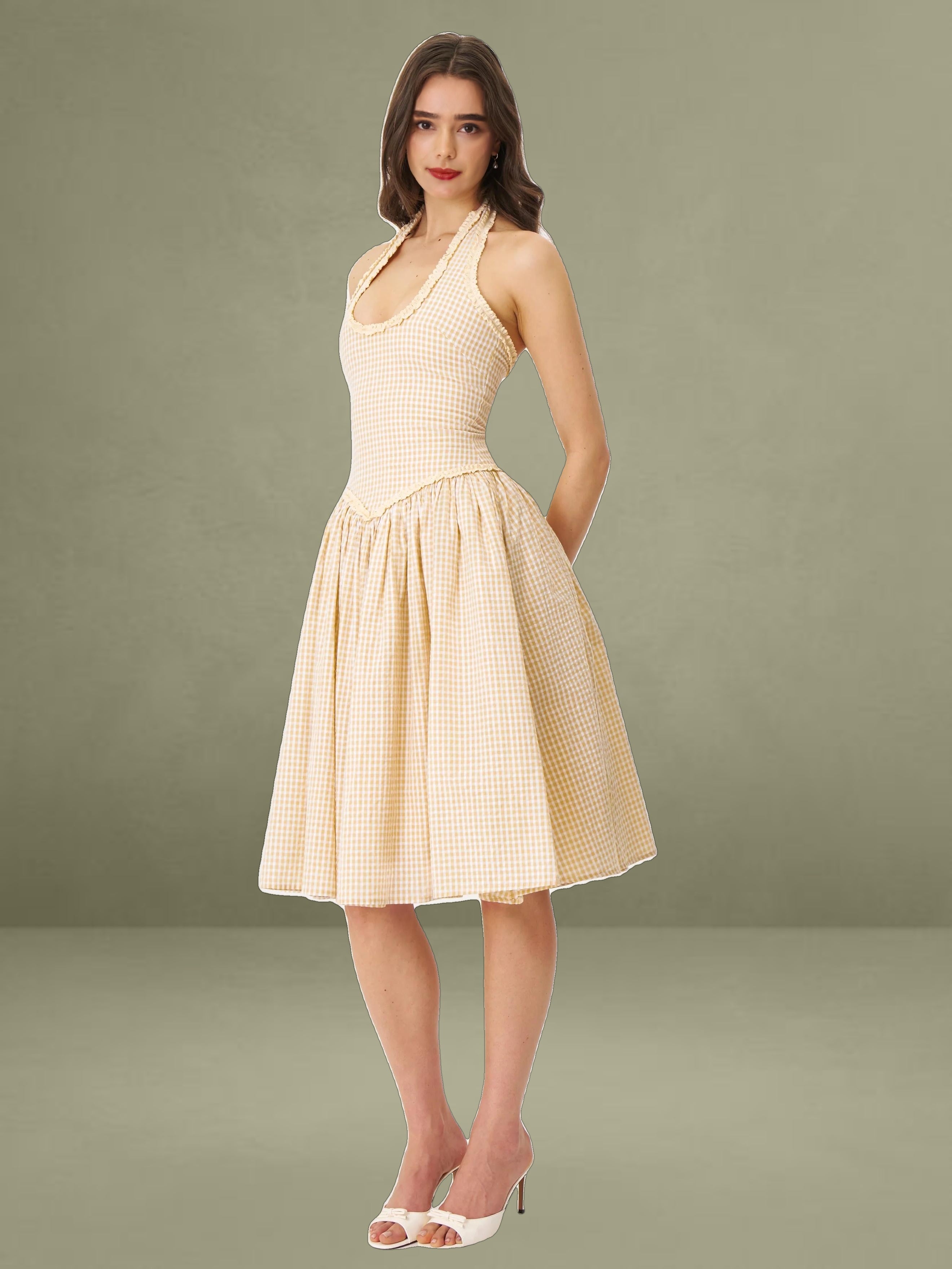 The Idella Dress is a charming ode to sunny days and timeless femininity. Crafted in a cheerful yellow gingham, this midi-length piece features a flattering U-neck halter and a delicately dropped waist that flows into a V-shaped waistline for a sculpted fit. Finished with romantic lace trim, invisible pockets, and a hidden zipper, the fully lined silhouette is perfect for springtime strolls, weekend picnics, or casual garden parties.