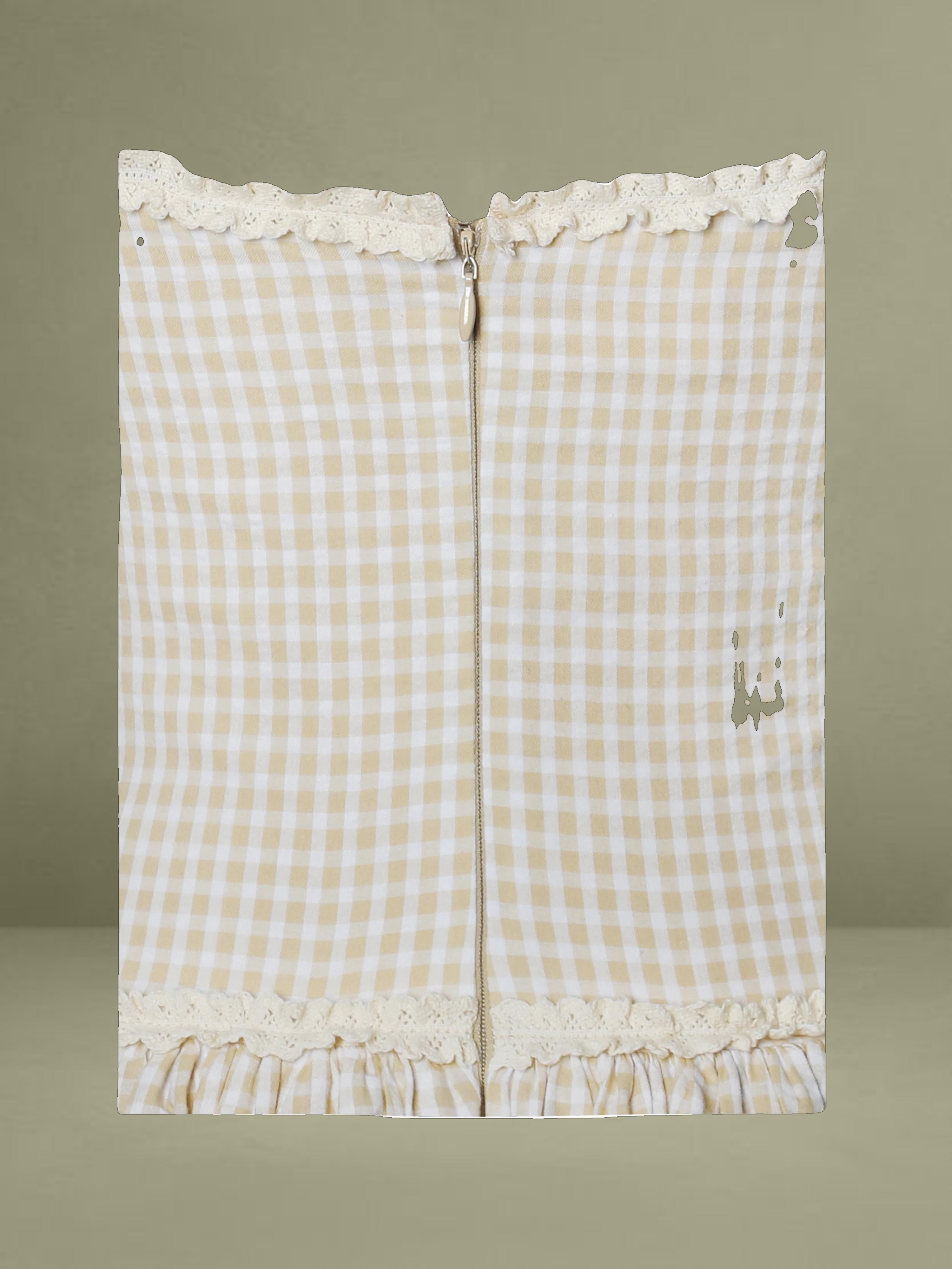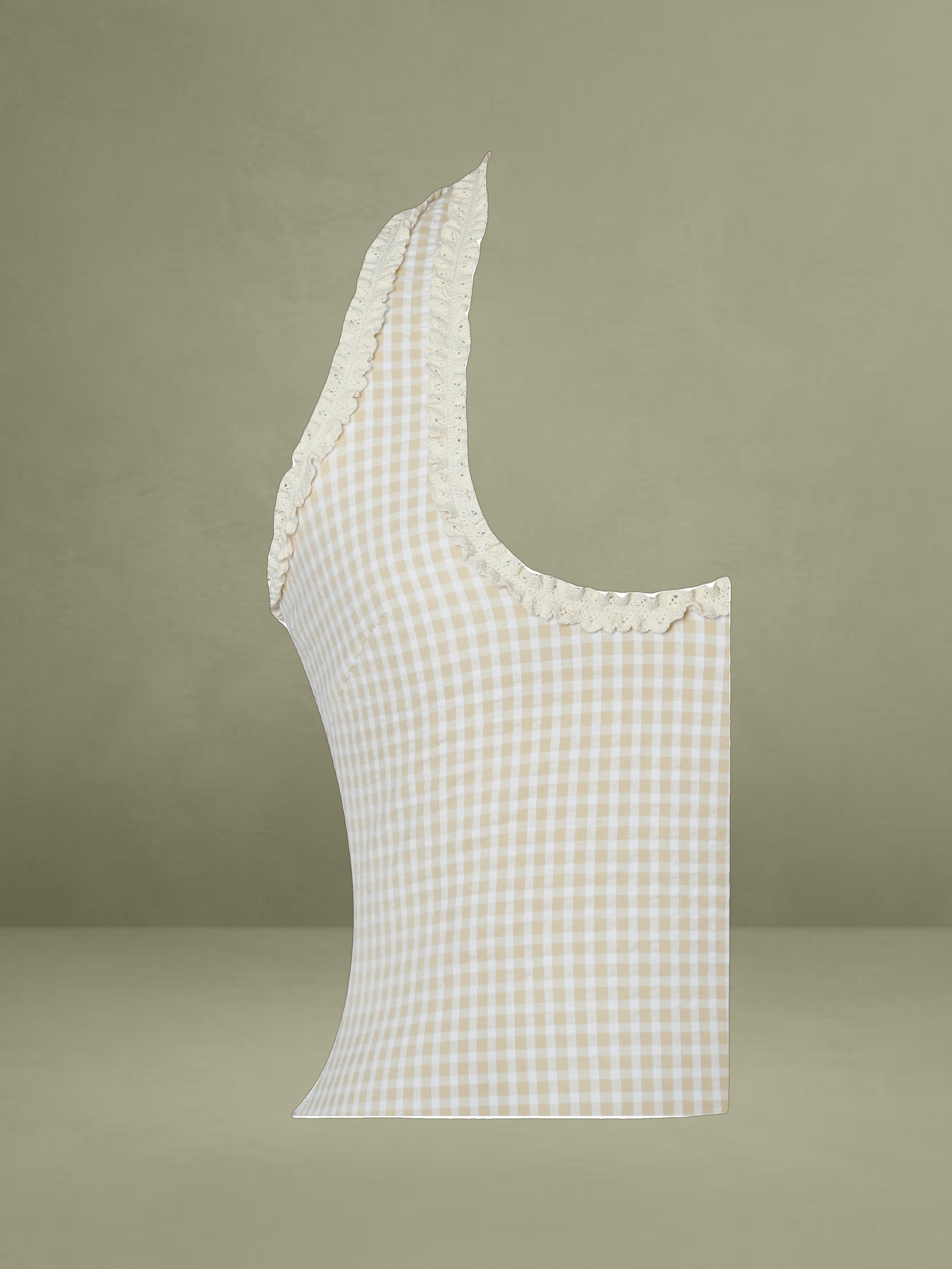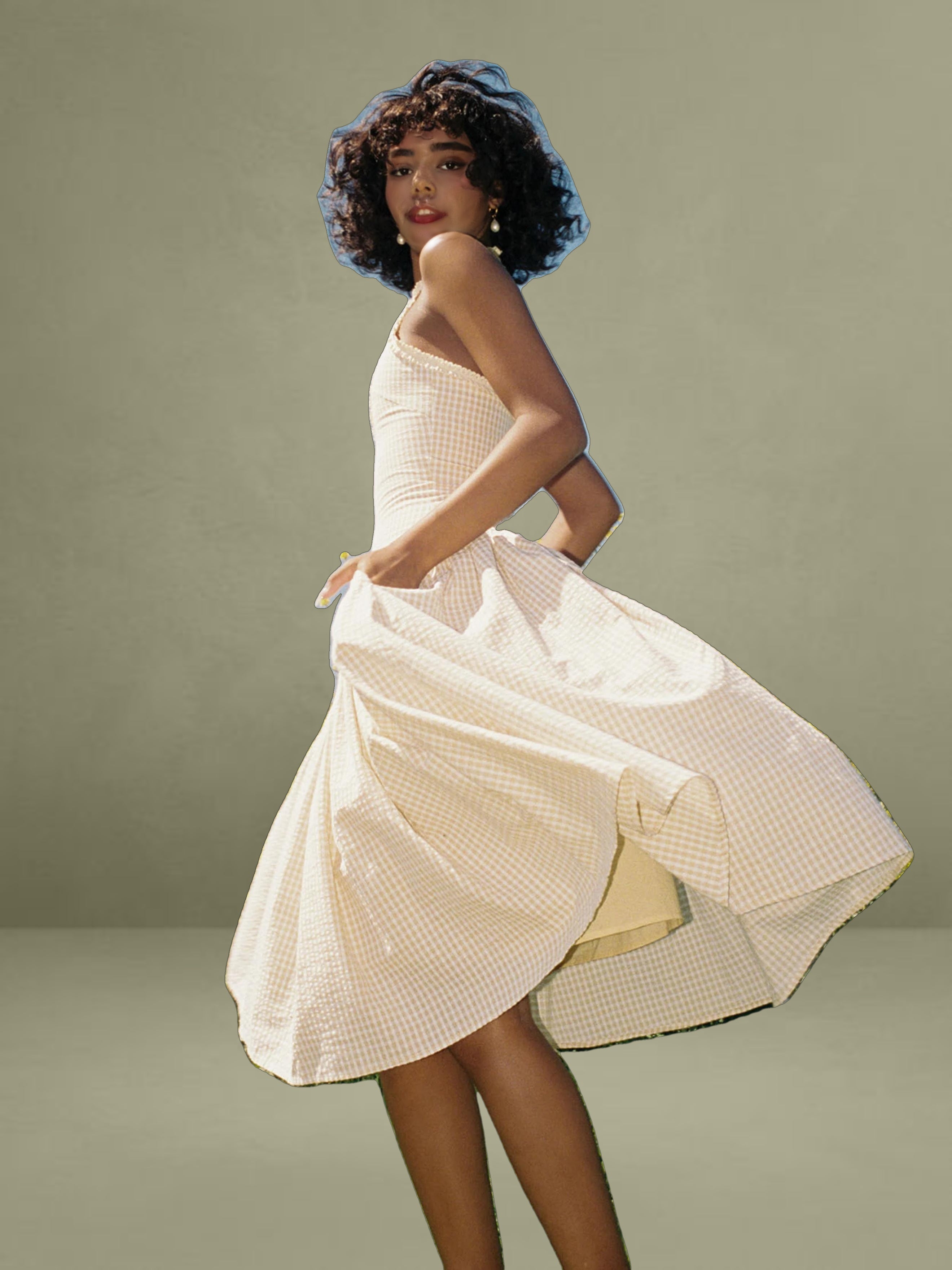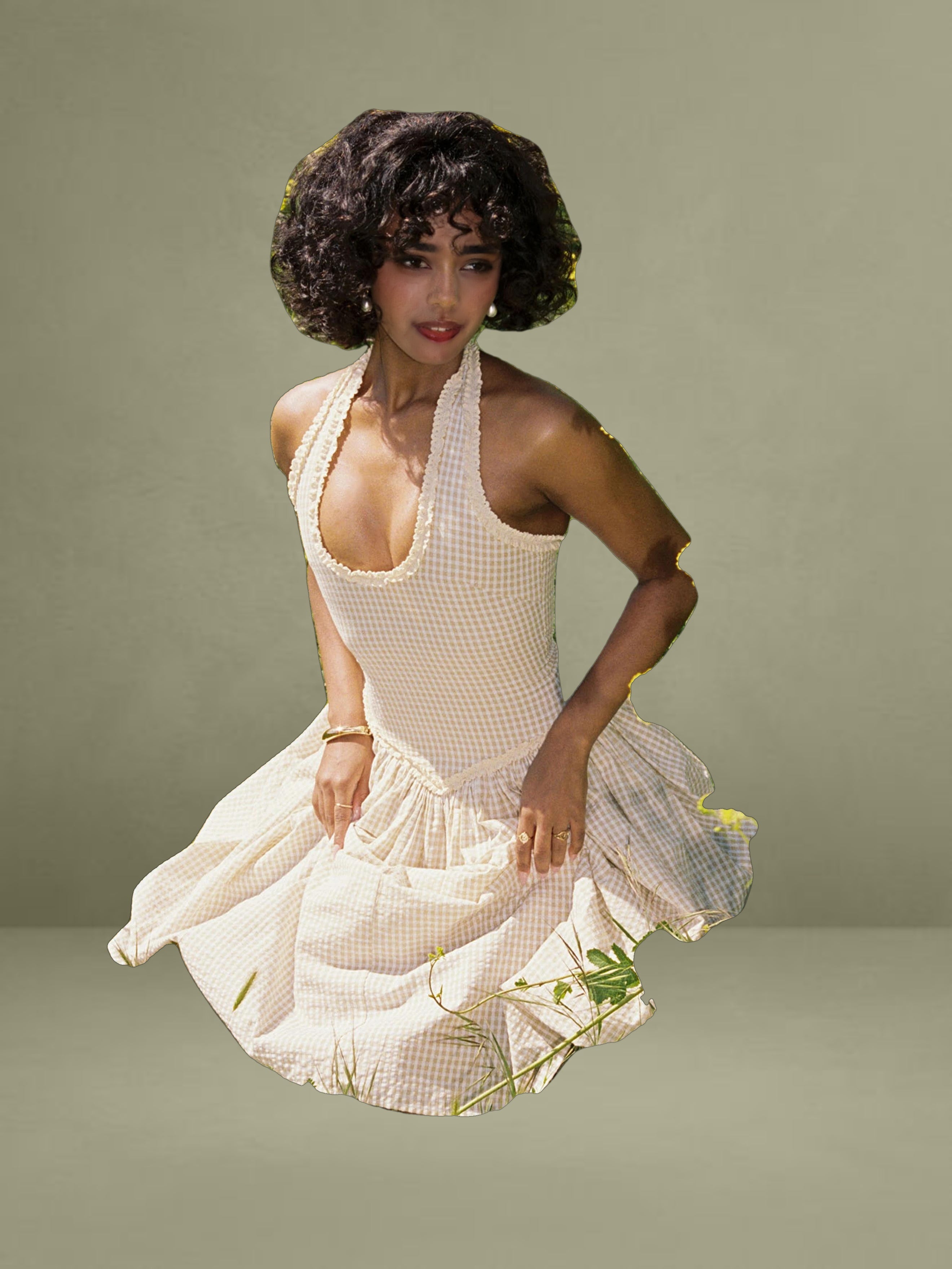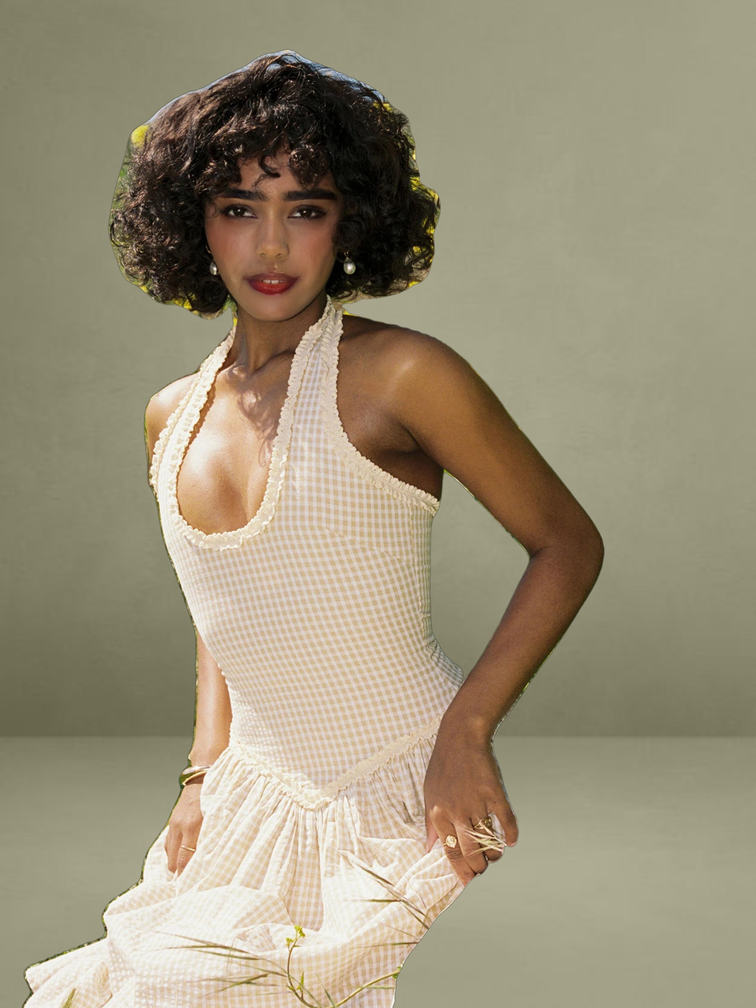 The Idella Dress is a charming ode to sunny days and timeless femininity. Crafted in a cheerful yellow gingham, this midi-length piece features a flattering U-neck halter and a delicately dropped waist that flows into a V-shaped waistline for a sculpted fit. Finished with romantic lace trim, invisible pockets, and a hidden zipper, the fully lined silhouette is perfect for springtime strolls, weekend picnics, or casual garden parties.