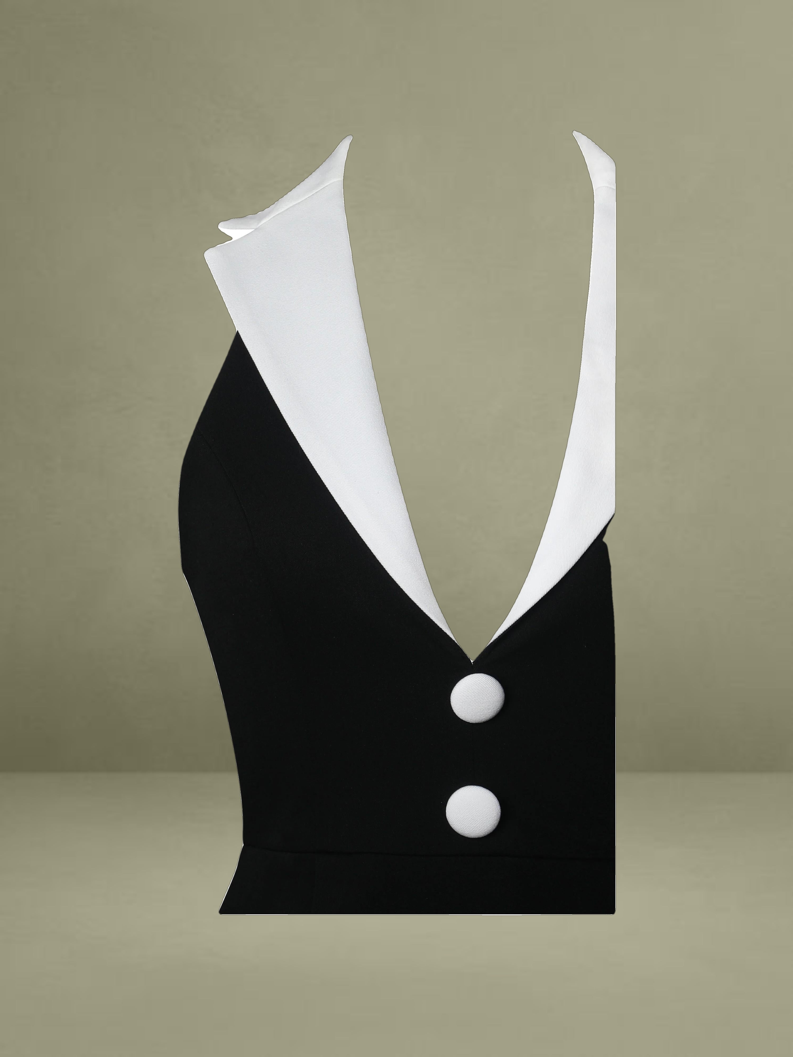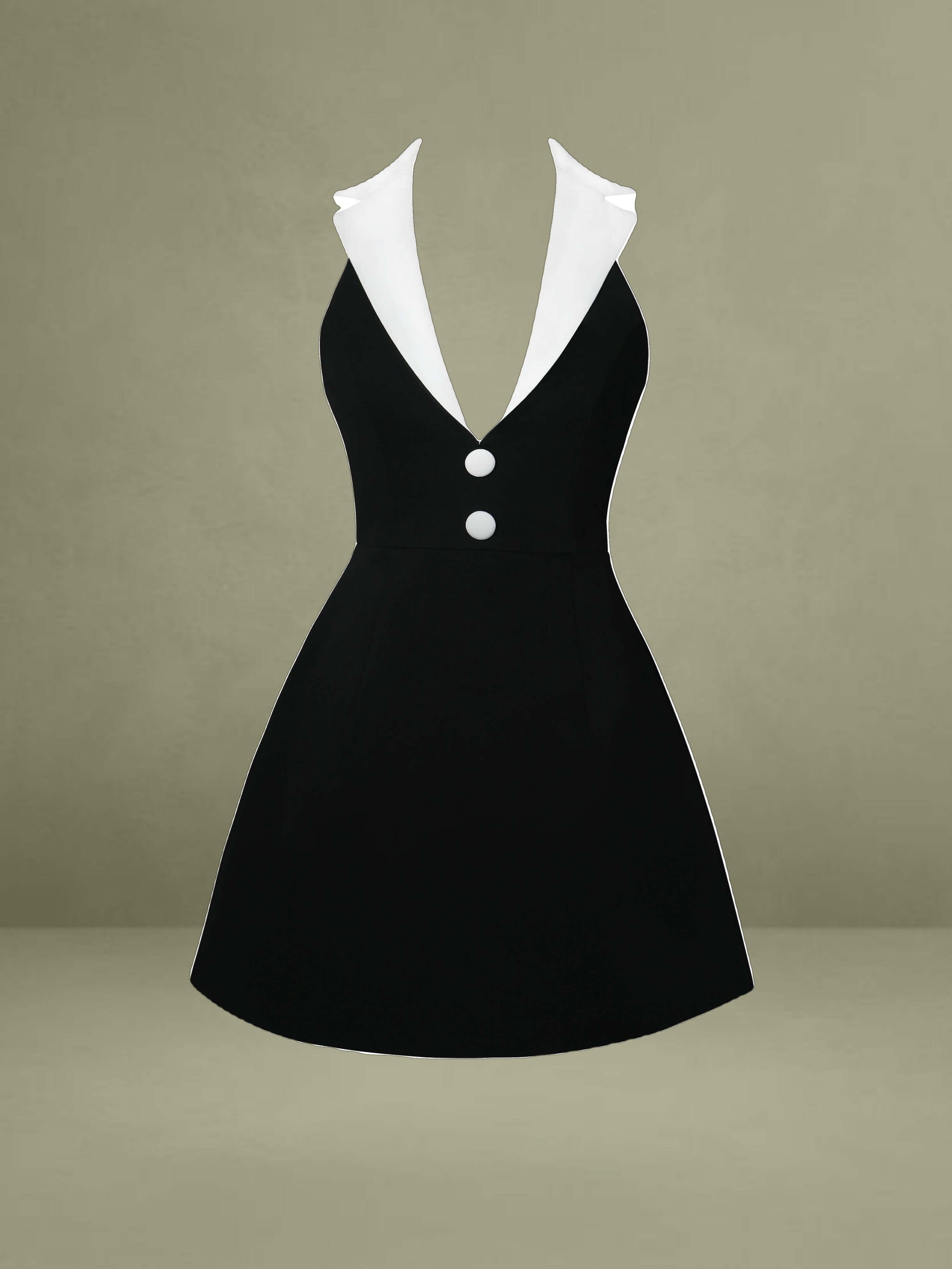 The Ignacia Dress blends classic charm with a modern twist in a refined black and white palette. Featuring a crisp white collar and coordinating white buttons, this preppy-style dress is tailored with a high waist and an A-line skirt that flatters every silhouette. The halter neckline leads into a striking backless design, offering a bold contrast to its otherwise polished look. Completed with an invisible zipper and hidden pockets for functionality, this dress is fully equipped for office days, casual outings, or formal events alike.