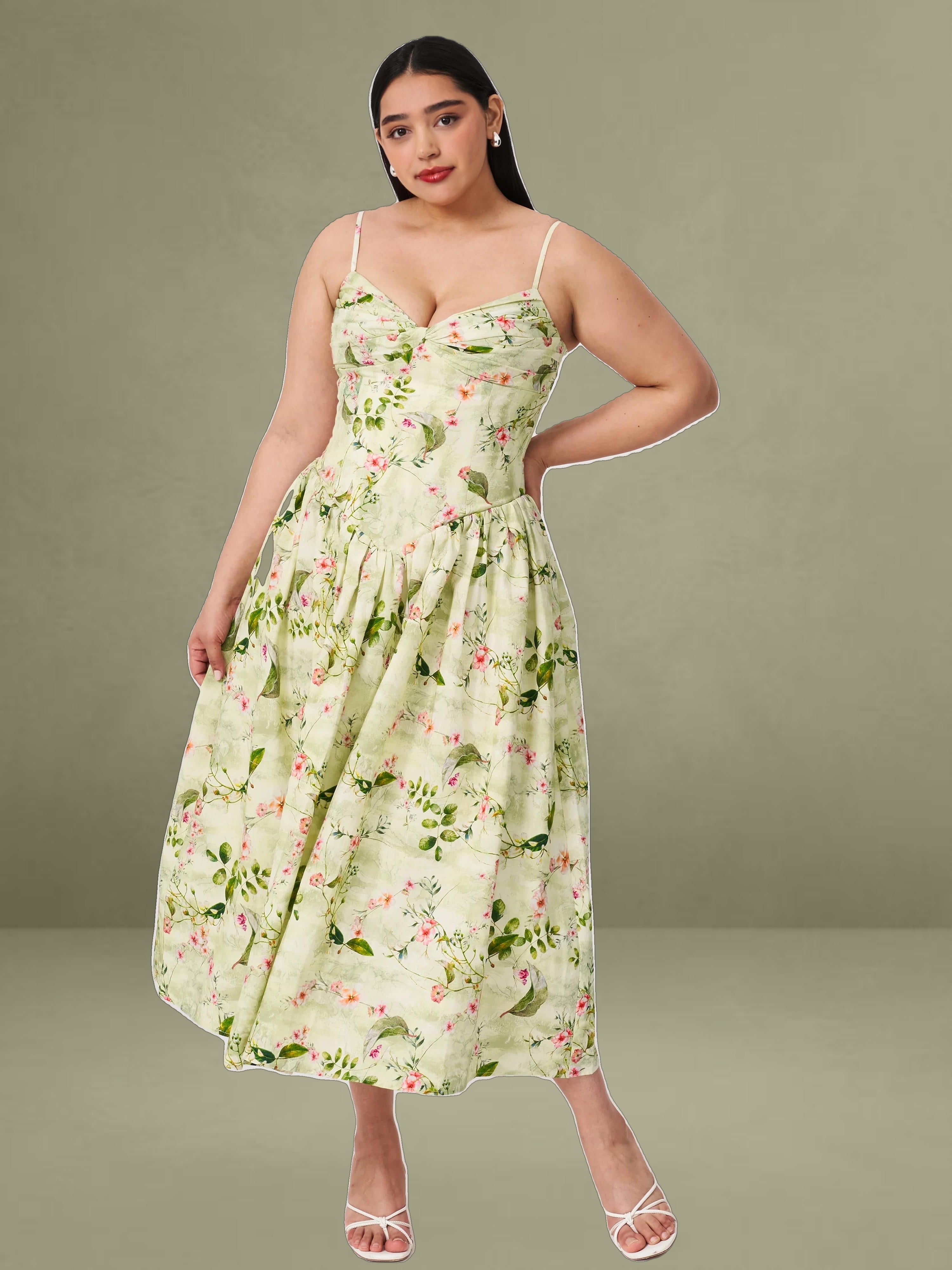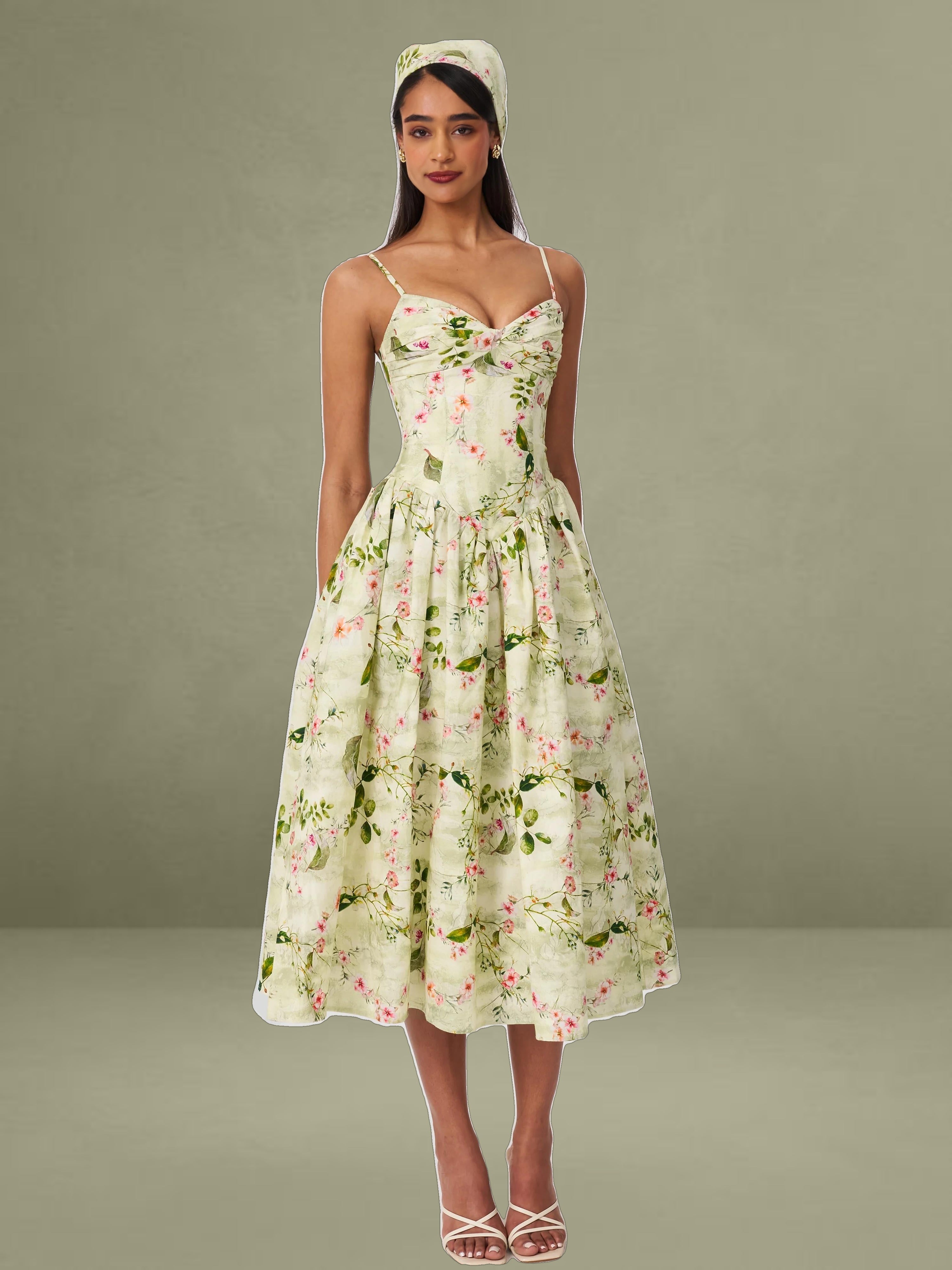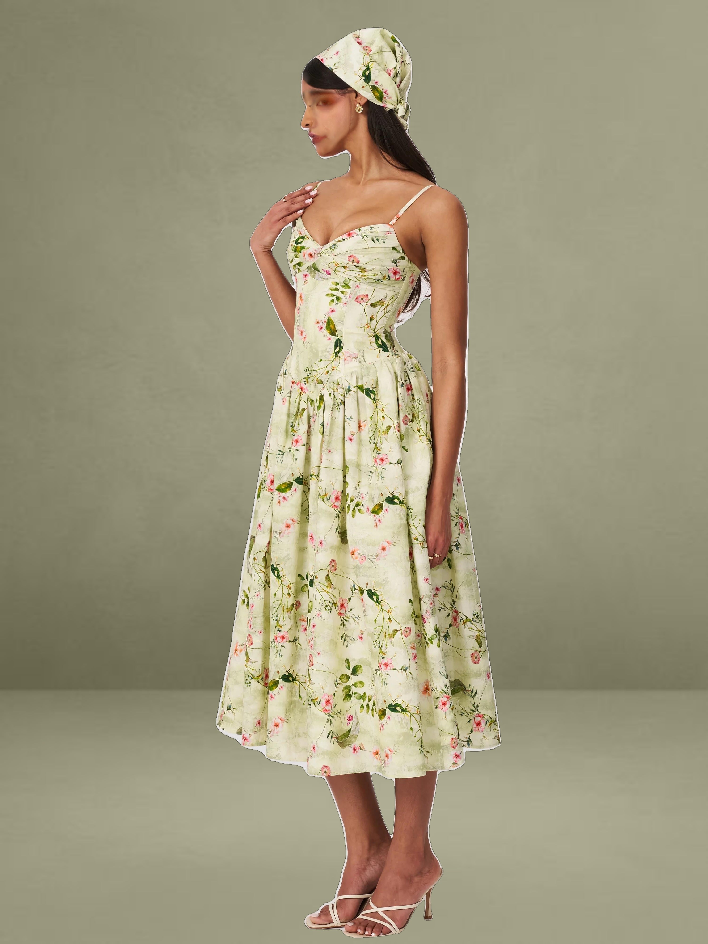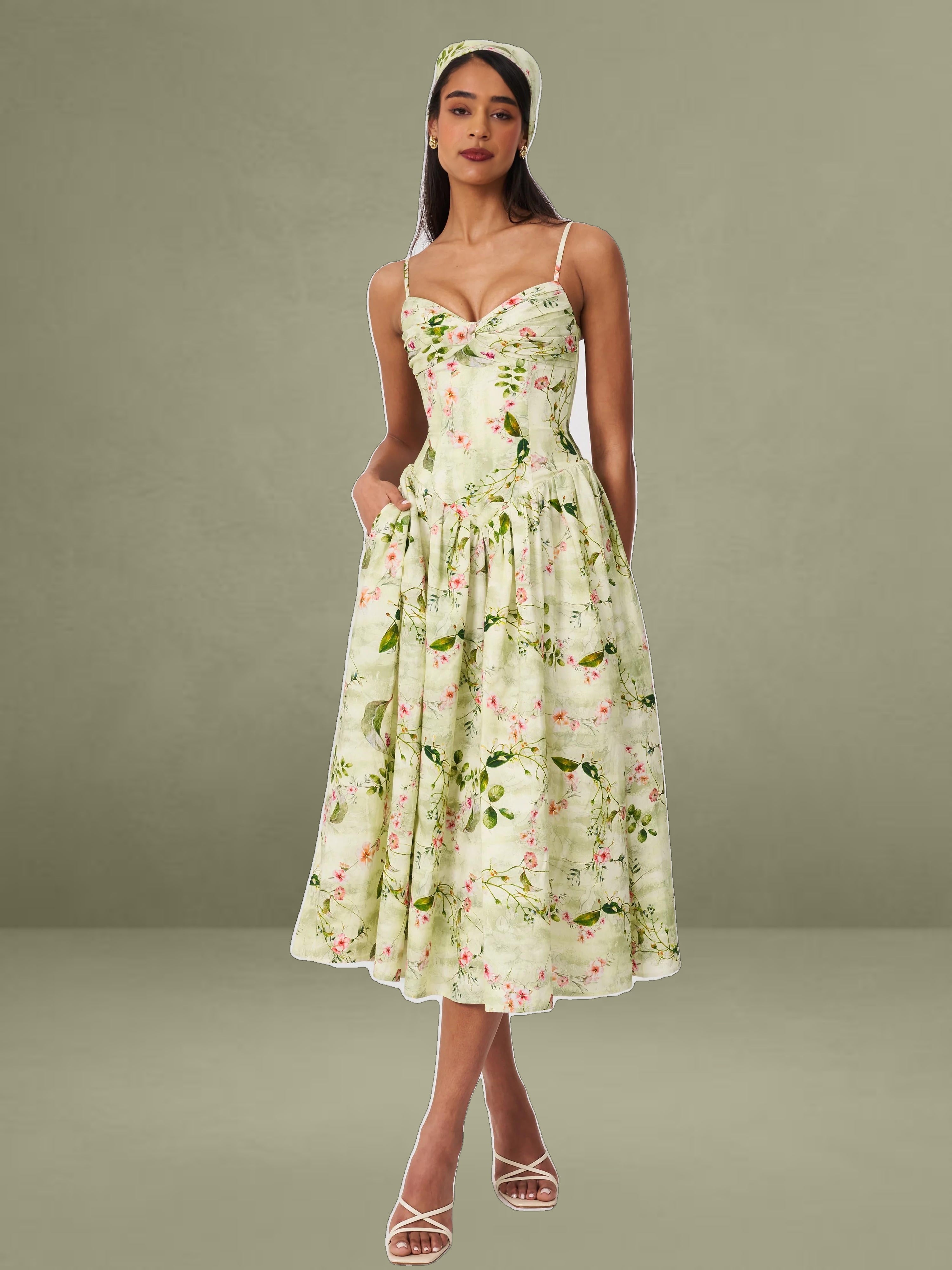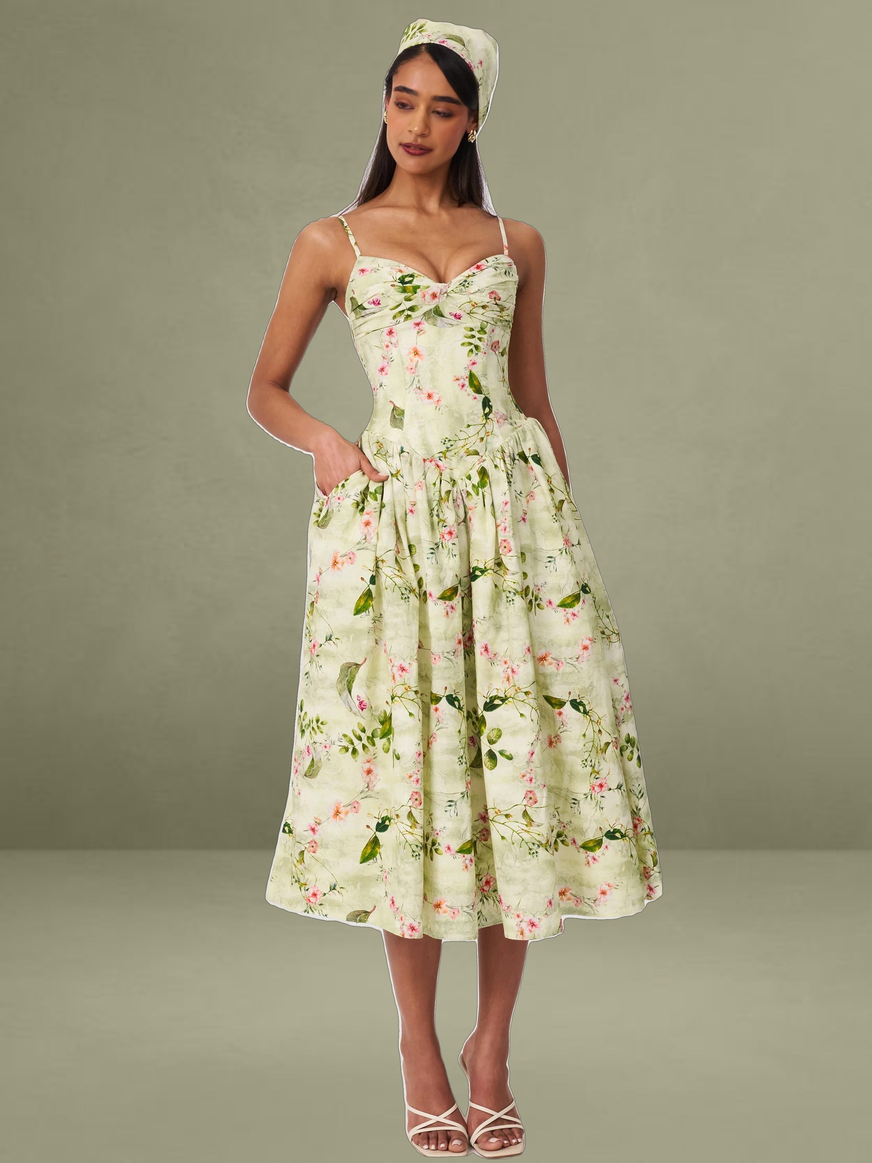 The Jacinda Dress is the perfect blend of springtime charm and effortless elegance, making it an ideal choice for picnics, vacations, holidays, and casual outings. Crafted from breathable linen fabric in a green floral print, this dress embodies a fresh and feminine aesthetic. The ruched front adds delicate texture and enhances the silhouette, while the drop waist design creates a relaxed yet flattering fit. Designed for both style and functionality, it features an invisible zipper and invisible pockets for a seamless look. Fully lined for comfort, the Jacinda Dress is your go-to piece for a breezy and stylish spring wardrobe. Perfectly matches with our Green Floral Print Head Scarf.
